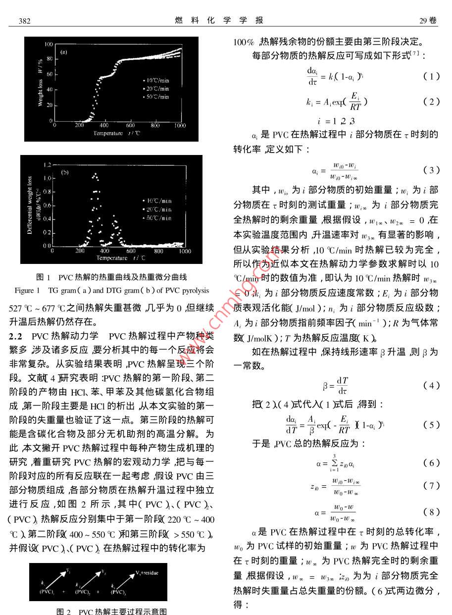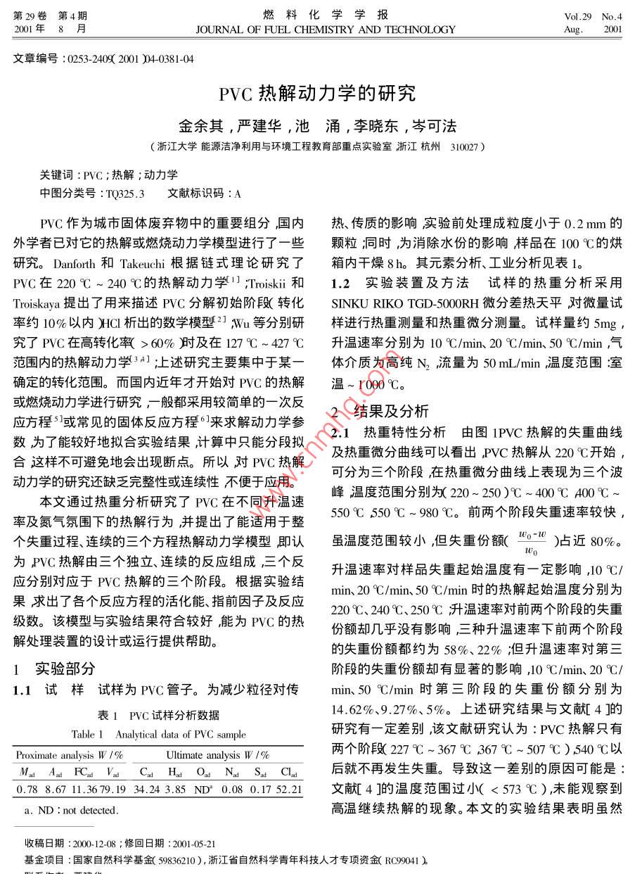 第29卷第4期燃料化學(xué)學(xué)報(bào)Vol.29 No.42001年8月JOURNAL OF FUEL CHEMISTRY AND TECHNOLOGYAug ,2001文章編號(hào):0253-2409 2001 )4-0381-04PVC熱解動(dòng)力學(xué)的研究金余其,嚴(yán)建華,池涌,李曉東,岑可法(浙江大學(xué)能源潔凈利用與環(huán)境工程教育部重點(diǎn)實(shí)驗(yàn)室浙江杭州310027)關(guān)鍵詞:PVC ;熱解;動(dòng)力學(xué)中圖分類號(hào):TQ325.3文獻(xiàn)標(biāo)識(shí)碼:APVC作為城市固體廢棄物中的重要組分國內(nèi)熱、傳質(zhì)的影響實(shí)驗(yàn)前處理成粒度小于0.2mm的外學(xué)者已對(duì)它的熱解或燃燒動(dòng)力學(xué)模型進(jìn)行了一些.顆粒;同時(shí),為消除水份的影響樣品在100C的烘研究。Danforth和Takeuchi根據(jù)鏈?zhǔn)嚼碚撗芯苛讼鋬?nèi)干燥8h。其元素分析、工業(yè)分析見表1。PVC在220C~240C的熱解動(dòng)力學(xué)(1]Troiskii和1.2 實(shí)驗(yàn)裝置及方法試樣的熱重分析采用Troiskaya提出了用來描述PVC分解初始階段(轉(zhuǎn)化SINKU RIKO TGD-5000RH微分差熱天平對(duì)微量試率約10%以內(nèi))HCI析出的數(shù)學(xué)模型21 ,Wu等分別研樣進(jìn)行熱重測(cè)量和熱重微分測(cè)量。試樣量約5mg,究了PVC在高轉(zhuǎn)化率( > 60%時(shí)及在127 C~427 C升溫速率分別為10 C/min.20 C/min、50 C/min,氣范圍內(nèi)的熱解動(dòng)力學(xué)34]上述研究主要集中于某-體介質(zhì)為高純N,流量為50 mL/min ,溫度范圍:室確定的轉(zhuǎn)化范圍。而國內(nèi)近年才開始對(duì)PVC的熱解溫~ 1000 C?;蛉紵齽?dòng)力學(xué)進(jìn)行研究,-般都采用較簡單的一次反2結(jié)果及分析應(yīng)方程5]或常見的固體反應(yīng)方程°0來求解動(dòng)力學(xué)參2.1熱重特性分析由圖1PVC熱解的失重曲線數(shù)為了能較好地?cái)M合實(shí)驗(yàn)結(jié)果,計(jì)算中只能分段擬及熱重微分曲線可以看出,PVC熱解從220 C開始,合這樣不可避免地會(huì)出現(xiàn)斷點(diǎn)。所以對(duì)PVC熱解可分為三個(gè)階段,在熱重微分曲線上表現(xiàn)為三個(gè)波動(dòng)力學(xué)的研究還缺乏完整性或連續(xù)性不便于應(yīng)用。峰溫度范圍分別為220~ 250)C ~400C 400C~本文通過熱重分析研究了PVC在不同升溫速550C550C~980C。前兩個(gè)階段失重速率較快,率及氮?dú)夥諊碌臒峤庑袨椴⑻岢隽四苓m用于整個(gè)失重過程、連續(xù)的三個(gè)方程熱解動(dòng)力學(xué)模型,即認(rèn)雖溫度范圍較小,但失重份額( 10o-10)占近80%。為PVC熱解由三個(gè)獨(dú)立、連續(xù)的反應(yīng)組成,三個(gè)反升溫速率對(duì)樣品失重起始溫度有一定影響,10 C/應(yīng)分別對(duì)應(yīng)于PVC熱解的三個(gè)階段。根據(jù)實(shí)驗(yàn)結(jié)min、20C/min、50C/min時(shí)的熱解起始溫度分別為果求出了各個(gè)反應(yīng)方程的活化能、指前因子及反應(yīng)220C、240C、250C;升溫速率對(duì)前兩個(gè)階段的失重級(jí)數(shù)。該模型與實(shí)驗(yàn)結(jié)果符合較好能為PVC的熱份額卻幾乎沒有影響三種升溫速率下前兩個(gè)階段解處理裝置的設(shè)計(jì)或運(yùn)行提供幫助。的失重份額都約為58%、22% ;但升溫速率對(duì)第三1實(shí)驗(yàn)部分階段的失重份額卻有顯著的影響,10C/min、20C/1.1試樣試樣為PVC管子。為減少粒徑對(duì)傳min、50C/min時(shí)第三階段的失重份額分別為14. 62%、9.27%、5%。上述研究結(jié)果與文獻(xiàn)[ 4 ]的表1 PVC 試樣分析數(shù)據(jù)Table 1Analytical data of PVC sample研究有一定差別,該文獻(xiàn)研究認(rèn)為: PVC熱解只有兩個(gè)階段227C~3679C367C~507C),540C以Proximate analysis W /%Ultimate analysis W /%Mas Aw FC VaCaHgOaNaSCl后就不再發(fā)生失重。導(dǎo)致這一差別的原因可能是:0.78 8.67 11.3679.19 34.24 3.85 ND 0.08 0.17 52.21文獻(xiàn)[4]的溫度范圍過小(<573C),未能觀察到a. ND :not detected.高溫繼續(xù)熱解的現(xiàn)象。本文的實(shí)驗(yàn)結(jié)果表明雖然收稿日期: 200-12-08 ;修回日期:2001-05-21基金項(xiàng)目:國家自然科學(xué)基金( 59836210 ),浙江省自然科學(xué)青年科技人才專項(xiàng)資金( RC99041 )382燃料化學(xué)學(xué)報(bào)29卷00 C100%熱解殘余物的份額主要由第三階段決定。)每部分物質(zhì)的熱解反應(yīng)可寫成如下形式7]:la,_.10C/mimdt=h(1-a,)(1)●20 C/min20. S0C/rmink;= A.exp(E)(2)RT .i=123600800 1000Temperature 1 Ca;是PVC在熱解過程中i部分物質(zhì)在τ時(shí)刻的轉(zhuǎn)化率定義如下:1 2-b)a;=Wo-W;(3)W;o-W;∞:08-其中,Wi為i部分物質(zhì)的初始重量;w;為i部. 10C/min306-.20C/min分物質(zhì)在τ時(shí)刻的測(cè)試重量;w;x為i部分物質(zhì)完04.50C/min全熱解時(shí)的剩余重量根據(jù)假設(shè),1012、1020=0,在02-本實(shí)驗(yàn)溫度范圍內(nèi),升溫速率對(duì)W3x有顯著的影響,2004006001000但從實(shí)驗(yàn)結(jié)果分析,10 C/min時(shí)熱解已較為完全,Tempcrature 1 C所以作為近似本文在熱解動(dòng)力學(xué)參數(shù)求解時(shí)以10圖1PVC熱解的熱重曲線及熱重微分曲線C/min時(shí)的數(shù)值為準(zhǔn),即認(rèn)為10 C/min熱解時(shí)W3xFigure 1 TG gram( a) and DTG gram( b) of PVC pyrolysis= 0k為i部分物質(zhì)反應(yīng)速度常數(shù);E;為i部分物527C~677C之間熱解失重甚微幾乎為0,但繼續(xù)質(zhì)表觀活化能( J/mol);n;為i部分物質(zhì)反應(yīng)級(jí)數(shù);升溫后熱解仍然存在。A,為i部分物質(zhì)指前頻率因子( min-' );R為氣體常2.2 PVC熱解動(dòng)力學(xué)PVC熱解過程中產(chǎn)物種類數(