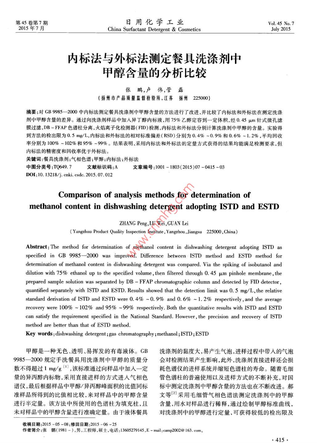 第45卷第7期日用化學(xué)工業(yè)Vol 45 No. 72015年7月China Surfactant Detergent CosmeticsJuly 2015內(nèi)標法與外標法測定餐具洗滌劑中甲醇含量的分析比較張鵬,盧偉,管磊(揚州市產(chǎn)品質(zhì)量監(jiān)督檢驗所,江蘇搦州225000)摘要:對GB9985-2000中內(nèi)標法測定餐具洗滌劑中甲醇含量的方法進行了改進,并比較了內(nèi)標法和外標法在測定洗滌劑中甲醇含量的差異。通過向洗滌劑樣品中加入異丁醇內(nèi)標液,用75%乙醇定容到一定體積經(jīng)0.45μm針式微孔濾膜過濾,DB-FFAP色譜柱分離,火焰離子化檢測器(HID)檢測,內(nèi)標法和外標法分別計算洗滌劑中甲醇的含量。實驗得到方法的檢出限為0.5mg/L,內(nèi)標法和外標法的相對標準偏差(RSD)分別為0.4%-0.9%和0.6%~1.2%,平均回收率分別為100%~102%和95%-9%。結(jié)果表明,采用內(nèi)標法和外標法的定量方式獲得的結(jié)果均能滿足檢測要求,但內(nèi)標法的精密度和回收率優(yōu)于外標法。關(guān)鍵詞:餐具洗滌劑;氣相色譜;甲醇;內(nèi)標法;外標法中圖分類號:TQ649.7文獻標識碼:A文章編號:1001-1803(2015)07-0415-03DOI:10.13218/j.cnki.csde.2015.07.012Comparison of analysis methods for determination ofmethanol content in dishwashing detergent adopting ISTD and EStDZHANG Peng, LU Wei, GUAN Lei(Yangzhou Product Quality Inspection Institute, Yangzhou, Jiangsu 225000, China)Abstract: The method for determination of methanol content in dishwashing detergent adopting ISTD asspecified in GB 9985--2000 was improved. Difference between ISTD method and ESTD method fordetermination of methanol content in dishwashing detergent was compared. Via the spiking of isobutanol anddilution with 75% ethanol up to the specified volume, then filtered through 0. 45 um pinhole membrane, theprepared sample solution was separated by DB-FFAP chromatographic column and detected by FID detectorquantified separately with ISTD and ESTD. Results showed that the detection limit was 0.5 mg/L, the relativestandard derivation of ISTD and ESTD were 0. 4%-0 9%0 and 0. 6%-1 2% respectively, and the averagerecovery were 100%-102% and 95%-99% respectively Both the quantitative results with ISTD and ESTDcan satisfy the requirement specified in the National Standard. However, the precision and recovery of ISTDmethod are better than that of EStd methodKey words: dishwashing detergent; gas chromatography; methanol; ISTD; ESTD甲醇是一種無色、透明、易揮發(fā)的有毒液體。GB洗滌劑的黏度大,易產(chǎn)生氣泡,進樣過程中帶入的氣泡9985-2000規(guī)定手洗餐具用洗滌劑中甲醇的質(zhì)量分會對檢測結(jié)果產(chǎn)生影響,此外,洗滌劑直接進樣還會損數(shù)不得超過1mg/g,該標準通過向樣品中加入一定耗色譜儀的進樣系統(tǒng)并縮短色譜柱的壽命。隨著毛細量的異丙醇內(nèi)標物,采用直接進樣的方式進入氣相色管色譜柱的普遍使用以及進樣方式的不斷補充,對國譜儀,最后根據(jù)樣品中甲醇/異丙醇峰面積的比值同標標中測定洗滌劑中甲醇含量的方法也在不斷改進。郝準樣品所得到的比值相比較,來對樣品中的甲醇含量文等2采用毛細管氣相色譜法測定洗滌劑中的甲醇進行半定量。該方法中所使用的色譜柱為填充柱,且含量,用水對樣品進行稀釋,通過繪制甲醇標準曲線,未對樣品中的甲醇含量進行準確定量。由于液體餐具對洗滌劑中的甲醇進行定量,可獲得較低的檢出限及收稿日期:2015-05-08;修回日期:2015-06作者簡介:張鵬(1981-),男,工程師,碩士,電話:13605279145,E-mul:amp2002@163.com析與檢日用化學(xué)工業(yè)第45卷較好的精密度;霍任峰等和王祿等分別采用自動標準儲備液于100mL容量瓶中,用75%乙醇定容至頂空進樣配合毛細管色譜法測定餐具洗滌劑中的甲醇刻度,得到質(zhì)量濃度分別為10.424,20.848,52.120含量,并對頂空條件和色譜條件進行了優(yōu)化,使得操作104.24,208.48,521.20和10424mg/L的甲醇標準簡便、分離效果好,且對色譜柱的影響小,但不適用于使用液。沒有配備頂空設(shè)備的實驗室。內(nèi)標法標準溶液的配制:移取1.0mL異丁醇于外標法操作簡便,只要繪制標準工作曲線,就可對100mL容量瓶中,用75%乙醇定容至刻度配制成異丁待測物質(zhì)進行定量,適合大量樣品的分析。然而,由于醇標準儲備液。分別移取0.5mL甲醇標準儲備液和異每次樣品分析的色譜條件(檢測器的響應(yīng)性能、色譜醇標準儲備液于100mL容量瓶中,用75%乙醇定柱的柱效襯管等)很難完全相同,分析結(jié)果易出現(xiàn)較容至刻度,此標樣中甲醇的質(zhì)量濃度為52.120mg/L大波動。此外,樣品前處理過程中待測物質(zhì)的變化也1.2.3樣品處理與測定不能在分析過程中得到補償。內(nèi)標法通過內(nèi)標物及待精確稱取5g(精確至0.lmg)樣品于100mL比測組分峰面積的相對值進行計算,在一定程度上消除色管中,加入0.5mL異丁醇標準儲備液,用75%乙醇了色譜條件的變化所引起的誤差,特別是在樣品前處稀釋至100mL,渦旋振蕩2min,用0.45μm濾膜過濾理之前加入內(nèi)標物,然后再進行前處理,可部分補償待到進樣瓶中,供氣相色譜儀測定。測組分在樣品前處理時的損失。筆者在國家標準的基內(nèi)標法結(jié)果:根據(jù)待測樣品中甲醇與異丁醇的峰礎(chǔ)上,對內(nèi)標法進行優(yōu)化,并就內(nèi)標法和外標法在甲醇面積之比,通過標準樣品的校正因子算出甲醇在洗滌檢測中的差異做一比較。劑樣品中的含量。1實驗部分外標法結(jié)果:根據(jù)待測樣品中甲醇的峰面積,即可在外標工作曲線上查出樣品中甲醇的質(z