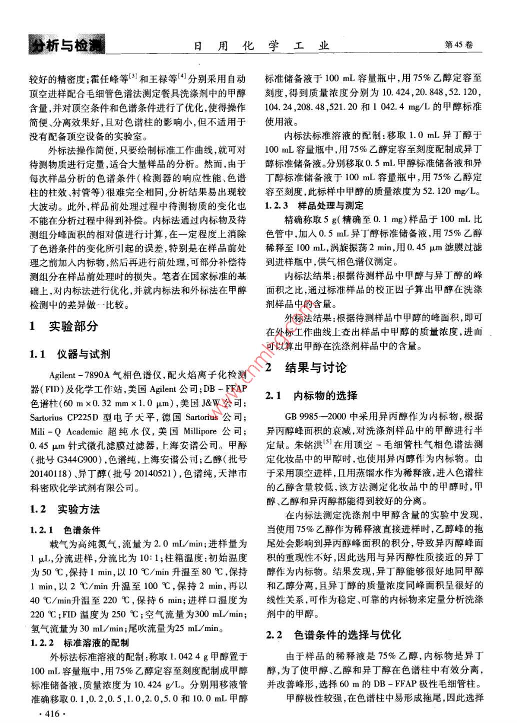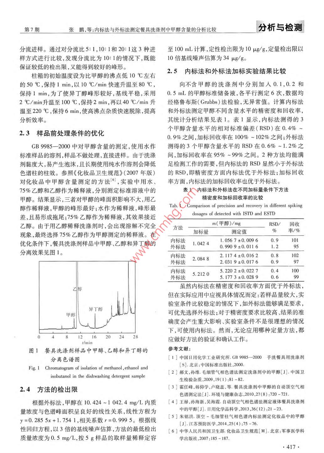 內(nèi)標法與外標法測定餐具洗滌劑中甲醇含量的分析比較