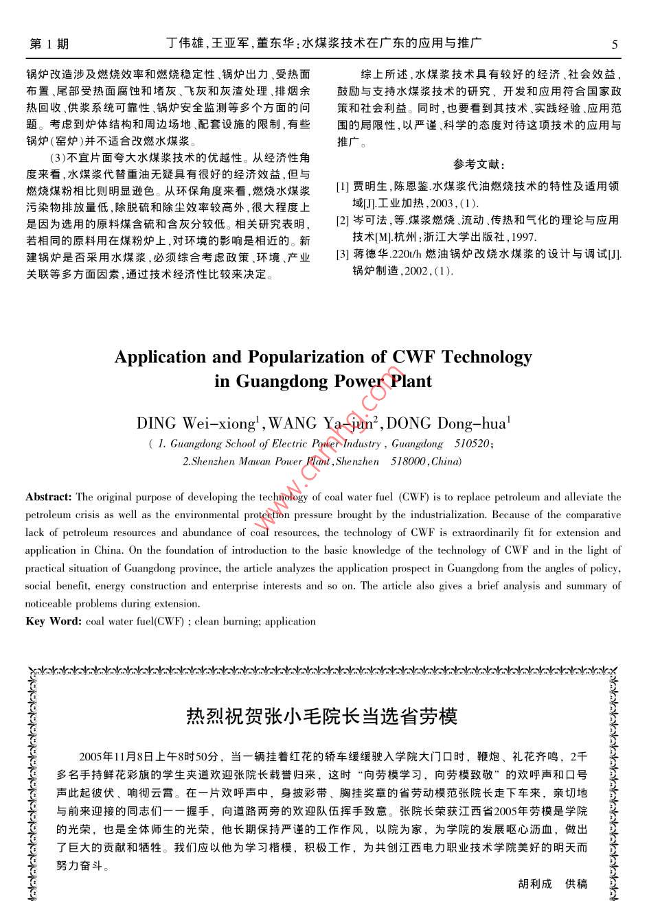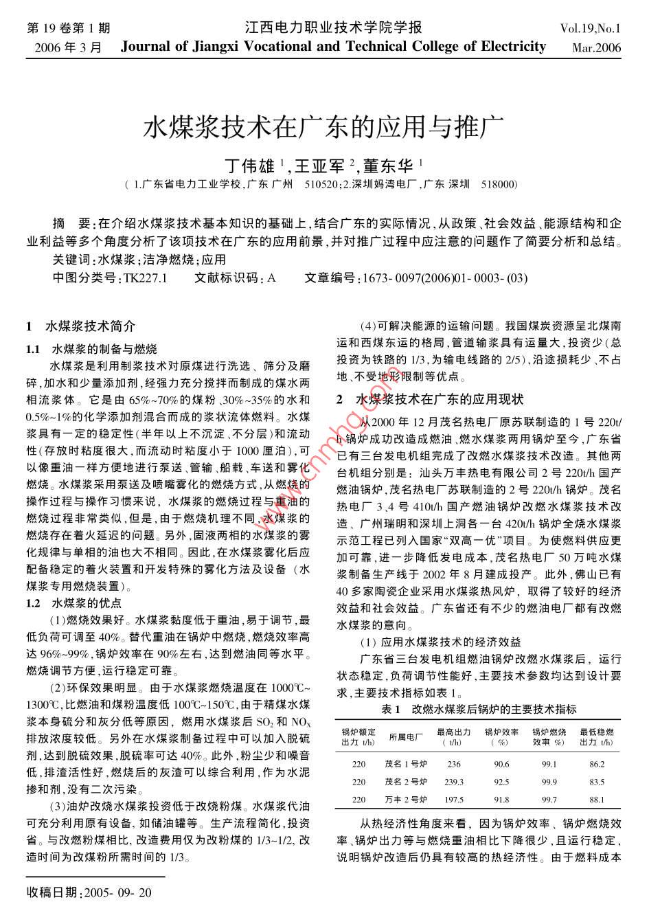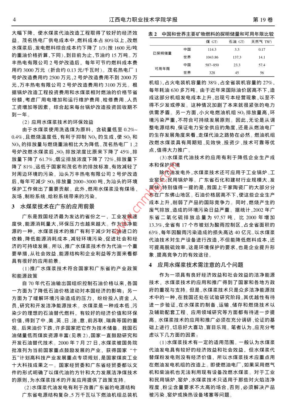 第19卷第1期江西電力職業(yè)技術(shù)學院學報Vol 19. No I2006F3f Journal of Jiangxi Vocational and Technical College of Electricity Mar 2006水煤漿技術(shù)在廣東的應用與推廣丁偉雄1,王亞軍2,董東華1(1廣東省電力工業(yè)學校,廣東廣州510520;2深圳媽灣電廠,廣東深圳518000摘要:在介紹水煤漿技術(shù)基本知識的基礎上,結(jié)合廣東的實際情況,從政策、社會效益、能源結(jié)構(gòu)和企業(yè)利益等多個角度分析了該項技術(shù)在廣東的應用前景,并對推廣過程中應注意的問題作了簡要分析和總結(jié)。關鍵詞:水煤漿;潔凈燃燒;應用中圖分類號:TK227.1文獻標識碼:A文章編號:1673-0097(200601-0003-(03)1水煤漿技術(shù)簡介(4)可解決能源的運輸問題。我國煤炭資源呈北煤南1.1水煤漿的制備與燃燒運和西煤東運的格局,管道輸漿具有運量大,投資少(總水煤漿是利用制漿技術(shù)對原煤進行洗選、篩分及磨投資為鐵路的13,為輸電線路的2/5),沿途損耗少不占碎,加水和少量添加劑,經(jīng)強力充分攪拌而制成的煤水兩地、不受地形限制等優(yōu)點。相流漿體。它是由65%-70%的煤粉、30%~35%的水和2水煤漿技術(shù)在廣東的應用現(xiàn)狀0.5%~1%的化學添加劑混合而成的漿狀流體燃料。水煤從2000年12月茂名熱電廠原蘇聯(lián)制造的1號220漿具有一定的穩(wěn)定性(半年以上不沉淀、不分層)和流動h鍋爐成功改造成燃油、燃水煤漿兩用鍋爐至今,廣東省性(存放時粘度很大,而流動時粘度小于1000厘泊),可已有三臺發(fā)電機組完成了改燃水煤漿技術(shù)改造。其他兩以像重油一樣方便地進行泵送管輸船載車送和霧化臺機組分別是:汕頭萬豐熱電有限公司2號20h1國產(chǎn)燃燒。水煤漿采用泵送及噴嘴霧化的燃燒方式,從燃燒的燃油鍋爐,茂名熱電廠蘇聯(lián)制造的2號220/h鍋爐。茂名操作過程與操作習慣來說,水煤漿的燃燒過程與重油的熱電廠3、4號410Ⅶ/h國產(chǎn)燃油鍋爐改燃水煤漿技術(shù)改燃燒過程非常類似,但是,由于燃燒機理不同,水煤漿的造、廣州瑞明和深圳上洞各一臺420/h鍋爐全燒水煤漿燃燒存在著火延遲的問題。另外固液兩相的水煤漿的霧示范工程已列入國家“雙高一優(yōu)”項目。為使燃料供應更化規(guī)律與單相的油也大不相同。因此在水煤漿霧化后應加可靠,進一步降低發(fā)電成本,茂名熱電廠50萬噸水煤紀備穩(wěn)定的著火裝置和開發(fā)特殊的霧化方法及設備(水漿制備生產(chǎn)線于202年8月建成投產(chǎn)。此外,佛山已有煤漿專用燃燒裝置)。40多家陶瓷企業(yè)采用水煤漿熱風爐,取得了較好的經(jīng)濟12水煤漿的優(yōu)點效益和社會效益。廣東省還有不少的燃油電廠都有改燃(1)燃燒效果好。水煤漿黏度低于重油易于調(diào)節(jié)最水煤漿的意向。低負荷可調(diào)至40%。替代重油在鍋爐中燃燒,燃燒效率高(1)應用水煤漿技術(shù)的經(jīng)濟效益達96%~99%,鍋爐效率在90%左右,達到燃油同等水平。廣東省三臺發(fā)電機組燃油鍋爐改燃水煤漿后,運行燃燒調(diào)節(jié)方便,運行穩(wěn)定可靠狀態(tài)穩(wěn)定,負荷調(diào)節(jié)性能好,主要技術(shù)參數(shù)均達到設計要(2)環(huán)保效果明顯。由于水煤漿燃燒溫度在1000°0求,主要技術(shù)指標如表1。130℃,比燃油和煤粉溫度低100℃~-150℃,由于精煤水煤表1改燃水煤漿后鍋爐的主要技術(shù)指標漿本身硫分和灰分低等原因,燃用水煤漿后SO2和NOx排放濃度較低。另外在水煤漿制備過程中可以加入脫硫鍋爐飄定所屬電廠最高出力鍋爐效率鍋爐燃燒最低穩(wěn)燃效率%)出力t/h劑,達到脫硫效果,脫硫率可達40%。此外,粉塵少和噪音低,排渣活性好,燃燒后的灰渣可以綜合利用,作為水泥031號爐摻和劑,沒有二次污染835(3)油爐改燒水煤漿投資低于改燒粉煤。水煤漿代油220萬豐2號爐197.5可充分利用原有設備,如儲油罐等。生產(chǎn)流程簡化,投資從熱經(jīng)濟性角度來看,因為鍋爐效率、鍋爐燃燒效省。與改燃粉煤相比,改造費用僅為改粉煤的13-12、改率、鍋爐岀力等與燃燒重油相比下降很少,且運行穩(wěn)定,造時間為改煤粉所需時間的1/3。說眀鍋爐改造后仍具有較高的熱經(jīng)濟性。由于燃料成本收稿日期:2005-09-204江西電力職業(yè)技術(shù)學院學報第19卷大幅下降,使水煤漿代油改造工程取得了較好的經(jīng)濟效表2中國和世界主要礦物燃料的探明儲量和可用年限比較益。茂名熱電廠供電成本中,燃料成本占80%以上,改燃石油GT)天然氣TM水煤漿后,發(fā)電燃料綜合成本約下降了1/3(按1600元/噸的重油價格折算,下同),到目前為止,節(jié)油約15萬噸。萬已探明儲量世界豐熱電有限公司2號爐改造后,每年可節(jié)約燃料成本費用約3000萬元(折合約013元/千瓦時)。茂名熱電廠可用年限號爐改造費用約2500萬元,2號爐改造費用不到2000萬元,萬豐熱電有限公司2號爐改造費用約3100萬元。根機組),占火電裝機容量的38%,占全省裝機容量的27%,據(jù)鍋爐改造工程投資費用和水煤漿相對燃油的價格節(jié)省每年耗油630多萬噸。由于近年來國際油價居高不下,造份額,考慮廠用電增加和運行維護費用、檢修費用人員成這部分機組發(fā)電成本上升,出現(xiàn)虧本經(jīng)營現(xiàn)象,以至不工資增加等因素,綜合起來每臺鍋爐改造投資回收期不得不少發(fā)或停發(fā)。這種情況加劇了本來就很緊張的電力到一年。供需矛盾。另一方面,小火電燃油