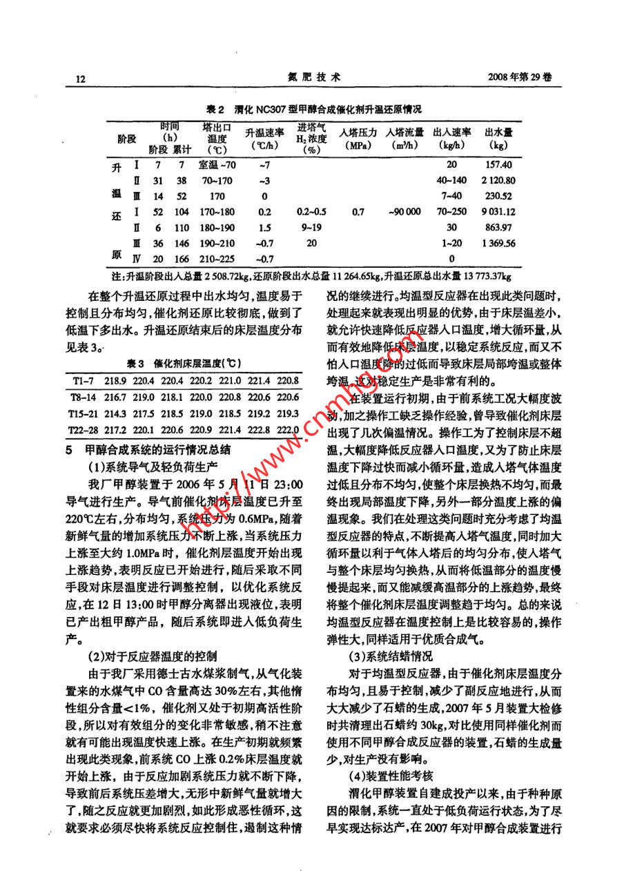 第5期張安平等:均溫型甲醇塔在渭化等壓甲醇裝量上的應(yīng)用11(E2701 )管程,與換熱器殼程的人塔氣體換熱,后又進(jìn)入水冷器(E2702A/B )進(jìn)-步冷卻,溫度降到昌40它以下,然后進(jìn)入甲醇分離器(V2702)進(jìn)行氣液分離。分離出的液體粗甲醇經(jīng)減壓閃蒸除去溶解在其中的大部分氣體后送往粗甲醇貯槽(V2712A/B)。從分離器上部出來的氣體作為循環(huán)氣大部分返回循環(huán)氣壓縮機(jī)(C2701 ),經(jīng)加壓后循環(huán)使用。另有一小部分氣體作為弛放氣,先通過弛放氣洗滌塔(T2701 )用密封水洗滌吸收其中的甲醇自蒸氣,后經(jīng)C2702(弛放氣壓縮機(jī))加壓后送往老廠變換回收。工藝流程方塊圖見圖1。V27017新鮮氣- +脫硫劑罐E270127- -R27011循環(huán)氣壓縮機(jī)中間換熱器甲醇合成塔弛放氣心E2703C V2702. [E202 一級廢鍋溶解氣甲分離路水冷器]E2704V2703 J二級廢鍋圖2甲醇合成塔結(jié)構(gòu)簡圍閃蒸罐V2712測溫?zé)犭娕?,共設(shè)28個(gè)測溫點(diǎn),同平面4個(gè)測溫粗甲醇貯槽圄1甲醇合成工藝方框流程圖點(diǎn),按不同插人深度均勻分布于7個(gè)平面,從而有利于操作工更好的掌握催化劑層的反應(yīng)情況2甲醇合成系統(tǒng)主要設(shè)備(見表1)表1甲醇合成系統(tǒng)主要設(shè)備和溫度分布,以便進(jìn)行相關(guān)操作。渭化中3 000低壓均溫型合成塔是杭州林達(dá)號設(shè)備名稱規(guī)格型號數(shù)量(臺(tái))1甲醇合成塔中3000x14000公司由φ2 000型合成塔直接放大為φ3 000型的,雖然理論上工業(yè)裝置的放大存在- -定的風(fēng)2開工加熱器φ1 200x28x5 6433 - -級廢鍋中11488/中2 400x44/25x 103991險(xiǎn),但經(jīng)過在我廠甲醇裝置上近兩年的應(yīng)用表明4二級廢鍋 φ11488/中2400x44/25x11399 1這次放大改進(jìn)是成功的。5中間換熱器φ1 600x 40x 160084催化劑的升溫還原情況水冷器φ1 600x56x 13 653 .催化劑升溫還原使用的還原氣是我公司合7甲醇分離器中2 400x 12x6520成氨裝置液氮洗分子篩后的凈化氣,壓力為φ2 400x 16x73165.2MPa,其組成(體積分?jǐn)?shù))為:C0:2.6%、H2:循環(huán)機(jī)4V-1S .96.5%。系統(tǒng)采用氮?dú)庋h(huán),催化劑還原壓力根據(jù)3中3 000均溫型甲醇合成塔循環(huán)機(jī)的最大打氣量控制在0.7 ~ 0.8MPao合成裝置的關(guān)鍵設(shè)備合成塔結(jié)構(gòu)簡圖如圖22006年5月5日13時(shí)合成系統(tǒng)開始升溫,升所示。進(jìn)塔氣由上部進(jìn)入合成塔,經(jīng)多根引氣管溫過程共52h,出物理水2 508.72kgo然后開始加進(jìn)入上集氣環(huán),再均勻分布到多排下行管與催化氫還原,至還原結(jié)束,共94.5h,還原階段累計(jì)出水劑層換熱,后又并人下集氣環(huán),均勻分布到多排11 264.65kgo初次加氫人塔氣氫濃度為0.52% ,還上行管與催化劑層再次換熱,達(dá)到反應(yīng)溫度后出原結(jié)束前,,小時(shí)出水量小于8kg達(dá)7h,還原結(jié)束時(shí)上行管進(jìn)入催化劑層進(jìn)行合成反應(yīng)并與管內(nèi)冷合成塔進(jìn)出口氫濃度分別為:21.22%和21%。氣換熱,反應(yīng)氣由下部出塔。合成塔內(nèi)裝有4根升溫還原情況見表2。12氮肥技術(shù)2008年第29卷表2渭化 NC307型甲醇合成催化劑升溫還原情況時(shí)間塔出口升溫速率進(jìn)塔氣入塔壓力人塔流量出入速率出水量階段(h)溫度( Ch)H,濃度(MPa) (m2/h)(kgh)(kg)階段累計(jì)(C)(%)升177窒溫-70~720157.4070~17040-140 2 120.80溫145217007-40230.52104 170-1800.2~0.5).7-900070-250 9 031.126 110 180-1901.59~1930863.9736 146 190-2101-201369.56原IV20166210-225~0.7注:升溫階段出入總量2 508.72kg,還原階段出水總盤11 264.65kg,升溫還原總出水量13 73.37kg在整個(gè)升溫還原過程中出水均勻,溫度易于況的繼續(xù)進(jìn)行。均溫型反應(yīng)器在出現(xiàn)此類問題時(shí),控制且分布均勻,催化劑還原比較徹底,做到了處理起來就表現(xiàn)出明顯的優(yōu)勢,由于床層溫差小,低溫下多出水。升溫還原結(jié)束后的床層溫度分布就允許快速降低反應(yīng)器人口溫度,增大循環(huán)量,從見表3。而有效地降低床層溫度,以穩(wěn)定系統(tǒng)反應(yīng),而又不表3催化劑床層溫度(C)怕入口溫度降的過低而導(dǎo)致床層局部垮溫或整體T1-7 218.9 220.4 220.4 220.2 221.0 221.4 220.8垮溫,這對穩(wěn)定生產(chǎn)是非常有利的。T8-14 216.7 219.0 218.1 220.0 220.8 220.6 220.6在裝置運(yùn)行初期,由于前系統(tǒng)工況大幅度波T15-21 214.3 217.5 218.5 219.0 218.5 219.2 2193動(dòng),加之操作工缺乏操作經(jīng)驗(yàn),曾導(dǎo)致催化劑床層T22- -28 217.2 220.1 220.6 220.9 221.4 222.8 222.0出現(xiàn)了幾次偏溫情況。操作工為了控制床層不超5甲醇合成系統(tǒng)的運(yùn)行情況總結(jié)溫,大幅度降低反應(yīng)器入口溫度,又為了防止床層(1)系統(tǒng)導(dǎo)氣及輕負(fù)荷生產(chǎn)溫度下降過快而減小循環(huán)量,造成入塔氣體溫度我廠甲醇裝置于2006年5月11日23:00過低且分布不均勻,使整個(gè)床層換熱不均勻,而最導(dǎo)氣進(jìn)行生產(chǎn)。導(dǎo)氣前催化劑床層溫度已升至終出現(xiàn)局部溫度下降,另外-部分溫度上漲的偏220C左右,分布均勻,系統(tǒng)壓力為0.6MPa,隨著溫現(xiàn)象。我們在處理這類問題時(shí)充分考慮了均溫新鮮氣量的增加系統(tǒng)壓力不斷上漲,當(dāng)系統(tǒng)壓力型反應(yīng)器的特點(diǎn),不斷提高人塔氣溫度,同時(shí)加大上漲至大約1.0MPa 時(shí),催化劑層溫度開始出現(xiàn)循環(huán