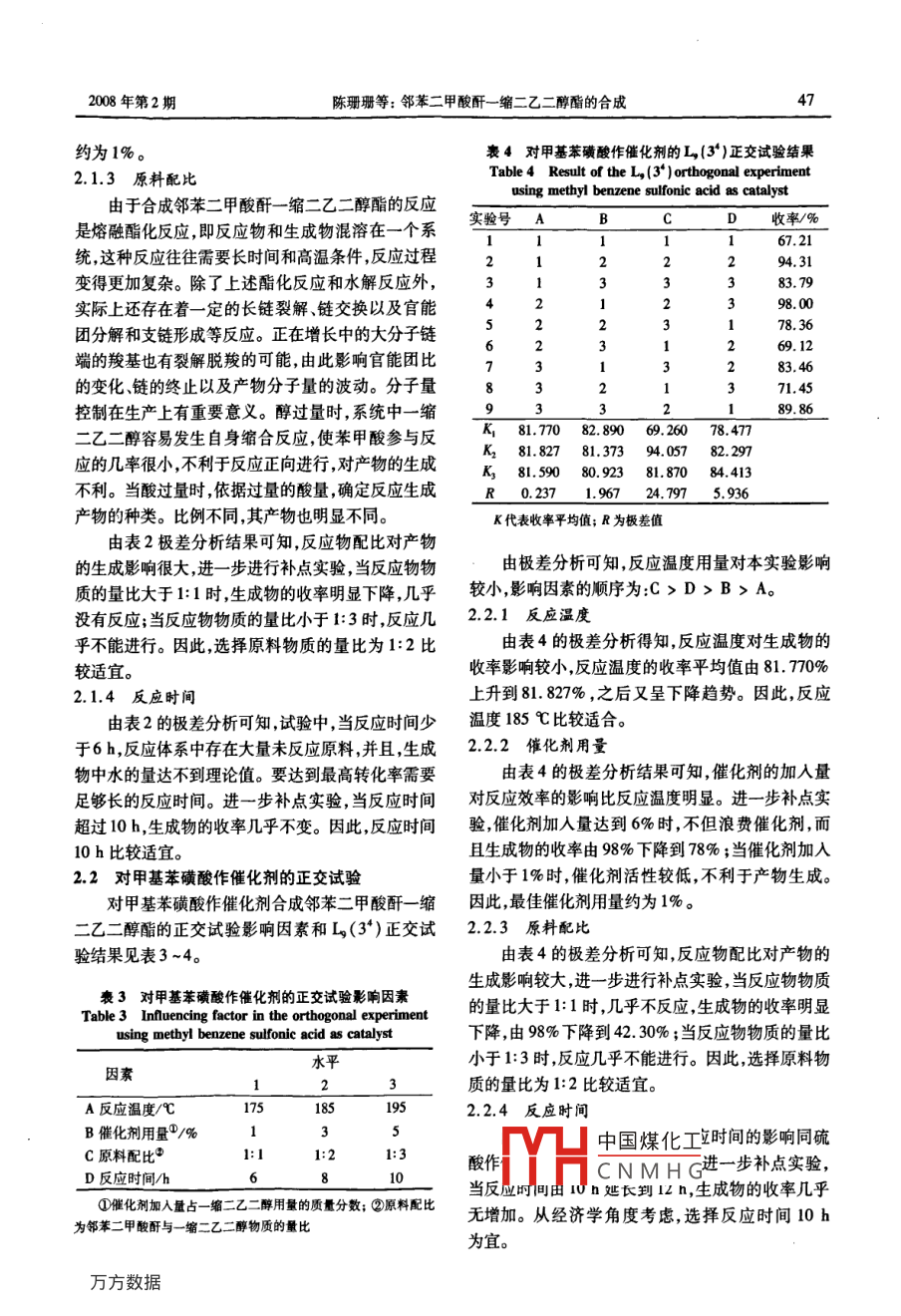 含年2刀期工業(yè)催化Feb.2008第16卷INDUSTRIAL CATALYSISVol. 16 No. 2精細(xì)化工與借化鄰苯二甲酸酐一縮二乙二醇酯的合成陳珊珊,王強(qiáng)°,陳曉博(遼寧石油化工大學(xué)高職學(xué)院化工系,遼寧撫順113001)摘要:討論了鄰笨二甲酸酐一縮二乙二醇酯的合成工藝,分別以硫酸和對甲基苯磺酸為催化劑合成鄰苯二甲酸酐一縮二乙二醇酯。結(jié)罘表明,對甲基笨磺酸作催化劑的選擇性較好,合成鄰菶二甲酸酐一縮二乙二醇酯的最佳反應(yīng)條件為:以對甲基苯磺酸為催化劑,其加入量為一縮二乙二醇質(zhì)量的1%,反應(yīng)溫度185℃,鄰苯二甲酸酐和一縮二乙二醇物質(zhì)的量比為1:2,反應(yīng)時間10h,產(chǎn)品純度大于98.0%。關(guān)鍵詞:催化化學(xué);鄰苯二甲酸酐;一縮二乙二醇;酯合成中圖分類號:0625.5文獻(xiàn)標(biāo)識碼:A文章編號:1008-1143(2008)02004504Synthesis of phthalic anhydride diglycol esterCHEN Shanshan, WANG Qiang", CHEN XiaoboVocational and Technical College, Liaoning University of PetroleumChemical Technology, Fushun 113001, Liaoning, China)Abstract: The synthetic processes of phthalic anhydride diglycol ester using sulfuric acid and methylbenzene sulfonic acid as catalysts, respectively, were investigated. The results showed that the selectivityof the goal product using methyl benzene sulfonic acid as the catalyst was higher. The optimum conditionof synthesizing phthalic anhydride diglycol ester was obtained as follows: methyl benzene sulfonic acid ascatalyst, catalyst dosage 3%( mass fraction )of diglycol, reaction temperature 185 C, phthalicanhydride-to-diglycol molar ratio 1: 2, reaction time 10 h. The product purity was more than 98. 0%un-conditionKey words: catalytic chemistry; phthalic anhydride; diglycol; ester syntheCLC number: 0625. 5 Document code A Article ID: 1008-1143 (2008)02-0045-04鄰苯二甲酸酐(簡稱苯酐,PA)是鄰苯二甲酸的套乙二醇生產(chǎn)裝置相繼建成投產(chǎn),一縮二乙二醇的脫水產(chǎn)物,一種重要的有機(jī)化工原料,廣泛應(yīng)用產(chǎn)量迅速增加。合理利用一縮二乙二醇獲取更高于生產(chǎn)PVC增塑劑、不飽和聚酯、醇酸樹脂以及染的附加價值的化學(xué)品,已普遍引起關(guān)注。鄰苯二甲料、油漆、農(nóng)藥和醫(yī)藥等。一縮二乙二醇也稱二乙二酸酐一縮二乙二醇酯可以進(jìn)一步酯化生成二元酯,醇醚、二甘醇和二乙二醇,主要應(yīng)用于制備增塑劑,產(chǎn)物是一種重要的化工產(chǎn)品,具有優(yōu)良的性能,應(yīng)用亦用作萃取劑、干燥劑、保溫劑、柔軟劑和溶劑。范圍廣,如醫(yī)藥、農(nóng)藥、纖維加工、涂料、光固化樹脂、縮二乙二醇是環(huán)氧乙烷水合生產(chǎn)乙二醇的主要副產(chǎn)紙張加工和橡膠工業(yè)等,特別是作為單體配制厭氧物其產(chǎn)量約為乙二醇產(chǎn)量的10%。隨著國內(nèi)多膠能收稿日期:2007-09-21YH中國煤化工國內(nèi)的研究主要是CNMHG作者簡介陳珊珊,1980年生,女,黑龍江省鶴崗市人,碩士研究生,從事新型催化劑的研究開發(fā)。通訊聯(lián)系人:王強(qiáng)。E-mail:blackfoxerl979@126.com工業(yè)催化2008年第2期圍繞二元酸與二元醇的酯交換反應(yīng)展開,并集中在表1硫酸作催化劑的正交試驗影響因素均相催化劑的研究上,雖然收率較高,但目前存在平Table 1 Influencing factor in the orthogonal experimentusing sulfuric acid as the catalyst衡轉(zhuǎn)化率低等問題,應(yīng)利用現(xiàn)有的一些反應(yīng)裝置和水平條件,選擇合適的催化劑,對反應(yīng)工藝進(jìn)行深入研因素2究。本文討論了鄰苯二甲酸酐一縮二乙二醇酯A反應(yīng)溫度/℃的合成工藝。B催化劑用量/%1C原料配比1實驗部分D反應(yīng)時間/h1.1試劑①催化劑加入量占一縮二乙二醇用量的質(zhì)量分?jǐn)?shù);②原料配比為鄰苯二甲酸酐與一縮二乙二醇物質(zhì)的量比鄰苯二甲酸酐,分析純;一縮二乙二醇,分析純;NaOH(GB209-93);無水碳酸鈉,分析純;濃硫酸,由極差分析可知,反應(yīng)溫度用量對本影響較小分析純;對甲基苯磺酸,分析純。影響因素的順序為:C>D>B>A。1.2實驗過程表2硫酸作催化劑的L(3)正交試驗結(jié)果1.2.1設(shè)計方案Table 2 Results of the L,(3)orthogonal experiment本實驗選擇不同的催化劑,分別對濃硫酸和對using sulfuric acid as the catalyst甲基苯磺酸進(jìn)行考察,通過文獻(xiàn)初步確立反應(yīng)溫度、實驗號AD收率/%催化劑用量原料配比和反應(yīng)時間為主要影響因素,并確定其大致范圍。為了減少實驗次數(shù),增加結(jié)果的可靠性通過確立的因素及水平列正交試驗表,進(jìn)2345122233376行正交試驗,以確定最佳反應(yīng)條件。通過正交表分73.46析各影響因素的變化趨勢,如各收率平均值呈逐漸77.7476.98上升或逐漸下降趨勢,必要時將進(jìn)行補(bǔ)點實驗,以877.19確定實驗結(jié)果的準(zhǔn)確性,最后確定反應(yīng)的最佳982.13條件k178.77380.00076.39776.6171.2.2實驗步驟K279.98778.92385.67080.280稱量一定量的鄰苯二甲酸酐,一縮二乙二醇按K378.76778.60375.46080.630定比例混合加入到連有溫度計和冷凝器等玻璃儀R1.2201.39710.2104.013K代表收率平均值;R為極差值器的燒瓶中,加入定量的催化劑進(jìn)行反應(yīng),之后用5%濃度的NaOH溶液堿洗去除催化劑等雜質(zhì),再用2.1.1反應(yīng)溫度無水碳酸鈉吸水,去除生成物中由堿洗殘留的水分,由表2的極差分析得知,實驗中,反應(yīng)溫度對產(chǎn)之后再通過減壓蒸餾去除系統(tǒng)中的過量反應(yīng)物等物生成影響較小,從反