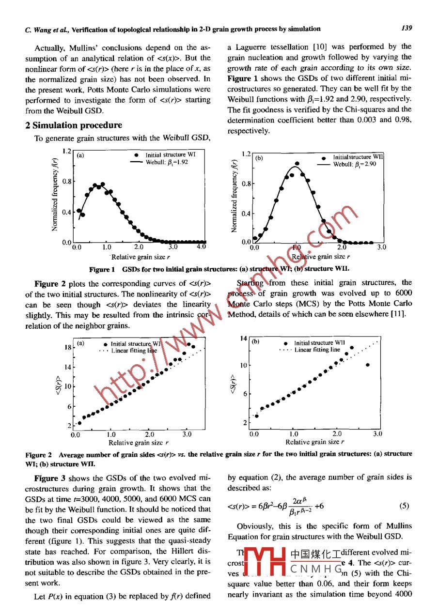 Journal of University of Science and Technology BejingMaterialsVolume 11, Number 2, April 2004, Page 138Verification of topological relationship in 2-Dgrain growth process by simulationChao Wang, Guoquan Liu, Ya Sun, and Xiangge QinMaterials Science und Engineering School, Universily of Science and Technology Beijing. Bijing 100083. China(Received 2003-04-04)Abstract: Behaviors of the quasi-steady state grain size distribution and the corresponding topological relationship were investigaledusing the Pots Monte Carlo method to simulate the normal grain growth process. The observed quasi-steady state grain size dis-tribution can be well fit by the Weibull function rather than the Hillert distribution. It is also found that the grain size and averagenumber of grain sides are not lincarly rclated. .: reason that the quasi-stcady stale grain size distibution deviates from the Hillertdistribution may contribute to the nonlinearity of the relation of the average number of grain sides with the grain size. The resuls al-so exhibit the reasonability of the relationship deduced by Mullins between the grain size distribution and the average number ofgrain sides.Key words: grain growth; grain size distibution: topology: Monte Carlo simulation: Hillert distribution[This work was suppored by the National Natural Science Foundation of China (No.501710081]1 Introductionlert, Lognormal and Gamma functions [8]. Its specificform is:Grain growth has been defined as the uniform in-crease in grain size that occurs upon annealing a poly-f(r)= A rh-expl-(5)則](2)crystalline aggregate after primary recrstallization iscomplete [I]. It is characterized by the continuous in-where a= I/I7(1+1B), and β a shape parameter.crease in mean grain size. More detailed characteris-Mullins [9] has clarified the reason of the failure oftics of the microstructure, such as the distribution ofgrains in size, orientation, and shape are also impor-the Hillert distribution to agree with simulations or(ant [2-4]. It has been recognized that all these aspectsexperiments. He concluded that in the quasi-steadywould interact and affect the grain growth process.state, the Hillert distribution always follows if the aV-And in DeHof's view, grain growth even can not oC-erage number of grain sides <<(x)> is a linear functionof the normalized grain size x; even a slight nonline-cur without the topological process [5. 6].arity of -6](3)21f(r)= (20)2 (z-rexp(- 2-7)(1)where x。is the cutoff of P(x), β can be derived fromthe parabolic law of the normal grain growth:where r is the relative grain size or normalized grain中國煤化工(4)size and e is the constant 2.7382.... In fact, the Hil-lert distribution has seldom been observed in experi-MHCNMHGsizeattimet,. But thegrain nucleation and growth followed by varying thenonlinear form of <(r)> (here r is in the place of x asgrowth rate of each grain according to is own size.the normalized grain size) has not been observed. InFigure 1 shows the GSDs of two different initial mi-the present work, Potts Monte Carlo simulations werecrostructures so generated. They can be well fit by the .performed to investigate the form of <(r)> startingWeibull functions with β=l .92 and 2.90, respectively.from the Weibull GSD.The fit goodness is verified by the Chi-squares and thedetermination coefficient better than 0.003 and 0.98,2 Simulation procedureTo generate grain structures with the Weibull GSD、respectively.| (a)Initial structure WI1.2 [b)●Initalstructure WIIWebull: B:-1.92Webull: β " 2.90y 0.80.80.4|%0.00 1.2.01.020-9* 3.0Relative grain size rRelative grain sizc rFigure 1 GSDs for two initial grain structures: (a) structure WI; (b) structure WII.Figure 2 plots the corresponding curves of <(r)>Starting from these initial grain structures, theof the two initial structures. The nonlinearity of process of grain growth was evolved up to 6000can be seen though <8(r)> deviates the linearityMonte Carlo steps (MCS) by the Potts Monte Carloslightly. This may be resulted from the intrinsic cor-Method, details of which can be seen elsewhere [11].relation of the neighbor grains.8t (田), Initial structure WI4[6)●Initial structure WII●Linear ftting line... Linear ftting line4-10-6t.02.0.03.0Rclative grain size rFigure 2 Average number of grain sides s. the relative grain size r for the two initial grain structures: (a) structureWI; (b) structure WII.Figure 3 shows the GSDs of the two evolved mi-by equation (2), the average number of grain sides iscrostructures during grain growth. It shows that thedescribed as:GSDs at time t=3000, 4000, 5000, and 6000 MCS can2Bbe fit by the Weibull function. It should be noticed that<(r)>= 6βr2- 6β B之+6(5)the two final GSDs could be viewed as the sameObviously, this is the specific form of Mullinsthough their corresponding initial ones are quite dif-Equation for grain structures with the Weibul GSD.ferent (figure 1). This suggests that the quasi-steadystate bas reached. For comparison, the Hillert dis中國煤化Idifferent evolved mi-tribution was also shown in figure 3. Very clearly, it iscrost:YHe 4. The cur-not suitable to describe the GSDs obtained in the pre-vesCNM H Gn (5) with the Chi-sent work.square value better than 0.06, and their form keepsLet P(x) in equation (3) be replaced by f(r) definednearly invariant as the simulation time beyond 4000140J. Univ. Sci. Technol Bejing, VoLII, No.2, Apr 2004MCS. This indicates that equation (5) is valid for grainsteady state GSD supports Mullins' view: the slightstructures with he Weibull GSD. The above-deviation from linearity of ~r relation can leadmentioned connection between the nonlinear <5(r)>~rto non-Hillert distributions in grain size distribution.relation and the Weibull rather than the Hillert quasi-1.2(間)0 3000 MCS(6)。3000 MCS4000 MCSE, 5000 MCS▼.5000 MCSWwebull:B-2.43(O0DM_-2.400.8-0.8Webul:Hillert distribution'Hillert distribution.40.4-0.0.01.02.3.01..0Relative grain size rFigure 3 Time evolution of the GSD