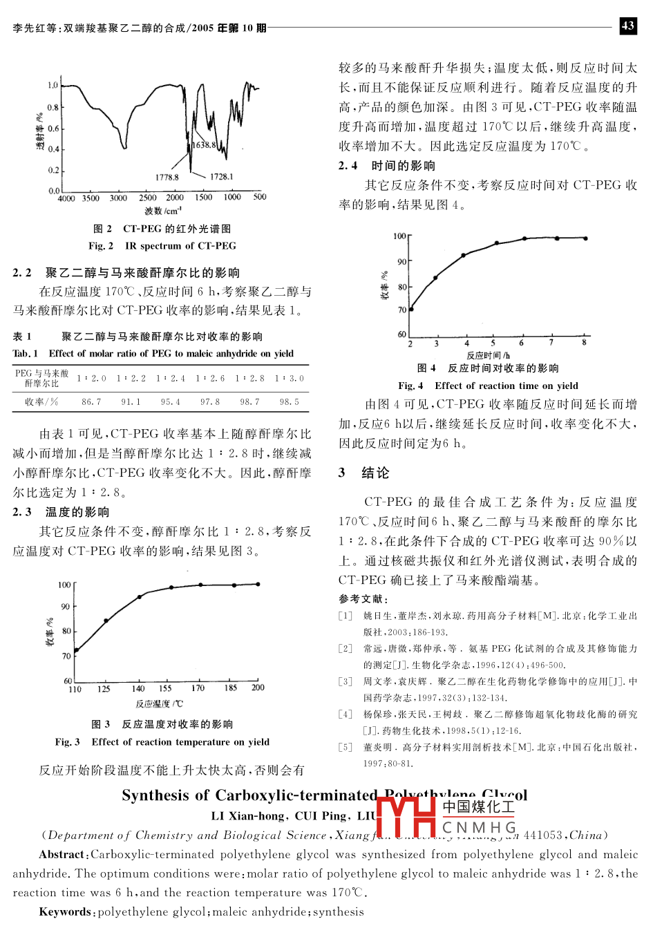2005.N.10化學(xué)與生物工程雙端羧基聚乙二醇的合成李先紅,崔萍,劉榛榛(襄樊學(xué)院化學(xué)與生物科學(xué)系,湖北襄樊441053)摘要:用聚乙二醇和馬來(lái)酸酐反應(yīng)制得雙端羧基聚乙二醇(CT-PEG。討論了原料配比、反應(yīng)時(shí)間、反應(yīng)溫度對(duì)反應(yīng)的影響。最佳工藝條件為:反應(yīng)溫度170℃,反應(yīng)時(shí)間6h,聚乙二醇與馬來(lái)酸酐的摩爾比1:2.關(guān)鍵詞:聚乙二醇;馬來(lái)酸酐;合成中圖分類號(hào):TQ325文獻(xiàn)標(biāo)識(shí)碼:A文章編號(hào):1672-5425(2005)10-0042-02聚乙二醇( Polyethylene glycol,PEG),是由環(huán)氧成的 CT-PEG進(jìn)行表征和結(jié)構(gòu)分析乙烷與水或乙二醇逐步加成聚合而得到的一類水溶性1.4紅外光譜分析聚醚,結(jié)構(gòu)式為:HO(CH2CH2O)nH。將CT-PEG試樣于 Nicolet-210型紅外光譜儀上作為一種兩親性聚合物,PEG既可溶于水,又可溶進(jìn)行測(cè)試分析。于絕大多數(shù)有機(jī)溶劑,具有生物相容性好、無(wú)毒、免疫原2結(jié)果與討論性低等特點(diǎn),可通過(guò)腎排出體外,在體內(nèi)不會(huì)有積累常用來(lái)修飾蛋白質(zhì)、多肽、酶等生化藥物2和生物醫(yī)用2.1結(jié)構(gòu)分析材料,從而將許多優(yōu)異性能賦予被修飾的物質(zhì)。由于以CT-PEG1000為例分析,在產(chǎn)物的核磁共振圖譜PEG端基是反應(yīng)活性較低的羥基,只能在較激烈的條件(圖1)中:δ=3.70ppm為聚乙二醇的一CH2一特征峰下與其它基團(tuán)發(fā)生反應(yīng),易破壞被修飾物,實(shí)際應(yīng)用時(shí)(圖中標(biāo)為d:-CH2-O-),δ=4.36ppm處特征峰(b:常需先進(jìn)行活化。PEG傳統(tǒng)活化方法有酯化法、氰CH2-COO—)表明PFG兩端已與馬來(lái)酸酐反應(yīng)脲酰氯法等。作者采用馬來(lái)酸酐對(duì)PEG進(jìn)行活化,產(chǎn)物通過(guò)洗滌、萃取或重結(jié)晶,已盡可能將未反應(yīng)的馬制得了分子量為800和1000的雙端羧基聚乙二醇來(lái)酸酐分離,但由于CT-PEG與PEG的溶解性能很接(CT-PEG),并經(jīng)結(jié)構(gòu)分析證實(shí),除端基發(fā)生改變外,近,故可能仍有少量未反應(yīng)的PFG裹留在產(chǎn)物中。沒(méi)有在PEG分子鏈上引入其它基團(tuán),從而避免影響被修飾物的活性。1實(shí)驗(yàn)(b)1.1原料與試劑聚乙二醇(分子量為800,1000)、馬來(lái)酸酐、吡啶,化學(xué)純;乙醚、甲醇等均為分析純06.5605.55.04.5403.51.2CT-PEG的合成HOO-CH=CH-C0O-CH2 CH,, Ch w-CH2 CH2-0OC-CH=CH-COOH稱取一定量的聚乙二醇、馬來(lái)酸酐和催化劑吡啶于帶有空氣冷凝管、攪拌器、溫度計(jì)和通N2保護(hù)裝量aa):6.2-6.4pm,ab):4.35pm,ahe):3.73pm,hd:3.0pm的四口瓶中混合,通入N2,加熱,在170℃反應(yīng)約6h圖1CT-PEG的核磁共振圖譜后冷卻至室溫,分離出產(chǎn)物。產(chǎn)物用乙醚萃取提純3Fig 1HNMR spectrum of CT-PEG次,去除未反應(yīng)的馬來(lái)酸酐。所得產(chǎn)物為棕色粘稠液圖2為 CT-PEG1000試樣的紅外光譜圖.其中體。用滴定法測(cè)定端羧基/g(甲醇一水溶液,酚酞為指1728cm-和17?9cm吸收是酯鍵中羰基的伸縮振示劑),計(jì)算CT-PEG收率。動(dòng)峰,由于共振而產(chǎn)生峰的分離;而1639cm-是C=C1.3核磁共振分析鍵的伸甘北TPEG確已接上了馬用 INOVA500型500MHz核磁共振儀對(duì)所合來(lái)酸醋中國(guó)煤化工CNMHG基金項(xiàng)目:湖北省教育廳重點(diǎn)科研項(xiàng)目(2001A69005)收稿日期:2005-07-25作者簡(jiǎn)介:李先紅(1963-),女,湖北人,高級(jí)工程師,主要從事化學(xué)合成的教學(xué)和科研工作。電話:0710-3230873, E-mail: Xiannong(163. com李先紅等:雙端羧基聚乙二醇的合成/2005正第10期較多的馬來(lái)酸酐升華損失;溫度太低,則反應(yīng)時(shí)間太長(zhǎng),而且不能保證反應(yīng)順利進(jìn)行。隨著反應(yīng)溫度的升高,產(chǎn)品的顏色加深。由圖3可見,CT-PEG收率隨溫度升高而增加,溫度超過(guò)170℃以后,繼續(xù)升高溫度,收率增加不大。因此選定反應(yīng)溫度為170℃2.4時(shí)間的影響77881728.1其它反應(yīng)條件不變,考察反應(yīng)時(shí)間對(duì) CT-PEG收00350030002500200015001000500波數(shù)/cm3率的影響,結(jié)果見圖4圖2CT-PEG的紅外光譜圖Fig 2 IR spectrum of CT-PEG2.2聚乙二醇與馬來(lái)酸酐摩爾比的影響在反應(yīng)溫度170℃、反應(yīng)時(shí)間6h,考察聚乙二醇與馬來(lái)酸酐摩爾比對(duì) CT-PEG收率的影響,結(jié)果見表1。表1聚乙二醇與馬來(lái)酸酐摩爾比對(duì)收率的影響lab 1 Effect of molar ratio of PEg to maleic anhydride on yieldPEG與馬來(lái)酸1:2.01:2.21:2.4圖4反應(yīng)時(shí)間對(duì)收率的影響酐摩爾比l:2,81:3收率/%86.791.195.497.898.798.5由圖4可見,CT-PEG收率隨反應(yīng)時(shí)間延長(zhǎng)而增由表1可見, CT-PEG收率基本上隨醇酐摩爾比加,反應(yīng)6h以后,繼續(xù)延長(zhǎng)反應(yīng)時(shí)間,收率變化不大,減小而增加,但是當(dāng)醇酐摩爾比達(dá)1:2.8時(shí),繼續(xù)減因此反應(yīng)時(shí)間定為6h小醇酐摩爾比,CT-PEG收率變化不大。因此,醇酐摩3結(jié)論爾比選定為1:2.8。2.3溫度的影響CT-PEG的最佳合成工藝條件為:反應(yīng)溫度其它反應(yīng)條件不變,醇酐摩爾比1:2.8,考察反170℃、反應(yīng)時(shí)間6h、聚乙二醇與馬來(lái)酸酐的摩爾比1:2.8,在此條件下合成的 CT-PEG收率可達(dá)90%以應(yīng)溫度對(duì) CT-PEO收率的影響,結(jié)果見圖3。上。通過(guò)核磁共振儀和紅外光譜儀測(cè)試,表明合成的CT-PE