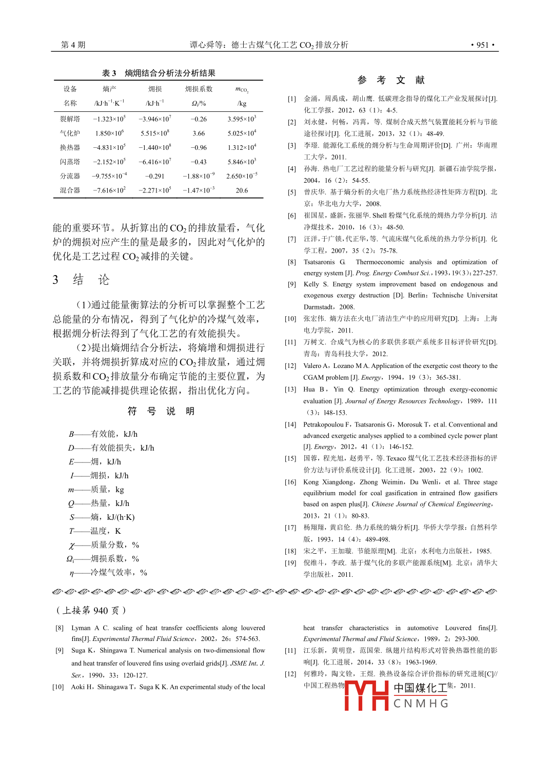 化工進(jìn)展2015年第34卷第4期CHEMICAL INDUSTRY AND ENGINEERING PROGRESS●947●8研究開發(fā):德士古煤氣化工藝CO2排放分析譚心舜',程樂斯',賈小平2,畢榮山'(青島科技大學(xué)計(jì)算機(jī)與化工研究所,山東青島266042; 2青島科技大學(xué)環(huán)境與安全學(xué)院,山東青島266042 )摘要:煤化工是高耗能高CO2 排放的工業(yè),利用熱力學(xué)分析方法對其工藝過程中能量利用情況進(jìn)行分析,可以有效地發(fā)現(xiàn)工藝的能量利用缺陷和節(jié)能潛力,為過程的節(jié)能優(yōu)化改造提供依據(jù)。目前熱力學(xué)分析方法主要包括能量衡算法和擁分析法,本文在對傳統(tǒng)熱力學(xué)方法進(jìn)行分析和評價(jià)的基礎(chǔ)上,指出了已有方法的不足,提出了新的熵?fù)矸治鱿嘟Y(jié)合的分析方法,并以德士古煤氣化工藝為例,分別使用傳統(tǒng)的能量衡算法、煙分析法和本文提出的熵炯結(jié)合分析法對工藝過程的能量利用情況進(jìn)行了分析,獲得了工藝過程中內(nèi)各模塊的能量、熵增和炯損分布。在此基礎(chǔ)上,將擁損與工藝過程中CO2 排放量建立聯(lián)系,經(jīng)過計(jì)算得到了工藝過程中各個(gè)設(shè)備對應(yīng)的CO2排放分布和煙損系數(shù),得出氣化爐是工藝過程中主要的節(jié)能位置。這種能量與CO2 排放的關(guān)聯(lián)能為工藝過程的節(jié)能減排提供理論依據(jù)。關(guān)鍵詞:煤氣化;熵產(chǎn);擁損; CO2排放量中圖分類號: TQ021.2文獻(xiàn)標(biāo)志碼: A文章編號: 1000-6613 (2015) 04 - 0947- 05DOI: 10.16085/.issn. 000-6613.2015.04.008Analysis of exergy loss and CO2 emission in Texaco coal gasificationTAN Xinshun',CHENG Lesi',JLA Xiaoping2,BI Rongshan'( 'Institute of Computer and Chemical Engineering,Qingdao University of Science & Technology, Qingdao 266042,Shandong, China; 2 School of Environment and Safety Engineering, Qingdao University of Science & Technology,Qingdao 266042,Shandong, China)Abstract: Coal chemical industry is noted for high energy consumption and significant discharge ofCO2. Using thermodynamic analysis to evaluat utilization of energy in such processes can effctivelyfind defects of energy utilization and energy-saving potential, and can provide the basis for energysaving optimization reconstruction of the process. Thermodynamic analysis includes energy balanceand exergy analysis. This paper presents the method of combining entropy analysis with exergyanalysis after reviewing the traditional analysis methods and pointing out their shortages. TakingTexaco coal gasification as an example,energy utilization was analyzed by using energy balance,exergy analysis and the proposed method. Energy consumption,entropy generation and distribution ofexergy loss of all modules were obtained. Based on this, the relationship between exergy loss and CO2emission was established, and distribution of CO2 emission and exergy loss coefficient of all moduleswere obtained by calculation. The gasifier was the main location for energy-saving. This relationshipwe established could provide theoretical basis for energy saving and emission reduction of the coalgasification process.Key words: coal gasification; entropy generation; exergy loss; CO2 emission收稿日期: 2014-09-03; 修改稿日期: 2014-11-04.第一作者:程樂斯(1987- -),女,碩士研究生,從事化工系統(tǒng)工程基金項(xiàng)目:國家自然科學(xué)基金(21136003, 41101570)、 山東省自然科方向。聯(lián)系人:畢榮山cn@163com.學(xué)基金(ZR2011BL010) 及山東省高??萍加?jì)劃(J11LB65) 項(xiàng)目。中國煤化工MYHCNMH G化I進(jìn)展2015年第34卷煤炭是我國的主要能源,由煤炭發(fā)展起來的煤中的部分煤發(fā)生裂解反應(yīng),反應(yīng)后的混合物通過加化工行業(yè)是一個(gè)需要消耗大量的煤炭資源和水資源壓自燃燒噴嘴噴入氣化爐內(nèi),在來自空分單元的富并排放大量廢水廢氣廢渣的大型基礎(chǔ)產(chǎn)業(yè)出。近幾氧氣流(其中氧氣摩爾分?jǐn)?shù)約為95%)的作用下破年煤化工產(chǎn)業(yè)得到了迅速發(fā)展,但也伴隨著大量漿、霧化噴入氣化爐膛。爐膛反應(yīng)溫度為1350~CO2的排放,由此引起的溫室效應(yīng)也日趨嚴(yán)重,工1400C,水煤漿混合物與氧氣發(fā)生一系列的物理、藝過程中能耗和CO2的大量排放日漸成為人們關(guān)注化學(xué)過程,如水分蒸發(fā)、煤干餾、揮發(fā)物裂解燃燒的焦點(diǎn)。因此,實(shí)施相應(yīng)的節(jié)能減排措施來減少能以及炭的氣化等,最終生成主要成分為CO、H2、源的消耗和廢氣的排放,是應(yīng)對全球氣候問題、促.CO2、H2O的粗煤氣,同時(shí)還含有微量的N2、進(jìn)煤化工綠色發(fā)展的重大舉措,同時(shí)對工藝過程中CH4、H2S、 COS、熔融的灰分以及少量未轉(zhuǎn)化的能量的利用情況與CO2的排放量進(jìn)行分析是非常有碳0-1。經(jīng)換熱器冷卻后,通過旋風(fēng)分離器進(jìn)行分必要的2]。傳統(tǒng)的能量衡算法以能量平衡方程為基離,熔渣從塔釜排出。塔頂粗煤氣經(jīng)過分流后,分礎(chǔ),只是從量的方面說明能量的利用狀況,無法詮別進(jìn)入換熱器換熱和洗滌塔洗滌,洗滌產(chǎn)生的廢水釋系統(tǒng)能量的品質(zhì)變化,不能正確地指出高能耗的由塔釜排出,塔頂?shù)拈W蒸汽經(jīng)冷凝混合器混合后進(jìn)部位和節(jié)能潛力的大小B1。孫海4利用有效能衡算入煤氣凈化塔除去coS,得到合成氣,進(jìn)入下一方程把過程內(nèi)部有效能的不可逆損失進(jìn)行了量化,工段使用。但未能將能量物質(zhì)所處的狀態(tài)