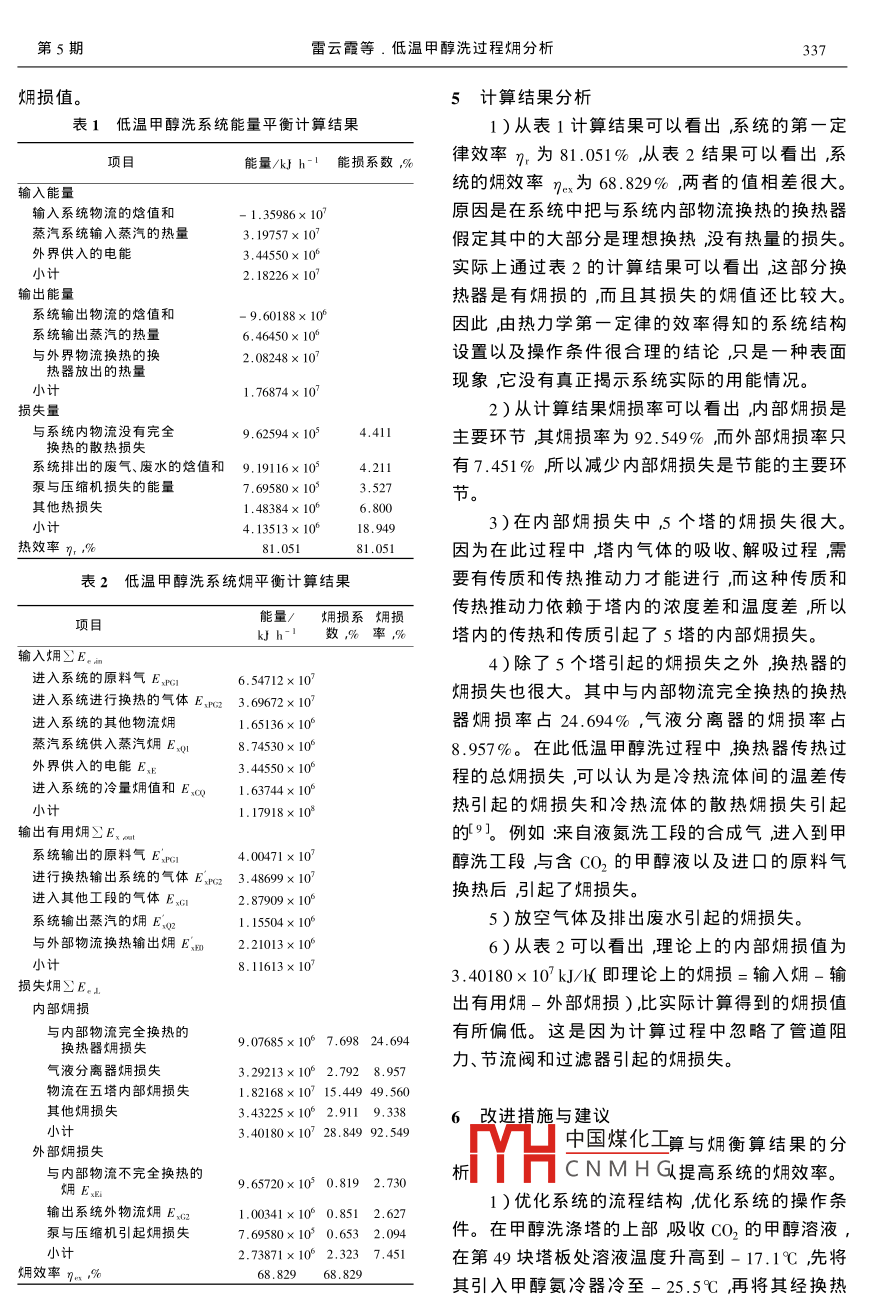 2006年10月Oct,2006第29卷第5期Large Scale Nitrogenous Fertilizer IndustryVol 29 No 5低溫甲醇洗過(guò)程爛分析雷云霞馮霄(西安交通大學(xué)化工系陜西西安,710049)摘要根據(jù)某化肥廠合成氨系統(tǒng)中的低溫甲醇洗工段的工藝建立了爛分析模型。對(duì)甲醇洗系統(tǒng)進(jìn)行了烱分析并且與能量分析進(jìn)行了比較分析系統(tǒng)用能的薄弱之處提岀相應(yīng)的改進(jìn)措施。關(guān)鍵詞低溫甲醇洗系統(tǒng)傭分析改進(jìn)途徑中圖分類號(hào):rQ113.26文獻(xiàn)標(biāo)識(shí)碼B文章編號(hào):002-578x200605-0335-04在凈化氬氣的一系列工段中需要耗費(fèi)大量1低溫甲醇洗系統(tǒng)的組成的能量。為了揭示系統(tǒng)用能的合理性達(dá)到節(jié)能低溫甲醇洗系統(tǒng)采用林德技術(shù)五塔流程分的目的本文采用以熱力學(xué)第二定律為基礎(chǔ)的烔為冷區(qū)和熱區(qū)。冷區(qū)由甲醇洗滌塔、二氧化碳解分析法對(duì)凈化氬氣工藝中的低溫甲醇洗工段進(jìn)吸塔和硫化氬濃縮塔組成;熱區(qū)由甲醇熱再生塔行分析和甲醇/水分離塔組成流程如圖1SIcCHE3SIc圖1低溫甲醇洗系統(tǒng)流程CI—甲醇洗滌塔匯2—二氧化碳解吸塔;3—-硫化氬濃縮塔;4—甲醇熱再生塔;5—甲醇/水分離塔;I-原料氣;2一尾氣3-CO3δ4一產(chǎn)品氣δ5一N2S6-H2S7一廢水8—甲醇⑧9一—H2S10—來(lái)自液氮洗工段進(jìn)行換熱的合成氣“1|一換熱后的合成氣配—原料氣冷卻器Σ一甲醇氨冷器霪3—循環(huán)甲醇冷卻器;4—甲醇冷卻器;—甲醇/水分離罐;V2-1循環(huán)氣閃蒸罐;3一2*循環(huán)氣閃蒸罐;4—硫化氬分離罐;5一甲醇閃蒸罐整個(gè)系統(tǒng)主要是為了凈化來(lái)自一氧化碳變換2系統(tǒng)的能量衡算方程式工段的進(jìn)料氣。由于一氧化碳變換后的變換氣中對(duì)于低溫甲醇洗系統(tǒng),它的能量平衡方程1除了含有氨合成反應(yīng)所需要的H2、N2以外還含為有CO、CO2、H2S以及COS等成分這些氧化物和中國(guó)煤化工:w(1)硫化物都是合成氨催化劑的毒物然而CO2又是式THCNMHG物流的焓總和A/h生產(chǎn)尿素的原料而且一氧化碳、硫化物又可進(jìn)步回收利用故在此采用低溫甲醇洗滌法得到純收稿日期2006-03-07收到修改稿日期200607-25。凈H2的同時(shí),又對(duì)它們分別脫出并加以回收利作者簡(jiǎn)介雷云霞女,1980年出生,西安交通大學(xué)化學(xué)工程用專業(yè)碩士研究生。E- mail yxlei@ stu. xJtu,edu,cn2006年第29卷∑H一所有進(jìn)入系統(tǒng)物流的焓總和kJ/hEsr為來(lái)自上一工段(一氧化碳變換工段)∑Q一系統(tǒng)從外界所得到的熱量總和,包括進(jìn)入系統(tǒng)的原料氣嫻,E1為出系統(tǒng)的產(chǎn)品氣蒸汽系統(tǒng)提供的蒸汽與外界物流換熱的換熱器嫻,E、為來(lái)自液氮洗工段的進(jìn)入系統(tǒng)進(jìn)行換熱所得到的熱量以及換熱器的散熱損失kJ/h的合成氣,E為進(jìn)行換熱的合成氣輸出系統(tǒng)∑W一壓縮機(jī)與泵消耗的電能kJ/h的,E、E為供給泵與壓縮機(jī)的電能,E為泵與能量平衡分析2以熱力學(xué)第一定律效率n壓縮機(jī)因摩擦而損失的那部分電能,EN為汽提(即熱效率作為評(píng)價(jià)準(zhǔn)則,為系統(tǒng)利用的能量CO2時(shí)輸入的N2的嫻,EM為來(lái)自液氮洗工段的與供給系統(tǒng)的總能量的比值即循環(huán)氣主要成分為氫氣)的烔,E、o為蒸汽系統(tǒng)E7r=p×100%(2)供入的蒸汽烔,E2為系統(tǒng)輸出蒸汽的煩,E3M為外界供入的貧甲醇溶液烔,E3c為系統(tǒng)得到的冷辯識(shí)使用能量的薄弱環(huán)節(jié)的分析準(zhǔn)則是能量量爛,E為與外部物流換熱后系統(tǒng)輸岀的燸損失系數(shù)κ。簡(jiǎn)稱能損系數(shù)。X。為某環(huán)節(jié)的能E、.為換熱時(shí)散熱損失的,E、c為進(jìn)入其他工段量損失與供給系統(tǒng)的總能量的比值即的物流(脫出的CO2H2S嫻,E2為排出系統(tǒng)的物EX,=E=×100%(3)流廢水、廢氣冰用。其中式中:E1,一i環(huán)節(jié)的能量損失∑E、m=E、P1+E、P+EE1+EN+E3H,+E3系統(tǒng)的煳衡算方程式∑E3xmt=E、+En+EP1+E2+E對(duì)低溫甲醇洗系統(tǒng)其畑衡算方程3)為(8)∑Exmn=∑Exm+∑E(4)∑E、12=E2+E、E+E、B(9)式中E、一輸入系統(tǒng)的總焆值kJ/h作為爛分析的評(píng)價(jià)準(zhǔn)則嫻效率)只能對(duì)∑E、灬一系統(tǒng)輸出有用的總爛值kJ/h用能設(shè)備或系統(tǒng)的整體耗能狀態(tài)做出宏觀評(píng)價(jià)ΣE、』一系統(tǒng)損失的總焆值忒J/h而對(duì)用能過(guò)程的各個(gè)環(huán)節(jié)是否合理不能做出判且系統(tǒng)損失的總傭值451為別。辨識(shí)能量轉(zhuǎn)換、傳遞和使用過(guò)程合理性的準(zhǔn)∑E、=∑E、M+∑E、n2(5)則是分析準(zhǔn)則。分析準(zhǔn)則有兩種:損系數(shù)x和式中E、1一系統(tǒng)的內(nèi)部損失總煳值kJ/h傭損率σ?!艵、』2一系統(tǒng)的外部損失總煳值kJ/h烱損系數(shù)x為系統(tǒng)內(nèi)某環(huán)節(jié)的畑損失與系統(tǒng)的為系統(tǒng)的效率可以表明系統(tǒng)對(duì)輸入總輸入的比。對(duì)每一環(huán)節(jié)的損系數(shù)進(jìn)行分燈的有效利用程度其數(shù)學(xué)表達(dá)式6為析、評(píng)價(jià)后即可指出系統(tǒng)用能的不合理之處。100%(6)∑E×100%(10)∑E、其爛效率反映了實(shí)際過(guò)程接近理想過(guò)程的程煩損率σ為系統(tǒng)某環(huán)節(jié)的畑損與系統(tǒng)總損度表明了過(guò)程的熱力學(xué)