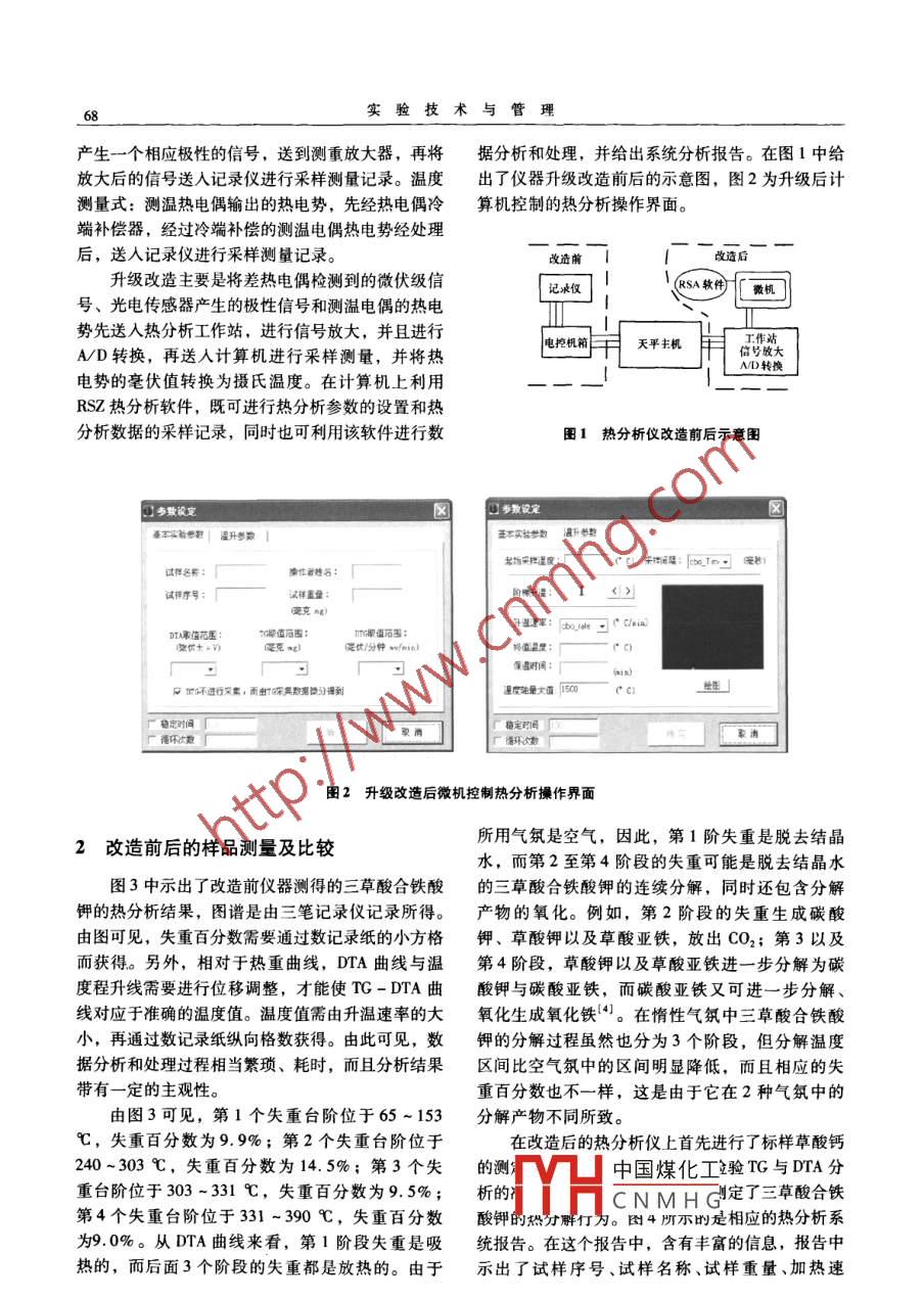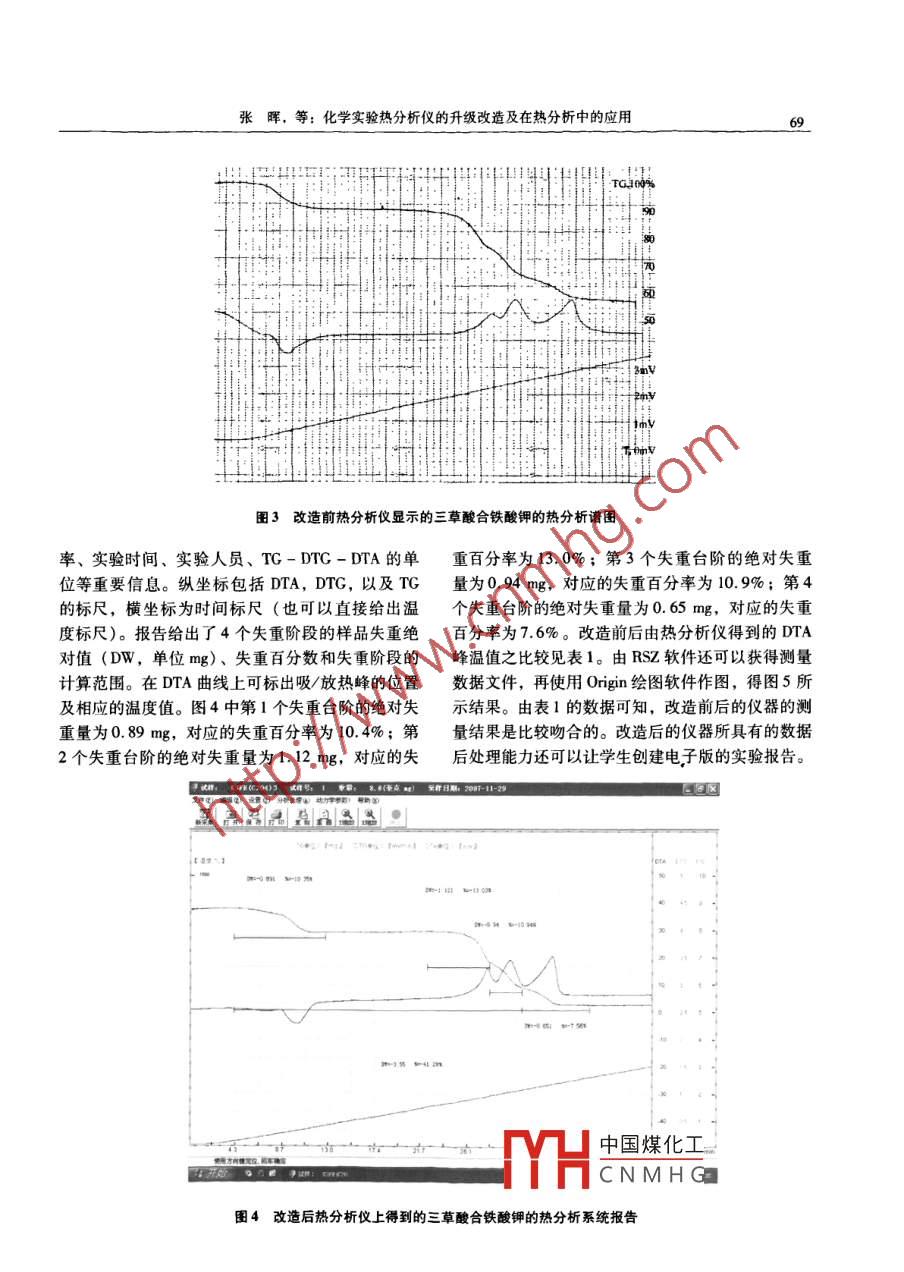 實(shí)驗(yàn)技術(shù)與管理第25卷第1l期2008年11月Experimental Technology and Management化學(xué)實(shí)驗(yàn)熱分析儀的升級改造及在熱分析中的應(yīng)用張暉,柯曉康,章文偉,孫爾康(南京大學(xué)國家級化學(xué)實(shí)驗(yàn)教學(xué)示范中心,江蘇南京210093)摘要:介紹了用于大學(xué)綜合化學(xué)實(shí)驗(yàn)的熱分析儀的升級改造,主要是將傳統(tǒng)的水平臺式劃線記錄儀升級為計(jì)算機(jī)數(shù)據(jù)采集工作站。通過使用配套軟件,實(shí)現(xiàn)了在計(jì)算機(jī)上的數(shù)據(jù)分析,并且給出具有豐富信息的系統(tǒng)分析報告,顯著提高了分析測試的可靠性與效率關(guān)鍵詞:熱分析儀;升級改造;計(jì)算機(jī)控制與分析;配合物中圖分類號:0657文獻(xiàn)標(biāo)識碼:B文章編號:10024956(2008)11-0067-04The upgrade and reform of thermal analyzer in chemicalexperiments and its application in thermal analysisZHANG Hui, KE Xiao-kang, ZHANG Wen-wei, SUN Er-kangState Demonstration Center of Experimental Chemistry Teaching, Nanjing University, Nanjing 210093, China)Abstract: The upgrade and reform thermal analyzer(PCT-IA, Beijing Optical Instrument Company ) used in com-prehensive experimental chemistry are described. The conventional desk-top recorder was replaced by the advancedworkstation through which the thermal analysis can be computer-controlled. By means of the specially designed soft-ware,the post data processing is very convenient on the PC to present a complete report. The upgrade and reform im-prove the efficiency and consistency of thermal analysis in the comprehensive experimental chemistry programKey words: thermal analyzer; upgrade and reform; computer-control and analysis; coordination compound熱分析技術(shù)是測量物質(zhì)性質(zhì)隨溫度變化的一種專門的應(yīng)用軟件,在微機(jī)上可以實(shí)現(xiàn)對原始數(shù)據(jù)的技術(shù)。其中熱重測量(TG)是在程序控制溫度詳細(xì)分析,并能給出系統(tǒng)報告。這不僅大大提高了下,測量物質(zhì)的質(zhì)量隨溫度變化的一種技術(shù);而差分析測試的效率與可靠性,同時也能使學(xué)生接觸到熱分析(DTA)是在程序控制溫度下,測量物質(zhì)與改進(jìn)的熱分析技術(shù)。通過在改造前后系統(tǒng)上對三草參比物之間的溫度差隨溫度變化的一種技術(shù)。TG-酸合鐵酸鉀的測量分析,比較了新老系統(tǒng)的測量特DTA可用于分析各類物質(zhì)在升、降溫過程中發(fā)生的點(diǎn)以及新系統(tǒng)所具有的優(yōu)越性。熱效應(yīng)(吸/放熱)以及質(zhì)量變化,從而給出物質(zhì)的結(jié)構(gòu)變化與熱穩(wěn)定性等重要信息211實(shí)驗(yàn)儀器及升級改造近年來,隨著本科教學(xué)改革的深入,熱分析技PCT-1A型熱分析儀由北京光學(xué)儀器廠生產(chǎn)術(shù)已在本科生高年級的綜合化學(xué)實(shí)驗(yàn)加以介紹。溫度范圍:室溫-1100℃,升溫速率可調(diào),溫度然而,用于本科教學(xué)的熱分析儀通常比較簡單控制方式為PID-可控硅,差熱量程為±10~1000般配以傳統(tǒng)的水平臺式三筆記錄儀,數(shù)據(jù)的后處理μV,測重量程為1-200mg。輸出記錄為橫河費(fèi)時,且精確度和重復(fù)性較差。為了克服這些缺3066記錄心可同時記錄DTA-TCT陷,我們在北京金信正數(shù)碼科技發(fā)展有限公司的幫曲線中國煤化工助下,對原有的數(shù)據(jù)采集系統(tǒng)進(jìn)行了升級,并且用CNMH武差熱電偶檢測收稿日期:2007-12-26修改日期:2008-0407到的微伏級信號送入直流差熱放大器放大,再送入作者簡介:張暉(195-),女,北京市人,學(xué)士,工程師,研究記錄儀進(jìn)行采樣測量記錄。熱重測量方式:當(dāng)天平方向:綜合化學(xué)教學(xué)與實(shí)驗(yàn)研究因試樣質(zhì)量變化而出現(xiàn)微小傾斜時,光電傳感器就實(shí)驗(yàn)技術(shù)與管理產(chǎn)生一個相應(yīng)極性的信號,送到測重放大器,再將據(jù)分析和處理,并給出系統(tǒng)分析報告。在圖1中給放大后的信號送入記錄儀進(jìn)行采樣測量記錄。溫度出了儀器升級改造前后的示意圖,圖2為升級后計(jì)測量式:測溫?zé)犭娕驾敵龅臒犭妱?先經(jīng)熱電偶冷算機(jī)控制的熱分析操作界面。端補(bǔ)償器,經(jīng)過冷端補(bǔ)償?shù)臏y溫電偶熱電勢經(jīng)處理后,送入記錄儀進(jìn)行采樣測量記錄。升級改造主要是將差熱電偶檢測到的微伏級信四SA軟件「微機(jī)號、光電傳感器產(chǎn)生的極性信號和測溫電偶的熱電勢先送入熱分析工作站,進(jìn)行信號放大,并且進(jìn)行電控機(jī)箱天平主機(jī)工作站A/D轉(zhuǎn)換,再送入計(jì)算機(jī)進(jìn)行采樣測量,并將熱信號放大AD轉(zhuǎn)換電勢的毫伏值轉(zhuǎn)換為攝氏溫度。在計(jì)算機(jī)上利用RSZ熱分析軟件,既可進(jìn)行熱分析參數(shù)的設(shè)置和熱分析數(shù)據(jù)的采樣記錄,同時也可利用該軟件進(jìn)行數(shù)1熱分析儀改造前后示意圖回步欺說定基本實(shí)鉆帶數(shù)|升參基術(shù)實(shí)參數(shù)團(tuán)升參數(shù)起采樣是度:[CC)采:(m1m-毫)試樣名稱作者姓名試樣序號試祥玉量階橢:1(升握:m+(CiaTA取信范圍深值A(chǔ)飲士V克ag促伏份分鐘w/tinl媽值度保時國游行采案,雨保數(shù)鬼溢分得到度量大值0cc定時聞廠穩(wěn)定的廠港環(huán)次數(shù)廠循環(huán)數(shù)圖2升級改造后微機(jī)控制熱分析操作界面2改造前后的樣品測量及比較所用氣氛是空氣,因此,第1階失重是脫去結(jié)晶水,