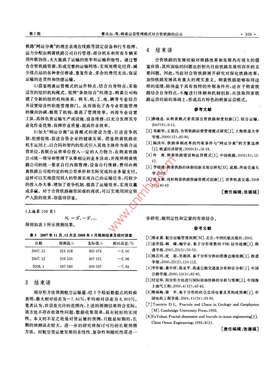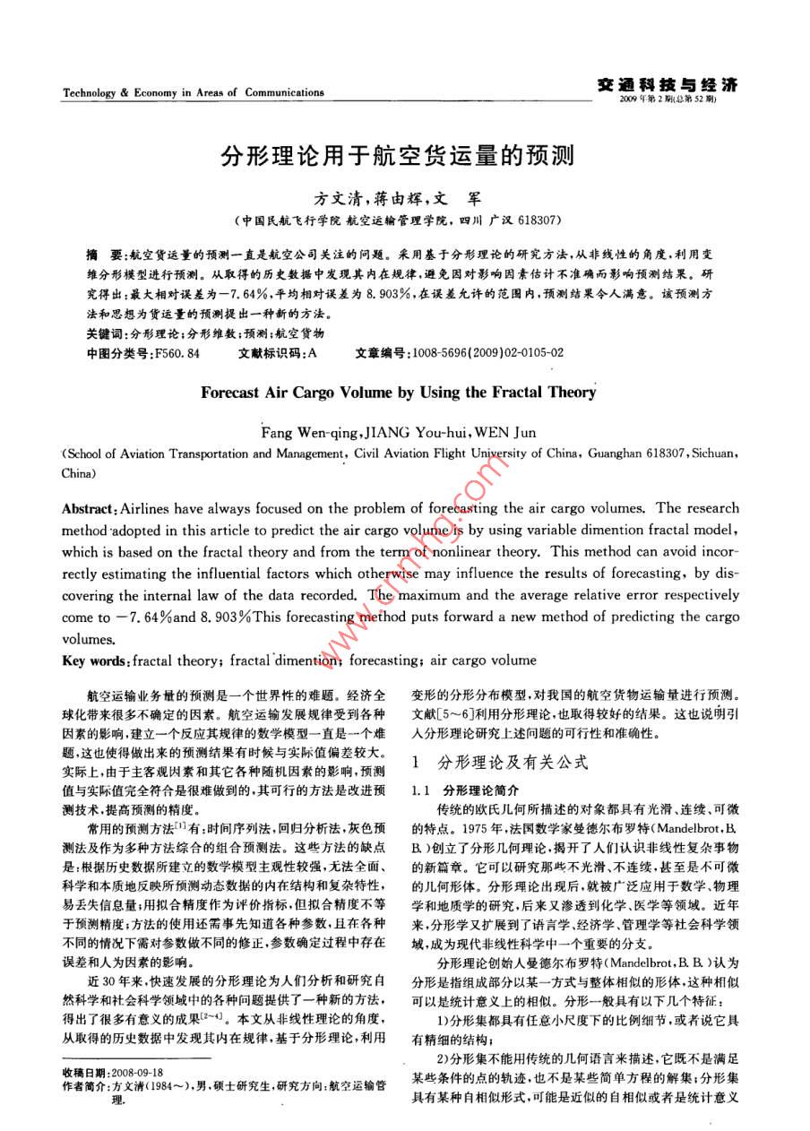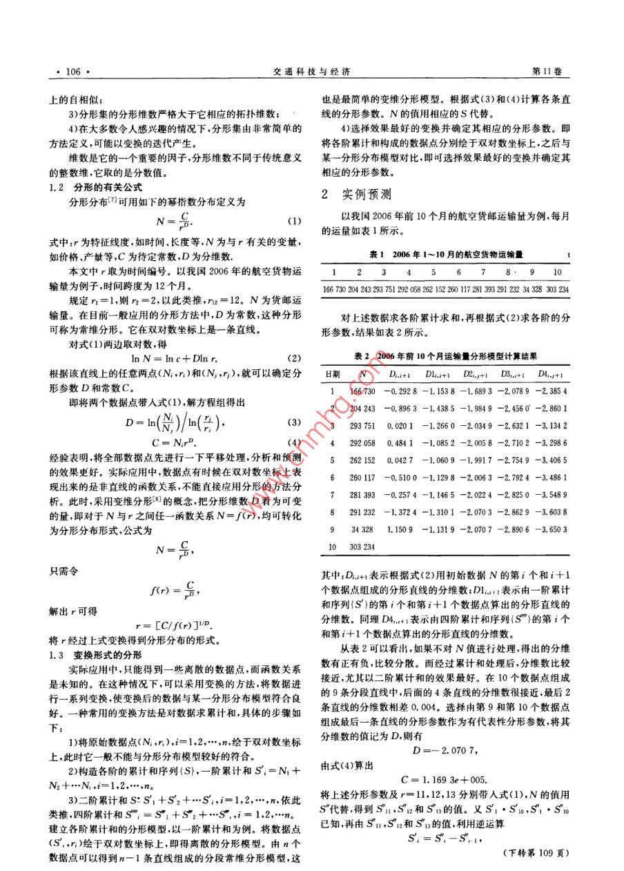 Technology Economy in Areas of Communications變通科與經(jīng)濟2009年第2期總第52分形理論用于航空貨運量的預測方文清,蔣由輝,文軍(中國民航飛行學院航空運輸管理學院,四川廣漢618307)摘要:航空貨運量的預測一直是航空公司關注的問題。采用基于分形理論的研究方法,從非線性的角度,利用變維分形模型進行預測。從取得的歷史數(shù)據(jù)中發(fā)現(xiàn)其內(nèi)在規(guī)律,避免因?qū)τ绊懸蛩毓烙嫴粶蚀_而影響預測結(jié)果。研究得出:最大相對誤差為一7.64%,平均相對誤差為8.903%在誤差允許的范圍內(nèi),預測結(jié)果令人滿意。該預測方法和思想為貨運量的預測提出一種新的方法。關鍵詞:分形理論;分形維數(shù);預測;航空貨物中圖分類號:F560文獻標識碼:A文章編號:10085696(2009)020105-02Forecast Air Cargo Volume by Using the Fractal TheoryFang Wen-qing, JIANG You-hui, WEN Jun(School of Aviation Transportation and Management, Civil Aviation Flight University of China, Guanghan 618307, SichuanAbstract: Airlines have always focused on the problem of forecasting the air cargo volumes. The researchmethod adopted in this article to predict the air cargo volume is by using variable dimention fractal modelwhich is based on the fractal theory and from the term of nonlinear theory. This method can avoid incorrectly estimating the influential factors which otherwise may influence the results of forecasting, by discovering the internal law of the data recorded. The maximum and the average relative error respectivelcome to -7. 64%and 8. 903%This forecasting method puts forward a new method of predicting the cargoKey words fractal theory; fractal dimention; forecasting; air cargo volume航空運輸業(yè)務量的預測是一個世界性的難題。經(jīng)濟全變形的分形分布模型,對我國的航空貨物運輸量進行預測球化帶來很多不確定的因素。航空運輸發(fā)展規(guī)律受到各種文獻[5~6]利用分形理論,也取得較好的結(jié)果。這也說明引因素的影響建立一個反應其規(guī)律的數(shù)學模型一直是一個難人分形理論研究上述問題的可行性和準確性題,這也使得做出來的預測結(jié)果有時候與實際值偏差較大實際上由于主客觀因素和其它各種隨機因素的影響預測1分形理論及有關公式值與實際值完全符合是很難做到的,其可行的方法是改進預1.1分形理論簡介測技術提高預測的精度。傳統(tǒng)的歐氏幾何所描述的對象都具有光滑、連續(xù),可微常用的預測方法有:時間序列法,回歸分析法,灰色預的特點。1975年,法國數(shù)學家曼德爾布羅特( Mandelbrot, B.測法及作為多種方法綜合的組合預測法。這些方法的缺點B)創(chuàng)立了分形幾何理論揭開了人們認識非線性復雜事物是:根據(jù)歷史數(shù)據(jù)所建立的數(shù)學模型主觀性較強,無法全面、的新篇章。它可以研究那些不光滑、不連續(xù),甚至是不可微科學和本質(zhì)地反映所預測動態(tài)數(shù)據(jù)的內(nèi)在結(jié)構(gòu)和復雜特性,的幾何形體。分形理論出現(xiàn)后,就被廣泛應用于數(shù)學物理易丟失信息量;用擬合精度作為評價指標但擬合精度不等學和地質(zhì)學的研究,后來又滲透到化學、醫(yī)學等領域。近年于預測精度;方法的使用還需事先知道各種參數(shù),且在各種來,分形學又擴展到了語言學經(jīng)濟學管理學等社會科學領不同的情況下需對參數(shù)做不同的修正,參數(shù)確定過程中存在域,成為現(xiàn)代非線性科學中一個重要的分支誤差和人為因素的影響。分形理論創(chuàng)始人曼德爾布羅特( Mandelbrot,BB)認為近30年來快速發(fā)展的分形理論為人們分析和研究自分形是指組成部分以某一方式與整體相似的形體這種相似然科學和社會科學領域中的各種問題提供了一種新的方法,可以是統(tǒng)計意義上的相似。分形一般具有以下幾個特征:得出了很多有意義的成果2。本文從非線性理論的角度,1)分形集都具有任意小尺度下的比例細節(jié),或者說它具從取得的歷史數(shù)據(jù)中發(fā)現(xiàn)其內(nèi)在規(guī)律,基于分形理論,利用有精細的結(jié)構(gòu);2)分形集不能用傳統(tǒng)的幾何語言來描述,它既不是滿足作者簡介:方文清(1984~),男,碩士研究生,研究方向航空運輸管某些條件的點的軌跡,也不是某些簡單方程的解集;分形集收稿日期:2008-09-18具有某種自相似形式,可能是近似的自相似或者是統(tǒng)計意義106交通科技與經(jīng)濟第11卷上的自相似;也是最簡單的變維分形模型。根據(jù)式(3)和(4)計算各條直3)分形集的分形維數(shù)嚴格大于它相應的拓撲維數(shù);線的分形參數(shù)。N的值用相應的S代替。4)在大多數(shù)令人感興趣的情況下,分形集由非常簡單的4)選擇效果最好的變換并確定其相應的分形參數(shù)。即方法定義,可能以變換的迭代產(chǎn)生將各階累計和構(gòu)成的數(shù)據(jù)點分別繪于雙對數(shù)坐標上,之后與維數(shù)是它的一個重要的因子,分形維數(shù)不同于傳統(tǒng)意義某一分形分布模型對比,即可選擇效果最好的變換并確定其的整數(shù)維,它取的是分數(shù)值相應的分形參數(shù)1.2分形的有關公式分形分布7可用如下的冪指數(shù)分布定義為2實例預測(1)以我國2006年前10個月的航空貨郵運輸量為例每月的運量如表1所示式中:r為特征線度,如時間、長度等,N為與r有關的變量,如價格、產(chǎn)址等C為待定常數(shù)D為分維數(shù).表12006年1~10月的航空貨物運輸量本文中r