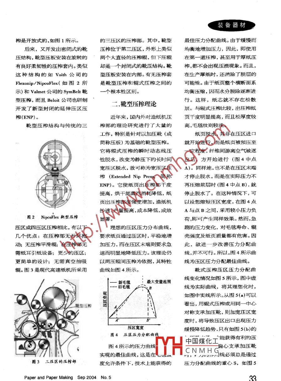裝備器材靴型壓榨技術(shù)●張紅杰,胡惠仁(天津科技大學,天津300222)摘要:靴型壓榨技術(shù)的開發(fā)與應用大大促進了造紙行業(yè)的發(fā)展。本文對靴型壓榨技術(shù)的發(fā)展、靴型壓榨理論以及靴型壓榨技術(shù)的應用情況作了簡要的敘述。關(guān)鍵詞:新型壓榨技術(shù);靴型壓榨;壓榨理論;應用中圖分類號:TS734*. 3文獻標識碼:A文章編號:1001 - 6309(2004)05 - 0032 -04隨著人們對紙需求量的增和盲孔壓榨,這些壓榨類型主要區(qū)長度-般為150 ~ 300mm,壓加以及紙機車速的提高,要保證是解決毛毯水分的快速轉(zhuǎn)移以區(qū)壓榨時間也要比傳統(tǒng)壓榨長紙機良好的運行性,首先要解決防止紙頁的回濕。在上世紀后6~ 10倍,有利于紙頁更好地脫好濕紙頁的脫水問題,即高效壓期,又出現(xiàn)了一些有發(fā)展前途的水。榨。由于傳統(tǒng)的壓榨和干燥中脫新型壓榨技術(shù),例如熱壓榨、雙在靴型壓榨中,壓榨壓力通水能力受到較大的限制,所以紙?zhí)簤赫ズ脱バ蛪赫サ取3J怯芍邪嫉难バ蛪簠^(qū)產(chǎn)生,靴機車速的提高需要增加脫水元型壓區(qū)由上壓輥壓榨下壓輥表件,從而增加紙機的整個長度。-. 靴型壓榨的發(fā)展面的履帶-層有彈性的合在較高車速的紙機上,紙頁又將靴型壓榨從上世紀80年代成材料壓榨墊所產(chǎn)生。受到更多的外力。隨著紙頁的低初發(fā)明以來,對其使用日益增長靴型壓榨通過提高壓榨時定量化和二次纖維的利用,紙頁并趨于普及。這種壓榨類型屬于間來增加壓榨水的移除,它主要運行性能的改善更加必要。高壓榨力壓榨或稱為寬壓區(qū)壓是利用水壓將”下部的靴型壓板造紙機早期的壓榨部采用榨。較高的壓榨力是指與平壓輥壓在_上部的壓輥上,支撐著濕紙平壓輥壓榨,利用毛毯橫向轉(zhuǎn)移相比具有較高的壓榨比壓;寬壓頁的毛毯和膠帶通過靴型壓板濕紙頁的水分。但平壓輥壓區(qū)的區(qū)也是與傳統(tǒng)的壓輥壓榨相比,和_上壓輥的壓區(qū)。最初的靴型壓壓榷毛毯易被水分所飽和,因此濕紙頁在壓區(qū)內(nèi)有較長的停留| 毛毯水分很容易回流,直到出現(xiàn)了真時間。寬壓區(qū)壓榨基于大直徑壓=濕紙頁空壓輥。而真空壓榨也有其自身輥所形成的壓區(qū)(也稱為長壓區(qū)的缺點:壓榨輥殼上的孔易被腐壓榨, LNP),傳統(tǒng)壓榨的壓區(qū)長毛毯膠帶蝕,紙頁出現(xiàn)影痕,噪聲大等。由度為20 ~ 60mm,而輥中國煤化工靴型壓榨于這些原因,又出現(xiàn)了溝紋壓榨1 500~ 1900mm。靴式:TYHCNMHG作者簡介:張紅杰(1976 - ),男,現(xiàn)在天津科技大學制漿造紙專業(yè)攻讀碩士學位,研究方向:造紙化學品的開發(fā)及其應用。322004年9月第5期《紙和造紙》裝備器材榨是開放式的,如圖1所示。的三壓區(qū)的壓榨部。其中,靴型最佳壓力分配曲線。由于緩慢而后來,又開發(fā)出密閉式的靴壓榨位于第三壓區(qū),外形上類似均衡地增加壓力,因此,即使用壓結(jié)構(gòu),靴型壓板安裝在旋轉(zhuǎn)的兩個大直徑的壓榨輥,但下壓輥在第一道壓榨,甚至用于厚紙壓有良好柔韌性的壓榨套內(nèi)。類似卻是一個封閉式的靴壓結(jié)構(gòu)。靴榨,都不會出現(xiàn)壓潰現(xiàn)象。而且,這種結(jié)構(gòu)的如Voith公司的型壓板安裝在內(nèi)部。有無壓榨套在生產(chǎn)厚紙時,還消除了脫層的Flexonip/ NipcoFlex(如圖2所.是靴型壓榨和輥式壓榨之間的可能性。由于紙頁整個橫斷面系示和Valmet公司的SymBelt靴一個根本性區(qū)別。均衡壓縮,而水分脫除逐漸進型壓榨,而且Beloit公司也研制二靴型壓榨理論行。這樣,紙芯就不存在松散開發(fā)了新型封閉的延伸壓區(qū)壓層。與輥式壓榨比較,出壓榨紙榨(ENP)。近年來,國內(nèi)外對造紙機壓頁千度明顯提高,而且松厚度較靴型壓榨結(jié)構(gòu)與傳統(tǒng)的三榷部的理論研究進行了大量的高,毛毯紋則較淺。工作,特別是針對以加壓靴(或紙頁脫水,并非在壓區(qū)進口簡稱壓板)為基礎的靴型壓榷。就開始進行,而是紙頁被預壓至它將輥式壓榨的瞬時動態(tài)線壓一定程度, 纖維間游離空氣被逐性脫水,改變?yōu)殪o壓下的長時間出后,方開始進行(圖4中點寬壓區(qū)脫水,故可稱為寬壓區(qū)壓A)。同樣地,也不是在壓區(qū)末端榨(Extended Nip Press, 簡稱,才停止脫水,而是在實際壓力不ENP)。它使紙頁出壓榨部干度再壓縮漿層時(圖4中點B),就提高,烘干部蒸汽消耗降低,紙停止脫水了。在這種情況下,可頁出壓榨部濕強度增加,造紙機以設想縮短壓區(qū)寬度,在圖4點抄速、產(chǎn)量提高,成本降低,成效A與點B .之間,采用較小壓力負圖2。NipeoFlex 靴型壓榨顯著。荷,即可產(chǎn)生同樣效果。然而,急壓區(qū)或四壓區(qū)壓榨相比,有以下理想的壓區(qū)壓力分布曲線,劇的壓力變化,對毛毯壽命、輥,幾個優(yōu)點:在壓榨部無開環(huán)拖要求紙頁通過壓區(qū)時,平穩(wěn)地增殼強度及紙頁質(zhì)量都有危害。因動;無壓榨平滑輥;在壓榨部無加壓力,而在壓區(qū)末端則要求急此,欲進一步改善壓力分配曲需紙耳引紙設備;更少的壓區(qū);速而明顯地降低壓力。該理論仍線,并不可行。所以,圖4所示曲更簡單的設計;無需真空抽吸以兩壓輥間壓榷為依據(jù),其特性線為壓區(qū)壓力分配最佳曲線。輥。圖3是現(xiàn)代高速紙機所采用曲線如圖4所示。靴式壓榨壓區(qū)壓力分配曲最大變量范圍線變化情況如圖5