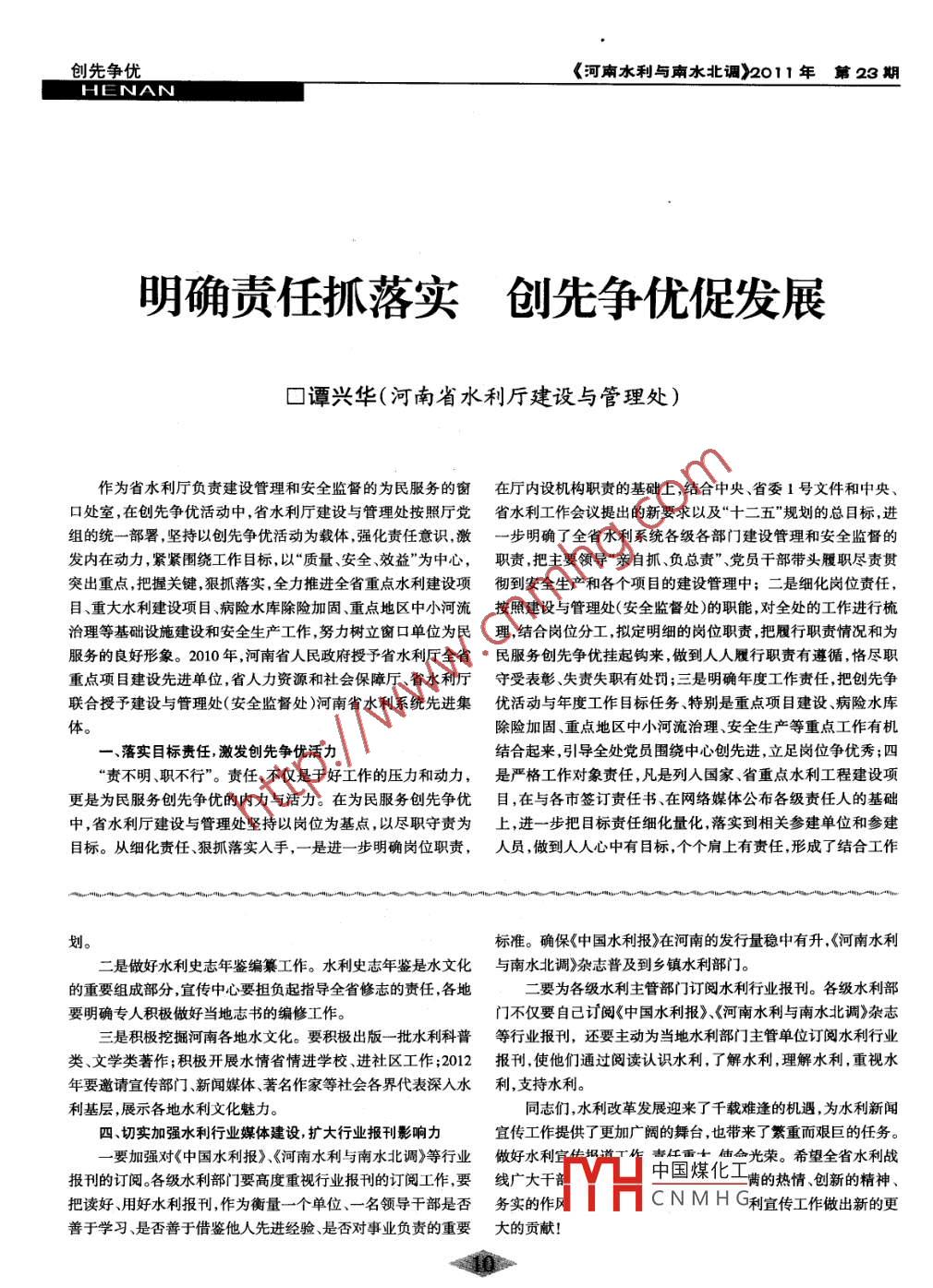 《河南水利與南水北調(diào)》2011年第23 期全省水利宣傳工作會上ENAN河南省水利宣傳工作會議總結(jié)講話口王國棟(省水利廳黨組成員、副廳長)(2011年12月27日)在與會代表的共同努力下,全省水利宣傳工作會議即將完合考評辦法,建立完善的獎懲制度。成各項(xiàng)議程。本次水利宣傳會議,規(guī)格之高、規(guī)模之大,前所未三、加強(qiáng)新聞發(fā)布,發(fā)揮引導(dǎo)作用有,充分體現(xiàn)了新時(shí)期水利新聞宣傳工作的重要地位體現(xiàn)了廳-是健全新聞發(fā)言人制度。各級水利部門都應(yīng)確立本部門黨組對新聞宣傳工作的高度重視,體現(xiàn)了水利部和省委省政府的新聞發(fā)言人,主動開展水利新聞發(fā)布活動,特別是涉及公眾利對我省水利宣傳工作的大力支持。益的重要信息重大問題和突發(fā)公共事件,要搶占新聞引導(dǎo)輿論下面,我就如何貫徹落實(shí)會議精神談三點(diǎn)意見:第-一制高點(diǎn)。一、 把握核心要求,強(qiáng)化責(zé)任落實(shí)二是完善水利新聞宣傳員制度。各單位要大力支持水利宣一是提高認(rèn)識。各級水利部門要自覺把水利宣傳工作擺在傳員的工作,積極提供便利條件.廳辦公室要會同宣傳中心加強(qiáng)水利全局工作的重要位置,與水利業(yè)務(wù)工作- -同研究部署,一同對宜傳員的管理,定期考核、通報(bào)、獎勵(lì)。檢查落實(shí),- -同考核表彰。三是做好應(yīng)急宜傳和日常宜傳。對于突發(fā)事件要及時(shí)處理,二是明確責(zé)任。各級水利部門要把水利新聞宣傳工作成效嚴(yán)格按照有關(guān)制度進(jìn)行新聞發(fā)布, 嚴(yán)禁不講宜傳紀(jì)律,胡亂發(fā)作為衡量領(lǐng)導(dǎo)干部工作業(yè)績的重要內(nèi)容,主要領(lǐng)導(dǎo)要親自過問,布。對于-一些常態(tài)性的工作,要做好日常宣傳,從平淡中找出新分管領(lǐng)導(dǎo)要具體負(fù)責(zé),職能部門要分工落實(shí)。聞亮點(diǎn)。三是抓好督導(dǎo)。水利廳自2012年起,每年都要評出宣傳工四是加強(qiáng)培訓(xùn)。各級水利部門主要負(fù)責(zé)人、主管宣傳的負(fù)責(zé)作先進(jìn)單位和個(gè)人,予以表彰。對于宣傳工作的后進(jìn)單位,將酌人和新聞宣傳員要積極參加水利廳定期舉行的宣傳培訓(xùn)班,提情取消該單位其它評先資格。高自身宣傳意識和應(yīng)對媒體的水平。二、注重組織策劃,建立長效機(jī)制當(dāng)前已近歲末年終,水利工作各項(xiàng)任務(wù)十分繁重。各單位要一是要做好“謀劃”。要強(qiáng)化水利新聞宣傳工作的前瞻性、計(jì)全面考慮,統(tǒng)籌安排,重點(diǎn)抓好以下三項(xiàng)宣傳工作:劃性和主動性,周密制定宣傳計(jì)劃,加強(qiáng)選題策劃,不斷推出有一、貫徹落實(shí)好中央八部委《關(guān)于切實(shí)加強(qiáng)水利公益性宣傳深度、有影響的精品力作,實(shí)現(xiàn)水利新聞宣傳報(bào)道效果的最大的意見》,重點(diǎn)做好 2011年水利工作取得成績。要認(rèn)真學(xué)習(xí)文件。吃透文件精神,根據(jù)各地實(shí)際出臺相關(guān)二是要做好“業(yè)內(nèi)宣傳”。要充分利用《中國水利報(bào)》、《河南政策辦法。水利與南水北調(diào)》雜志、河南水利網(wǎng)等行業(yè)內(nèi)宣傳平臺,加強(qiáng)與二要加大宜傳力度。結(jié)合文件精神,大力宣傳2011年河南行業(yè)內(nèi)媒體的溝通聯(lián)系,積極主動提供新聞素材。水利工作取得的各項(xiàng)成績,提高社會影響,凝聚社會各界興水治三是要做好“對外宣傳”。要進(jìn)-一步加強(qiáng)與中央駐豫、河南日水力量。.中國煤化工報(bào)、河南電視臺等中央、省內(nèi)主流媒體的溝通聯(lián)絡(luò),加大對上級二、貫徹落實(shí)MHC N MH G文化大發(fā)展。部門的信息簡報(bào)報(bào)送力度,開拓渠道,擴(kuò)大水利行業(yè)社會影響。一是制定發(fā)展規(guī)劃。各級水村部[ J要按照水利部頒布的《水四是要健全激勵(lì)機(jī)制。各單位應(yīng)抓緊制定新聞宣傳工作綜文化建設(shè)規(guī)劃綱要(2011-2020年)》制定相應(yīng)的水文化發(fā)展規(guī)創(chuàng)先爭優(yōu)《河南水利與南水北調(diào)》2011年第23期HENAN明確責(zé)任抓落實(shí)創(chuàng)先爭 優(yōu)促發(fā)展口譚興華(河南省水利廳建設(shè)與管理處)作為省水利廳負(fù)責(zé)建設(shè)管理和安全監(jiān)督的為民服務(wù)的窗在廳內(nèi)設(shè)機(jī)構(gòu)職責(zé)的基礎(chǔ)上 ,結(jié)合中央、省委1號文件和中央、口處室,在創(chuàng)先爭優(yōu)活動中,省水利廳建設(shè)與管理處按照廳黨省水利工作 會議提出的新要求以及“十二五”規(guī)劃的總目標(biāo),進(jìn)組的統(tǒng)-部署,堅(jiān)持以創(chuàng)先爭優(yōu)活動為載體,強(qiáng)化責(zé)任意識,激-步明確了全省水利系統(tǒng)各級各部門建設(shè)管理和安全監(jiān)督的發(fā)內(nèi)在動力,緊緊圍繞工作目標(biāo),以“質(zhì)量、安全效益”為中心,職責(zé) 把主要領(lǐng)導(dǎo)“親自抓、負(fù)總責(zé)"、黨員干部帶頭履職盡責(zé)貫突出重點(diǎn),把握關(guān)鍵,狠抓落實(shí),全力推進(jìn)全省重點(diǎn)水利建設(shè)項(xiàng)徹到安全生產(chǎn)和各 個(gè)項(xiàng)目的建設(shè)管理中;二是細(xì)化崗位責(zé)任,目.重大水利建設(shè)項(xiàng)目、病險(xiǎn)水庫除險(xiǎn)加固