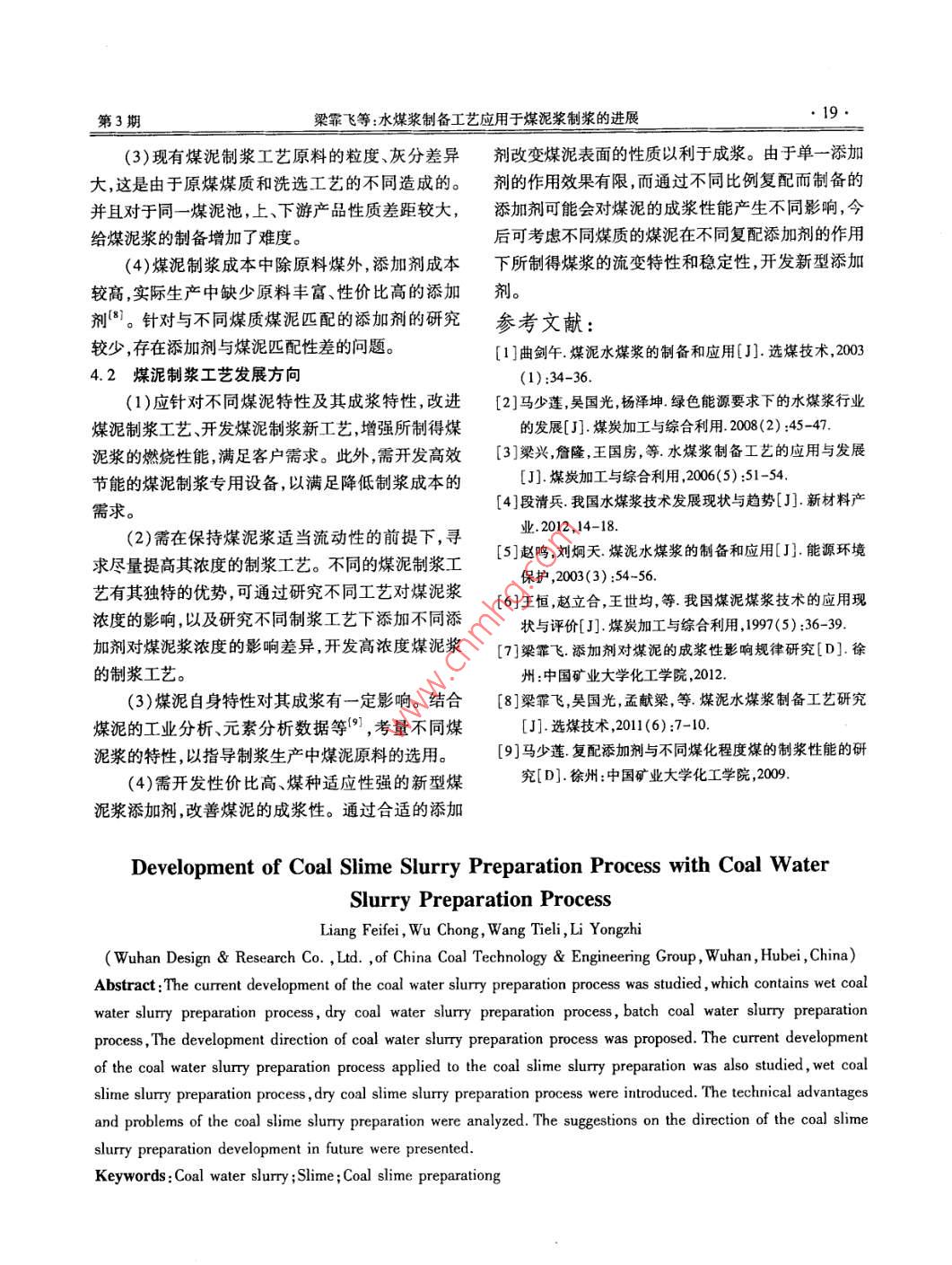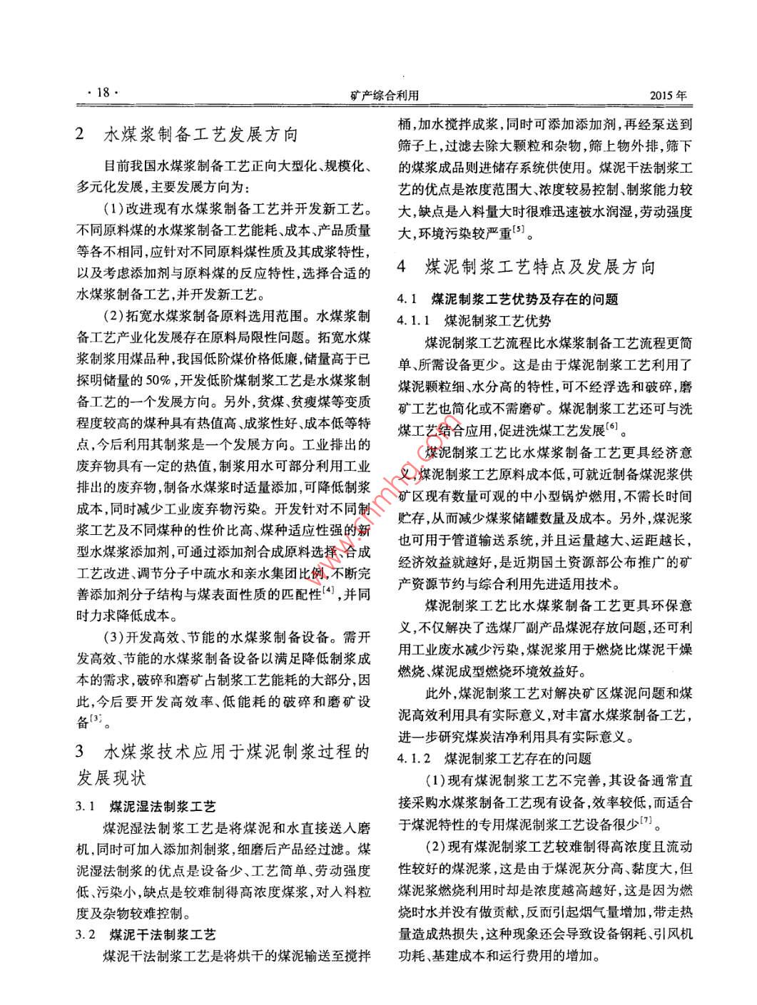 第3期礦產(chǎn)綜合利用No. 32015年6月Multipurpose Utilization of Mineral ResourcesJun.2015水煤漿制備工藝應(yīng)用于煤泥漿制漿的進(jìn)展梁霏飛,吳崇,王鐵力,李用芝(中煤科工集團(tuán)武漢設(shè)計研究院有限公司,湖北武漢430064)摘要:研究了水煤漿制備工藝的發(fā)展現(xiàn)狀,對水煤漿濕法制漿工藝、干法制漿工藝、間歇式制漿工藝進(jìn)行了評述并指出了其發(fā)展方向。研究了水煤漿制備工藝應(yīng)用于煤泥制漿過程的發(fā)展現(xiàn)狀,對煤泥濕法制漿工藝、干法制漿工藝進(jìn)行了評述,分析了煤泥制漿工藝的技術(shù)優(yōu)勢及存在的問題并提出了發(fā)展方向。關(guān)鍵詞:水煤漿;煤泥;煤泥制漿工藝doi:10.3969/jisn.1000-6532.2015.03.004中圖分類號:TD989;TQ536文獻(xiàn)標(biāo)志碼:A文章編號:10006532(201503-0017-03煤泥是選煤廠大量產(chǎn)出的副產(chǎn)品,與煤相比,礦產(chǎn)品還要過濾脫水脫水后的濾餅加添加劑進(jìn)行具有顆粒細(xì)、水分高、價格低、運輸不便、燃燒效率捏混、攪拌調(diào)漿穩(wěn)定性處理。其特點是通過混合低、環(huán)境污染嚴(yán)重等特點。有資料表明,到2020不同階段磨礦產(chǎn)品可調(diào)整粒度分布但由于有過濾、年我國煤炭產(chǎn)量為22億~24億t,而選煤廠入洗率脫水環(huán)節(jié),工藝流程復(fù)雜。將達(dá)到90%,煤泥產(chǎn)量很大。將水煤漿制備工藝應(yīng)3)中、高濃度聯(lián)合制漿工藝。采用中、高濃度用于煤泥制漿工藝,技術(shù)上可行。煤泥制漿工藝?yán)麅啥文サV,粗磨和細(xì)磨結(jié)合。其特點是產(chǎn)品粒度堆用煤泥為原料,是水煤漿制備工藝的延伸,是我國鼓積效率較高但細(xì)磨只起改善級配的作用,對于制漿勵發(fā)展的資源利用項目2。但國內(nèi)外研究煤泥制能力的提高作用不大,能耗相對較高,與高濃度磨礦漿工藝的較少,尚存在一些問題。制漿相比投資較大,生產(chǎn)操作也較復(fù)雜,多用于難制水煤漿制備工藝發(fā)展現(xiàn)狀漿煤種或用戶質(zhì)量要求高的水煤漿。(4)浮選精煤制漿工藝。利用煤炭洗選產(chǎn)生的1.1水煤漿濕法制漿工藝副產(chǎn)品煤泥經(jīng)浮選過濾調(diào)整粒度后制漿。其特點按磨礦濃度,水煤漿濕法制漿工藝有4種:是不需磨礦工序,成本較低(1)高濃度磨礦制漿工藝。將煤、水和添加劑1.2水煤漿干法制漿工藝加入磨機(jī)中研磨,產(chǎn)品經(jīng)攪拌、穩(wěn)定劑處理。其特點水煤漿干法制漿工藝是煤經(jīng)破碎、篩分處理后是對磨礦產(chǎn)品粒度分布的調(diào)整存在局限性,需掌握添加水和添加劑攪拌制漿。其特點是濃度范圍寬且磨機(jī)的磨礦性能但經(jīng)磨礦介質(zhì)磨礦后細(xì)顆粒較多,較易控制制漿能力相對較大,但環(huán)境污染嚴(yán)重,勞有利于添加劑與煤粒表面接觸,提高成漿效率。動強(qiáng)度大。(2)中濃度磨礦制漿工藝。采用約50%的固體1.3水煤漿間歇式制漿工藝濃度磨礦,產(chǎn)品粒度堆積效率低,調(diào)整產(chǎn)品粒度分布水煤漿間歇式制漿工藝是爐前制漿,工藝簡單,通常釆用兩段以上磨礦,以達(dá)到高堆積效率。對磨磨機(jī)間歇式生產(chǎn),成品煤漿去儲存系統(tǒng)。收稿日期:2014-127基金項目:中煤科工集團(tuán)重點項目(2013ZD003)作者簡介:梁霏飛(1985-),女,碩士,從事長距離輸煤管道的設(shè)計和研究工作。18礦產(chǎn)綜合利用015年2水煤漿制備工藝發(fā)展方向桶,加水?dāng)嚢璩蓾{,同時可添加添加劑,再經(jīng)泵送到篩子上,過濾去除大顆粒和雜物,篩上物外排,篩下目前我國水煤漿制備工藝正向大型化、規(guī)?;?、的煤漿成品則進(jìn)儲存系統(tǒng)供使用。煤泥干法制漿工多元化發(fā)展,主要發(fā)展方向為藝的優(yōu)點是濃度范圍大、濃度較易控制、制漿能力較(1)改進(jìn)現(xiàn)有水煤漿制備工藝并開發(fā)新工藝。大,缺點是入料量大時很難迅速被水潤濕,勞動強(qiáng)度不同原料煤的水煤漿制備工藝能耗、成本、產(chǎn)品質(zhì)量大,環(huán)境污染較嚴(yán)重。等各不相同,應(yīng)針對不同原料煤性質(zhì)及其成漿特性以及考慮添加劑與原料煤的反應(yīng)特性,選擇合適的4煤泥制漿工藝特點及發(fā)展方向水煤漿制備工藝,并開發(fā)新工藝。4.1煤泥制漿工藝優(yōu)勢及存在的問題2)拓寬水煤漿制備原料選用范圍。水煤漿制4.11煤泥制漿工藝優(yōu)勢備工藝產(chǎn)業(yè)化發(fā)展存在原料局限性問題。拓寬水煤煤泥制漿工藝流程比水煤漿制備工藝流程更簡漿制漿用煤品種我國低階煤價格低廉,儲量高于已單、所需設(shè)備更少。這是由于煤泥制漿工藝?yán)昧颂矫鲀α康?0%,開發(fā)低階煤制漿工藝是水煤漿制煤泥顆粒細(xì)、水分高的特性可不經(jīng)浮選和破碎磨備工藝的一個發(fā)展方向。另外,貧煤、貧瘦煤等變質(zhì)礦工藝也簡化或不需磨礦。煤泥制漿工藝還可與洗程度較高的煤種具有熱值高、成漿性好成本低等特煤工藝結(jié)合應(yīng)用,促進(jìn)洗煤工藝發(fā)展。點,今后利用其制漿是一個發(fā)展方向。工業(yè)排出的廢棄物具有一定的熱值,制漿用水可部分利用工業(yè)煤泥制漿工藝比水煤漿制備工藝更具經(jīng)濟(jì)意義,煤泥制漿工藝原料成本低,可就近制備煤泥漿供排出的廢棄物,制備水煤漿時適量添加,可降低制漿礦區(qū)現(xiàn)有數(shù)量可觀的中小型鍋爐燃用,不需長時