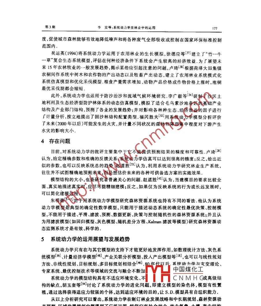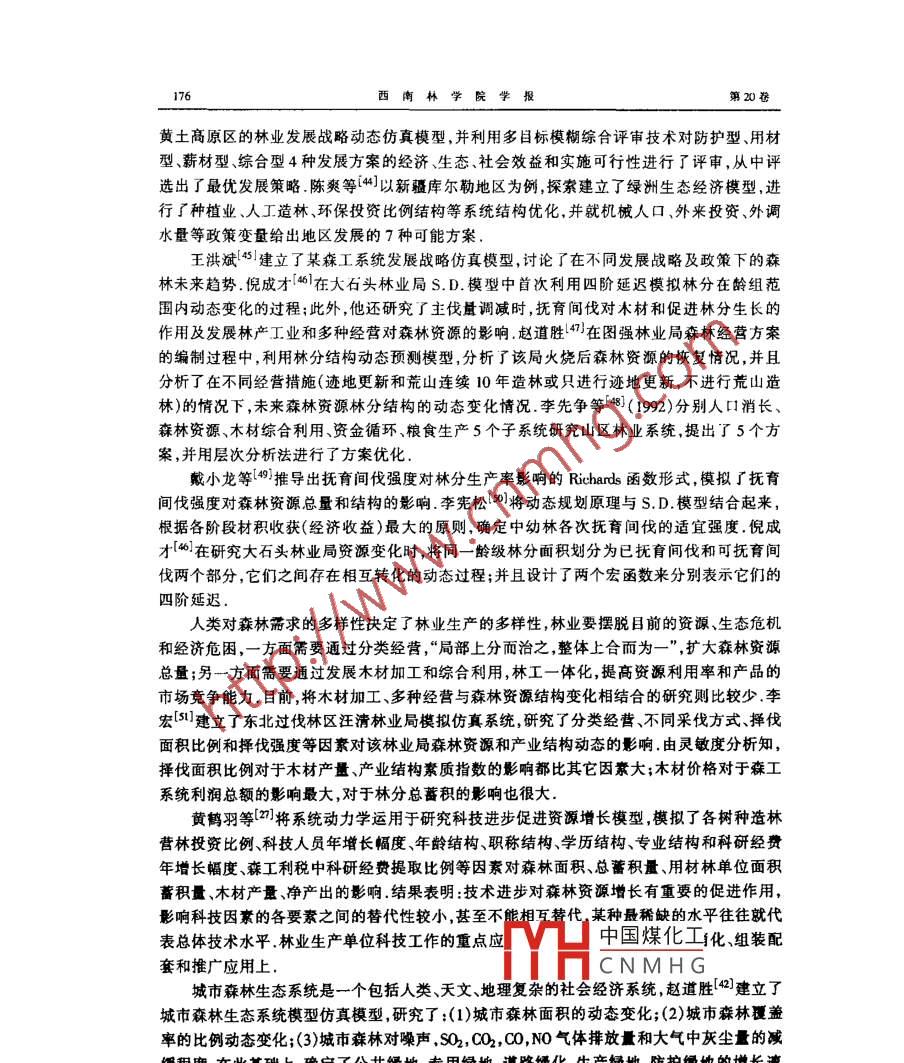 第20卷第3期Vol. 20 No. 3000年9月JOURNAL OF SOUIHWEST FORESIRY COLFGE系統(tǒng)動(dòng)力學(xué)在林業(yè)中的運(yùn)用李宏,唐守正(中國(guó)林業(yè)科學(xué)研究院,北泉10091)摘要:對(duì)系統(tǒng)動(dòng)力學(xué)的發(fā)展過(guò)程、特點(diǎn)和在林業(yè)科學(xué)中的運(yùn)用進(jìn)行了綜述,并指出了應(yīng)用過(guò)程中存在的問(wèn)題和發(fā)展趨勢(shì)關(guān)鍵詞:系統(tǒng)動(dòng)力學(xué);森林資源;反饋環(huán)中圖分類號(hào):019文獻(xiàn)標(biāo)識(shí)碼:A文章編號(hào):10-717(x00-0174-061概述系統(tǒng)動(dòng)力學(xué)( System Dymamics縮寫(xiě)為S.D),也稱為系統(tǒng)動(dòng)態(tài)學(xué),是由美國(guó)麻省理工學(xué)院的福雷斯特教授50年代創(chuàng)立的,它是以反饋控制理論為基礎(chǔ)、數(shù)字計(jì)算仿真技術(shù)為手段、研究復(fù)雜社會(huì)經(jīng)濟(jì)大系統(tǒng)的方法其理論基礎(chǔ)是20世紀(jì)40年代維納教授創(chuàng)立的控制論系統(tǒng)動(dòng)力學(xué)產(chǎn)生初期,主要運(yùn)用于工業(yè)生產(chǎn)過(guò)程中庫(kù)存的波動(dòng)、勞動(dòng)力的不穩(wěn)定以及市場(chǎng)股票下跌等問(wèn)題,因此被稱為“工業(yè)動(dòng)力學(xué)”.70年代初,系統(tǒng)動(dòng)力學(xué)模型被用于研究世界模型、美國(guó)經(jīng)濟(jì)模型,獲得了空前的成功解開(kāi)了一些經(jīng)濟(jì)學(xué)中長(zhǎng)期存在的疑團(tuán),如“長(zhǎng)波”現(xiàn)象形成的原因21.目前,系統(tǒng)動(dòng)力學(xué)廣泛運(yùn)用于研究城市經(jīng)濟(jì)發(fā)展、企業(yè)經(jīng)營(yíng)管理宏觀經(jīng)濟(jì)規(guī)劃、區(qū)域經(jīng)濟(jì)、科技管理、能源規(guī)劃醫(yī)學(xué),甚至于工程系統(tǒng)等許多領(lǐng)域我國(guó)于80年代初引進(jìn)系統(tǒng)動(dòng)力學(xué)后,不僅在理論上進(jìn)行了研究1-,而且從國(guó)家、城市、地區(qū)、其它專題層次上,對(duì)社會(huì)經(jīng)濟(jì)系統(tǒng)分析(宏觀、區(qū)域、縣鄉(xiāng))8-10、發(fā)展戰(zhàn)略和經(jīng)濟(jì)社會(huì)發(fā)展總體規(guī)劃B、城市生態(tài)系統(tǒng)研究生產(chǎn)管理(設(shè)備投資與折舊、工業(yè)生產(chǎn))4、技術(shù)進(jìn)步促進(jìn)經(jīng)濟(jì)發(fā)展作用、資源配置與土地承載能力35-18、農(nóng)林牧副漁動(dòng)態(tài)調(diào)節(jié)與控制19-2等方面都進(jìn)行了廣泛研究與運(yùn)用80年代以前,DOS環(huán)境下系統(tǒng)動(dòng)力學(xué)的仿真軟件主要有 DANAMOⅡ, DANAMOⅢDANAMo IYL4. DANAMOⅢ具備陣列式描述功能, DANAMOⅣ具有處理特高階數(shù)模型能力80年代中后期仿真軟件主要有PD-PLUs( Professional Dynam-PLUS), DYSMAP等系列年代出現(xiàn)了可在 WINDOWS環(huán)境下運(yùn)行的仿真軟件Ⅴ ensim和 MODELMAKER3.02.MODE收稿日期:2000-09-06M中國(guó)煤化工蒿金項(xiàng)目:國(guó)家自然科學(xué)基金傾斜項(xiàng)目“東北過(guò)伐林區(qū)可目“森林資源監(jiān)測(cè)指標(biāo)體系和先進(jìn)技術(shù)的引進(jìn)"資助CNMHG作者簡(jiǎn)介:李宏(1965-),男,江西于都人,講師博士林賢管理慟工怍中國(guó)科學(xué)院院士第3期李宏等:系統(tǒng)動(dòng)力學(xué)在林業(yè)中的運(yùn)用MAKER3.02是由 Cherwell Scientific公司開(kāi)發(fā)的優(yōu)秀的系統(tǒng)動(dòng)力軟件,它將畫(huà)系統(tǒng)流圖和編程這兩步繁雜的工作融為一體,編程過(guò)程可視性很強(qiáng);不僅變量、參數(shù)可以直接用中文加以注釋,而且可以通過(guò)文本框在圖中任意位置加入文本材料或背景知識(shí),對(duì)軟件/程序加以說(shuō)明孫國(guó)基等2開(kāi)發(fā)和研制了EXSL-仿真軟件能夠提供比 DYNAMO語(yǔ)言更精確的積分方法和更多的函數(shù)此外朱志明等2用Bic語(yǔ)言、李廣毅等叫用C語(yǔ)言編寫(xiě)了仿真軟件2系統(tǒng)動(dòng)力學(xué)的特點(diǎn)系統(tǒng)動(dòng)力學(xué)的研究對(duì)象主要是非線性、高層次、多變量、多重反饋復(fù)雜時(shí)變的開(kāi)放系統(tǒng)如社會(huì)、經(jīng)濟(jì)、生物和生物系統(tǒng),其研究目的是:(1)通過(guò)分析系統(tǒng)內(nèi)的因果反饋關(guān)系和眾多因素對(duì)系統(tǒng)目標(biāo)的影響,從中篩選出影響系統(tǒng)發(fā)展的主導(dǎo)因子;(2)分析預(yù)測(cè)不同經(jīng)營(yíng)策略可能帶來(lái)的資源、環(huán)境、生態(tài)環(huán)境影響,為經(jīng)營(yíng)者和決策者提供決策依據(jù)系統(tǒng)動(dòng)力學(xué)的特點(diǎn)是:對(duì)數(shù)據(jù)的依賴性較小;采取定性、定量相結(jié)合的結(jié)構(gòu)——功能模擬方法,強(qiáng)調(diào)系統(tǒng)結(jié)構(gòu)分析;“積木型”的模型結(jié)構(gòu),操作靈活,可塑性很強(qiáng);既可以對(duì)未來(lái)進(jìn)行預(yù)測(cè),也可以回顧系統(tǒng)歷史行為;比較容易反映非線性和延期反應(yīng)等用數(shù)學(xué)形式難以表達(dá)的過(guò)程系統(tǒng)動(dòng)力學(xué)適用于高維、非線性時(shí)變和參數(shù)不精確系統(tǒng)的模擬系統(tǒng)動(dòng)力學(xué)分析問(wèn)題的步驟是:系統(tǒng)結(jié)構(gòu)分析,繪制因果關(guān)系圖和系統(tǒng)流圖;建立相關(guān)的數(shù)學(xué)模型;編程建立模擬模型,對(duì)模型進(jìn)行檢驗(yàn)和調(diào)試;模擬各種政策、措施執(zhí)行效果,并對(duì)影響系統(