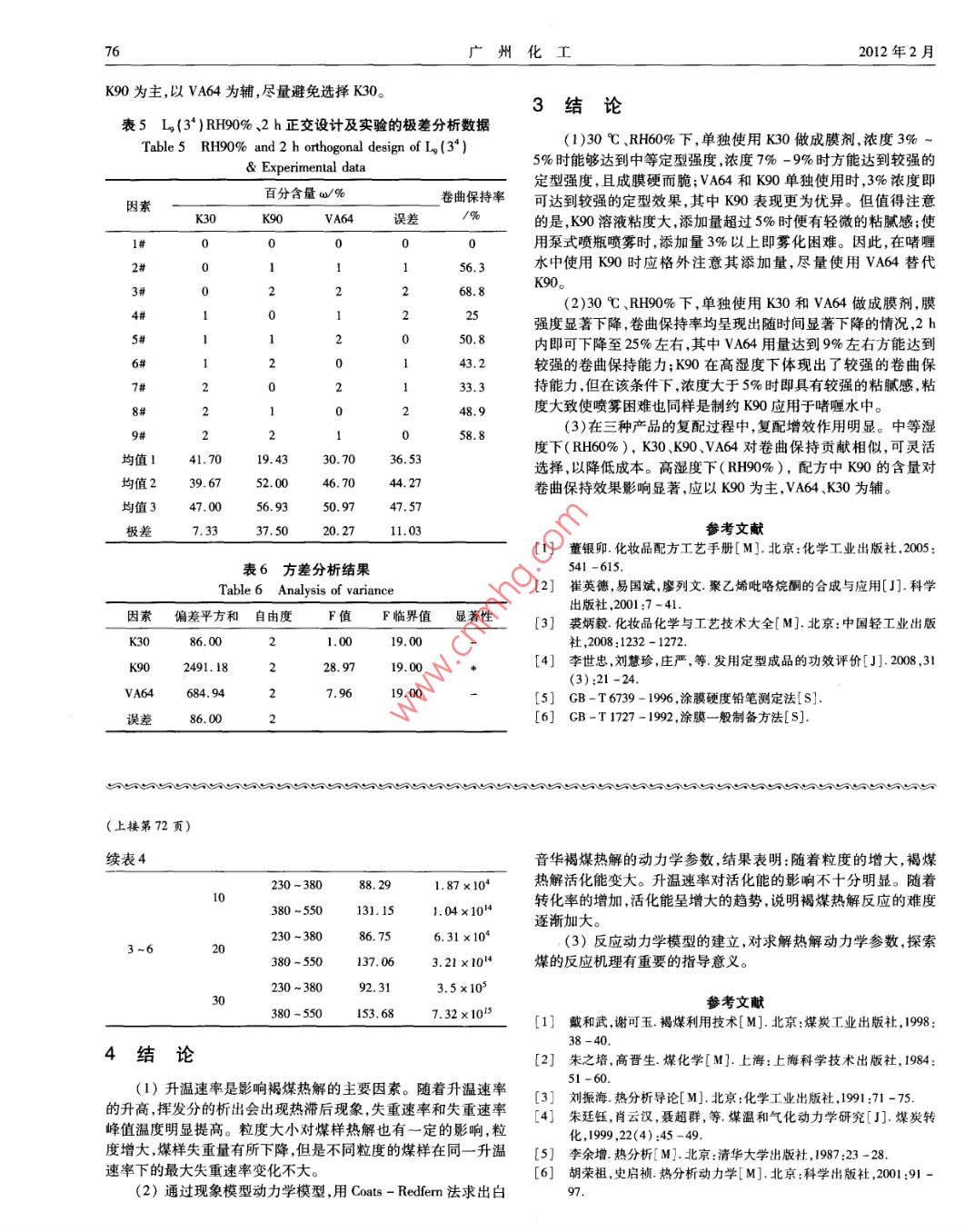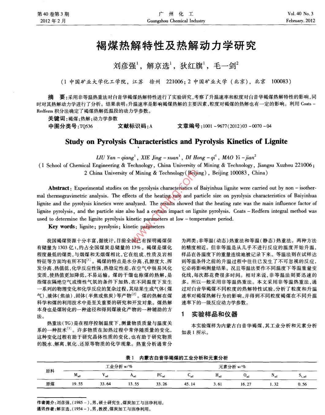 第40卷第3期廣州化工Vol. 40 No. 32012 年2月Guangzhou Chemical IndustryFebruary. 2012褐煤熱解特性及熱解動(dòng)力學(xué)研究劉彥強(qiáng)',解京選',狄紅旗',毛- -劍(1中國(guó)礦業(yè)大學(xué)化工學(xué)院,江蘇徐州221006;2 中國(guó)礦業(yè)大學(xué)(北京),北京100083)摘要:采用非等溫?zé)嶂胤▽?duì)白音華褐煤熱解特性進(jìn)行了實(shí)驗(yàn)研究,考察了升溫速率和粒度對(duì)白音華褐煤熱解特性的影響,同時(shí)對(duì)其熱解動(dòng)力學(xué)進(jìn)行了分析。結(jié)果表明:升溫速率是影響褐煤熱解的主要因素,粒度對(duì)褐煤的熱解也有- -定的影響。利用Coats -Redferm 積分法確定了褐煤熱解低溫段的動(dòng)力學(xué)參數(shù)。關(guān)鍵詞:褐煤;熱解;動(dòng)力學(xué)參數(shù)中圖分類號(hào):TQ536文獻(xiàn)標(biāo)識(shí)碼:A文章編號(hào):1001 - 9677(2012)03 -0070 -04Study on Pyrolysis Characteristics and Pyrolysis Kinetics of LigniteLIU Yan -qiang', XIE Jing - xuan',DI Hong -qi' , MAO Yi -jian2(1 School of Chemical Engineering & Technology, China University of Mining & Technology , Jiangsu Xuzhou 221006;2 China University of Mining & Technology( Beijing) , Beijing 100083, China)Abstract: Experimental studies on the pyrolysis characteristics of Baiyinhua lignite were carried out by non - isother-mal thermogravimetric analysis. The effects of the heating rate and particle size on pyrolysis characteristics of Baiyinhualignite and the pyrolysis kinetics were analyzed. The results showed that the heating rate was the main influence factor oflignite pyrolysis, and the particle size also had a certain impact on lignite pyrolysis. Coats - Redfern integral method wasused to determine the lignite pyrolysis kinetic parameters at low - temperature period.Key words: lignite; pyrolysis ; kinetic parameters我國(guó)褐煤資源十分豐富,據(jù)統(tǒng)計(jì),目前全國(guó)已有探明褐煤保為兩類 :非等溫(動(dòng)態(tài))熱重法和等溫(靜態(tài))熱重法。兩種方法有儲(chǔ)量為1303億t,約占全國(guó)煤炭總儲(chǔ)量的13%。褐煤是煤化的精度相近。 但非等溫是從幾乎不進(jìn)行反應(yīng)的溫度開始升溫,程度最低的煤類,與煙煤和無煙煤相比,它在組成、性質(zhì)及巖相樣品在各溫度下的重量連續(xù)地被記錄下來。等溫法則在試樣達(dá)特征等方面均有所不同”。褐煤的特點(diǎn)是水分高、孔隙度大、揮到等溫條件之前的升溫過程中往往已發(fā)生了不可忽視的反應(yīng),發(fā)分高、熱值低,化學(xué)反應(yīng)性強(qiáng),熱穩(wěn)定性差,在空氣中極易風(fēng)化它必將影響測(cè)量結(jié)果。況且等溫法要作不同溫度下等溫重量變變質(zhì),使熱值更加降低,不易運(yùn)輸。煤的干餾也稱煤的熱解,是化線,每次都花費(fèi)很多時(shí)間。相對(duì)來說,非等溫法則要迅速的指煤在隔絕空氣或惰性氣氛的條件下加熱,在不同溫度下發(fā)生多。所以一般采用非等溫?zé)嶂胤?。本文采用非等溫?zé)嶂胤?通一系列的物理變化和化學(xué)反應(yīng)的復(fù)雜過程,其結(jié)果生成氣體(煤過對(duì) 白音華褐煤不同粒度的熱解特性試驗(yàn),分析了粒度和升溫氣)、液體(焦油)、固體(半焦或焦炭)等產(chǎn)物[21。煤的熱解在煤速率對(duì)褐煤熱解行為的影響,并得到不同粒度褐煤在不同升溫科學(xué)和煤的利用技術(shù)中是至關(guān)重要的研究和開發(fā)對(duì)象。煤熱解速率下的一級(jí)反應(yīng)動(dòng)力學(xué)參數(shù)。本身也是煤轉(zhuǎn)化的一種途徑和得到煤液化產(chǎn)物的一-種輔助的方1實(shí)驗(yàn)樣品和儀器去。熱重法( TG)是在程序控制溫度下,測(cè)量物質(zhì)質(zhì)量與溫度關(guān)本實(shí)驗(yàn)煤樣為內(nèi)蒙古白音華褐煤,其工業(yè)分析和元素分析系的一種技術(shù)”。許多物質(zhì)在加熱過程中常伴隨質(zhì)量的變化,如表1所示。這種變化過程有助于研究晶體性質(zhì)的變化,也有助于研究物質(zhì)的脫水解離氧化、還原等物質(zhì)的化學(xué)現(xiàn)象。熱重分析通常分表1內(nèi)蒙古白音華 褐煤的工業(yè)分析和元素分析工業(yè)分析w/%元素分析w/%原料MasAFC.aS.a原煤19.5533. 6413.5533. 2645. 143.6116.271.320. 56作者簡(jiǎn)介:劉彥強(qiáng),(1985 -),男,碩士研究生.煤炭加工與潔凈利用。通訊作者:解京選,(1954-).男,教授,煤炭加工與潔凈利用。第40卷第3期.劉彥強(qiáng)等:褐煤熱解特性及熱解動(dòng)力學(xué)研究7試驗(yàn)使用儀器為德國(guó)NEIZSCH公司STA409C型DTA/DSC表2不同升溫速率下褐煤的熱解特征參數(shù)- TG同步綜合熱分析儀,其主要部件有:熱天平、溫度傳感器(STab.2 Pyrolysis characteristic values of lignite with diferent型熱電偶,最小溫差為0.17 C)、程序控溫裝置、加熱電爐等。heating rate該熱分析儀將TG與DTA及DSC結(jié)合為-體,在同一次測(cè)量中升溫速率初始熱解溫度失 重速率峰值熱解終溫利用同一樣品可同步得到熱失重與差熱信號(hào)。溫度控制范圍為/ K/min)To/C溫度T。/CT/C0~ 1600 C ,熱重靈敏度為1.25 ug,樣品質(zhì)量為0 ~ 500 mg,熱量1078437482測(cè)量范圍為0~ 500 mV,差熱靈敏度為18 μV/mV,差熱測(cè)量范圍0~ 5000 μV。2091442487實(shí)驗(yàn)樣品用量為I5 mg,采用氮?dú)庾鬏d氣,流量為100 mL/min,382447實(shí)驗(yàn)升溫速率分別為10 K/min,20 K/min ,30 K/min ,樣品粒度分別為<1 mm,1 ~3 mm,3 ~6 mm,實(shí)驗(yàn)溫度為室溫至1000 C。2.2粒度對(duì)褐煤熱解 特性的影響2實(shí)驗(yàn)結(jié) 果和討論三I2.1
