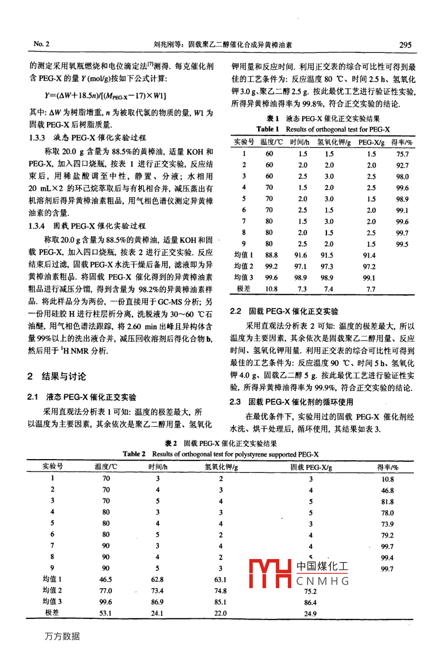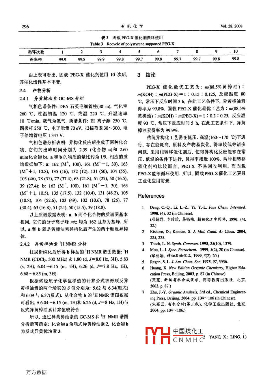 2008年第28卷有機化學Vol. 28, 2008第2期, 293~296Chinese Journal of Organic ChemistryNo. 2.293~296●研究簡報●固載聚乙二醇催化合成異黃樟油素劉兆剛.朱凱*(南京林業(yè)大學化工學院南京210037)捎要以聚乙二醇 和固載聚乙二醇作為相轉移催化劑,在無溶劑條件下,黃樟油素經催化異構合成異黃樟油素.通過正交實驗,得到固載PEG-X (polyethylene glycol-X)催化最優(yōu)工藝條件為: m88.5%黃樟油) : m(KOH) : m(PEG-X)=1:0.2:0.25,反應溫度90 C, 反應時間5 h,在此工藝條件下,異黃樟油素得率為99.9%.固載PEG-X催化劑循環(huán)使用10次后其催化活性未見下降.結果顯示,固載聚乙二醇催化工藝具有操作簡便、反應溫度低、時間短、產率高以及對環(huán)境友好等優(yōu)點.用'H NMR, GC-MS對異構黃樟油素結構進行了表征,研究了固載聚乙二醇作為相轉移催化劑合成異黃樟油素的反應機理.關鍵詞異黃樟油素; 異構化;固載聚乙二醇;相轉移催化劑Synthesis of lsosafrole Catalyzed by Polyethylene GlycolSupported on PolystyreneLIU, Zhao-GangZHU, Kai*(College of Chemical Engineering, Nanjing Forestry Universit, Nanjing 210037)Abstract Isosafrole was synthesized from safrole by PEG-X (polyethylene glycol-X) or PEG-X supportedon polystyrene as a phase-transfer catalyst in solvent-free conditions. According to orthogonal experiments,the optimum technological conditions were obtained as follows: m(8.5% safrole) : m(KOH) :m(PEG-X)=1 : 0.2 : 0.25, temperature 90 C and time 5 h. The yield of isosafrole was 99% under suchconditions. The PEG-X supported on polystyrene can be used repeatedly for ten times without remarkableloss of catalytic activity. The results showed that this method provides several advantages such as a simplework-up procedure, a shorter reaction time, a lower reaction temperature, a higher yield and environmentalfriendliness. The structures of isosafrole were determined by 'H NMR and GC-MS spectra. A possiblemechanism for this reaction was proposed by PEG-X supported on polystyrene.Keywords isosafrole; isomerization; PEG supported on polystyrene; phase transfer catalyst洋茉莉醛是一種具有清甜豆香、茴香香氣的花香香包括黃樟油素的異構化和異黃樟油素的氧化兩步反應.料,主要用于各種香精的調配,如高級化妝品香精、芳其中黃樟油素的異構化主要有固體堿法2、季銨鹽法凹、香劑、皂用香精、食品香精、煙草香精等.此外,洋茉羰基鐵法及氫氧化鉀法(.前3種方法都能獲得較高的莉醛也是制藥工業(yè)中制備黃連素、多巴胺等藥物的重要得率,但存在催化劑制備工藝復雜、使用條件要求較高中間體,還可作為食品的殺蟲劑、農藥增效劑、電鍍工及回收困難等諸多問題,致使這些先進工藝無法應用于業(yè)中的拋光劑凹。中國煤化工以黃樟油素為原料的半合成法合成洋茉莉醛,主要*THCNMHG主要采用氫氧化鉀異●E-mail: gyqlzg@yabho.com.cnReceived March 21, 2007; revised June 6, 2007; accepted August 16, 2007.294有機化學Vol. 28, 2008構化法.其工藝為黃樟油素在減壓條件下,溫度控制在傳遞進來起催化作用的,這個過程即是固體鹽的內擴散160~170 C,由氫氧化鉀醇溶液催化異構6~7 h,得過程.率為90%1241.此異構化工藝存在得率較低、能耗高、污第二步堿催化異構機理:黃樟油素1在堿的催化下,染嚴重等問題.針對這些問題,本文采用了聚乙二醇相活性亞甲基上的氫被0H~奪取后形成烯丙基碳負離子,轉移催化劑(polyethylene glycol, PEG)進行異構化的研究,然后雙鍵發(fā)生轉移并結合質子,最終生成穩(wěn)定的丙烯基以期降低反應溫度、降低能耗、減少污染、提高得率.異構體161.反應式如Eq.1.CHs1實驗CHgKOH/PTC(11.1 試劑與儀器試劑:黃樟油(88.5%,四川宜賓林化公司)、PEG-X(AR,進口分裝)、鹵素甲基化苯乙烯樹脂(西安電力樹脂1.3 實驗方法..廠)、儀器: AVATAR360FT-IR儀(KBr壓片), Trace DSQ1.3.1固載 PEG-X催化劑的制備GC-MS儀(FINNIGAN), Inova500MHz 核磁共振儀先用自來水沖洗鹵素甲基化苯乙烯樹脂至無鹵甲(CDCl3為溶劑, TMS為內標).醚氣味,再用去離子水洗去鹵離子,然后用乙醇淋洗,70 C以下烘干備用..2 實驗原理第一步相轉移機理:固體KOH在一-定 的溫度下,取適量預處理過的鹵素甲基化苯乙烯樹脂(交聯度能溶于液態(tài)PEG-X形成絡合物.該絡合物在黃樟油中2%,鹵素含量22.2%,大孔樹脂球100~200目)放入三有-定的溶解度,從而一方面提供了均相催化的環(huán)境,頸瓶中,先用100mL甲苯溶脹12h,再加入50mL甲提高了催化效率;另一-方面由于絡合物進入有機相后使苯,適量PEG-X, 50%氫氧化鈉溶液,然后于80 C下回得0H~裸露,增強了KOH的堿性;因此,反應條件變得流攪拌9h,冷卻后抽濾,依次用乙醇、自來水和去離子溫和同時獲得很高的得率.固載PEG-X 相轉移催化劑水洗至無鹵離子,再用乙醇淋洗, 70 C以下烘干后得到催化機理屬于三相催化5(三相指固載PEG-X、固體固載PEG-X催化劑,用燃燒法測定鹵素含量為0.8%.KOH和液體黃樟油素).該機理適用于在有機溶劑中溶經計算得每克催化劑含PEG-X的量為0.005 mol.解度很低的固體鹽參加的反應.由于催化劑在有機試劑1.3.2固載 PEG-X樹脂的表征中呈溶脹狀態(tài),并非是完全的剛性體,催化劑表面的取上述樹脂進行紅外測分析(圖1),在1102 cm~有PEG-X鏈仍具有- -定的自由度.所以,當固載PEG-X和強的醚鍵吸收峰,在3600~3200 cm . 1處有寬的0H吸固體鹽直接接觸時,位于催化劑表面的PEG-X鏈將鹽收峰,與PEG-X 的紅外光譜特征吸收相一致,說明分子直接從晶格中拉出,同時將負離子活化參加反應,PEG-X已固載至樹脂上.催化劑內部的PEG-X鏈是通過