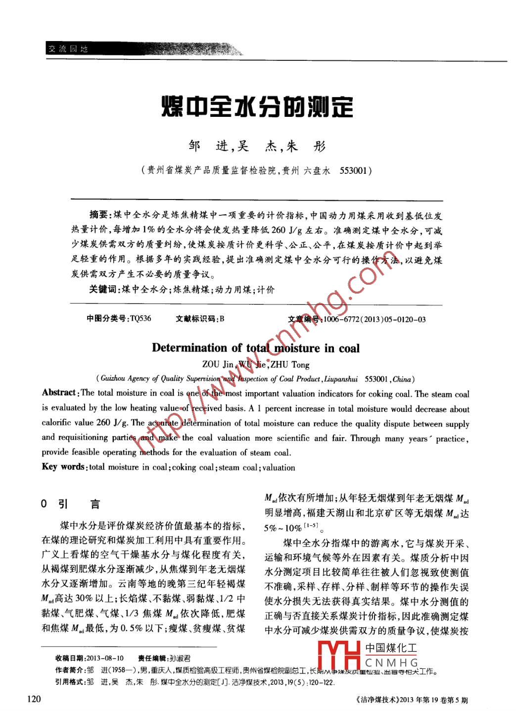 交流園地煤中全水分的測定鄒進(jìn),吳杰,朱彤(貴州省煤炭產(chǎn)品質(zhì)量監(jiān)督檢驗(yàn)院,貴州六盤水553001)摘要:煤中全水分是煉焦精煤中一項(xiàng)重要的計價指標(biāo),中國動力用煤采用收到基低位發(fā)熱量計價,每增加1%的全水分將會使發(fā)熱量降低260 J/g左右。準(zhǔn)確測定煤中全水分,可減少煤炭供需雙方的質(zhì)量糾紛,使煤炭按質(zhì)計價更科學(xué)、公正、公平,在煤炭按質(zhì)計價中起到舉足輕重的作用。根據(jù)多年的實(shí)踐經(jīng)驗(yàn),提出準(zhǔn)確測定煤中全水分可行的操作方法,以避免煤炭供需雙方產(chǎn)生不必要的質(zhì)量爭議。關(guān)鍵詞:煤中全水分;煉焦精煤;動力用煤;計價中圖分類號:TQ536.文獻(xiàn)標(biāo)識碼:B文章編號:1006-6772(2013)05-0120-03Determination of total moisture in coalZ0u Jin, WU Jie ,ZHU Tong( Guizhou Agency of Quality Superision and Inspection of Coal Product , Liupanshui 553001 ,China)Abstract :The total moisture in coal is one of the most important valuation indicators for coking coal. The steam coalis evaluated by the low heating value of received basis. A 1 percent increase in total moisture would decrease aboutcalorific value 260 J/g. The accurate determination of total moisture can reduce the quality dispute between supplyand requistioning parties and make the coal valuation more scientifie and fair. Through many years ’practice,provide feasible operating methods for the evaluation of steam coal.Key words :total moisture in coal ;coking coal ;steam coal ; valuationM.依次有所增加;從年輕無煙煤到年老無煙煤M0引言明顯增高,福建天湖山和北京礦區(qū)等無煙煤Ma達(dá)煤中水分是評價煤炭經(jīng)濟(jì)價值最基本的指標(biāo),5%~ 10% [1-5]。在煤的理論研究和煤炭加工利用中具有重要作用。煤中全水分指煤中的游離水,它與煤炭開采、廣義上看煤的空氣干燥基水分與煤化程度有關(guān),運(yùn)輸和環(huán)境氣候等外在因素有關(guān)。煤質(zhì)分析中因從褐煤到肥煤水分逐漸減少,從焦煤到年老無煙煤水分測定項(xiàng)目比較簡單往往被人們忽視致使測值水分又逐漸增加。云南等地的晚第三紀(jì)年輕褐煤不準(zhǔn)確,采樣、存樣、分樣、制樣等環(huán)節(jié)的操作失誤M。高達(dá)30%以上;長焰煤不黏煤、弱黏煤、1/2中使水分損失無法獲得真實(shí)結(jié)果。煤中水分測值的黏煤、氣肥煤、氣煤、1/3焦煤M.依次降低,肥煤正確與否直接關(guān)系煤炭計價指標(biāo),因此準(zhǔn)確測定煤和焦煤M最低,為0.5%以下;瘦煤、貧瘦煤、貧煤中水 分可減少煤炭供需雙方的質(zhì)量爭議,使煤炭按中國煤化工收稿日期:2013-08-10責(zé)任編輯:孫淑君MCHCNMHG作者簡介:鄒進(jìn)(1958- -) ,男,重慶人,煤質(zhì)檢驗(yàn)高級工程師,貴州省煤檢院副總工,長期從爭保及質(zhì)里征物、盆省寺怕犬工作。引用格式:鄒進(jìn),吳杰,朱彤. 煤中全水分的測定[J]潔凈煤技術(shù),2013 ,19(5) :120-122120《潔凈煤技術(shù)》2013年第19卷第5期.交流園地-中國科技核心期刊礦業(yè)類核心期刊J質(zhì)計價更科學(xué)、公正、公平。從式(1)看出,煤的低位發(fā)熱量排除了全水分的影響。煤中全水分在中國煤炭計價方式中占有1煤中全水分存在形式相當(dāng)重要的比例,因此,全水分測定的正確與否對根據(jù)煤中水分結(jié)合狀態(tài)的不同可將其分為游減少煤炭供需雙方的質(zhì)量糾紛,保證煤炭交易科離水和化合水兩類。游離水是以物理狀態(tài)附著、學(xué) 、公正、公平和合理性具有重要意義。吸附等形式與煤結(jié)合;化合水以化合方式與煤中礦3運(yùn)用標(biāo)準(zhǔn) 正確測定煤中全水分的方法物質(zhì)結(jié)合,如硫酸鈣(CaSO,●2H20)結(jié)晶水和高嶺土(Al203.2SiO2● 2H20)結(jié)合水。煤中游離水在煤中全水分測定不準(zhǔn)確是由以下原因造成:①放105~110C下經(jīng)過1~2h后可全部蒸發(fā);而結(jié)晶水置子樣時間過長,達(dá)到采樣單元所需子樣數(shù)目時有些和結(jié)合水要在很高的溫度下才能分解析出,結(jié)晶水子樣放置了幾天或更長時間。②煤樣容器不密封,且通常要在200 C以上才能分解析出,結(jié)合水的分解未存放在陰涼干燥處。③破碎和縮分煤樣時產(chǎn)生水失水溫度更高,需560C以上。煤中全水分為游離分損失。④制樣過程過長導(dǎo)致煤樣水分明顯損失。水,它是以物理狀態(tài)(附著、吸附等形式)與煤結(jié)合,⑤粒度不符合要求使測定值超過重復(fù)性限10-11。其結(jié)構(gòu)狀態(tài)又可分為內(nèi)在水分和外在水分2種。吸要得到煤炭中全水分的正確值,必須在煤炭的附和凝聚在煤粒內(nèi)部毛細(xì)孔中的水稱為煤的內(nèi)在采分、制、化每個環(huán)節(jié)中正確處理好上述問題,根水分,附著在煤粒表面上的水稱為外在水分。外在據(jù)多年的實(shí)踐歸納如下:水分在45~50 C下經(jīng)過一定時間即可蒸發(fā);內(nèi)在水采樣后子樣(機(jī)采樣是在棄樣中單獨(dú)采取的全分在105~110 C下干燥1~2 h后才能蒸發(fā)[6-9]。水分子樣)裝人塑料袋中封好并稱重,分樣和存樣煤燃燒過程中,煤中水分吸收大量熱量變?yōu)樗^程中樣品密封完好,合并煤樣后先稱取總樣質(zhì)蒸氣被蒸發(fā)。因此,煤中水分多,不但消耗熱量,造量(如煤濕先將煤進(jìn)行干燥后再稱取總樣質(zhì)量) ,取成運(yùn)輸過程動力的浪費(fèi),還影響煤炭的正常輸送、出樣品稱量樣品袋質