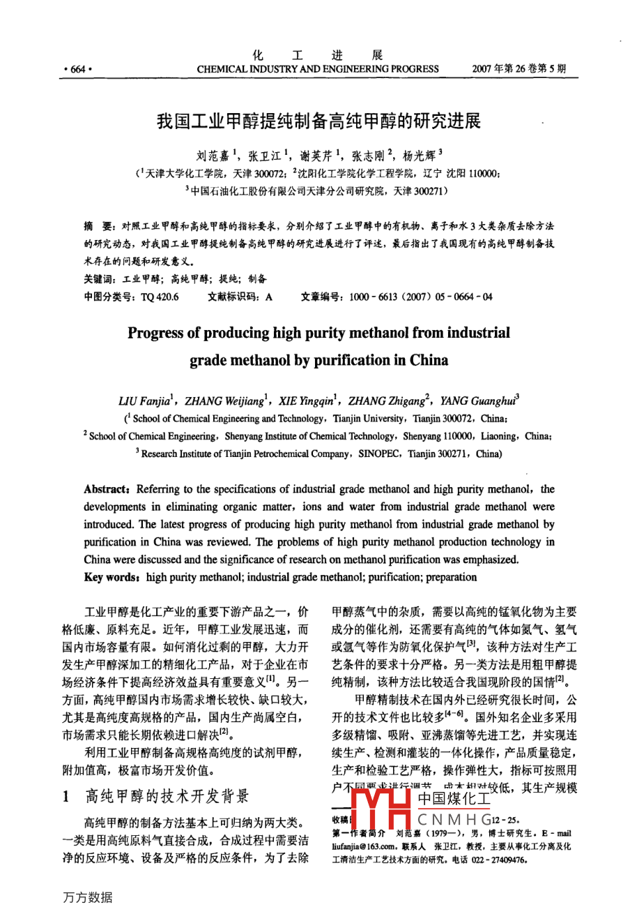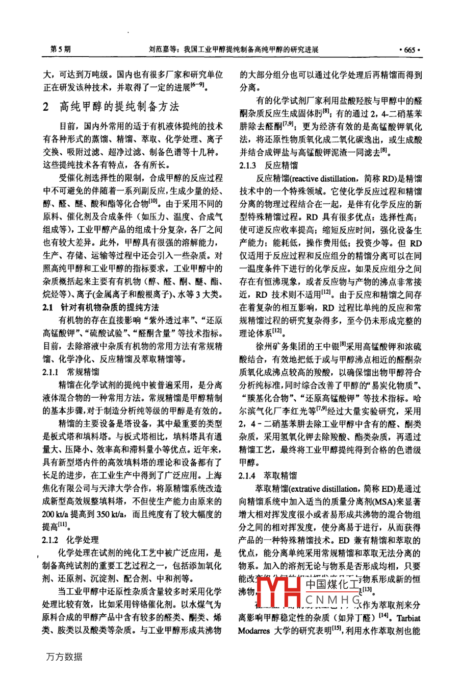 化工進(jìn)展CHEMICAL INDUSTRY AND ENGINEERING PROGRESS2007年第26卷第5期我國工業(yè)甲醇提純制備高純甲醇的研究進(jìn)展劉范嘉1,張衛(wèi)江1,謝英芹1,張志剛2,楊光輝3(天津大學(xué)化工學(xué)院,天津30072;2沈陽化工學(xué)院化學(xué)工程學(xué)院,遼寧沈陽110003中國石油化工股份有限公司天津分公司研究院,天津300271)摘要:對照工業(yè)甲醇和高純甲醇的指標(biāo)要求,分別介紹了工業(yè)甲醇中的有機(jī)物、離于和水3大類雜質(zhì)去除方法的研究動態(tài),對我國工業(yè)甲醇提純制備高純甲醇的研究進(jìn)展進(jìn)行了評迷,最后指岀了我國現(xiàn)有的髙純甲醇制備技術(shù)存在的問題和研發(fā)意義關(guān)鍵詞:工業(yè)甲醇;高純甲醇;提純;制備中圖分類號:TQ4206文獻(xiàn)標(biāo)識碼:A文章編號:1000-6613(200705-0664-04Progress of producing high purity methanol from industrialgrade methanol by purification in ChinaLIU Fanjia, ZHANG Wejiang XIE Yingqin', ZHANG Zhigang, YANG GuanghuiSchool of Chemical Engineering and Technology, Tianjin University, Tianjin 300072, China2 School of Chemical Engineering, Shenyang Institute of Chemical Technology, Shenyang 110000,Liaoning,China;Research Institute of Tianjin Petrochemical Company, SINOPEC, Tianjin 300271, China)Abstract: Referring to the specifications of industrial grade methanol and high purity methanol, thedevelopments in eliminating organic matter, ions and water from industrial grade methanol wereintroduced. The latest progress of producing high purity methanol from industrial grade methanol bypurification in China was reviewed, The problems of high purity methanol production technology inChina were discussed and the significance of research on methanol purification was emphasizedKey words high purity methanol; industrial grade methanol; purification; preparation工業(yè)甲醇是化工產(chǎn)業(yè)的重要下游產(chǎn)品之一,價(jià)甲醇蒸氣中的雜質(zhì),需要以高純的錳氧化物為主要格低廉、原料充足。近年,甲醇工業(yè)發(fā)展迅速,而成分的催化劑,還需要有高純的氣體如氮?dú)?、氫氣國?nèi)市場容量有限。如何消化過剩的甲醇,大力開或氬氣等作為防氧化保護(hù)氣國,該種方法對生產(chǎn)工發(fā)生產(chǎn)甲醇深加工的精細(xì)化工產(chǎn)品,對于企業(yè)在市藝條件的要求十分嚴(yán)格。另一類方法是用粗甲醇提場經(jīng)濟(jì)條件下提高經(jīng)濟(jì)效益具有重要意義。另一純精制,該種方法比較適合我國現(xiàn)階段的國情2。方面,高純甲醇國內(nèi)市場需求增長較快、缺口較大,甲醇精制技術(shù)在國內(nèi)外已經(jīng)研究很長時(shí)間,公尤其是高純度高規(guī)格的產(chǎn)品,國內(nèi)生產(chǎn)尚屬空白,開的技術(shù)文件也比較多6。國外知名企業(yè)多采用市場需求只能長期依賴進(jìn)口解決2多級精餾、吸附、亞沸蒸餾等先進(jìn)工藝,并實(shí)現(xiàn)連利用工業(yè)甲醇制備高規(guī)格高純度的試劑甲醇,續(xù)生產(chǎn)、檢測和灌裝的一體化操作,產(chǎn)品質(zhì)量穩(wěn)定附加值高,極富市場開發(fā)價(jià)值。生產(chǎn)和檢驗(yàn)工藝嚴(yán)格,操作彈性大,指標(biāo)可按照用高純甲醇的技術(shù)開發(fā)背景戶不同行調(diào)芏。太坦皎低,其生產(chǎn)規(guī)模中國煤化工高純甲醇的制備方法基本上可歸納為兩大類CNMHGI-25類是用高純原料氣直接合成,合成過程中需要潔Mms6m.聯(lián)人張衛(wèi)江,教授,主要從事化工分離及化凈的反應(yīng)環(huán)境、設(shè)備及嚴(yán)格的反應(yīng)條件,為了去除工清潔生產(chǎn)工藝技術(shù)方面的研究,電話02-27409476第5期劉范嘉等:我國工業(yè)甲醇提純制備高純甲醇的研究進(jìn)展665·大,可達(dá)到萬噸級。國內(nèi)也有很多廠家和研究單位的大部分組分也可以通過化學(xué)處理后再精餾而得到正在研發(fā)該種技術(shù),并取得了一定的進(jìn)展9分離。2高純甲醇的提純制備方法有的化學(xué)試劑廠家利用鹽酸羥胺與甲醇中的醛酮雜質(zhì)反應(yīng)生成固體肟;有的通過2,4二硝基苯目前,國內(nèi)外常用的適于有機(jī)液體提純的技術(shù)肼除去醛酮9;更為經(jīng)濟(jì)有效的是高錳酸鉀氧化有各種形式的蒸餾、精餾、萃取、化學(xué)處理、離子法,將還原性物質(zhì)氧化成二氧化碳逸出,或生成酸交換、吸附過濾、超凈過濾、制備色譜等十幾種。并結(jié)合成鉀鹽與高錳酸鉀泥渣一同濾去圖。這些提純技術(shù)各有特點(diǎn),各有所長213反應(yīng)精餾受催化劑選擇性的限制,合成甲醇的反應(yīng)過程反應(yīng)精餾( reactive distillation,簡稱RD)是精餾中不可避免的伴隨著一系列副反應(yīng)生成少量的烴、技術(shù)中的一個(gè)特殊領(lǐng)域。它使化學(xué)反應(yīng)過程和精餾醇、醛、醚、酸和酯等化合物。由于采用不同的分離的物理過程結(jié)合在一起,是伴有化學(xué)反應(yīng)的新原料、催化劑及合成條件(如壓力、溫度、合成氣型特殊精餾過程。RD具有很多優(yōu)點(diǎn):選擇性高;組成等),工業(yè)甲醇產(chǎn)品的組成十分復(fù)雜,各廠之間使可逆反應(yīng)收率提高;縮短反應(yīng)時(shí)間,強(qiáng)化設(shè)備生也有較大差異。此外,甲醇具有很強(qiáng)的溶解能力,產(chǎn)能力;能耗低,操作費(fèi)用低;投資少等。但RD生產(chǎn)、存儲、運(yùn)輸?shù)冗^程中還會引入一些雜質(zhì)。對僅適用于反應(yīng)過程和反應(yīng)組分的精餾分離可以