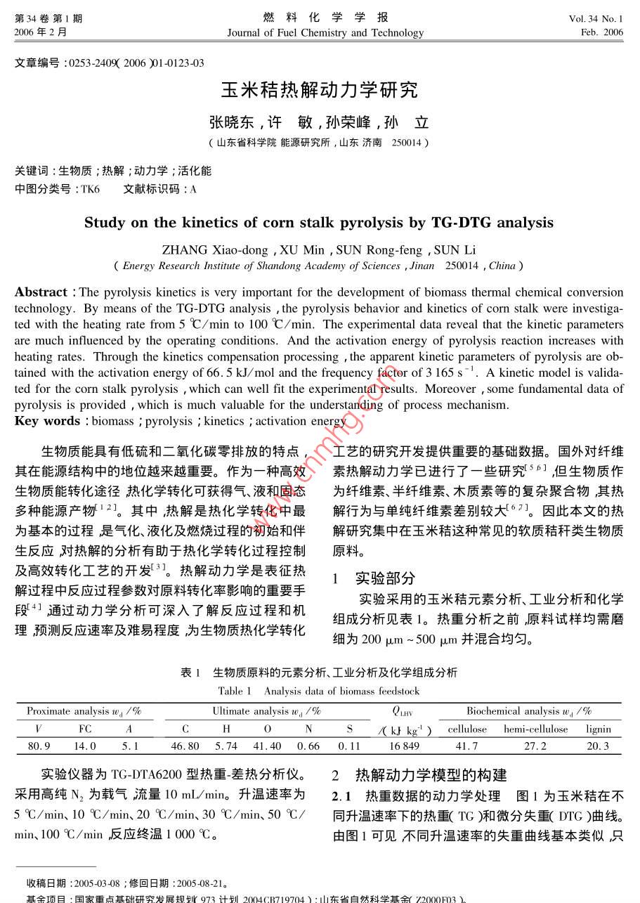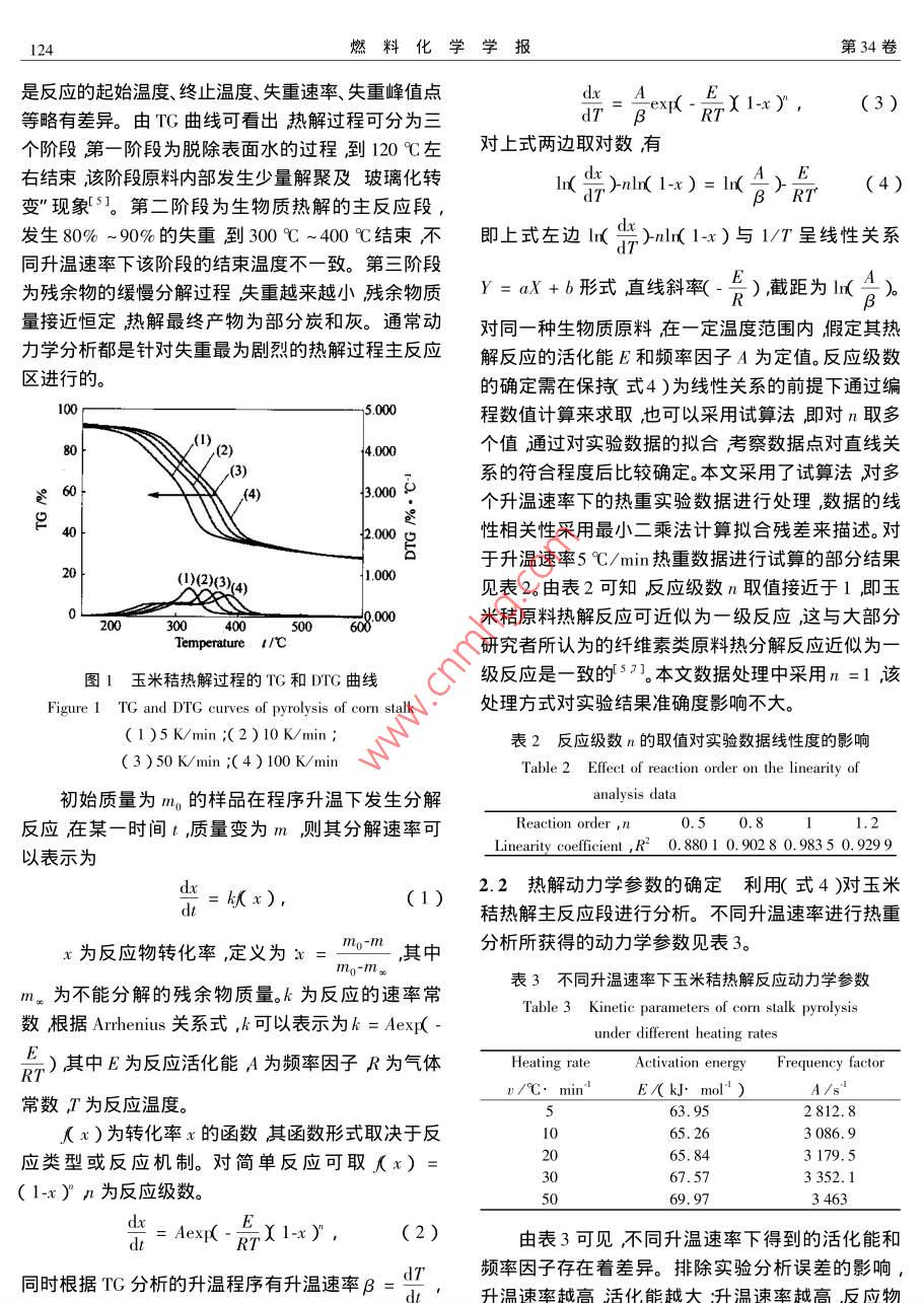第34卷第1期燃料化學(xué)學(xué)報(bào)Vol 34 No. I2006年2月Journal of Fuel Chemistry and TechnolFeb.2006文章編號(hào):0253-24092006)01-0123403玉米秸熱解動(dòng)力學(xué)研究張曉東,許敏,孫榮峰,孫立山東省科學(xué)院能源研究所,山東濟(jì)南250014)關(guān)鍵詞:生物質(zhì);熱解;動(dòng)力學(xué);活化能中圖分類號(hào):TK6文獻(xiàn)標(biāo)識(shí)碼:AStudy on the kinetics of corn stalk pyrolysis by TG-DTG analysisZHANG Xiao-dong, XUSUn Rong-feng sun liEnergy Research Institute of Shandong Academy of Sciences Jinan 250014, ChinaAbstract: The pyrolysis kinetics is very important for the development of biomass thermal chemical conversiontechnology, By means of the TG-DTG analysis the pyrolysis behavior and kinetics of corn stalk were investigated with the heating rate from 5 C/min to 100 C/min. The experimental data reveal that the kinetic parametersare much influenced by the operating conditions. And the activation energy of pyrolysis reaction increases withheating rates. Through the kinetics compensation processing the apparent kinetic parameters of pyrolysis are ob-tained with the activation energy of 66. 5 kJ/ mol and the frequency factor of 3 165s. A kinetic model is validated for the corn stalk pyrolysis, which can well fit the experimental results. Moreover, some fundamental data ofpyrolysis is provided which is much valuable for the understanding of process mechanismKey words: biomass pyrolysis i kinetics activation energy生物質(zhì)能具有低硫和二氧化碳零排放的特點(diǎn),工藝的研究開發(fā)提供重要的基礎(chǔ)數(shù)據(jù)。國外對(duì)纖維其在能源結(jié)構(gòu)中的地位越來越重要。作為一種高效素?zé)峤鈩?dòng)力學(xué)已進(jìn)行了一些研究56但生物質(zhì)作生物質(zhì)能轉(zhuǎn)化途徑熱化學(xué)轉(zhuǎn)化可獲得氣、液和固態(tài)為纖維素、半纖維素、木質(zhì)素等的復(fù)雜聚合物其熱多種能源產(chǎn)物2。其中熱解是熱化學(xué)轉(zhuǎn)化中最解行為與單純纖維素差別較大67。因此本文的熱為基本的過程是氣化、液化及燃燒過程的初始和伴解研究集中在玉米秸這種常見的軟質(zhì)秸稈類生物質(zhì)生反應(yīng)對(duì)熱解的分析有助于熱化學(xué)轉(zhuǎn)化過程控制原料。及高效轉(zhuǎn)化工藝的開發(fā)3熱解動(dòng)力學(xué)是表征熱1實(shí)驗(yàn)部分解過程中反應(yīng)過程參數(shù)對(duì)原料轉(zhuǎn)化率影響的重要手段41通過動(dòng)力學(xué)分析可深入了解反應(yīng)過程和機(jī)實(shí)驗(yàn)采用的玉米秸元素分析、工業(yè)分析和化學(xué)理預(yù)測(cè)反應(yīng)速率及難易程度為生物質(zhì)熱化學(xué)轉(zhuǎn)化學(xué)轉(zhuǎn)化組成分析見表1。熱重分析之前原料試樣均需磨細(xì)為200μm并混合均勻表1生物質(zhì)原料的元素分析、工業(yè)分析及化學(xué)組成分析Table 1 Analysis data of biomass feedstockProximate analysis 1 /%Ultimate analysis w, /Biochemical analysis we, /As/kf kg) cellulose hemi-cellulose lignin80.946.805.7441,400.660.1116849實(shí)驗(yàn)儀器為TGυTA6200型熱重差熱分析儀。2熱解動(dòng)力學(xué)模型的構(gòu)建采用高純N2為載氣流量10m/min。升溫速率為2.1熱重?cái)?shù)據(jù)的動(dòng)力學(xué)處理圖1為玉米秸在不5℃/min、10℃/min、20℃/min、30℃/min、50℃/同升溫速率下的熱重(TG)和微分失重DrG)曲線。min、100℃/min反應(yīng)終溫1000℃。由圖1可見不同升溫速率的失重曲線基本類似只收稿日期:2005403408;修回日期:200508-21。燃料化學(xué)學(xué)報(bào)第34卷是反應(yīng)的起始溫度、終止溫度、失重速率、失重峰值點(diǎn)E等略有差異。由TG曲線可看出熱解過程可分為三dns AexdRtxi-xy(3)個(gè)階段第一階段為脫除表面水的過程到120℃左對(duì)上式兩邊取對(duì)數(shù)有右結(jié)束該階段原料內(nèi)部發(fā)生少量解聚及玻璃化轉(zhuǎn)E變”現(xiàn)象3。第二階段為生物質(zhì)熱解的主反應(yīng)段,aT)h(1x)=1(B)Rr(4)發(fā)生80%-90%的失重到300℃400℃結(jié)束不即上式左邊ln()nl(1-x)與1/7呈線性關(guān)系同升溫速率下該階段的結(jié)束溫度不一致。第三階段為殘余物的緩慢分解過程失重越來越小殘余物質(zhì)Y=aX+b形式直線斜率(-B),截距為H()量接近恒定熱解最終產(chǎn)物為部分炭和灰。通常動(dòng)對(duì)同一種生物質(zhì)原料在一定溫度范圍內(nèi)假定其熱力學(xué)分析都是針對(duì)失重最為劇烈的熱解過程主反應(yīng)解反應(yīng)的活化能E和頻率因子A為定值。反應(yīng)級(jí)數(shù)區(qū)進(jìn)行的。的確定需在保持(式4)為線性關(guān)系的前提下通過編程數(shù)值計(jì)算來求取也可以采用試算法即對(duì)n取多4.000個(gè)值通過對(duì)實(shí)驗(yàn)數(shù)據(jù)的擬合考察數(shù)據(jù)點(diǎn)對(duì)直線關(guān)系的符合程度后比較確定。本文采用了試算法對(duì)多3000個(gè)升溫速率下的熱重實(shí)驗(yàn)數(shù)據(jù)進(jìn)行處理數(shù)據(jù)的線性相關(guān)性采用最小二乘法計(jì)算擬合殘差來描述。對(duì)于升溫速率5℃/min熱重?cái)?shù)據(jù)進(jìn)行試算的部分結(jié)果見表2。由表2可知反應(yīng)級(jí)數(shù)n取值接近于1即玉米秸原料熱解反應(yīng)可近似為一級(jí)反應(yīng)這與大部分emperature I/c研究者所認(rèn)為的纖維素類原料熱分解反應(yīng)近似為一圖1玉米秸熱解過程的TG和DTG曲線級(jí)反應(yīng)是一致的本文數(shù)據(jù)處理中采用n=1,該Figure 1 TG and DtG curves of pyrol