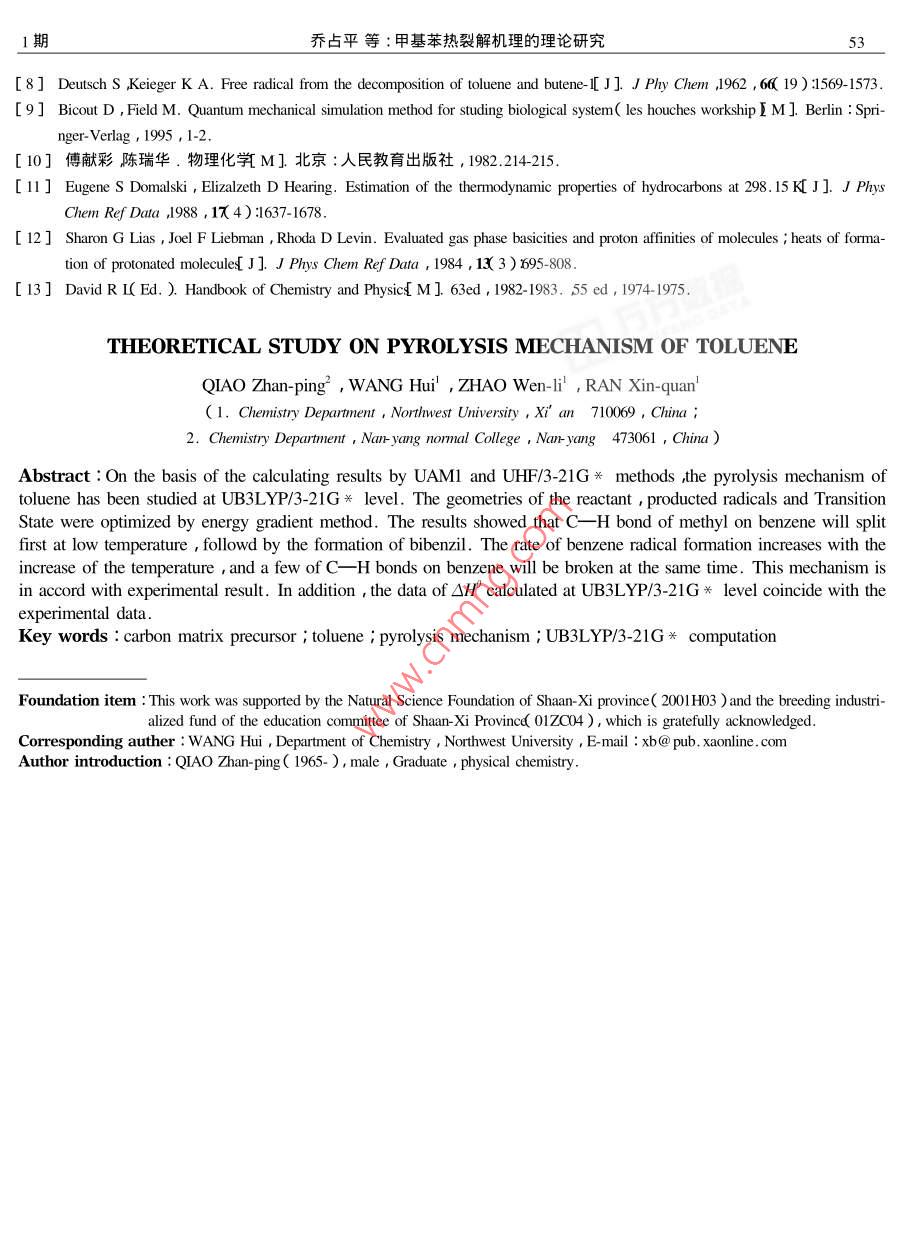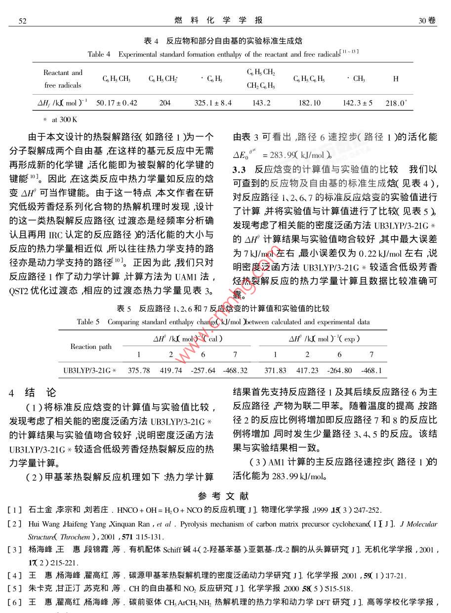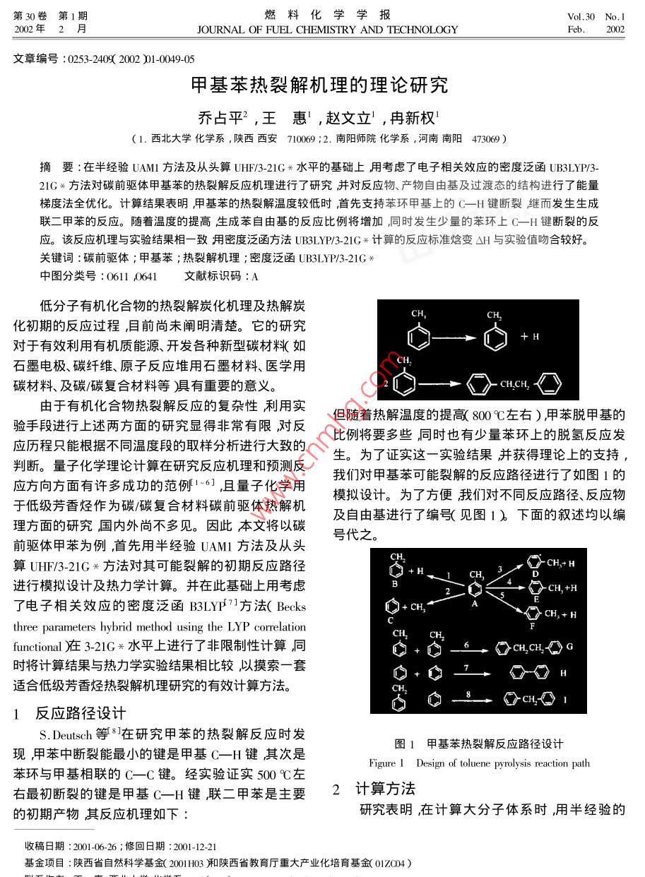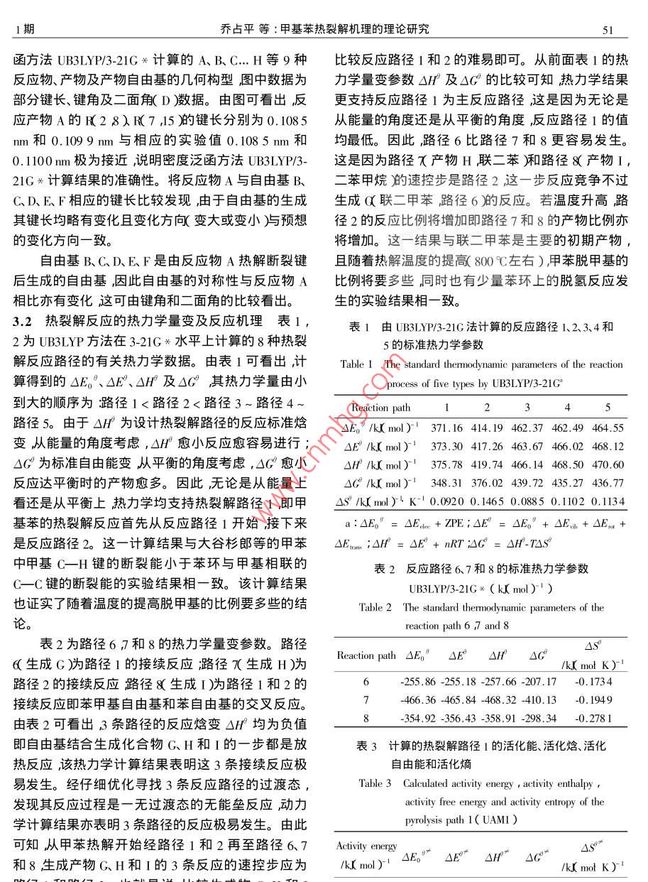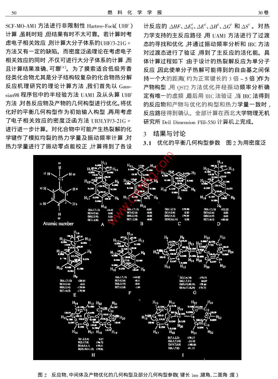 第30卷第1期燃料化ol. 30 No, I2002年2月JOURNAL OF FUEL CHEMISTRY AND TECHNOLOGYFeb文章編號:0253-24092002)1-004905甲基苯熱裂解機理的理論研究喬占平2,王惠,趙文立,冉新權(quán)(1.西北大學(xué)化學(xué)系,陜西西安710069;2.南陽師院化學(xué)系,河南南陽473069)摘要:在半經(jīng)驗UAMI方法及從頭算UHF/3-21G*水平的基礎(chǔ)上用考慮了電子相關(guān)效應(yīng)的密度泛函UB3LYP/32lG方法對碳前驅(qū)體甲基苯的熱裂解反應(yīng)機理進行了研究并對反應(yīng)物、產(chǎn)物自由基及過渡態(tài)的結(jié)構(gòu)進行了能量梯度法全優(yōu)化。計算結(jié)果表明甲基苯的熱裂解溫度較低時首先支持苯環(huán)甲基上的C一H鍵斷裂繼而發(fā)生生成聯(lián)二甲苯的反應(yīng)。隨著溫度的提高生成苯自由基的反應(yīng)比例將增加,同時發(fā)生少量的苯環(huán)上C一H鍵斷裂旳反應(yīng)。該反應(yīng)機理與實驗結(jié)果相一致用密度泛函方法UB3LYP3-21G興計算的反應(yīng)標(biāo)準(zhǔn)焓變ΔH與實驗值吻合較好。關(guān)鍵詞:碳前驅(qū)體;甲基苯;熱裂解機理;密度泛函UB3LY3-21G關(guān)中圖分類號:06110541文獻標(biāo)識碼:A低分子有機化合物的熱裂解炭化機理及熱解炭化初期的反應(yīng)過程目前尚未闡明清楚。它的研究對于有效利用有機質(zhì)能源、開發(fā)各種新型碳材料如石墨電極、碳纖維、原子反應(yīng)堆用石墨材料、醫(yī)學(xué)用碳材料、及碳碳復(fù)合材料等)有重要的意義。CHCH由于有機化合物熱裂解反應(yīng)的復(fù)雜性利用實驗手段進行上述兩方面的研究顯得非常有限對反隨著熱解溫度的提高800右)苯脫甲基的應(yīng)歷程只能根據(jù)不同溫度段的取樣分析進行大致的比例將要多些同時也有少量苯環(huán)上的脫氫反應(yīng)發(fā)生。為了證實這一實驗結(jié)果并獲得理論上的支持判斷。量子化學(xué)理論計算在研究反應(yīng)機理和預(yù)測反我們對甲基苯可能裂解的反應(yīng)路徑進行了如圖1的應(yīng)方向方面有許多成功的范例161且量子化學(xué)用于低級芳香烴作為碳/碳復(fù)合材料碳前驅(qū)體熱解機模擬設(shè)計。為了方便我們對不同反應(yīng)路徑、反應(yīng)物及自由基進行了編見圖1)下面的敘述均以編理方面的研究國內(nèi)外尚不多見。因此本文將以碳前驅(qū)體甲苯為例首先用半經(jīng)驗UAM方法及從義號代之。算UHF/3-21G方法對其可能裂解的初期反應(yīng)路徑進行模擬設(shè)計及熱力學(xué)計算。并在此基礎(chǔ)上用考慮CH+H了電子相關(guān)效應(yīng)的密度泛函B3LYP7方法( Becks+ ChTCH,+Hthree parameters hybrid method using the LYP correlationCH2functional在3-21G興水平上進行了非限制性計算同OcH, CH時將計算結(jié)果與熱力學(xué)實驗結(jié)果相比較以摸索一套適合低級芳香烴熱裂解機理研究的有效計算方法。bcH1反應(yīng)路徑設(shè)計S Deutsch等8在研究甲苯的熱裂解反應(yīng)時發(fā)現(xiàn)用苯中斷裂能最小的鍵是甲基C-H鍵其次是圖1甲基苯熱裂解反應(yīng)路徑設(shè)計苯環(huán)與甲基相聯(lián)的C—C鍵。經(jīng)實驗證實500℃左Figure I Design of toluene pyrolysis reaction path右最初斷裂的鍵是甲基CH鍵聯(lián)二甲苯是主要2計算方法的初期產(chǎn)物其反應(yīng)機理如下:研究表明在計算大分子體系時,用半經(jīng)驗的收稿日期:2001-06-26;修回日期:2001-12-2基金項目:陜西省自然科學(xué)基金(2001H103和陜西省教育廳重大產(chǎn)業(yè)化培育基金01704)50燃料化學(xué)學(xué)報30卷SCF-MO-AMI方法進行非限制性 Hartree-Fock( UHF)計反應(yīng)的△HF、△E、△E、△H、△C和△S。對熱計算雖耗時短但結(jié)果有時不太可靠。若計算時考力學(xué)支持的主反應(yīng)路徑用UAMl方法進行了過渡慮電子相關(guān)效應(yīng)則計算大分子體系的UHF321G*態(tài)的尋找和優(yōu)化并通過振動頻率分析和RC方法方法又有一定的缺陷。而密度泛函理論在考慮電子對過渡態(tài)進行了驗證得到了主反應(yīng)的活化能。具相關(guān)效應(yīng)的同時不僅可進行大分子體系的計算而體計算過程如下于設(shè)計的熱裂解反應(yīng)為單分子且計算結(jié)果準(zhǔn)確、可靠◇。為了摸索適合低級芳香反應(yīng)因此使單分子熱解可能得到的自由基之間保烴類化合物尤其是分子結(jié)構(gòu)較復(fù)雜的化合物熱分解持一個大的距離約為正常鍵長的3倍~5倍作為反應(yīng)機理研究的理論計算方法我們首先以〔as-產(chǎn)物構(gòu)型用Qs2方法優(yōu)化并經(jīng)振動頻率分析確sian98程序包中的半經(jīng)驗方法UAM及從頭算UHF定有唯一的虛頻最后用IC法驗證當(dāng)HRC法得到方法對各反應(yīng)物及產(chǎn)物的幾何構(gòu)型進行優(yōu)化將優(yōu)的反應(yīng)物和產(chǎn)物與優(yōu)化的構(gòu)型和熱力學(xué)量一致時,化好的平衡幾何構(gòu)型作為初始輸入構(gòu)型再用考慮反應(yīng)路徑得到確認。全部計算在西北大學(xué)物理無機了電子相關(guān)效應(yīng)的密度泛函方法UB3LYP3-21*研究所 Dell Dimension pll-550計算機上完成。進行進一步計算。對化合物中可能產(chǎn)生熱裂解的化學(xué)鍵作了模擬均裂的熱力學(xué)量及振動頻率計算對3結(jié)果與討論熱力學(xué)量進行了振動零點能校正計算得到了各設(shè)31優(yōu)化的平衡幾何構(gòu)型參數(shù)圖2為用密度泛HiiHM HgMHra.71』2220Atomic number刪7圖2反應(y