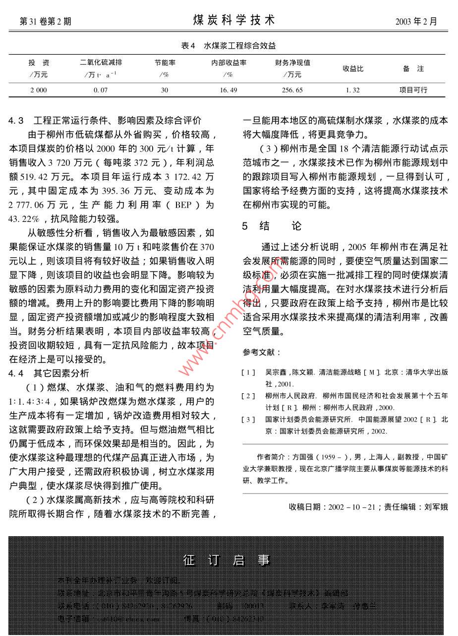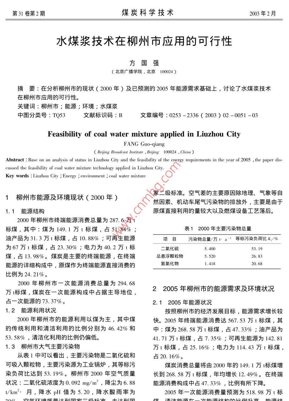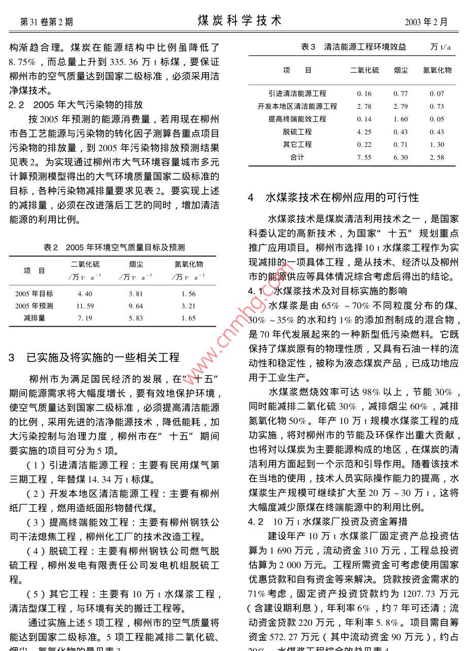 第31卷第2期煤炭科學(xué)技術(shù)2003年2月水煤漿技術(shù)在柳州市應(yīng)用的可行性方國強(qiáng)北京廣播學(xué)院,北京100024)摘要:在分析柳州市的現(xiàn)狀(2000年)及已預(yù)測的2005年能源需求基礎(chǔ)上,討論了水煤漿技術(shù)在柳州市應(yīng)用的可行性關(guān)鍵詞:柳州市;能源;環(huán)境;水煤漿中圖分類號(hào):TQ53文獻(xiàn)標(biāo)識(shí)碼:B文章編號(hào):0253-2336(2003)02-0051-03Feasibility of coal water mixture applied in Liuzhou CityFANG Guo-qiangBeijing Broadcast Institute, Beijing 100024, ChinaAbstract: Base on an analysis of status in Liuzhou City and the feasibility of the energy requirements in the year of 2005, the paper discussed the feasibility of coal water mixture technology applied in Liuzhou City.Key words: Liuzhou City Energy environment coal water mixture1柳州市能源及環(huán)境現(xiàn)狀(2000年)家二級(jí)標(biāo)準(zhǔn)??諝獠畹闹饕虺乩怼庀蟮茸匀灰蛩?、機(jī)動(dòng)車尾氣污染物的排放外,主要是由于1.1能源結(jié)構(gòu)原煤直接利用的量較大以及燃煤設(shè)備工藝落后。2000年柳州市終端能源消費(fèi)總量為287.6萬t標(biāo)煤,其中:煤為149.1萬t標(biāo)煤,占51.84%表12000年主要污染物總量油產(chǎn)品為31.3萬t標(biāo)煤,占10.88%;可再生能源項(xiàng)目污染物總量萬1a1等標(biāo)污染負(fù)荷比人/%為67萬t標(biāo)煤,占23.30%;電力為40.2萬t標(biāo)二氧化硫5.53.19煤,占13.98%。煤炭是主要的終端能源,在終端總懸浮顆粒物5.52026.83能源的詳細(xì)構(gòu)成中,原煤作為終端能源直接消費(fèi)的氮氧化物1.418比例為24.21%。2000年柳州市一次能源消費(fèi)總量為294.68萬標(biāo)煤,煤炭在一次能源構(gòu)成中占據(jù)主導(dǎo)地位,22005年柳州市的能源需求及環(huán)境狀況占一次能源的73.37%2.12005年能源狀況1.2能源利用狀況按照柳州市的經(jīng)濟(jì)發(fā)展目標(biāo),能源需求增長較2000年柳州市的能源利用以煤為主,其中煤快。2005年終端能源消費(fèi)達(dá)567.53萬t標(biāo)煤,其的傳統(tǒng)利用和清潔利用的比例分別為46.42%和中:煤為268.58萬t標(biāo)煤,占47.33%;油產(chǎn)品為53.58%,清潔化利用的比例仍偏低41.71萬t標(biāo)煤,占7.35%;可再生能源為142.811.3柳州市大氣主要污染物萬t標(biāo)煤,占25.16%;電力為114.43萬t標(biāo)煤,從表1中可以看出,主要污染物是二氧化硫和占20.16%可吸入顆粒物,主要污染源為工業(yè)鍋爐,其等標(biāo)污煤炭消費(fèi)總量將由2000年的149.1萬t標(biāo)煤增染負(fù)荷比達(dá)到53.19%。柳州市2000年空氣質(zhì)量長到268.58萬t標(biāo)煤,年均增長12.49%。在終端狀況:二氧化硫濃度為0.092mg/m3,降塵為6.88能源消費(fèi)構(gòu)成中占47.33%,比例有所下降。t/km2·月,降水pH值為5.20,降水酸雨率為205年一次能源消費(fèi)量預(yù)測為518.98萬t標(biāo)第31卷第2期煤炭科學(xué)技術(shù)2003年2月構(gòu)漸趨合理。煤炭在能源結(jié)構(gòu)中比例雖降低了表3清潔能源工程環(huán)境效益萬8.75%,而總量上升到335.36萬t標(biāo)煤,要保證柳州市的空氣質(zhì)量達(dá)到國家二級(jí)標(biāo)準(zhǔn),必須采用潔項(xiàng)目二氧化硫煙塵氨氧化物凈煤技術(shù)。引進(jìn)清潔能源工程0.160.770.072.22005年大氣污染物的排放開發(fā)本地區(qū)清潔能源工程0.73按2005年預(yù)測的能源消費(fèi)量,若用現(xiàn)在柳州提高終端能效工程市各工藝能源與污染物的轉(zhuǎn)化因子測算各重點(diǎn)項(xiàng)目脫硫工程040污染物的排放量,到2005年污染物排放預(yù)測結(jié)果其它工程見表2。為實(shí)現(xiàn)通過柳州市大氣環(huán)境容量城市多元7.556.30計(jì)算預(yù)測模型得岀的大氣環(huán)境質(zhì)量國家二級(jí)標(biāo)準(zhǔn)的目標(biāo),各種污染物減排量要求見表2。要實(shí)現(xiàn)上述的減排量,必須在改進(jìn)落后工藝的同時(shí),增加清潔4水煤漿技術(shù)在柳州應(yīng)用的可行性能源的利用比例。水煤漿技術(shù)是煤炭清潔利用技術(shù)之一,是國家科委認(rèn)定的高新技術(shù),為國家”十五”規(guī)劃重點(diǎn)表22005年環(huán)境空氣質(zhì)量目標(biāo)及預(yù)測推廣應(yīng)用項(xiàng)目。柳州市選擇10t水煤漿工程作為實(shí)氧化硫氮氧化物現(xiàn)減排的一項(xiàng)具體工程,是從技術(shù)、經(jīng)濟(jì)以及柳州項(xiàng)目/萬ta萬市的能源供應(yīng)等具體情況綜合考慮后得出的結(jié)論。2005年目標(biāo)3.814.1水煤漿技術(shù)及對(duì)目標(biāo)實(shí)施的影響2005年預(yù)測11.599.643.21水煤漿是由65%~70%不同粒度分布的煤減排量7.195,831.6530%~35%的水和約1%的添加劑制成的混合物,是70年代發(fā)展起來的一種新型低污染燃料。它既保持了煤炭原有的物理性質(zhì),又具有石油一樣的流3已實(shí)施及將實(shí)施的一些相關(guān)工程動(dòng)性和穩(wěn)定性,被稱為液態(tài)煤炭產(chǎn)品,已成功地應(yīng)柳州市為滿足國民經(jīng)濟(jì)的發(fā)展,在”十五用于工業(yè)生產(chǎn)期間能源需求將大幅度增長,要有效地保護(hù)環(huán)境水煤漿燃燒效率可達(dá)98%以上,節(jié)能30%使空氣質(zhì)量達(dá)到國家二級(jí)標(biāo)準(zhǔn),必須提高清潔能源同時(shí)能減排二氧化硫30%,減排煙塵60%,減排的比例,采用先進(jìn)的潔凈能源技術(shù),降低能耗,加氮氧化物50%。年產(chǎn)10萬t規(guī)模水煤漿工程的成大污染控制與治理力度,柳州市在″十五”期