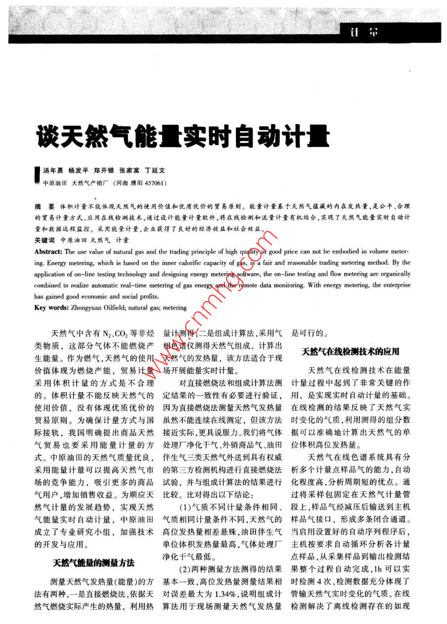 十吊談天然氣能量實(shí)時自動計1 t眉湯年勇 楊發(fā)平鄭開銀張家富丁延文中原油田天然氣產(chǎn)銷廠(河南濮陽457061)摘要體積計量不能體現(xiàn)天然氣的使用價值和優(yōu)質(zhì)優(yōu)價的貿(mào)易原則。能量計量基于天然氣蘊(yùn)藏的內(nèi)在發(fā)熱量,是公平、合理;的貿(mào)易計量方式。應(yīng)用在線檢測技術(shù),通過設(shè)計能量計量軟件,將在線檢測和流量計量有機(jī)結(jié)合,實(shí)現(xiàn)了天然氣能量實(shí)時自動計量和數(shù)據(jù)遠(yuǎn)程監(jiān)控。采用能量計量,企業(yè)獲得了良好的經(jīng)濟(jì)效益和社會效益。關(guān)鍵詞中原油田天然氣計量Abstract: The use value of natural gas and the trading principle of high quality in good price can not be embodied in volume meter-ing. Energy metering, which is based on the inner calorific capacity of gas, is a fair and reasonable trading metering method. By theapplication of on-line testing technology and designing energy metering sofware, the on- line testing and flow metering are organicallycombined to realize automatic real- time metering of gas energy and the remote data monitoring. w ith energy metering, the enterprisehas gained good economic and social profits.Key words: Zhongyuan Oilfield; natural gas; metering天然氣中含有N2 CO2等非烴量計測得;二是組成計算法 ,采用氣是可行的。類物質(zhì),這部分氣體不能燃燒產(chǎn)相色譜儀測得天然 氣組成,計算出天然氣在線檢測技術(shù)的應(yīng)用生能量。作為燃?xì)?天然氣的使用天然氣的發(fā)熱量, 該方法適合于現(xiàn)價值體現(xiàn)為燃燒產(chǎn)能,貿(mào)易計量場開展能 量實(shí)時計量。天然氣在線檢測技術(shù)在能量采用體積計量的方式是不合理對直接燃燒法和組成計算法測計量過程中起到了非常關(guān)鍵的作的。體積計量不能反映天然氣的定結(jié)果的- 致性有必要進(jìn)行驗(yàn)證,用, 是實(shí)現(xiàn)實(shí)時自動計量的基礎(chǔ)。使用價值,沒有體現(xiàn)優(yōu)質(zhì)優(yōu)價的因?yàn)?直接燃燒法測量天然氣發(fā)熱量在線檢 測的結(jié)果反映了天然氣實(shí)貿(mào)易原則。為確保計量方式與國雖然不能連續(xù)在線測定, 但該方法時變化的氣質(zhì) ,利用測得的組分?jǐn)?shù)際接軌,我國明確提出商品天然接近實(shí)際, 更具說服力。我們將氣體據(jù)可以準(zhǔn) 確地計算出天然氣的單氣貿(mào)易也要采用能量計量的方處理廠凈化干氣、外銷商品氣、油田位體積高位發(fā)熱量。式。中原油田的天然氣質(zhì)量優(yōu)良,伴生氣三類天然 氣外送到具有權(quán)威天然氣在線色譜系統(tǒng)具有分采用能量計量可以提高天然氣市的第 三方檢測機(jī)構(gòu)進(jìn)行直接燃燒法析多 個計量點(diǎn)樣品氣的能力,自動場的競爭能力,吸引更多的商品試驗(yàn), 并與組成計算法的結(jié)果進(jìn)行化程 度高,分析周期短的優(yōu)點(diǎn)。通氣用戶,增加銷售收益。為順應(yīng)天比較。 比對得出以下結(jié)論:過將采樣包固定在天然氣計量管然氣計量的發(fā)展趨勢,實(shí)現(xiàn)天然(1)氣質(zhì)不同計量條件相同、段上,樣品氣經(jīng)減壓后輸送到主機(jī)氣能量實(shí)時自動計量,中原油田氣質(zhì)相同計量 條件不同,天然氣的樣品氣接口, 形成多條閉合通道。成立了專業(yè)研究小組,加強(qiáng)技術(shù)高位發(fā)熱量相差懸殊 ,油田伴生氣當(dāng) 啟用設(shè)置好的自動序列程序后,的開發(fā)與應(yīng)用。單位體積發(fā)熱量最高,氣體處理廠主機(jī)按要求自 動循環(huán)分析各計量凈化千氣最低。點(diǎn)樣品,從采集樣品到輸出檢測結(jié)天然氣能量的測量方法(2)兩種測量方法測得的結(jié)果果整個過程自 動完成,1h可以實(shí)測量天然氣發(fā)熱量(能量)的方基本- -致 ,高位發(fā)熱量測量結(jié)果相時 檢測4次,檢測數(shù)據(jù)充分體現(xiàn)了法有兩種,一是直接燃燒法,依據(jù)天對誤 差最大為1.34%, 說明組成計管輸天然氣實(shí)時變化的氣質(zhì)。在線然氣燃燒實(shí)際產(chǎn)生的熱量,利用熱算法用于 現(xiàn)場測量天然氣發(fā)熱量檢測解決 了離線檢測存在的如現(xiàn)計量場采集樣品勞動強(qiáng)度高、采集的樣求是:計量。通過無線遠(yuǎn)傳方式,將各計品難以確保代表性、檢測過程易造(1)軟件設(shè)計滿足現(xiàn)場天然氣量點(diǎn)天然氣的單位體積發(fā)熱量和成人為誤差、分析結(jié)果滯后嚴(yán)重,能量實(shí)時 自動計量的要求,并能與累 積能量實(shí)時傳送到辦公地點(diǎn),從影響數(shù)據(jù)及時使用等問題。通過設(shè)現(xiàn)有 計量軟件相互兼容。而實(shí)現(xiàn)能量計量數(shù)據(jù)遠(yuǎn)程監(jiān)控。計程序,將天然氣在線色譜系統(tǒng)和(2)軟件設(shè)計中相關(guān)技術(shù)參數(shù)經(jīng)濟(jì)效益社會效益分析流量計量系統(tǒng)有機(jī)地結(jié)合,各計量要符 合GB/T 11062-1998《天然氣點(diǎn)實(shí)現(xiàn)了流量自動計量,為實(shí)現(xiàn)能發(fā)熱量、密度、相對密度和沃泊指中原油田的天然氣潔凈、優(yōu)量實(shí)時自動計量提供了技術(shù)支持。數(shù)的計算 方法》標(biāo)準(zhǔn)的有關(guān)規(guī)定。質(zhì),高位發(fā)熱量在37.8MJ/m3左右,天然氣能量自動計量技術(shù)(3)軟件顯示界面必須是實(shí)時比西氣東輸天然氣(鄭州門站趙家的、動態(tài)的,顯示的