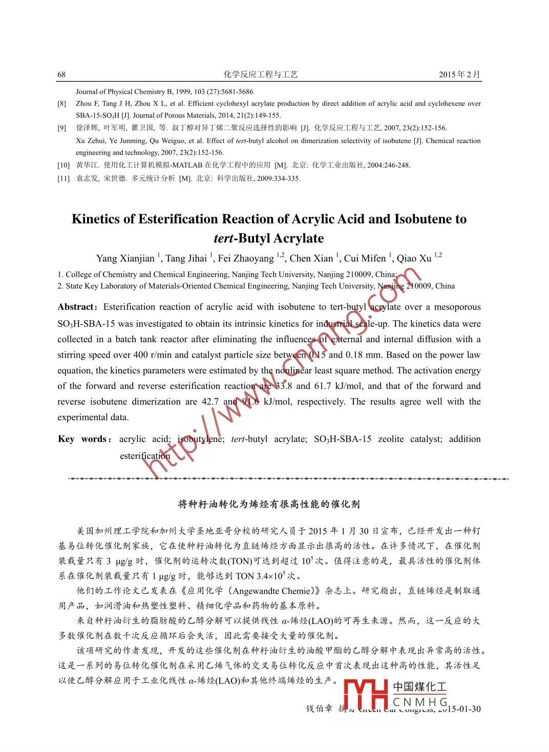 第31卷第1期化學(xué)反應(yīng)工程與工藝Vol 31. No l2015年2月Chemical Reaction Engineering and TechnologyFeb.2015文章編號(hào):1001-7631(2015)01-0063-06丙烯酸與異丁烯酯化合成丙烯酸叔丁酯動(dòng)力學(xué)楊仙健',湯吉海1,費(fèi)兆陽(yáng)l,陳獻(xiàn)',崔咪芬',喬旭121.南京工業(yè)大學(xué)化學(xué)化工學(xué)院,江蘇南京2100092南京工業(yè)大學(xué)材料化學(xué)工程國(guó)家重點(diǎn)實(shí)驗(yàn)室,江蘇南京210009摘要:為實(shí)現(xiàn)丙烯酸與異丁烯酯化合成丙烯酸叔丁酯的工業(yè)化,在間歇釜式反應(yīng)器內(nèi),研究了磺酸改性SBA-15介孔分子篩催化丙烯酸與異丁烯加成酯化合成丙烯酸叔丁酯的本征反應(yīng)動(dòng)力學(xué)。結(jié)果表明,在攪拌轉(zhuǎn)速大于400rmin,催化劑粒徑為0.15~0.18mm,可消除內(nèi)、外擴(kuò)散影響。測(cè)定了酸烯酯化合成丙烯酸叔丁酯的本征反應(yīng)動(dòng)力學(xué)數(shù)據(jù),建立了冪級(jí)數(shù)反應(yīng)動(dòng)力學(xué)方程,采用非線性最小二乘法擬合得到模型參數(shù),得到酯化反應(yīng)的正逆反應(yīng)活化能分別為338和617kJ/mol,異丁烯二聚反應(yīng)的正逆反應(yīng)活化能分別為42.7和91.6kJ/mol,實(shí)驗(yàn)測(cè)定值與模型計(jì)算值吻合較好關(guān)鍵詞:丙烯酸異丁烯丙烯酸叔丁酯SO3H-SBA-I5分子篩催化劑加成酯化中圖分類號(hào):TQ0132文獻(xiàn)標(biāo)識(shí)碼:A丙烯酸叔丁酯分子中同時(shí)含有不飽和雙鍵和羧酸酯結(jié)構(gòu),可以自聚或與其他單體共聚合成一系列具有優(yōu)良性能的高分子產(chǎn)品2。工業(yè)上有機(jī)酯的生產(chǎn)主要為羧酸和醇的酯化反應(yīng)工藝,然而叔丁醇分子的空間位阻效應(yīng)大,酸醇酯化反應(yīng)很難進(jìn)行,導(dǎo)致酯化收率低3,因而近年來(lái)以烯烴為原料直接與羧酸加成酯化合成羧酸酯的技術(shù)引起廣泛關(guān)注6。H3C-C-CH此工藝直接利用烯烴,無(wú)需經(jīng)水合成醇再酯化,是一種原子經(jīng)濟(jì)反應(yīng)工藝,具有明顯的技術(shù)經(jīng)濟(jì)優(yōu)勢(shì)。由于叔碳正離子是最穩(wěn)定的碳正離子,采用異丁烯為原料與丙烯酸加成酯化合成丙烯酸叔丁酯的工藝路線具有很好的應(yīng)用前景。Zhou等報(bào)道了磺酸改性SBA-15介孔分子篩(SO3HSBA-15)催化環(huán)已烯與丙烯酸合成丙烯酸環(huán)己酯的方法,反應(yīng)條件溫和,丙烯酸轉(zhuǎn)化率為82.8%,丙烯酸環(huán)己酯選擇性為92.6%本工作將采用SO3H-SBA-15催化異丁烯與丙烯酸加成酯化反應(yīng)合成丙烯酸叔丁酯,考察消除內(nèi)、外擴(kuò)散影響下SOHˉSBA-15催化丙烯酸與異丁烯合成丙烯酸叔丁酯的動(dòng)力學(xué)規(guī)律,建立其反應(yīng)動(dòng)力學(xué)模型,為酸烯酯化合成丙烯酸叔丁酯的反應(yīng)器設(shè)計(jì)與放大提供參考。1實(shí)驗(yàn)部分11實(shí)驗(yàn)方法采用磺酸改性SBA-15介孔分子篩(SO3H-SBA-15)作為催化劑:首先是水熱合成SBA-15,然后經(jīng)直接法合成 SOSH-SBA-158收稿日期:2014-04-25;修訂日期:201408-13中國(guó)煤化工作者簡(jiǎn)介:楊仙健(1988—),男,碩士研究生:湯吉海(1974—),男,副教授,通訊聯(lián)系YHaCNMHG基金項(xiàng)目:國(guó)家自然科學(xué)基金(21276126,61203020)化學(xué)反應(yīng)工程與工藝2015年2月向0.3L鈦材高壓反應(yīng)釜內(nèi)一次性加入一定量的催化劑、叔丁醇、丙烯酸,將反應(yīng)釜冷卻至0℃后通入液態(tài)異丁烯,叔丁醇作為異丁烯的阻聚劑凹,加熱至預(yù)定反應(yīng)溫度開(kāi)始計(jì)時(shí),按一定間隔時(shí)間取樣分析反應(yīng)液組成。由于反應(yīng)為放熱反應(yīng),反應(yīng)過(guò)程中采用5℃低溫水循環(huán)移除反應(yīng)熱。反應(yīng)壓力為0.1~0.3MPa(表壓),是反應(yīng)物料在反應(yīng)溫度下的內(nèi)生壓力12分析方法采用FULⅠ-9750氣相色譜儀分析反應(yīng)產(chǎn)物,以苯為內(nèi)標(biāo)進(jìn)行定量分析。氫火焰(FID)檢測(cè)器,XE-60毛細(xì)管柱(30m×032mm×0.25μm)。載氣為N2,柱前壓為0.1MPa,汽化室溫度200℃,檢測(cè)器溫度200℃,柱溫60℃。程序升溫:初溫60℃,保留3min,以40℃min的升溫速率升至120℃,保留1min,然后再以40℃min的升溫速率,至終溫150℃,保留1min.2結(jié)果與討論21內(nèi)、外擴(kuò)散影響的消除在反應(yīng)溫度為30℃,異丁烯與丙烯酸物質(zhì)的量比為2,叔丁醇質(zhì)量為丙烯酸質(zhì)量的10%,催化劑質(zhì)量為丙烯酸質(zhì)量的8%,反應(yīng)時(shí)間10h條件下,考察攪拌轉(zhuǎn)速對(duì)丙烯酸轉(zhuǎn)化率的影響,結(jié)果如圖1所示。由圖1可知,攪拌轉(zhuǎn)速大于400r/min后提高轉(zhuǎn)速對(duì)丙烯酸轉(zhuǎn)化率影響不大,可認(rèn)為本實(shí)驗(yàn)中攪拌轉(zhuǎn)速大于400rmin時(shí),催化劑外擴(kuò)散的影響已消除。Stirring speed /(r-min)Catalyst size/mm圖1攪拌轉(zhuǎn)速對(duì)丙烯酸轉(zhuǎn)化率的影響圖2催化劑粒徑對(duì)丙烯酸轉(zhuǎn)化率的影響Fig 1 Effect of stirring speed on conversion of acrylic acidFig 2 Effect of catalyst size on t conversion of acrylic acid然后選擇攪拌轉(zhuǎn)速為500rmin,在相同的實(shí)驗(yàn)條件下考察了不同催化劑粒徑對(duì)丙烯酸轉(zhuǎn)化率的影響,結(jié)果見(jiàn)圖2。從圖2可看出,當(dāng)催化劑粒徑從0.18-0.25mm減小到0.15~0.18mm時(shí),丙烯酸的轉(zhuǎn)化率僅增加了0.2%,表明催化劑粒徑小于0.25mm時(shí),可不考慮內(nèi)擴(kuò)散
