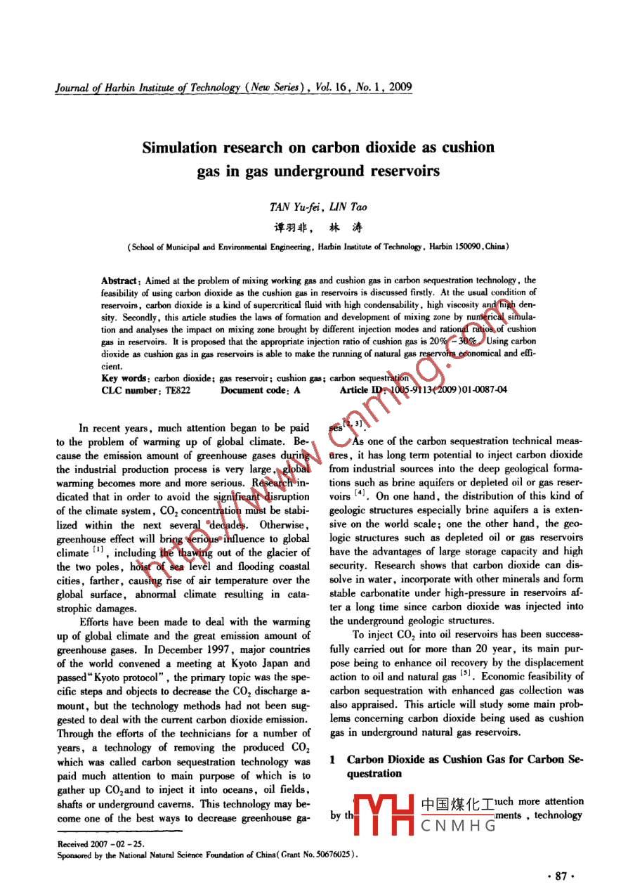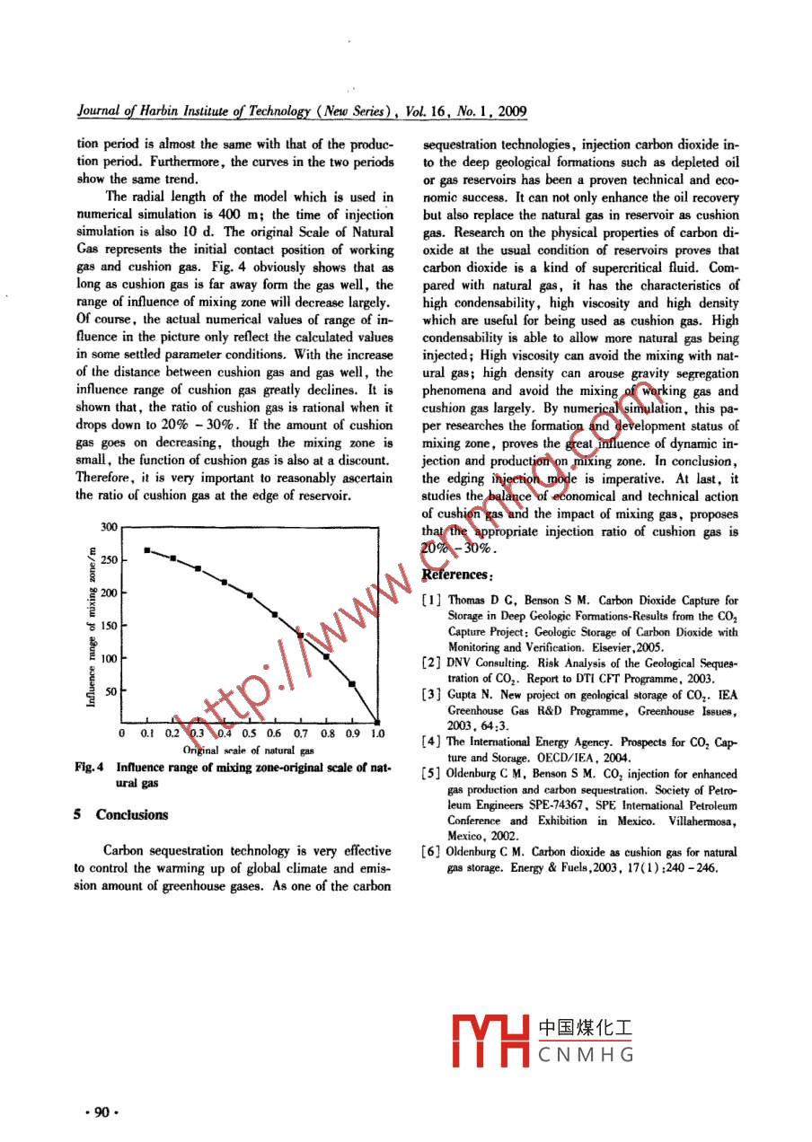 Journal of Harbin Institute of Technology( New Series, Vol 16, No. 1, 2009Simulation research on carbon dioxide as cushiongas in gas underground reservoirsTAN Yu-fei, LIN Tao譚羽非,林濤School of Municipal and Environmental Engineering, Harbin Institute of Technology, Harbin 150090, China)Abstract: Aimed at the problem of mixing working gas and cushion gas in carbon sequestration technology, thefeasibility of using carbon dioxide as the cushion gas in reservoirs is discussed firstly. At the usual condition ofservoir, carbon dioxide is a kind of supercritical fluid with high condensability, high viscosity and high den-sity. Secondly, this article studies the laws of formation and development of mixing zone by numerical simula-tion and analyses the impact on mixing zone brought by different injection modes and rational ratios of cushionrs. It is proposed that the appropriate injection ratio of cushion gas is 20%-30%0. Using carbondioxide as cushion gas in gas reservoirs is able to make the running of natural gas reservoirs economical and effi-Key words: carbon dioxide; gas reservoir; cushion gas; carboCLC number: TE822Document code: AArticle ID:10059113(2009)0140087404In recent years, much attenticto be paid ses[2. 31to the problem of warming up ofAs one of the carbon sequestration technical meas-cause the emission amount of greenhouse gases during ures, it has long term potential to inject carbon dioxidethe industrial production process is very large, global from industrial sources into the deep geological forma-warming becomes more and more serious. Research in- tions such as brine aquifers or depleted oil or gas reser-dicated that in order to avoid the significant disruption voirs 4. On one hand, the distribution of this kind ofof the climate system, CO, concentration must be stabi- geologic structures especially brine aquifers a is exten-lized within the next several decades. Otherwise, sive on the world scale; one the other hand, the geo-greenhouse effect will bring serious influence to global logic structures such as depleted oil or gas reservoirsclimate including the thawing out of the glacier of have the advantages of large storage capacity and highthe two poles, hoist of sea level and flooding coastal security. Research shows that carbon dioxide can dis-farther, causing rise of air temperature over the solve in water, incorporate with other minerals and formsurface,abnormal climate resulting in cata- stable carbonatite under high-pressure in reservoirs af-ter a long time since carbon dioxide was injected intoEfforts have been made to deal with the warming the underground geologic structures.up of global climate and the great emission amount of To inject CO 2 into oil reservoirs has been success-greenhouse gases. In December 1997, major countries fully carried out for more than 20 year, its main pur-cific steps and objects to decrease the Co, dischargepe. acs. being to enhance oil recovery by the displacementof the world convened a meeting at Kyoto Japan and pospassed"Kyoto protocol", the primary topic was theon to oil and natural gas .Economic feasibility ofa-carbon sequestration with enhanced gas collection wasmount, but the technology methods had not been sug- also appraised. This article will study some main prob-gested to deal with the current carbon dioxide1. lems concerming carbon dioxide being used as cushionThrough the efforts of the technicians for a number of gas in underground natural gas reservoirsyears,a technology of removing the produced CO2which was called carbon sequestration technology was 1 Carbon Dioxide as Cushion Gas for Carbon Se-paid much attention to main purpose of which is toquestrationgather up CO2 and to inject it into oceans, oil fieldsshafts or underground caverns. This technology may be-中國煤化工 nuch more attentioncome one of the best ways to decrease greenhousbyments, technologyCNMHGReceived 2007-02ponsored by the National Natural Science Foundation of China( Grant No, 50676025)Journal of Harbin Institute of Technology( New Series), Vol 16, No 1, 2009and industrial communities. Since 1996, Sleipner oil working gas in reservoirs and form a mixing zone. Iffields in Norway North Sea have injected 100 trillion ton gas load is very heavycarbon dioxide into brine saturation aquifers with 900 m mixing gas in working gas. Because the mixing gas in-depth per annum. Since October 2000, Canada delivers cludes much CO,, the quality of supplying natural gasabout 5000 t carbon dioxide from power plants in North will be to a certain extent influencedDakota state America to Weyburn oil field in willistooblem of working gas and cush-Basin by pipelines everyday and injects it into carbon-n gas, detailed researches and practices as wellatite reservoirs to enhance oil recovery, at the same numerical simulation have been conducted in Americatime, to store this part of carbon dioxide eternallyFrance and Denmark Pre-charge test has been car-Using carbon dioxide as cushionried out with tracers and gas composition change ofground natural gas reservoirs, can not only accomplish nearby gas well has been successfully monitored withthe mission of carbon sequestration, but also replace chromatograph in France. The acquired outcome andthe natural gas as cushion gas in reservoirs and exert its material can be used in the simulation of reservoirfunction of pressure maintenance. Recovering this part characteristics with three-dimensional networks. There-of sediment natural gas and realizing their economic by the mixing situation of working gas and cushion gasvalue is beneficial. There has already been much engi- in reservoir formations can be predicatedneering experience of making substitute gases as cush-Fig. 3 clearly illustrates the formation of mixingion gas in reservoirs according to foreign literatures. zone, prior to the injection of working gas, there isThese substitute gases should have the characteristics mainly cushion gas in reservoirs, when working gas wassu