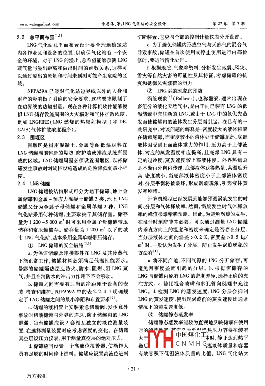 第27卷第7期煤氣與熱力Vol 27 No. 72007年7月GAS heatJul.2007液化天然氣LNG氣化站的安全設(shè)計朱昌偉,馬國光,李剛(1.西南石油大學(xué),四川成都610500;2.中海石油管道輸氣公司,海南???70105摘要:簡述了ING的危險性和我國ING氣化站的發(fā)展現(xiàn)狀,從設(shè)計標(biāo)準(zhǔn)、總平面布置、圍堰區(qū)、儲罐、氣化器、ING輸送管道以及消防等方面論述了ING氣化站的安全設(shè)計。關(guān)鍵詞:液化天然氣;氣化站;儲罐;安全中圖分類號:TU96文獻(xiàn)標(biāo)識碼:B文章編號:1000-4416(2007)07-0020-04Safety Design of LNG Vaporizing StationZHU Chang-wei, MA Guo-guang, LI Gang(1. Southwest Petroleum University, Chengdu 610500, China; 2. CNoOC Gas Pipelining CoLtd, Haikou 570105, China)Abstract: The hazard of LNG and the current development status of LNG vaporizing station in Chi-na are introduced briefly. The safety design of LNG vaporizing station is discussed in aspects of designstandards, general arrang area, storage tanks, vaporizer, LNG transmission pipeline,fire control and so onKey words: LNG; vaporizing station; storage tank; safety1概述中國LNG供氣的序幕1.1LNG的危險性1目前國內(nèi)已建成使用的LNG氣化站逾30座。①低溫的危險性:LNG的儲存和操作都在低隨著新疆廣匯LNG廠于2004年投產(chǎn),以及廣東沿溫下進(jìn)行,一旦發(fā)生泄漏,會使相關(guān)設(shè)備脆性斷裂和海LNG接收終端的建成投產(chǎn),LNG供應(yīng)在我國將形遇冷收縮,從而破壞設(shè)備,引發(fā)事故。并且,低溫成南、中、西的供應(yīng)格局。加之LNG氣化工程的關(guān)ING能凍傷操作人員。鍵設(shè)備如低溫儲罐、氣化器、低溫閥門及運輸設(shè)備的②火災(zāi)危險性:天然氣與空氣混合能形成爆國產(chǎn)化,可以預(yù)見,在未來5年我國將會迎來LNG炸性混合氣體,爆炸極限(體積分?jǐn)?shù))為5%~15%。氣化站建設(shè)的高峰如果存在火源,極易著火燃燒,甚至爆炸。2LNG氣化站的安全設(shè)計③對人體的危害:雖然LNG蒸氣無毒,但是2.1設(shè)計標(biāo)準(zhǔn)如果吸進(jìn)純的LNG蒸氣,人會迅速失去知覺,幾分設(shè)計時可參考的國外標(biāo)準(zhǔn)主要有美國的NF鐘后死亡;當(dāng)大氣中氧的含量逐漸減少時,工作人員PA59A《液化天然氣(LNG)生產(chǎn)、儲存和裝卸標(biāo)可能警覺不到而慢慢地窒息。準(zhǔn)》、NFPA57《ING汽車燃料系統(tǒng)》等;國內(nèi)標(biāo)準(zhǔn)2我國LNG氣化站的發(fā)展現(xiàn)狀有中國煤化工氣設(shè)計規(guī)范》;CB2001年中原油田建成了我國第一座生產(chǎn)型的501CNMHG設(shè)計防火規(guī)范》,(建LNG裝置,淄博LNG氣化站同時建成投產(chǎn),揭開了筑議計切火觀范守。www.watergasheat.com朱昌偉,等:LNG氣化站的安全設(shè)計笫27卷第7期22總平面布置2切斷裝置,它應(yīng)與全部的控制計量儀表分開設(shè)置。LNG氣化站總平面布置設(shè)計要合理地確定站e.為了避免儲罐內(nèi)形成空氣與天然氣的混合氣內(nèi)各作業(yè)區(qū)和設(shè)備的位置,以確保氣化站有一個安導(dǎo)致事故儲罐在首次使用或停止使用進(jìn)行內(nèi)部檢全的環(huán)境。對于LNG的溢出,總希望能夠預(yù)測LNG修時,要進(jìn)行惰化處理。蒸氣量與溢出距離和溢出時間的函數(shù)關(guān)系,這樣可f根據(jù)地質(zhì)、氣象等資料,分析發(fā)生地震、風(fēng)災(zāi)、以通過溢出的流量和時間來預(yù)測可能產(chǎn)生危險的區(qū)雪災(zāi)等自然災(zāi)害的可能性及其特征,考慮儲罐的抗域震和抵御風(fēng)雪載荷的能力NFPA59A已經(jīng)對氣化站邊界線以外的人身和②LNG渦旋現(xiàn)象的預(yù)防財產(chǎn)的影響做了明確的安全要求,這些要求限制了渦旋現(xiàn)象( rollover),也稱翻滾,通常出現(xiàn)在在邊界線的熱輻射量。現(xiàn)在各種計算機軟件能夠模多組分的液化天然氣中,是由于向已裝有LNG的低擬LNG儲存設(shè)施周圍的火災(zāi)輻射和氣體擴散濃度,溫儲罐中充注新的LNG,或由于LNG中的氮優(yōu)先蒸例如 LNGFIRE(ING燃燒的熱輻射模型)和DE-發(fā)而使儲罐內(nèi)的液體發(fā)生分層而引起。在已有的GAIS(氣體擴散濃度程序)。些研究中,對該問題的解釋是:密度較大的液體積聚2.3圍堰區(qū)在儲罐底部,而密度較小的液體處于儲罐頂部,底部圍堰區(qū)是指用混凝土、金屬等耐低溫材料在液體因受到上面液體重力的作用,壓力高于上部液LNG儲罐周圍建造的堤防、防護(hù)墻或排液系統(tǒng)所圍體,對應(yīng)的蒸發(fā)溫度相應(yīng)提高,且底部LNG具有成的區(qū)域。LNG儲罐周圍必須設(shè)置圍堰區(qū),以將儲定的過冷度,蒸發(fā)速度較上部液體慢。外界熱量總罐發(fā)生事故時對周圍設(shè)施造成的危險降低到最小程是不斷由外向內(nèi)傳遞,底部液體獲得熱量,其溫度升度高,密度減小,當(dāng)?shù)撞恳后w密度小于上部液體密度2.4LNG儲罐時,分層平衡將被破壞,形成渦旋現(xiàn)象,引起液體蒸LNG儲罐按結(jié)構(gòu)形式可分為地下儲罐、地上金發(fā)率劇增。屬儲罐和金屬-預(yù)應(yīng)力混凝土儲罐3類,地上LNG計算機模型已經(jīng)發(fā)展到能夠預(yù)測渦旋發(fā)生的時儲罐又分為金屬子母儲罐和金屬單罐2種。LNG間、分層和氣體釋放率,然而,渦旋發(fā)生時氣體釋放氣化站采用何種儲罐,主要取決于其儲存量。儲存率的峰值很難精確預(yù)測。因此,為避免渦旋的發(fā)生量為1200~5000m3時可采用金屬子母儲罐帶壓在設(shè)計時預(y