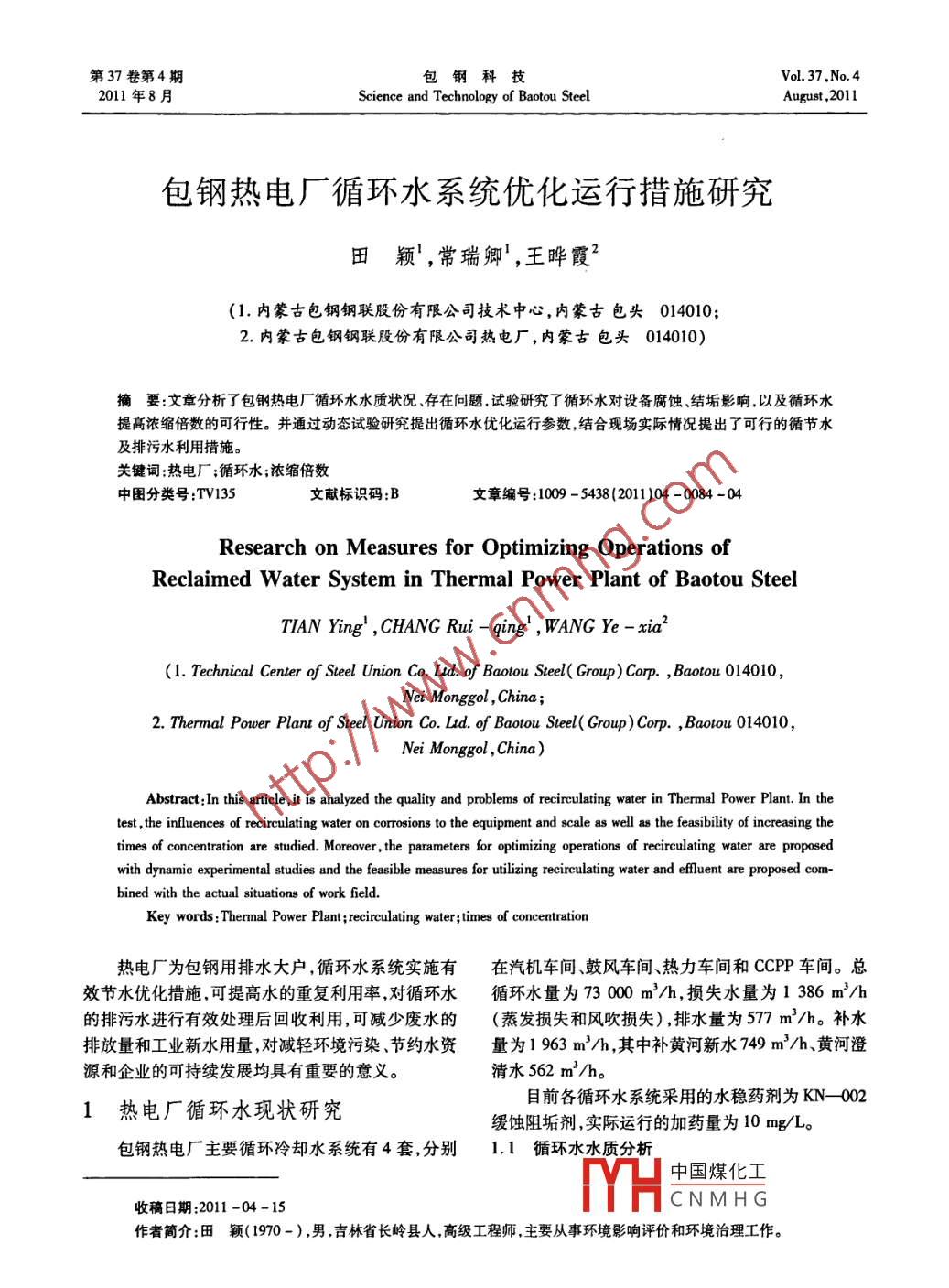第37卷第4期包鋼科技Vol. 37 ,No.42011年8月Science and Technology of Baotou SteelAugust ,2011包鋼熱電廠循環(huán)水系統(tǒng)優(yōu)化運行措施研究田穎',常瑞卿',王曄霞2(1.內(nèi)蒙古包鋼鋼聯(lián)股份有限公司技術(shù)中心,內(nèi)蒙古包頭014010;2.內(nèi)蒙古包鋼鋼聯(lián)股份有限公司熱電廠,內(nèi)蒙古包頭014010)摘要:文章分析了包鋼熱電廠循環(huán)水水質(zhì)狀況、存在問題. 試驗研究了循環(huán)水對設(shè)備腐蝕、結(jié)垢影響,以及循環(huán)水提高濃縮倍數(shù)的可行性。并通過動態(tài)試驗研究提出循環(huán)水優(yōu)化運行參數(shù),結(jié)合現(xiàn)場實際情況提出了可行的循節(jié)水及排污水利用措施。關(guān)鍵詞熱電廠;循環(huán)水;濃縮倍數(shù)中圖分類號:TV135文獻(xiàn)標(biāo)識碼:B文章編號:1009 - 5438(2011 )04 -0084 -04Research on Measures for Optimizing Operations ofReclaimed Water System in Thermal Power Plant of Baotou SteelTIAN Ying' ,CHANG Rui - qing' , WANG Ye - xia2(1. Technical Center of Steel Union Co. Lad. of Baotou Stee( Group) Corp. , Baotou 014010 ,Nei Monggol ,China;2. Thermal Power Plant of Steel Union Co. Llid. of Baotou Stee( Croup)Corp. ,Baotou 014010,Nei Monggol ,China)Abstract:In this article, it is analyzed the quality and problems of recirculating water in Thermal Power Plant. In thetest , the influences of recirculating water on corrosions to the equipment and scale as well as the feasibilty of increasing thetimes of concentration are studied. Moreover , the parameters for optimizing operations of recirculating water are proposedwith dynamic experimental studies and the feasible measures for utilizing recirculating water and efluent are proposed com-bined with the actual situations of work field.Key words :Thernal Power Plant ;recirculating water;times of concentration熱電廠為包鋼用排水大戶,循環(huán)水系統(tǒng)實施有在汽機(jī)車間鼓風(fēng)車間、熱力車間和CCPP車間??傂Ч?jié)水優(yōu)化措施,可提高水的重復(fù)利用率,對循環(huán)水循環(huán)水量為73000 m'/h,損失水量為1 386 m'/h的排污水進(jìn)行有效處理后回收利用,可減少廢水的(蒸發(fā)損失和風(fēng)吹損失) ,排水量為577 m2/h。補水排放量和工業(yè)新水用量,對減輕環(huán)境污染、節(jié)約水資量為1963 m'/h,其中補黃河新水749 m'/h、黃河澄源和企業(yè)的可持續(xù)發(fā)展均具有重要的意義。清水562 m'/h。目前各循環(huán)水系統(tǒng)采用的水穩(wěn)藥劑為KN- 0021熱電廠循環(huán)水現(xiàn)狀研究緩蝕阻垢劑,實際運行的加藥量為10 mg/L。包鋼熱電廠主要循環(huán)冷卻水系統(tǒng)有4套,分別1.1 循環(huán)水水質(zhì)分析中國煤化工收稿日期:2011 -04-15MYHCNMH G .作者簡介:田穎(1970-),男 .吉林省長嶺縣人,高級工程師.主要從事環(huán)境影響評價和環(huán)境治理工作。.第4期包鋼熱電廠循環(huán)水系統(tǒng)優(yōu)化運行措施研究85(1)水質(zhì)分析判定方法試驗掛片:采用冷卻水化學(xué)處理標(biāo)準(zhǔn)腐蝕試片。試?yán)梅€(wěn)定指數(shù)RSI(2pHs - pH)、結(jié)垢指數(shù)PSI驗結(jié)果見表3。(2pHs-pHeq)對熱電廠各循環(huán)冷卻水系統(tǒng)的水質(zhì)表3熱電循環(huán)水現(xiàn)場掛片試驗結(jié)果作定性判定。盾環(huán)水濃掛片材質(zhì)腐蝕率黏附速書飽和pH值(pHg)的簡化計算方法:pH, =系統(tǒng)倍數(shù)/(mm.a-') /(ng.cm-2 .m十)(9.70+A +B)-(C-D)熱力2.220鐘0.0744.62式中:A為總?cè)芙夤腆w系數(shù);B為溫度系數(shù);CHSn70-1A銅片0.0042. 34為鈣硬度系數(shù);D為M堿度;pH為實測值。HSn70-1B銅片0. 0042. 10平衡pH值(pHeq)的簡化計算方法:pHeq=汽機(jī)2.120鋼0.1387.041. 465 lg(M堿度) +4.54車潤0.00712. 22式中:M堿度為系統(tǒng)中水的總堿度。HAL77-2銅片0.0054.31穩(wěn)定指數(shù)RSI、結(jié)垢指數(shù)PSI的判別依據(jù)見表1。CCPP 2.10.062 .3.21表1穩(wěn)定指數(shù)RSI、結(jié)垢指數(shù)PSI的判別依據(jù)車間HSn70-1A 銅片0.0030.66穩(wěn)定指數(shù)RSI判別結(jié)垢指數(shù)PSI鼓風(fēng)2.00.12316.73<6結(jié)垢<5.0嚴(yán)重結(jié)垢車聞HSn70 - 1A銅片5.12 .5.0-6.0輕度結(jié)垢6.72=穩(wěn)定6.0-7.0微武結(jié)垢或腐蝕HSn70-1銅片0. 0054.827.0-7.5 .腐蝕顯著H68銅片0.0086.56>腐蝕7.5 -9.0嚴(yán)重腐蝕.削冷開式系統(tǒng)循環(huán)冷卻水水質(zhì)0.075 .15.00>9.0不允許的腐蝕指標(biāo)( CB50050 -2007) "(2)水質(zhì)分析判定。根據(jù)熱電廠各循環(huán)冷卻水系統(tǒng)的實際情況及現(xiàn)場取樣監(jiān)測數(shù)據(jù),分析計算各由表3的試驗數(shù)據(jù)看,各循環(huán)水碳鋼試片的腐循環(huán)水系統(tǒng)目前實際運行控制的濃縮倍數(shù)及水質(zhì)穩(wěn)蝕率為0.062~0.138mm/a,黏附速率為3.21~定指數(shù)RSI、結(jié)垢指數(shù)PSI見表2。16.73mg/(cm2.m),汽機(jī)鼓風(fēng)碳鋼試片腐蝕率均表2穩(wěn)定指數(shù)RSI、結(jié)垢指數(shù)PSI的判別超過標(biāo)準(zhǔn)。銅合金試片的腐蝕率為0. 004 ~循環(huán)水濃縮.0.008 mm/a,黏附速率為2.10~7.04 mg/(cm2●m) ,系統(tǒng)儕數(shù)RSI值.判別PSI值 判別銅合金試片腐蝕率較低,汽機(jī)車間HSn70-1A銅汽機(jī)車間2.4.078鉆垢4.075嚴(yán)亟結(jié)垢片鼓風(fēng)車間H68銅片腐蝕率略超標(biāo)準(zhǔn),其余試片鼓風(fēng)車間2.73.320結(jié)垢3.314 嚴(yán) 取結(jié)垢均滿足《工業(yè)循環(huán)冷卻水設(shè)計規(guī)范》”要求。鼓風(fēng)熱力車間2.4 3. 460結(jié)垢3.459 嚴(yán) 承結(jié)垢碳鋼試片黏附速率超標(biāo)。CCPP