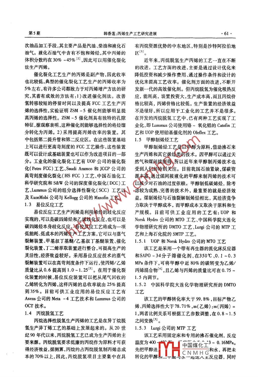 山東化工SHANDONG CHEMICAL INDUSTRY2013年第42卷丙烯生產工藝研究進展韓香蓮!2(1青島科技大學化工學院山東青島26042;2濰坊職業(yè)學院化學工程學院山東濰坊261041)搞要:丙烯是催化裂化和蒸氣裂解裝置的副產品由于近年來國內外對丙烯的需求逐年增多常規(guī)的蒸氣裂解和催化裂化工藝生產的丙烯都難以滿足丙烯快速增長的需求。目前主要生產丙烯的工藝有:1)蒸氣裂解工藝2)催化裂化工藝;3)易位反應工藝4)丙烷脫氫工藝;5)甲醇制烯烴(MIP)工藝;56)重烯烴裂解工藝。其中對甲醇制丙烯(MIP)項目工藝包開發(fā)作了簡要說明關鍵詞:丙烯生產;甲醇;工藝包中圖分類號:TQ22.212文獻標識碼:A文章編號:1008-021X(2013)05-0060-03Development of Propylene Production TechnologyHAN Xiang-lian(1. Department of Chemical Technology, Qingdao University of Science and Technology, Qingdao 266042China; 2. Department of Chemical Engineering, Weifang vocational College, Weifang 261041, China)Abstract: Propylene is a byproduct of the catalytic cracking and steam cracking. In recent years, becauseof more and more demand for propylene, conventional steam cracking and catalytic cracking apparatuspropylene production are difficult to meet the rapidly growing demand of propylene. The mainly crafts ofpropylene production are the follows. 1) Steam cracking process; 2)Catalytic cracking process; 3)Translocation reaction process; 4 Propane dehydrogenation process; 5) Methanol to olefins process; 6)Heavy olefin cracking process. The development of methanol-to-propylene( MTP) project technologypackage are briefly describedKey words: propylene production; methanol; technology package丙烯是重要的石油化工原料,也是生產石油化主要來源,目前613%的丙烯來自蒸氣裂解。蒸氣工產品重要的烯烴之一,可以用來生產丙烯腈聚丙裂解是以天然氣或輕質石油餾分(如石腦油)為主烯、丙三醇、異丙醇、環(huán)氧丙烷等多種化工產品。在要原料,在高溫下進行的熱裂化反應。采用輕質石所有的石油化工原料中,丙烯的需求量增長最快,油餾分做原料時,所得的丙烯和乙烯收率比在0.52011年兩烯需求量約為7350萬ta,有研究表明,~0.65之間(。影響蒸氣裂解工藝丙烯收率的主2012年預計丙烯的需求量會增長4%達到8300萬要因素有裂解苛刻度和裂解原料。低苛刻度下,乙va。所以近年來對丙烯的需求越來越多,丙烯資烯的收率低,以丙烷和丁烷為原料進行裂解生產的源供應依然緊張,選擇合適的丙烯生產工藝顯得格丙烯收率最高。國外新增的蒸氣裂解制乙烯裝置多外重要。以乙烷類的氣體為原料,導致丙烯和乙烯的收率比丙烯生產工藝大大降低,而且蒸氣裂解裝置投資大,經濟效益不目前工業(yè)化的丙烯生產工藝主要有:1)蒸氣裂好,因此將來不可能單純依靠蒸氣裂解工藝來大幅解;2)催化裂化;3)易位反應;4)丙烷脫氫;5)甲醇度增產丙烯。制烯烴(MTP);6)重烯烴裂解。1.2催化裂化工藝1.1蒸氣裂解工藝催化裂化工藝是利用重質油在催化劑高溫作用乙烯蒸氣裂解工藝副產丙烯仍然是丙烯生產的下(450~500℃),將大分子轉化為小分子的重要二中國煤化工收稿日期:2013-03-30CNMHG作者簡介:韓香蓮(1982—),女,山東濰坊人,濰坊職業(yè)學院化學工程學院教師第5期韓香蓮:丙烯生產工藝研究進展61次油品加工手段其主要產品是汽油柴油和液化石有丙烷資源優(yōu)勢的中東地區(qū),特別是沙特阿拉伯地油氣。液化石油氣中含有不飽和烯烴,其中丙烯的區(qū)。體積分數約在30%~45%2),因此可以用催化裂化近年來,丙烷脫氫生產丙烯的工藝一直在不斷法生產丙烯。的改進。工藝方面的改進,主要是通過設計優(yōu)化來催化裂化工藝生產的丙烯是副產物因此收率降低投資和減少操作費用、通過操作條件和設計的也比較低,典型的催化裂化工藝生產的丙烯收率為優(yōu)化來提高工藝收率。催化劑方面的改進,不斷開5%左右,有許多公司都致力于對丙烯增產方法的研發(fā)新一代的高效催化劑。但內烷脫氫為催化吸熱反究,其著有成效的方法有:1)改進催化劑法。改善應,能耗高,裝置投資大,生產成本高,而且丙烷價氫轉移較短的停留時間以及提高FCC工藝生產丙格比較高,丙烯價格比較低,生產裝置的經濟效益烯的選擇性,實驗證明ZSM-5催化劑能夠明顯提不是很好,所以應用于工業(yè)化的工藝并不是很多。高丙烯的選擇性。ZSM-5催化劑具有獨特的孔隙在開發(fā)的丙烷脫氫工藝中,已有兩種工藝實現了工特征據觀察表明,這種催化劑能夠選擇性的將烴餾業(yè)化,即 Lummus公司使用鉻-氧化鋁的 Catofin工分轉化為丙烯。2)采用提高丙烯收率的裝置。其藝和UOP使用鉑基催化劑的 Reflex工藝。中包括第二提升管和第二反應區(qū)。在這些裝置基礎1.5甲醇制烯烴工藝上可以進行更高苛刻度的FCC工藝操作,這些裝置甲醇制烯烴工藝是以甲醇為原料,借助沸石來既可以設計成基礎裝置也可以作為改造項目的一部生產丙烯和其它烯烴類的技術。因甲醇可以通過天分。工業(yè)化的催化裂化工藝有UOP公司的催化裂然氣和煤間接制得,所以近年來甲醇制丙烯技術也化( Petro FCC)工藝、 Saudi aramco和JCCP公司的受到人們的特別關注。目前我國石油緊缺,煤碳資高苛刻度催化裂化( HS FCC)工藝、中國石油化工源豐富,通過煤間接液化的甲醇來制丙烯的技術可科學研究院和S&W公司的深度催化裂化(DCC)工以減少對石油的過度依賴。甲醇制低碳烯烴,除考藝、 Lummus公司的組分選擇性裂化(SCC)工藝以慮較為成熟、完善的技術