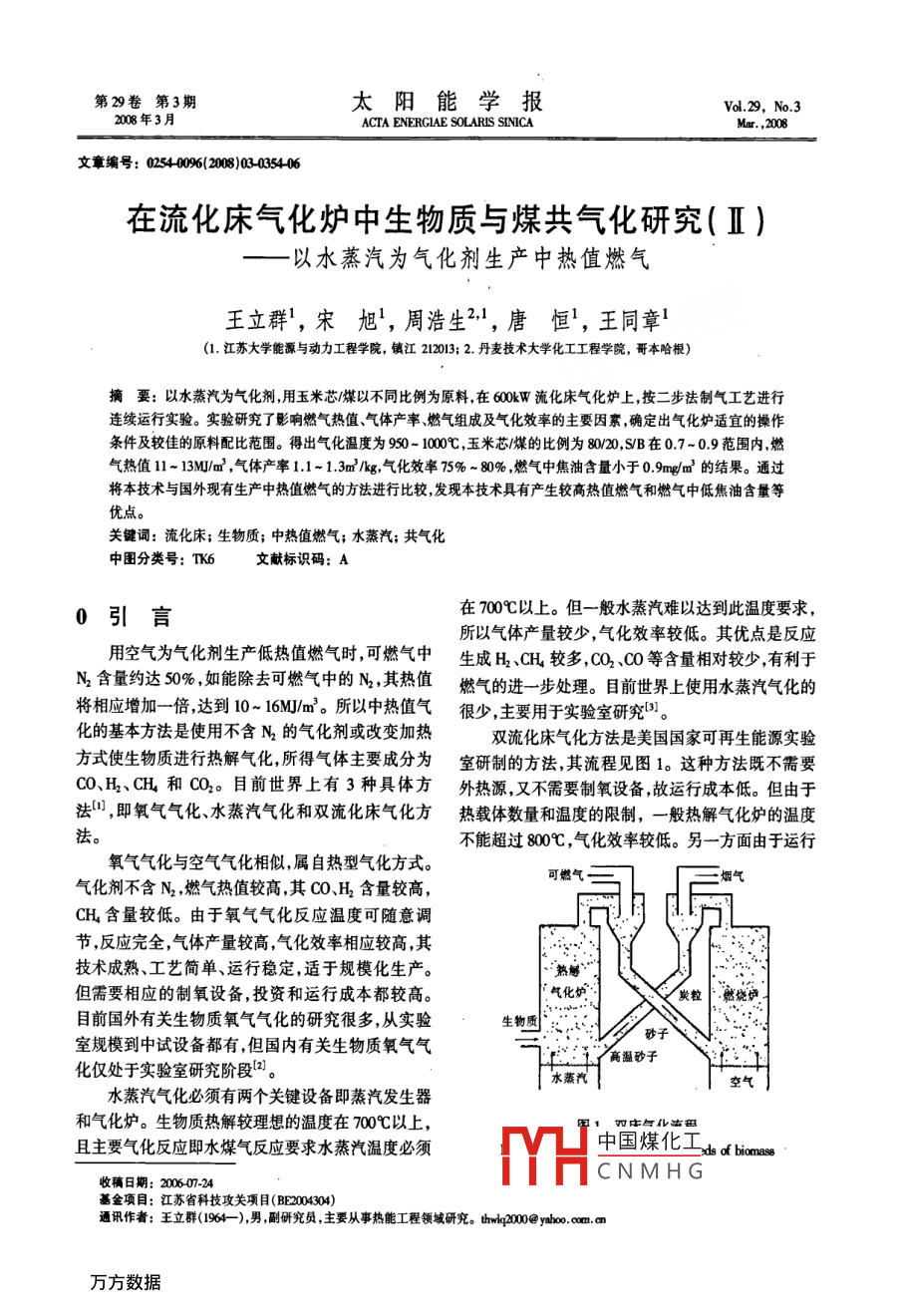 在流化床氣化爐中生物質(zhì)與煤共氣化研究(Ⅱ)——以水蒸汽為氣化劑生產(chǎn)中熱值燃氣