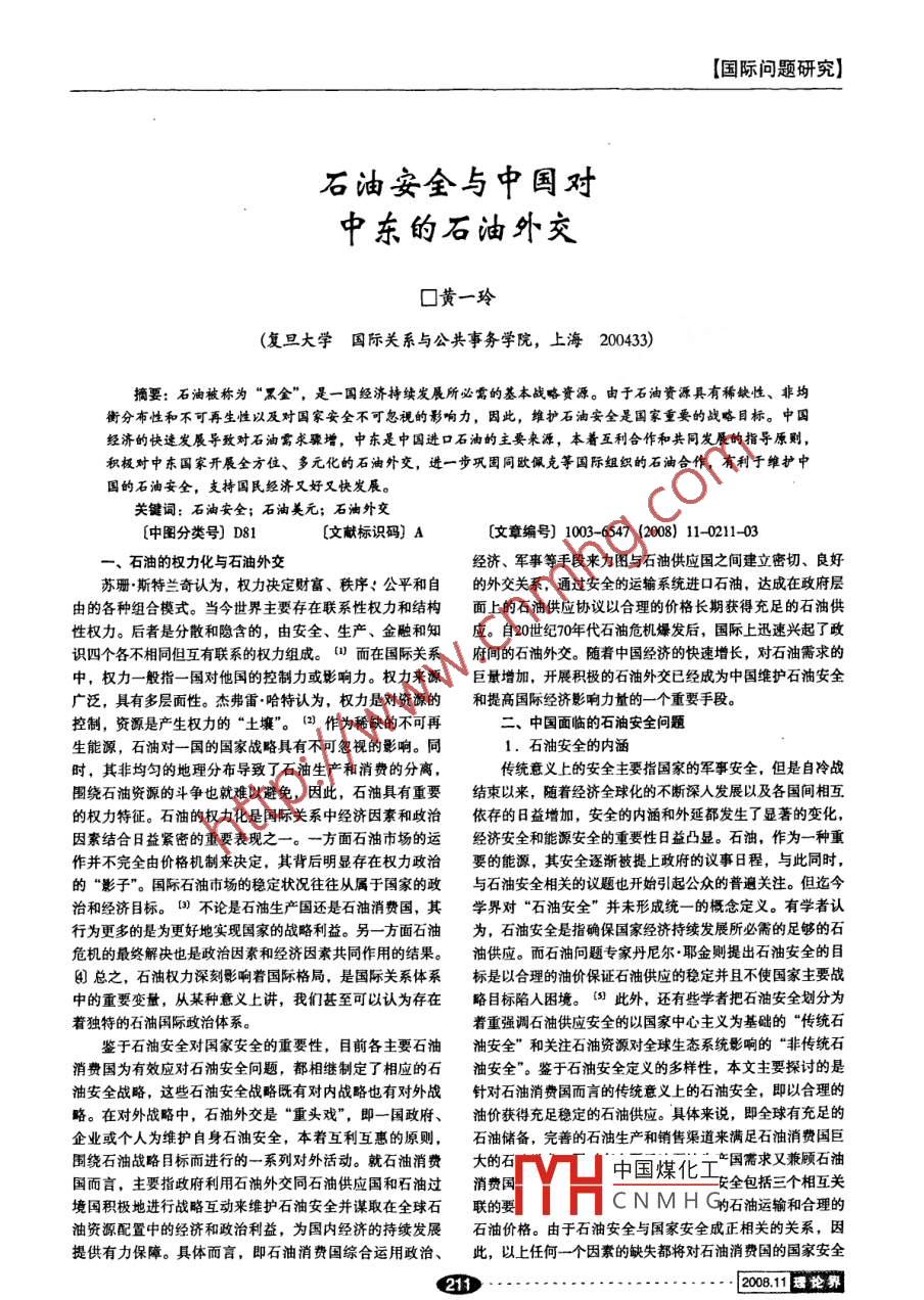 [國際問題研究]石油安全與中國對中東的石油外交口黃一玲(復旦大學國際關系與公共事務學院, 上海200433)摘要:石油被稱為“黑金”, 是一國經(jīng)濟持續(xù)發(fā)展所必需的基本戰(zhàn)略資源。由于石油資源具有稀缺性、非均衡分布性和不可再生性以及對國家安全不可忽視的影響力,因此,維護石油安全是國家重要的戰(zhàn)略目標。中國經(jīng)濟的快速發(fā)展導致對石油需求驟增,中東是中國進口石油的主要來源,本著互利合作和共同發(fā)展的指導原則,積極對中東國家開展全方位、多元化的石油外交,進一步鞏固同歐佩克等國際組織的石油合作,有利于維護中國的石油安全,支持國民經(jīng)濟又好又快發(fā)展。關鍵詞:石油安全;石油美元;石油外交[中圖分類號] D81 [文獻標識碼] A[文章編號] 1003-6547 (2008) 11-0211-03-、石油的權(quán)力化與石油外交經(jīng)濟、軍事等手段來力圖與石油供應國之間建立密切、良好蘇珊.斯特蘭奇認為,權(quán)力決定財富、秩序:公平和自的外交關系,通過安全的運輸系統(tǒng)進口石油,達成在政府層由的各種組合模式。當今世界主要存在聯(lián)系性權(quán)力和結(jié)構(gòu)面上的石油供應協(xié)議以合理的價格長期獲得充足的石油供性權(quán)力。后者是分散和隱含的,由安全、生產(chǎn)、金觸和知應。自20世紀70年代石油危機爆發(fā)后,國際上迅速興起了政識四個各不相同但互有聯(lián)系的權(quán)力組成。"而在國際關系府間的石油外交。隨著中國經(jīng)濟的快速增長,對石油需求的中,權(quán)力一般指一國對他國的控制力或影響力。權(quán)力來源巨最增加,開展積極的石油外交已經(jīng)成為中國維護石油安全廣泛,具有多層面性。杰弗雷.哈特認為,權(quán)力是對資源的和提高國際經(jīng)濟影響力量的-一個重要手段??刂疲Y源是產(chǎn)生權(quán)力的“土壤"。(2) 作為稀缺的不可再二、中國面臨的石油安全問題生能源,石油對一國的國家戰(zhàn)略具有不可忽視的影響。同1.石油安全的內(nèi)涵時,其非均勻的地理分布導致了石油生產(chǎn)和消費的分離,傳統(tǒng)意義上的安全主要指國家的軍事安全,但是自冷戰(zhàn)圍繞石油資源的斗爭也就難以避免,因此,石油具有重要結(jié)束以來,隨著經(jīng)濟全球化的不斷深人發(fā)展以及各國間相互的權(quán)力特征。石油的權(quán)力化是國際關系中經(jīng)濟因素和政治依存的日益增加,安全的內(nèi)涵和外延都發(fā)生了顯著的變化,因素結(jié)合8益緊密的重要表現(xiàn)之- -。一方面石油市場的運經(jīng)濟安全和能源安全的重要性日益凸顯。石油,作為一種重作并不完全由價格機制來決定,其背后明顯存在權(quán)力政治要的能源,其安全逐漸被提上政府的議事日程,與此同時,的“影子”。國際石油市場的穩(wěn)定狀況往往從屬于國家的政與石油安全相關的議題也開始引起公眾的普遍關注。但迄今治和經(jīng)濟目標。0) 不論是石油生產(chǎn)國還是石油消費國,其學界對“石油安全”并未形成統(tǒng)-的概念定義。有學者認行為更多的是為更好地實現(xiàn)國家的戰(zhàn)略利益。另- -方面石油為,石油安全是指確保國家經(jīng)濟持續(xù)發(fā)展所必需的足夠的石危機的最終解決也是政治因素和經(jīng)濟因素共同作用的結(jié)果。油供應。而石油問題專家丹尼爾●耶金則提出石油安全的目④)總之,石油權(quán)力深刻影響著國際格局,是國際關系體系標是以合理(的油價保證石油供應的穩(wěn)定并且不使國家主要戰(zhàn)中的重要變量,從某種意義上講,我們甚至可以認為存在略目標陷人困境。($ 此外,還有些學者把石油安全劃分為著獨特的石油國際政治體系。著重強調(diào)石油供應安全的以國家中心主義為基礎的“傳統(tǒng)石鑒于石油安全對國家安全的重要性,目前各主要石油油安全”和關注石油資源對全球生態(tài)系統(tǒng)影響的“非傳統(tǒng)石消費國為有效應對石油安全問題,都相繼制定了相應的石油安全”。鑒于石油安全定義的多樣性,本文主要探討的是油安全戰(zhàn)略,這些石油安全戰(zhàn)略既有對內(nèi)戰(zhàn)略也有對外戰(zhàn)針對石油消費國而言的傳統(tǒng)意義上的石油安全,即以合理的略。在對外戰(zhàn)略中,石油外交是“重頭戲”,即一國政府、油價獲得充足穩(wěn)定的石油供應。具體來說,即全球有充足的企業(yè)或個人為維護自身石油安全,本者互利互惠的原則,石油儲備, 完善的石油生產(chǎn)和銷售渠道來滿足石油消費國巨圍繞石油戰(zhàn)略目標而進行的一系列對外活動。就石油消費大的石中國煤化工一產(chǎn)國需求又兼顧石油國而言,主要指政府利用石油外交同石油供應國和石油過消費國安全包括三個相互關境國積極地進行戰(zhàn)略互動來維護石油安全并謀取在全球石聯(lián)的要YhC N M H G的石油運輸和合理的油資源配置中的經(jīng)濟和政治利益,為國內(nèi)經(jīng)濟的持續(xù)發(fā)展石油價格。由于石油安全與國家安全成正相關的關系,因提供有力保障。具體而言,即石油消費國綜合運用政治、此,以上任何一一個因素的缺失都將對石油消費國的國家安全21....--2008.11送論界[國際問題研究]造成不可低估的負面影響。石油外交是中國綜合性石油安全戰(zhàn)略的重要環(huán)節(jié)。2.中國面臨的石油安全問題2.中