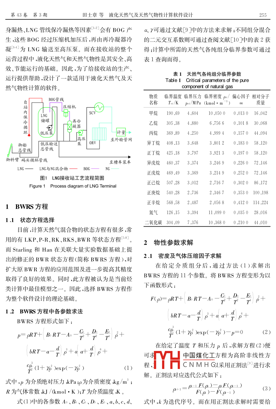 石油與天然氣化工254CHEMICAL ENGINEERING OF OIL gas2014UTILIZATION OF NATURAL GAS AND液化天然氣及天然氣物性計(jì)算軟件設(shè)計(jì)田士章陳帥楊波2天然氣及其凝液的利用(1.中石油大連液化天然氣有限公司2.中海廣東天然氣有限責(zé)任公司)摘要液化天然氣(LNG)及天然氣(NG)物性計(jì)算是LNG接收站生產(chǎn)、運(yùn)行的基礎(chǔ)。雖然國(guó)外已有很多商業(yè)軟件可以計(jì)算其物性,但大多價(jià)格昂貴且應(yīng)用復(fù)雜。因此,以BWRS方程為理論基礎(chǔ),在 Forcecontrol v7.0平臺(tái)上設(shè)計(jì)出一款應(yīng)用簡(jiǎn)單,且能夠滿足LNG接收站需求的物性計(jì)算軟件。通過(guò)將大連LNG接收站實(shí)際運(yùn)行數(shù)據(jù)及 Aspen Plus計(jì)算數(shù)據(jù)與此軟件計(jì)算數(shù)據(jù)進(jìn)行對(duì)比,得到一些典型物性的相對(duì)誤差;同時(shí),通過(guò)實(shí)例計(jì)算以驗(yàn)證其可靠性。結(jié)果表明,該軟件能較為準(zhǔn)確地計(jì)算LNG及NG物性,并且能很妤地滿足LNG接收站物性計(jì)算的需求關(guān)鍵詞液化天然氣天然氣LNG接收站物性計(jì)算BWRS方程 Forcecontrol v7.0計(jì)算軟件中圖分類(lèi)號(hào):TE626.7文獻(xiàn)標(biāo)志碼:ADOI:10.3969jsn.1007-3426.2014.03.008Design of liquefied natural gas and natural gas properties calculation softwareTian Shizhang, Chen Shuai, Yang Bo(1. Petro China dalian liquefied Natural Gas Com p any Limited, Dalian 116600, Liaoning, China)(2. Guang dong Natural Gas Co., Ltd, CNOOC, Zhuhai 519015, Guangdong, China)Abstract: The production and operation of LNG terminal are based on liquefied natural gas(LNG)and natural gas (NG) properties calculation. Although there are many foreign commercial softw ares w hich can calculate the properties, most of them are expensive and complexTherefore, BWRs equation as the theoretical basis, the properties calculation software is designed based on the Forcecontrol V7.0 softw are platform w hich is simple and can meet the needsof LNG Terminal. By comparing the data of the actual operation in Dalian LNG Terminal calculated data by Aspen Plus and by this softw are, relative errors about some typical properties havehile. the reliability of the calculples Resuluts of lng andNG properties and can well meet the properties calculation needs of LNG TerminalKey words: liquefied natural gas, natural gas, LNG Terminal, properties calculation, BWRSequation, Forcecontrol V7.0, calculation softw areLNG接收站主要用于接收、儲(chǔ)存和氣化LNG,槽車(chē)和高壓泵;至槽車(chē)的LNG直接由槽車(chē)至用戶,并通過(guò)外輸天然氣管道向用戶提供天然氣。LNG而高INC重壓,輸送至氣化器將接收站工藝流程簡(jiǎn)圖如圖1所示。LNG由卸料臂LN4中國(guó)煤化工量系統(tǒng)輸送至外輸管CNMHG輸送至儲(chǔ)罐存儲(chǔ),然后通過(guò)儲(chǔ)罐中的低壓泵加壓至網(wǎng)。女收仕吊們赳仼中,由于LNG儲(chǔ)罐自作者簡(jiǎn)介:田士章(1966-),男,工程碩士,高級(jí)工程師,石油儲(chǔ)運(yùn)專(zhuān)業(yè)畢業(yè)。任職于中石油大連液化天然氣有限公司。地址:(11660遼寧省大連市中山區(qū)人民路23號(hào)虹源大廈3409。電話:04118256605E-mal:tsiNg@petrochina.com.cn第43卷第3期田士章等液化天然氣及天然氣物性計(jì)算軟件設(shè)計(jì)255身漏熱、LNG管線保冷漏熱等因素2會(huì)有BOG產(chǎn)a、y可通過(guò)文獻(xiàn)[9中的方法來(lái)求解;不同組分混合生,這些BOG經(jīng)過(guò)壓縮機(jī)加壓后,再由再冷凝器冷的二元交互系數(shù)則可通過(guò)查閱文獻(xiàn)[10]中的表2獲凝為L(zhǎng)NG輸送至高壓泵。而在接收站的整個(gè)得;計(jì)算中所需的天然氣各純組分臨界參數(shù)可通過(guò)運(yùn)營(yíng)過(guò)程中,液化天然氣和天然氣物性是其安全、高表1查詢而得效、節(jié)能運(yùn)行的基礎(chǔ)。因此,為了給接收站的生產(chǎn)表1天然氣各純組分臨界參數(shù)運(yùn)行提供幫助,設(shè)計(jì)了一款適用于液化天然氣及天Table 1 Critical parameters of the pure然氣物性計(jì)算的軟件。B0G管線物質(zhì)臨界溫度臨界壓力臨界密度ρ/偏心因子相對(duì)分子名稱(chēng)/MPa(kmol·m3)自站內(nèi)保冷循環(huán)壓縮機(jī)LNG甲烷190.694.60410.05000.013016.042再冷凝器乙烷384.8806.75660,101830,068低壓量丙烷369.894.2504.99940.157044.094高至外輸管網(wǎng)御船低壓輸送泵|0RV異丁烷408.133.6483.80120.183058.120總管線總管線正丁烷425.183.7973.92130.197058.120御料臂碼頭循環(huán)管線至槽車(chē)裝車(chē)異戊烷460.373.3743.24690.226072.146LNG—LNG與NG混合物—B0G—NG正戊烷469.493.3693.21490.252072.146圖1LNG接收站工藝流程簡(jiǎn)圖正己烷507.283.0122.71670.302086.172Figure 1 Process diagram of LNG Terminal正庚烷540.282.7362.3460.3530100.1981BwRS方程正辛烷568.582.4872.05680.4120114.24氮?dú)?26.153.39411.09900.035028.0161.1狀態(tài)方程選擇氧化碳304.097.37610.36800.210044.010目前,計(jì)算天然氣混合物的狀態(tài)方程有很多,常用的有LKP、P-R、RK、RKS、BWR等狀態(tài)方程58。2物性參數(shù)求解而 Starling和Han在關(guān)聯(lián)大量實(shí)驗(yàn)數(shù)據(jù)基礎(chǔ)上提出的修正的BWR狀態(tài)方程(簡(jiǎn)稱(chēng)BWRS方程),對(duì)2.1密度及氣體壓縮因子求解擴(kuò)大原BwR方程的應(yīng)用范圍及進(jìn)一步提高其精度在給定介質(zhì)組分后,通過(guò)方法(1)求解出取得了良好的效果。同時(shí),此方程被認(rèn)為是當(dāng)前烴BWRS方程的11個(gè)參數(shù)。將BWRS方程變形為以類(lèi)計(jì)算中最佳模型