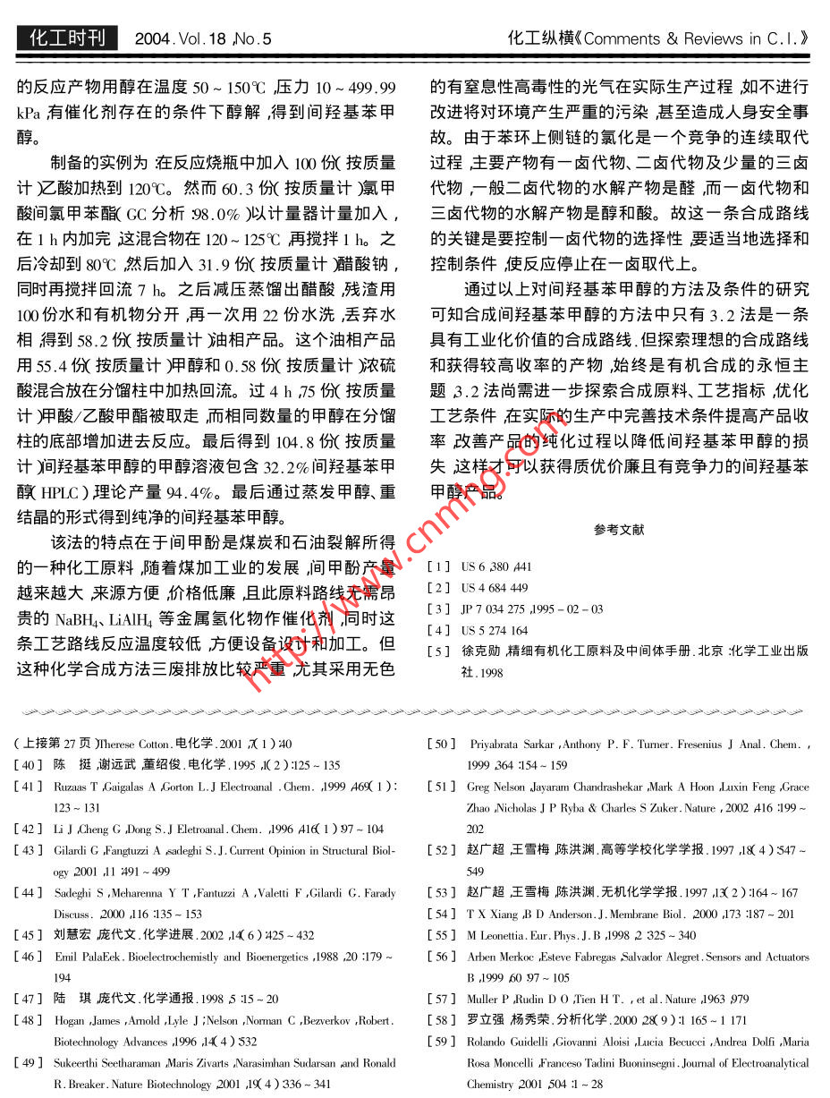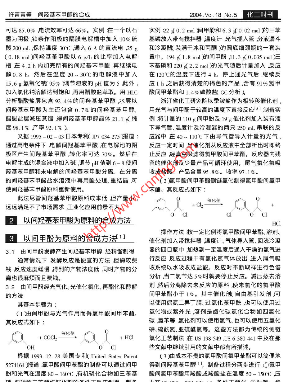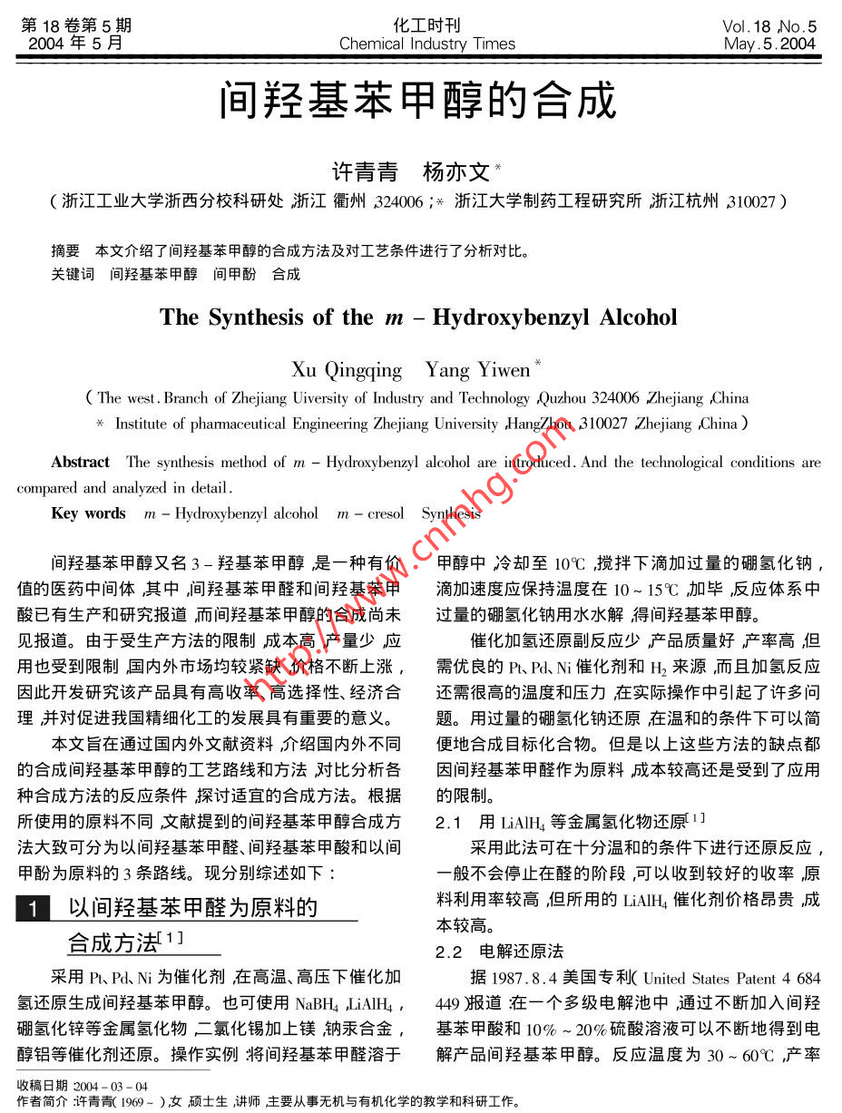 第18卷第5期化工時(shí)刊Vol. 18 ,No.52004年5月Chemical Industry TimesMay .5.2004間羥基苯甲醇的合成許青青楊亦文*(浙江工業(yè)大學(xué)浙西分??蒲刑幷憬橹?24006 ;*浙江大學(xué)制藥工程研究所浙江杭州310027 )摘要本文介紹了 間羥基苯甲醇的合成方法及對(duì)工藝條件進(jìn)行了分析對(duì)比。關(guān)鍵詞間羥基苯甲醇 間甲酚 合成The Synthesis of the m一Hydroxybenzyl AlcoholXu Qingqing Yang Yiwen( The west. Branch of Zhejiang Uiversity of Industry and Technology Quzhou 324006 ,Zhejiang China* Institute of pharmaceutical Engineering Zhejiang University ,HangZhou 310027 Zhejiang ,China )Abstract The synthesis method of m - Hydroxybenzyl alcohol are introduced. And the technological conditions arecompared and analyzed in detail.Key words m - Hydroxybenzyl alcohol m - cresol Synthesis間羥基苯甲醇又名3-羥基苯甲醇是一種有價(jià)甲醇中冷卻至10C攪拌下滴加過量的硼氫化鈉,值的醫(yī)藥中間體其中間羥基苯甲醛和間羥基苯甲滴加速度應(yīng)保持溫度在10~ 15C加畢,反應(yīng)體系中酸已有生產(chǎn)和研究報(bào)道而間羥基苯甲醇的合成尚未過量的硼氫化鈉用水水解得間羥基苯甲醇。見報(bào)道。由于受生產(chǎn)方法的限制成本高產(chǎn)量少應(yīng)催化加氫還原副反應(yīng)少產(chǎn)品質(zhì)量好產(chǎn)率高,但用也受到限制國(guó)內(nèi)外市場(chǎng)均較緊缺價(jià)格不斷上漲,需優(yōu)良的Pr、Pd. Ni催化劑和H2來源,而且加氫反應(yīng)因此開發(fā)研究該產(chǎn)品具有高收率、高選擇性、經(jīng)濟(jì)合還需很高的溫度和壓力在實(shí)際操作中引起了許多問理并對(duì)促進(jìn)我國(guó)精細(xì)化工的發(fā)展具有重要的意義。題。用過量的硼氫化鈉還原在溫和的條件下可以簡(jiǎn)本文旨在通過國(guó)內(nèi)外文獻(xiàn)資料介紹國(guó)內(nèi)外不同便地合成目標(biāo)化合物。但是以上這些方法的缺點(diǎn)都的合成間羥基苯甲醇的工藝路線和方法對(duì)比分析各因間羥基苯甲醛作為原料成本較高還是受到了應(yīng)用種合成方法的反應(yīng)條件探討適宜的合成方法。根據(jù)的限制。所使用的原料不同,文獻(xiàn)提到的間羥基苯甲醇合成方2.1用LiAlH4等金屬氫化物還原1]法大致可分為以間羥基苯甲醛、間羥基苯甲酸和以間采用此法可在十分溫和的條件下進(jìn)行還原反應(yīng),甲酚為原料的3條路線?,F(xiàn)分別綜述如下:一般不會(huì)停止在醛的階段,可以收到較好的收率原1|以間羥基苯甲醛為原料的料利用率較高但所用的LiAIH4 催化劑價(jià)格昂貴,成本較高。合成方法[1]2.2 電解還原法采用PI.Pd、Ni為催化劑,在高溫、高壓下催化加據(jù)1987. 8.4美國(guó)專利( United States Patent 4 684氫還原生成間羥基苯甲醇。也可使用NaBH4 LiAlH4,449 )報(bào)道:在一個(gè)多級(jí)電解池中通過不斷加入間羥硼氫化鋅等金屬氫化物二氯化錫加上鎂鈉汞合金,基苯甲酸和10%~20%硫酸溶液可以不斷地得到電醇鋁等催化劑還原。操作實(shí)例將間羥基苯甲醛溶于解產(chǎn)品間羥基苯甲醇。反應(yīng)溫度為30~ 60C ,產(chǎn)率收稿日期2004- 03-04作者簡(jiǎn)介許青青( 1969~ )女碩士生,講師主要從事無機(jī)與有機(jī)化學(xué)的教學(xué)和科研工作。--28-許青青等間羥基苯甲醇的合成2004.Vol.18 ,.No. 5化工時(shí)刊可達(dá)85.0%電流效率可達(dá)66%。實(shí)例:在-個(gè)以石實(shí)例22 ( 0.2 mol間甲酚和6.3 (0.02 mol的三苯墨為陰極,鉑條作陽極的隔膜電解槽中加入10%硫基磷放入帶有攪拌器溫度計(jì)光氣插入管分液漏斗酸200mL,保持溫度30C通入6A的直流電.25g和冷凝器(裝滿干冰和丙酮)的圓底細(xì)頸瓶的一套裝(0.18 mol )間羥基苯甲酸以6 g/h的比率加入電解置中。194《1.8 mol )的間甲酚,11.3 ( 0.035 mol )三槽在4.2h內(nèi)加完所有的間羥基苯甲酸再繼續(xù)電苯基磷和220 62.2 mol )的光氣隨后計(jì)量加入反應(yīng)解0.8 h。然后在溫度20~ 30°C的電解液中加入在120%C的溫度下進(jìn)行4 ho停止通光氣后,繼續(xù)反15. 6g氫氧化鈉( 95% )調(diào)節(jié)溶液的pH值為5此外,應(yīng)1 h ,之后獲得清楚的褐色的產(chǎn)品,含有91%氯甲.加入氯化鈉溶解達(dá)到飽和再用醋酸鹽萃取。用HLC酸間甲苯酯和1.4%碳酸鹽(GC分析)分析醋酸鹽層包含92. 4%的間羥基苯甲醇,水層以浙江省化工研究院以季銨鹽作為相轉(zhuǎn)移催化劑,間羥基苯甲酸為主還包含0.7%的間羥基苯甲醇。用光氣與間甲酚于較高的溫度下直接反應(yīng)5]制備實(shí)醋酸鹽層減壓蒸餾得間羥基苯甲醇晶體21.1 (純例將計(jì)量的110 g間甲酚及19 g催化劑加入裝有液度98.1%產(chǎn)率92.1% )下導(dǎo)氣管、溫度計(jì)及冷凝器的兩只250 mL串聯(lián)的反又據(jù)1995-02-03日本專秋JP7 034 275 )報(bào)道:應(yīng)器中在40~ 110C下由導(dǎo)氣管導(dǎo)入計(jì)量的光氣,通過高電條件下,電解間羥基苯甲酸,在電解池的陰反應(yīng)一定時(shí)間,當(dāng)催化劑從反應(yīng)液中全部析出時(shí)即終極區(qū)產(chǎn)生間羥基苯甲醇,轉(zhuǎn)化率可達(dá)70%。然后在止反應(yīng)經(jīng)真空吸濾得氯甲酸間甲苯酯。反應(yīng)器內(nèi)殘電解生成的混合液中加入堿,調(diào)節(jié)pH值到6~8使間留的催化劑及少量產(chǎn)品可循環(huán)使用。尾氣氯化氫吸羥基苯甲醇和未電解的間羥基苯甲酸分離。在分離收成鹽酸。產(chǎn)品含量95.8%。收率97.1%。的間羥基苯甲酸鹽水溶液中再用酸處理