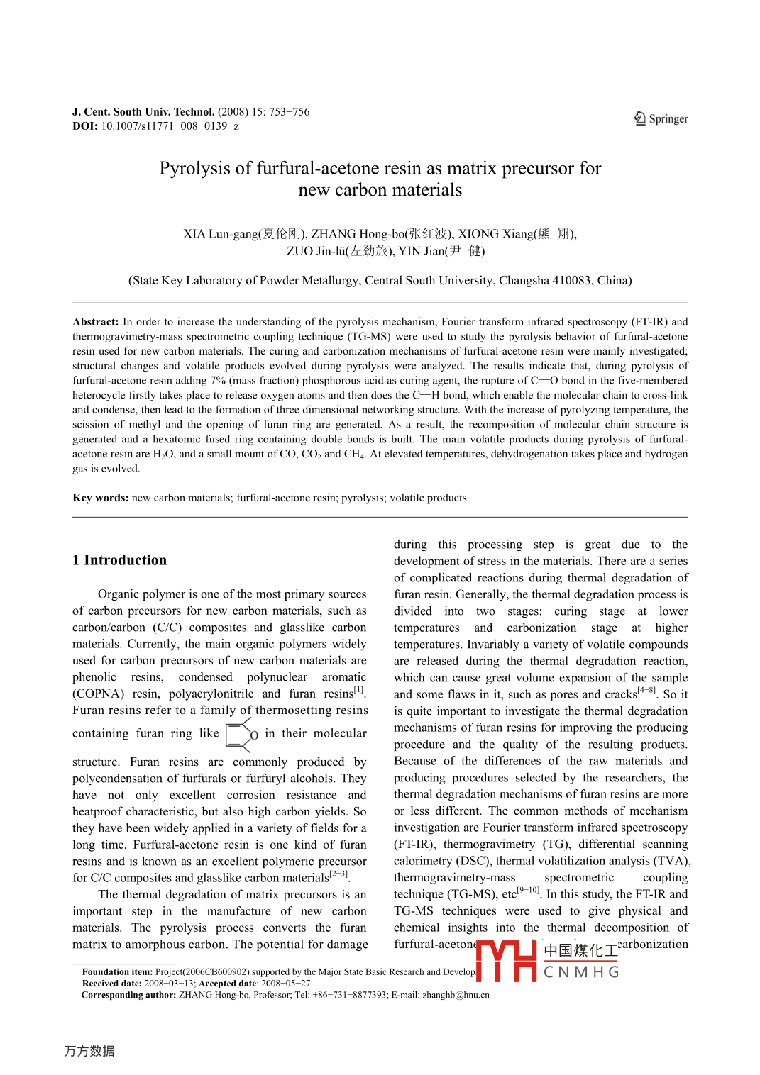 J. Cent. South Univ. Technol. (2008) 15: 753-756包SpringerDOI: 10.1007/s11771-008-0139- zPyrolysis of furfural- acetone resin as matrix precursor fornew carbon materialsXIA Lun-gang(夏倫剛),ZHANG Hong-bo(張紅波), XI0NG Xiang(熊翔),ZUO Jjin-li(左勁旅), YIN Jian(尹健)(State Key Laboratory of Powder Metallurgy, Central South University, Changsha 410083, China)Abstract: In order to increase the understanding of the pyrolysis mechanism, Fourier transform infrared spectroscopy (FT-IR) andthermogravimetry-mass spectrometric coupling technique (TG-MS) were used to study the pyrolysis behavior of furfural-acetoneresin used for new carbon materials. The curing and carbonization mechanisms of furfural-acetone resin were mainly investigated;structural changes and volatile products evolved during pyrolysis were analyzed. The results indicate that, during pyrolysis offurfural-acetone resin adding 7% (mass fraction) phosphorous acid as curing agent, the rupture ofC- O bond in the five -memberedheterocycle firstly takes place to release oxygen atoms and then does the C- H bond, which enable the molecular chain to cross-linkand condense, then lead to the formation of three dimensional networking structure. With the increase of pyrolyzing temperature, thescission of methyl and the opening of furan ring are generated. As a result, the recomposition of molecular chain structure isgenerated and a hexatomic fused ring containing double bonds is built. The main volatile products during pyrolysis of furfural-acetone resin are H2O, and a small mount of CO, CO2 and CH4 At elevated temperatures, dehydrogenation takes place and hydrogengas is evolved.Key words: new carbon materials; furfural-acetone resin; pyrolysis; volatile productsduring this processing step is great due to the1 Introductionof complicated reactions during thermal degradation ofOrganic polymer is one of the most primary sourcesfuran resin. Generally, the thermal degradation process isof carbon precursors for new carbon materials, such asdivided into two stages: curing stage at lowercarbon/carbon (C/C) composites and glasslike carbontemperatures and carbonization stage at highermaterials. Currently, the main organic polymers widelytemperatures. Invariably a variety of volatile compoundsused for carbon precursors of new carbon materials arare released during the thermal degradation reaction,phenolic resins, condensed polynuclear aromaticwhich can cause great volume expansion of the sample(COPNA) resin, polyacrylonitrile and furan resinsl".and some flaws in it, such as pores and cracks4-84. So itFuran resins refer to a family of thermosetting resinsis quite important to investigate the thermal degradationcontaining furan ring likeo in their molecularmechanisms of furan resins for improving the producingprocedure and the quality of the resulting products.structure. Furan resins are commonly produced bBecause of the differences of the raw materials andpolycondensation of furfurals or furfuryl alcohols. The;producing procedures selected by the researchers, thehave not only excellent corrosion resistance andthermal degradation mechanisms of furan resins are moreheatproof characteristic, but also high carbon yields. Soor less different. The common methods of mechanismthey have been widely applied in a variety of fields for ainvestigation are Fourier transform infrared spectroscopylong time. Furfural-acetone resin is one kind of furan(FT-IR), thermogravimetry (TG), differential scanningresins and is known as an excellent polymeric precursorcalorimetry (DSC), thermal volatilization analysis (TVA),for C/C composites and glasslike carbon materials2-” .thermogravimetry-massspectrometriccouplingThe thermal degradation of matrix precursors is antechnique (TG-MS), eteIn this study, the FT-IR andimportant step in the manufacture of new carbonTG-MS techniques were used to give physical andmaterials. The pyrolysis process converts the furanchemical insights into the thermal decomposition ofmatrix to amorphous carbon. The potential for damagefufural-aceton中國煤化工carbonizationFoundation item: Prjca(2006CB600902) supported by the Major State Basic Research and DevelopMHCNMH GReeived date: 2008 -03-13; Accepted date: 2008 -05- -27Corresponding author: ZHANG Hong-bo, Professor Tel: +86- -731- -877393; E-mail: zhanghb@hnu.cn.754J. Cent. South Univ. Technol. (2008) 15: 753 -756mechanisms were primarily revealed.polymers with aromatic rings and some kinds ofreactions are able to take place. But they are more active2 Experimentalthan aromatic compounds because the participation o1one pair electrons in the conjugate system of2.1 Raw materials and sample preparationfive-membered heterocycles enables the lone paiFA-2 furfural-acetone resin was provided byelectrons to flow to the carbon atoms easily, whichChangshu Duwei Chemical Plant, China. It wasmakes them more active in electrophilic substitutionproduced by equal mole ratio of furfural to acetone usingreactions than aromatic compounds. That is to say, the .alkali as catalyzer. The viscosity (25 °C) was 40- -150hydrogen atoms are vulnerable to be substituted or tomPa/s; water content was≤1% and grey yield was≤escape. Therefore, in the same heating condition the3%. The curing agent was industrial phosphorous acidspeeds of curing and carbonization of furan resins arewith concentration of≥85%.always faster than those of other resins with aromaticThe curing agent was added and the mixture wasrings".stirreor 10 min in order to yield ahomogeneousThe FT-IR spectrum of virgin furfural -acetone resinmixture. The mixture held in a graphite pot was put in anis shown in Fig.1. The FT-IR spectra of cured andoven and cured stepwise at 90 C for 2h, then at 120 Ccarbonized samples are shown in Fig.2. According tofor4h, and at 180 °C for 2 h in the end. The apparentlyRefs.[12- 15], the peaks in the spectra can be assignedcompact and hard cured bulk sample was obtained.and listed in Table 1. Compared with the I