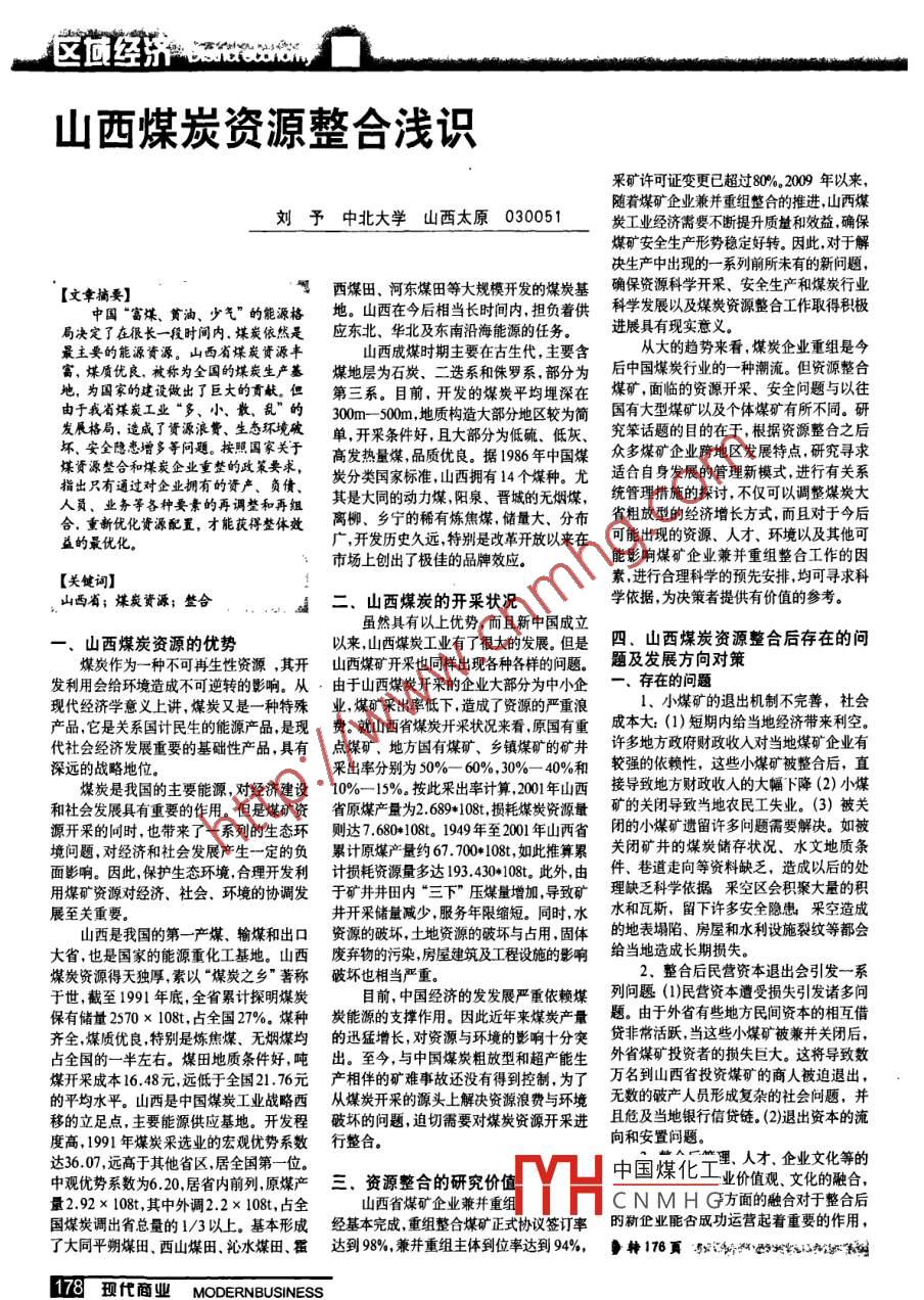 ,這位經(jīng)濟 cmewim (山西煤炭資源整合淺識采礦許可證變更已超過80%。2009年以來,劉予中北大學(xué)山西太原 030051隨著煤礦企業(yè)兼并重組整合的推進(jìn),山西煤炭工業(yè)經(jīng)濟需要不斷提升質(zhì)量和效益,確保煤礦安全生產(chǎn)形勢穩(wěn)定好轉(zhuǎn)。因此,對于解決生產(chǎn)中出現(xiàn)的-系列前所未有的新問題,[文章摘要]西煤田、河?xùn)|煤田等大規(guī)模開發(fā)的煤炭基確保資源科學(xué)開采、安全生產(chǎn)和煤炭行業(yè)中國“富煤、貧油、少氣”的能源格地。山西在今后相當(dāng)長時間內(nèi),擔(dān)負(fù)著供科學(xué)發(fā)展以及煤炭資源整合工作取得積極局決定了在很長一段時間內(nèi),煤炭依然是應(yīng)東北、華北及東南沿海能源的任務(wù)。進(jìn)展具有現(xiàn)實意義。最主要的能源資源。山西省煤炭資源豐山西成煤時期主要在古生代,主要含從大的趨勢來看,煤炭企業(yè)重組是今富,煤質(zhì)優(yōu)良,被稱為全國的煤炭生產(chǎn)基煤地層為石炭、二迭系和侏羅系,部分為后中國煤炭行業(yè)的 一種潮流。但資源整合地,為國家的建設(shè)做出了巨大的貢獻(xiàn)。但第三系。目前,開發(fā)的煤炭平均埋深在煤礦 ,面臨的資源開采、安全問題與以往由于我省煤炭工業(yè)“多、小、散、亂”的300m 50m,地質(zhì)構(gòu)造大部分地區(qū)較為簡 國有大型煤礦以及個體煤礦有所不同。 研發(fā)展格局,造成了資源浪費、生態(tài)環(huán)境破單,開采條件好,且大部分為低硫、低灰、兗笨話題的目的在于, 根據(jù)資源整合之后壞安全隱患增多等問題。按照國家關(guān)于高發(fā)熱量煤,品質(zhì)優(yōu)良。據(jù)1986年中國煤眾多煤礦 企業(yè)跨地區(qū)發(fā)展特點,研究尋求煤資源整合和煤炭企業(yè)重整的政策要求,炭分類國家標(biāo)準(zhǔn),山西擁有14個煤種。尤適合自身發(fā)展的管理新模式, 進(jìn)行有關(guān)系指出只有通過對企業(yè)擁有的資產(chǎn)、負(fù)債、人員、業(yè)務(wù)等各種要素的再調(diào)整和再組其是大同的動力煤,陽泉、晉城的無煙煤,統(tǒng)管理措施的探討,不僅可以調(diào)整煤炭大合,重新優(yōu)化資源配置,才能獲得整體效離柳、鄉(xiāng)寧的稀有煉焦煤, 儲量大、分布省租放型的經(jīng)濟增 長方式,而且對于今后益的最優(yōu)化。廣,開發(fā)歷史久遠(yuǎn),特別是改革開放以來在可能出現(xiàn)的資源、人才環(huán)境以及其他可市場上創(chuàng)出了極佳的品牌效應(yīng)。能影響煤礦企業(yè)兼并重組整合工作的因[關(guān)鍵詞]素,進(jìn)行合理科學(xué)的預(yù)先安排.均可尋求科西省;煤炭資源;整合二、山西煤炭的開采狀況學(xué)依據(jù),為決策者提供有價值的參考。雖然具有以上優(yōu)勢,而且新中國成立一.山西煤炭資源的優(yōu)勢以來,山西煤炭工業(yè)有了很大的發(fā)展。但是四、山西煤炭資源整合后存在的問煤炭作為一種不可再生性資源,其開山西煤礦開采也同樣出現(xiàn)各種各樣的問題。題及發(fā)展方向?qū)Σ甙l(fā)利用會給環(huán)境造成不可逆轉(zhuǎn)的影響。從由于山西煤炭開采的企業(yè)大部分為中小企-.存在的問題1.小煤礦的退出機制不完善,社會現(xiàn)代經(jīng)濟學(xué)意義上講,煤炭又是一種特殊業(yè),煤礦采出率低下,造成了資源的嚴(yán)重浪產(chǎn)品,它是關(guān)系國計民生的能源產(chǎn)品,是現(xiàn)費。 就山西省煤炭開采狀況來看,原國有重成本大: (1)短期內(nèi)給當(dāng)?shù)亟?jīng)濟帶來利空。代社:會經(jīng)濟發(fā)展重要的基礎(chǔ)性產(chǎn)品,具有點煤礦,地方國有煤礦、鄉(xiāng)鎮(zhèn)煤礦的礦井許多地方政府財政收人對當(dāng)?shù)孛旱V企業(yè)有深遠(yuǎn)的戰(zhàn)略地位。采出率分別為50%- 60% ,30%- 40%和較強的依賴性,這些小煤礦被整合后,直煤炭是我國的主要能源,對經(jīng)濟建設(shè)10%-15%。按此采出率計算.2001年山西接導(dǎo)致地方財政收人的大幅下降(2) 小煤和社會發(fā)展具有重要的作用。但是煤礦資省原煤產(chǎn)量為2.689108,損耗煤炭資源量礦的關(guān)閉導(dǎo)致當(dāng)?shù)剞r(nóng)民工失業(yè)。 (3)被關(guān)源開采的同時,也帶來了一系列的生態(tài)環(huán)則達(dá) 7.680*108t.1949 年至2001年山西省閉的小煤礦遺留許多問題需要解決。如被境問題,對經(jīng)濟和社會發(fā)展產(chǎn)生一定的負(fù)累計原煤產(chǎn)量約67.700*108t,如此推算累關(guān)閉礦井的煤炭儲存狀況、水文地質(zhì)條面影響。因此,保護(hù)生態(tài)環(huán)境,合理開發(fā)利計損耗資源量多達(dá)193.430*108t.此外,由件.巷道走向等資料缺乏,造成以后的處用煤礦資源對經(jīng)濟、社會.環(huán)境的協(xié)調(diào)發(fā)于礦 井井田內(nèi)“三下”壓煤量增加,導(dǎo)致礦理缺乏科學(xué)依據(jù)采空區(qū)會 積聚大量的積展至關(guān)重要。井開采儲量減少,服務(wù)年限縮短。同時,水水和瓦斯, 留下許多安全隱患采空造成山西是我國的第一產(chǎn)煤、輸煤和出口資源的破壞,土地資源的破壞與占用,固體的地表塌陷、 房屋和水利設(shè)施裂紋等都會大省,也是國家的能源重化工基地。山西廢棄物的污染,房屋建筑及工程設(shè)施的影響給當(dāng)?shù)卦斐?長期損失。煤炭資源得天獨厚,素以“煤炭之鄉(xiāng)”著稱破壞也相當(dāng)嚴(
