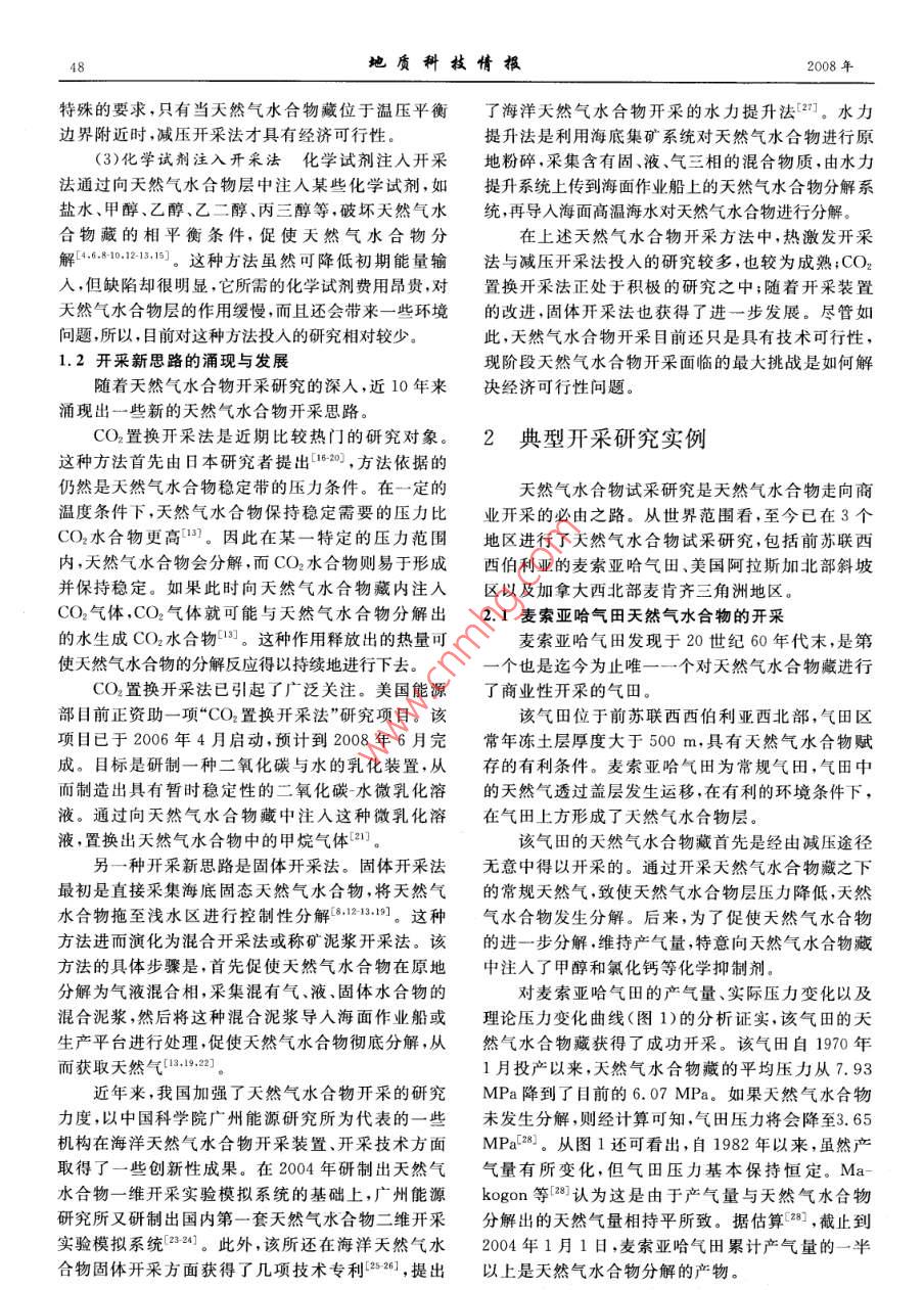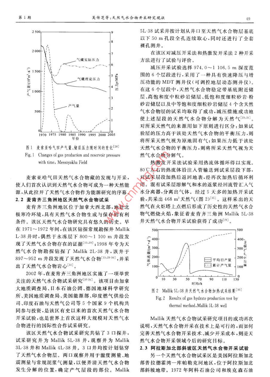 第27卷第1期地質(zhì)科技情報(bào)Vol.27 No.1Geological Science and Technology InformationJan.2008天然氣水合物開采研究現(xiàn)狀吳傳芝' ,趙克斌' ,孫長(zhǎng)青',孫冬勝“,徐旭輝2 ,陳昕華”,宣玲(1.中國(guó)石油化工股份有限公司石油勘探開發(fā)研究院無(wú)錫石油地質(zhì)研究所.江蘇無(wú)錫214151;2.中國(guó)石油化工股份有限公司石油勘探開發(fā)研究院,北京10083;3.中國(guó)石油化工股份有限公司石油勘探開發(fā)研究院西部分院,烏魯木齊830011)摘要:隨著天然氣水合物基礎(chǔ)研究的不斷深入,天然氣水合物開采研究空前活躍。在技術(shù)方法方面,傳統(tǒng)的熱激發(fā)開采法、減壓開采法與化學(xué)抑制制注入開采法獲得了不斷的發(fā)展與改進(jìn);新型開采技術(shù)如CO2置換法與固體開采法引起了學(xué)者們的極大關(guān)注;最近我國(guó)還研制出適合于海洋天然氣水合物開采的水力提升法。在開采研究實(shí)踐方面,全世界已在3處東土區(qū)進(jìn)行了天然氣水合物試采研究。介紹了天然氣水合物開采技術(shù)的研究進(jìn)展與凍土區(qū)天然氣水合物試采研究結(jié)果,分析了天然氣水合物開采研究中可能涉及的環(huán)境問(wèn)題,展現(xiàn)了現(xiàn)階段天然氣水合物開采研究領(lǐng)域的最新成果,總結(jié)了這一領(lǐng)域取得的經(jīng)驗(yàn)與認(rèn)識(shí),強(qiáng)調(diào)了國(guó)際天然氣水合物開采研究對(duì)我國(guó)天然氣水合物研究的啟示。關(guān)鍵詞:天然氣水合物;開采技術(shù);開采試驗(yàn);麥索亞哈氣田;Malik地區(qū)中圖分類號(hào):TE31文獻(xiàn)標(biāo)識(shí)碼:A文章編號(hào):000-7849(200801 0047-06天然氣水合物具有巨大的資源潛能,但只有解人開采法(-15)。隨著天然氣水合物基礎(chǔ)研究的不斷決了其開采問(wèn)題,天然氣水合物才能成為一種真正深入,近些年又涌現(xiàn)出一些新的開采技術(shù),如CO2置的能源。近10年來(lái),對(duì)天然氣水合物研究起步較早換法與固體開采法等81213.1620。的一些國(guó)家,明顯加速了天然氣水合物開采研究的1.1傳統(tǒng)開采方法的改進(jìn)與技術(shù)缺陷步伐,在開采技術(shù)、開采工藝、開采面臨的環(huán)境問(wèn)題(1)熱激發(fā)開采法熱激發(fā)開采法是直接對(duì)天等方面做了大量工作,并在凍土區(qū)進(jìn)行了天然氣水然氣水合物層進(jìn)行加熱,使天然氣水合物層的溫度合物開采試驗(yàn)。超過(guò)其平衡溫度,從而促使天然氣水合物分解為水我國(guó)近年來(lái)也已介人天然氣水合物開采研究領(lǐng)與天然氣的開采方法。這種方法經(jīng)歷了直接向天然域,但總體上,國(guó)內(nèi)天然氣水合物開采研究才剛剛開氣水合物層中注人熱流體加熱、火驅(qū)法加熱、井下電始,尚沒有進(jìn)行試采研究。筆者擬介紹天然氣水合物開采技術(shù)的發(fā)展、試磁加熱以及微波加熱等發(fā)展歷程(46.815]。熱激發(fā)開采研究結(jié)果與開采涉及的環(huán)境問(wèn)題等內(nèi)容,展現(xiàn)現(xiàn)采法可實(shí)現(xiàn)循環(huán)注熱,且作用方式較快。加熱方式的階段世界天然氣水合物開采研究領(lǐng)域的最新成果,不斷改進(jìn),促進(jìn)了熱激發(fā)開采法的發(fā)展。但這種方法總結(jié)這一研究領(lǐng)域已取得的經(jīng)驗(yàn)與認(rèn)識(shí),強(qiáng)調(diào)國(guó)際:至今尚未很好地解決熱利用效率較低的問(wèn)題,而且只天然氣水合物開采研究對(duì)我國(guó)天然氣水合物開采研能進(jìn)行局部加熱,因此該方法尚有待進(jìn)一-步完善。(2)減壓開采法減壓開采法是一種通 過(guò)降低究的啟示。壓力促使天然氣水合物分解的開采方法。減壓途徑;1開采方法的改進(jìn)與發(fā)展主要有兩種:①采用低密度泥漿鉆井達(dá)到減壓目的;②當(dāng)天然氣水合物層下方存在游離氣或其他流體天然氣水合物是一種由天然氣和水組成的亞穩(wěn)時(shí),通過(guò)泵出天然氣水合物層下方的游離氣或其他定態(tài)礦物,存在于特定的溫壓條件下。一旦賦存條流體來(lái)降低天然氣水合物層的壓19681012-1。件發(fā)生變化,天然氣水合物藏的相平衡就會(huì)被破壞,減壓開采法不需要連續(xù)激發(fā),成本較低,適合大面積引起天然氣水合物分解。傳統(tǒng)的天然氣水合物開采開采,尤其適用于存在下伏游離氣層的天然氣水合技術(shù)就是根據(jù)天然氣水合物的這種性質(zhì)而設(shè)計(jì)的,物藏的開采,是天然氣水合物傳統(tǒng)開采方法中最有主要包括熱激發(fā)開采法、減壓開采法與化學(xué)試劑注前景的一種技術(shù)。但它對(duì)天然氣水合物藏的性質(zhì)有收稿日期:2007-04 28編輯:禹華珍基金項(xiàng)目:中國(guó)石油化工股份有限公司項(xiàng)目“天然氣水合物勘探與開發(fā)現(xiàn)狀調(diào)研"(P05072)48地質(zhì)科技情報(bào)2008年特殊的要求,只有當(dāng)天然氣水合物藏位于溫壓平衡了海洋天然氣水合物開采的水力提升法([21]。水力邊界附近時(shí),減壓開采法才具有經(jīng)濟(jì)可行性。提升法是利用海底集礦系統(tǒng)對(duì)天然氣水合物進(jìn)行原(3)化學(xué)試劑注入開采法化學(xué)試劑注入開采地粉碎,采集含有固、液、氣三相的混合物質(zhì),由水力法通過(guò)向天然氣水合物層中注人某些化學(xué)試劑,如提升系統(tǒng)上傳到海面作業(yè)船