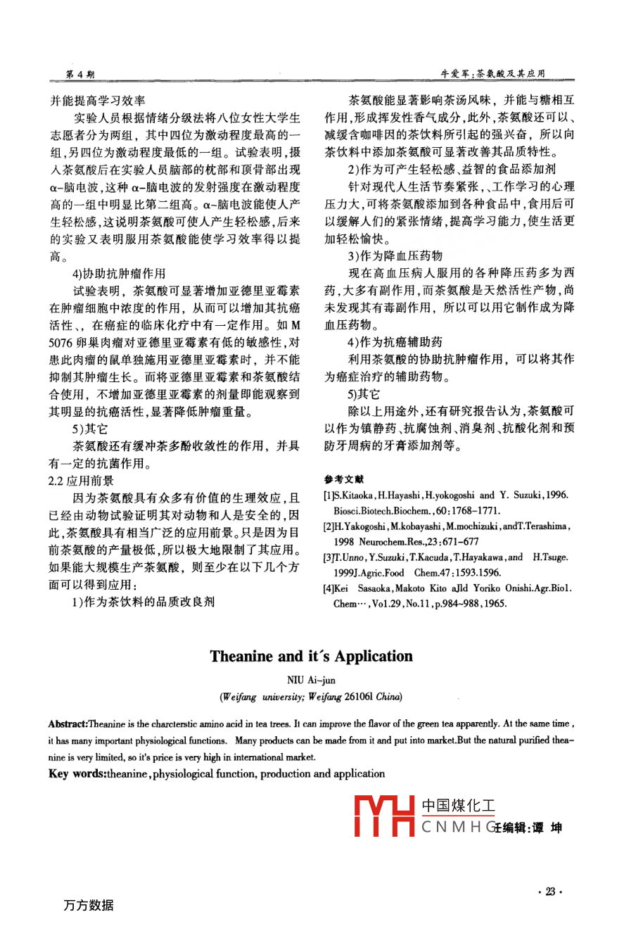 第4卷第4期濰坊學院學報Vol 4 No 42004年7月Joumal of Weifang universityJul.2004茶氨酸及其應用牛愛軍(濰坊學院生物系,山東濰坊261061)摘要:茶氨酸是茶樹中的特有氨基酸,可顯著改善綠茶茶湯的風味,并且具有多種重要的生理作用??捎善溟_發(fā)出各種相應的產(chǎn)品投放市場。但因天然純品產(chǎn)量有限,所以國際市場價格很高。關鍵詞:茶氨酸;生理作用;生產(chǎn)應用中圖分類號:Q9499文獻標識碼:A文章編號:1671-4288(2004)04-0022021茶氨酸的概況乙胺,而乙胺又可被繼續(xù)分解。當光照強度增大茶氨酸( THeanine)是1950年日本學者酒戶彌時,茶氨酸的分解代謝就會增強,分解后的碳骨架二郎首次從綠茶中分離得到并命名的,其正規(guī)化會參與多酚類和其他物質的合成,造成氨基酸含學名稱為N-乙基-□-L-谷酰胺,在茶樹鮮葉中量下降,茶葉品質劣化。反之,遮光可以提高鮮葉的含量約占茶樹中25種氨基酸總量的60-70%。中茶氨酸的含量茶氨酸在茶葉中的含量與綠茶品質呈正比關系,14茶氨酸的分析測定與提取純化相關系數(shù)達0787-0.876,是茶葉鮮爽味的主要來茶氨酸的提取純化方法有堿式碳酸銅沉淀源,被認為是決定綠茶滋味的主要生化成分之一。法、色譜分離提純法和離子交換法等。己知的分析11茶氨酸的分布測定方法有多種,包括紙層析法、強酸性陰離子交茶氨酸是茶樹的特有氨基酸除茶樹外僅在換樹脂層析法、茚三酮顯色的薄層層析法氣相色茶梅、紅山茶、油茶及低等植物一蕈中有極少的含譜法、高效液相色譜法,和氨基酸分析儀分析法量,在其它植物中尚未發(fā)現(xiàn)其存在。茶氨酸在茶樹等。體內(nèi)各部分都存在,尤以側根、綠莖及新芽中含量2茶氨酸的生理效應和應用前景較高。2.1生理效應12茶氨酸的理化性質茶氨酸具有多種生理和藥理作用,具有極高茶氨酸屬于酰胺類化合物,天然構型為L型,的經(jīng)濟價值。其主要生理效應有純品為無色針狀結晶,熔點為217-218℃,回]p=+1)通過活化多巴胺能神經(jīng)無降低血壓71,具有很強的茚三酮反應,可用醋酸汞和碳酸據(jù)報道,高劑量的茶氨酸能使患自發(fā)性高血鈉沉淀,易與堿式碳酸銅生成淺紫色柱狀銅鹽,其壓的大鼠的血壓顯著降低。試驗表明,當給大鼠投銅鹽熔點為272-273℃。遇強酸可水解生成L谷喂茶氨酸后,由于多巴胺能神經(jīng)元的活化,能促使氮酸和乙胺。極易溶于水而不溶于無水乙醇和乙大鼠腦中色氨酸和兒茶酚胺含量水平顯著增加,醚,其水溶液呈微酸性,有淡的鮮爽味。5-羥色胺和5-羥色氨酸含量減少,而5-羥色胺13茶氨酸的代謝和5-羥色胺酸濃度的降低可導致血壓下降,所以研究表明,茶氨酸在動物和人腸刷狀緣細胞茶氨酸可間接引起大鼠血壓的降低膜上與鈉離子共轉運而被吸收進入血液,并可再2)抵消由咖啡堿引起的興奮作用經(jīng)由、血腦屏障中偏嗜亮氨酸的轉運體系進入大用大鼠進行的飼喂試驗表明,茶氨酸可通過腦,在腎中完成代謝。釋放去甲腎上腺素,降低腦中這種神經(jīng)遞質的水而在茶樹體內(nèi),茶氨酸的水解主要由茶氨酸,使興奮程度下降從而抵消咖啡堿對中樞神經(jīng)水解酶和谷氨酰胺酶催化,被分解形成谷氨酸和系中國煤化松鎮(zhèn)靜的感覺。CNMHG收稿日期:2004-01-20作者簡介:牛愛軍(1974),男,山東德州人,濰坊學院生物系講師第4期牛愛軍:茶氨酸及其應用并能提高學習效率茶氨酸能顯著影響茶湯風味,并能與糖相互實驗人員根據(jù)情緒分級法將八位女性大學生作用,形成揮發(fā)性香氣成分,此外,茶氨酸還可以、志愿者分為兩組,其中四位為激動程度最高的一減緩含咖啡因的茶飲料所引起的強興奮,所以向組,另四位為激動程度最低的一組。試驗表明,攝茶飲料中添加茶氨酸可顯著改善其品質特性。入茶氨酸后在實驗人員腦部的枕部和頂骨部出現(xiàn)2)作為可產(chǎn)生輕松感、益智的食品添加劑α-腦電波,這種α-腦電波的發(fā)射強度在激動程度針對現(xiàn)代人生活節(jié)奏緊張,工作學習的心理高的一組中明顯比第二組高。α-腦電波能使人產(chǎn)壓力大,可將茶氨酸添加到各種食品中,食用后可生輕松感,這說明茶氨酸可使人產(chǎn)生輕松感,后來以緩解人們的緊張情緒,提高學習能力,使生活更的實驗又表明服用茶氨酸能使學習效率得以提加輕松愉快。高3)作為降血壓藥物4協(xié)助抗腫瘤作用現(xiàn)在高血壓病人服用的各種降壓藥多為西試驗表明,茶氨酸可顯著增加亞德里亞霉素藥,大多有副作用,而茶氨酸是天然活性產(chǎn)物,尚在腫瘤細胞中濃度的作用,從而可以增加其抗癌未發(fā)現(xiàn)其有毒副作用,所以可以用它制作成為降活性、,在癌癥的臨床化療中有一定作用。如M血壓藥物。5076卵巢肉瘤對亞德里亞霉素有低的敏感性,對4)作為抗癌輔助藥患此肉瘤的鼠單獨施用亞德里亞霉素時,并不能利用茶氨酸的協(xié)助抗腫瘤作用,可以將其作抑制其腫瘤生長。而將亞德里亞霉素和茶氨酸結為癌癥治療的輔助藥物。合使用,不增加亞德里亞霉素的劑量即能觀察到5)其它其明顯的抗癌活性,顯著降低腫瘤重量。除以上用途外,還有研究報告認為,茶氨酸可5)其它以作為鎮(zhèn)靜藥、抗腐蝕劑、消臭劑、抗酸化劑和預茶氨酸還有緩沖茶多酚收斂性的作用,并具防牙周病的牙膏添加劑等有一定的抗菌作用。22應用前景參考文獻因為茶氨酸具有眾多有價值的生理效應,且口1 Kitaoka