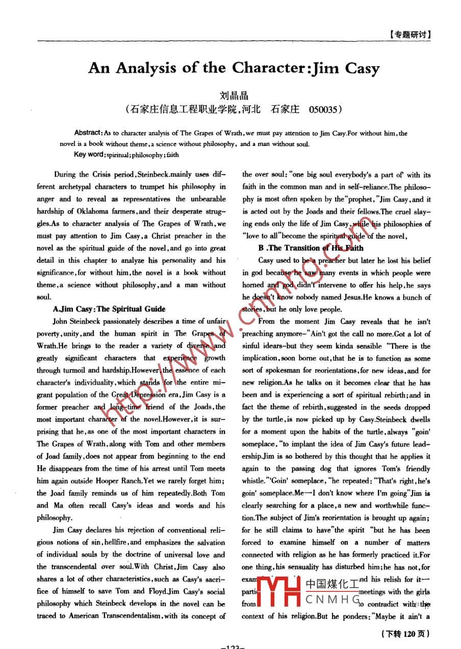 [專題研討] .An Analysis of the Character :Jim Casy劉晶晶(石家莊信息工程職業(yè)學(xué)院,河北石家莊050035)Abstract:As to character analysis of The Grapes of Wrath, we must pay attention to Jim Casy .For without him, thenovel is a book without theme ,2 science without philosophy, and a man without soul.Key wordspinal;philosophy;fithDuring the Crisis period ,Steinbeck.mainly uses dif- the over soul: ‘one big soul everybody's a part of with itsferent archetypal characters to trumpet his philosophy infaith in the common man and in self- reliance.The philoso-anger and to reveal as representatives the unbearablephy is most often spoken by the' "prophet,' "Jim Casy ,and ithardship of Okahoma farmers , and their desperate strug-is acted out by the Joads and their fllowsThe cruel slay-gles.As to character analysis of The Grapes of Wrath,we ing ends only the life of Jim Casy , while his philosophies ofmust pay attention to Jim Casy,a Christ preacher in the"love to ll"become the spiriual guide of the novel,novel as the spiritual guide of the novel,and go into greatB .The Transition of His Faithdetail in this chapter to analyze his personality and hisCasy used to be a preacher but later he lost his beliefsignificance,for without him,the novel is a book withoutin god because he saw many events in which people weretheme,a science without philosophy,and a man withouthorned and god didn't intervene to offer his help,he saysBoul.he doesn't know nobody named Jesus.He knows a bunch ofAJim Casy: The Spiritual Guidestories ,but he only love people.John Steinbeck passionately describes a time of unfairFrom the moment Jim Caay reveals that he isn'tpoverty , unity ,and the human spirit in The Grapes ofpreaching anymore-" Ain't got the call no more.Cot a lot ofWrath.He brings to the reader a variety of diverse ansinful idears- -but they seem kinda sensible "There is thegreatly significant characters that experience growthimplication,soon bome out,that he is to function as somethrough turmoil and hardship.However,the essence of eachsort of spokesman for reorientations ,for new ideas , and forcharacter's individuality , which stands for the entire mi-new religion.As he talks on it becomes clear that he hasgrant population of the Great Depression era,Jim Casy is abeen and is experiencing a sort of spiritual rebirth;and informer preacher and long-time friend of the Joads, thefact the theme of rebith,suggested in the seeds droppedmost important character of the noveL.However,it is sur-by the turtle,is now picked up by Casy .Steinbeck dwellsprising that he,as one of the most important characters infor a moment upon the habits of the turtle , always” goin'The Grapes of Wrath, along with Tom and other memberssomeplace," to implant the idea of Jjim Casy's future lead-of Joad family , does not appear from beginning to the endership.Jim is so bothered by this thought that he applies itHe disappears from the time of his arrest until Tom meetsagain to the passing dog that ignores Tom's friendlyhim again outside Hooper Ranch.Yet we rarely forget him;whistle.' "'Goin' someplace, "he repeated: “That's right,he'sthe Joad family reminds ue of him repeatedly .Both Tomgoin' someplace.Me- -I don't know where I'm going 'Jim isand Ma often ecall Casy's ideas and words and hisclearly searching for a place ,a new and worthwhile func-philosophy.tion.The subject of Jjim's reorientation is brought up again;Jim Casy declares his rejection of conventional reli-for he still claims to have' 'the spirit “but he has beengious notions of sin, hellfire , and emphasizes the salvationforced to examine himself on a number of mattersof individual souls by the doctrine of universal love andconnected with religion as he has formerly practiced itForthe transcendental over soul.With Christ,Jim Casy also one thing, his sensuality has disturbed him;he has not,forshares a lot of other characteristics,such 88 Casy's sacri-xam中國(guó)煤化工nd his relish for it-一fice of himself to save Tom and Floyd.Jjim Casy's social partic-meetings with the ginlsphilosophy which Steinbeck develops in the novel can befromYHc N M H Go cntredict wihthetraced to American Transcendentalism , with its concept ofcontext of his religion.But he ponders: "Maybe it ain't a(下轉(zhuǎn)120頁(yè))-123-[課題成果]經(jīng)合組織和歐盟的主張,遵循以下四個(gè)標(biāo)準(zhǔn):- -是賣方3.推行電子發(fā)票。歐盟對(duì)于電子發(fā)票是這樣定義提供給稅務(wù)機(jī)關(guān)的買方居住國(guó);二是買方使用的銀行信的:是借由電子資料交換將電子發(fā)票由賣方系統(tǒng)傳至買用卡的簽發(fā)國(guó);三是買方稅號(hào)的所在國(guó);四是網(wǎng)絡(luò)服務(wù)方系統(tǒng),在EDI制度中,紙張將被使用電信網(wǎng)絡(luò)轉(zhuǎn)播站供應(yīng)商或網(wǎng)址的物理地點(diǎn)所在國(guó)。而且將來判定消費(fèi)的計(jì)算機(jī)化工作所取代。推行電子發(fā)票,賣方可以根據(jù)地時(shí)可以同時(shí)使用多個(gè)標(biāo)準(zhǔn)。岡相應(yīng)的交易信息采用計(jì)算機(jī)系統(tǒng)自動(dòng)生成發(fā)票,借助3.調(diào)整營(yíng)業(yè)利潤(rùn)與特許權(quán)使用費(fèi)的劃分方法及標(biāo)EDI傳到買方,并自動(dòng)計(jì)人買方賬戶,所有過程無須手準(zhǔn)。結(jié)合前面所述的有關(guān)數(shù)字化商品有償提供的應(yīng)稅工操作。行為類別判別的方法和標(biāo)準(zhǔn),凡是屬于銷售商品和提供由于“以票控稅”的稅收征管指導(dǎo)思想一直沒有改勞務(wù)而取得的所得,應(yīng)被認(rèn)定為經(jīng)營(yíng)利潤(rùn);凡是有償轉(zhuǎn)變,因此,發(fā)票制度是否良好運(yùn)行,對(duì)國(guó)家的稅收收人有讓受法律保護(hù)之工業(yè)產(chǎn)權(quán)的許可使用權(quán)