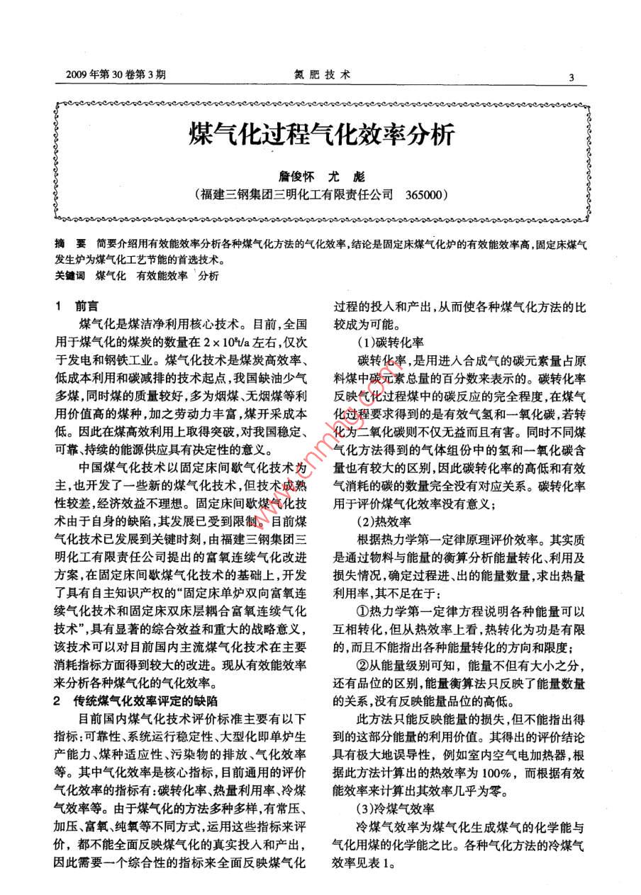 煤氣化過程氣化效率分析