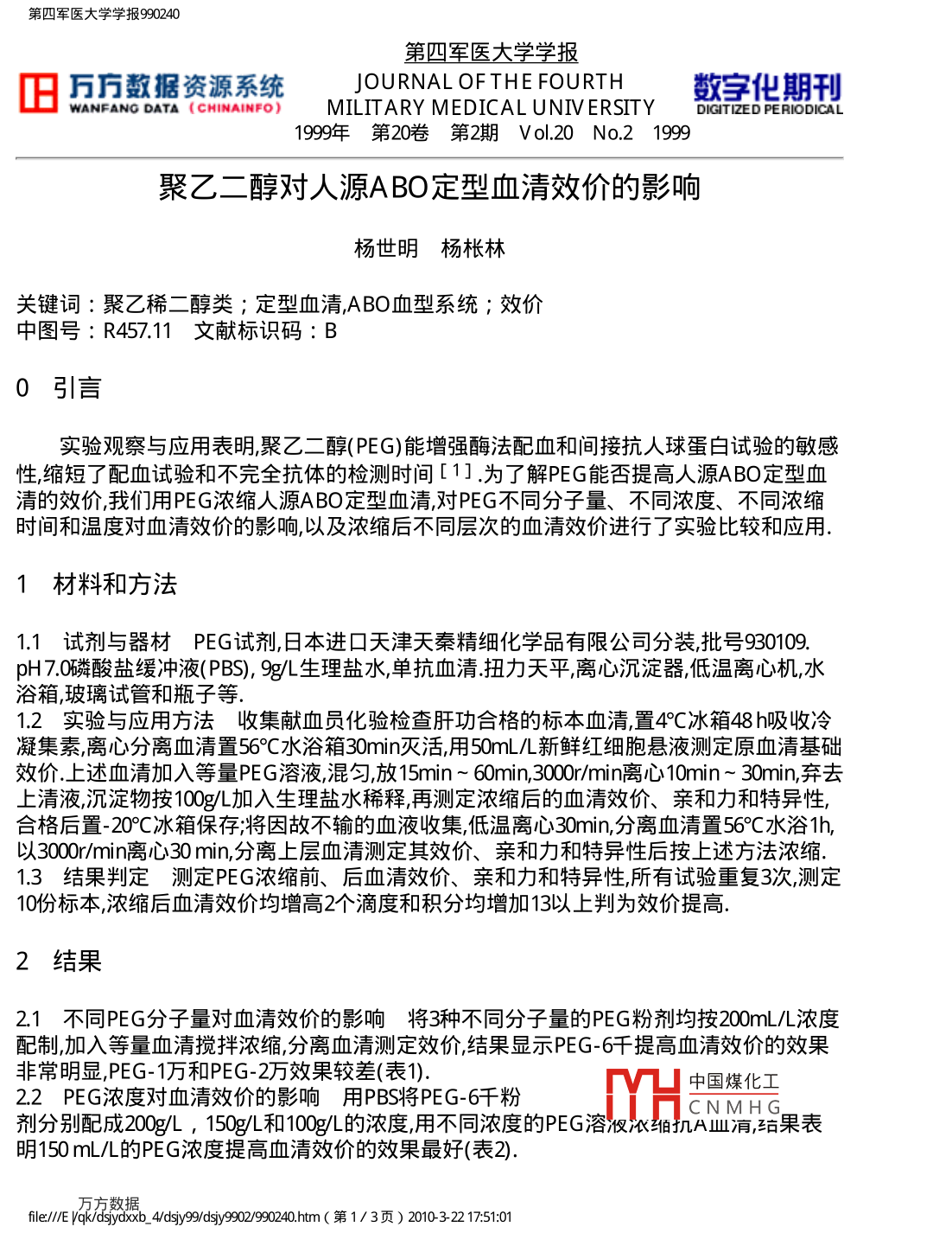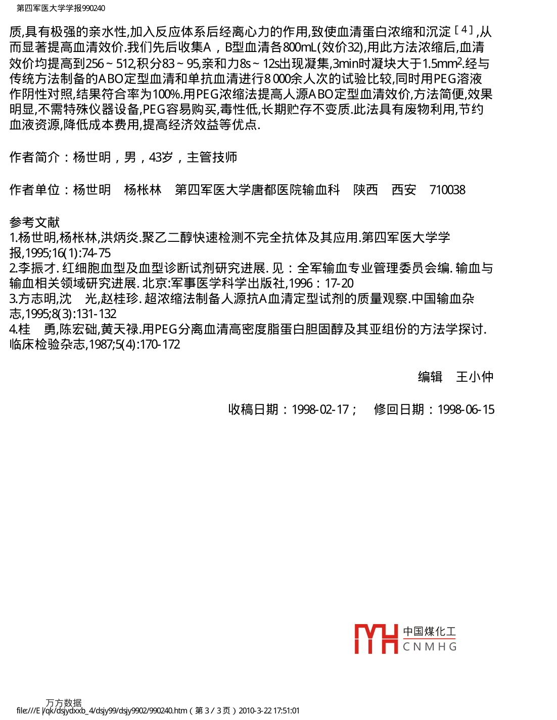 第四軍醫(yī)大學(xué)學(xué)報990240第四軍醫(yī)大學(xué)學(xué)報舊萬冂數(shù)據(jù)資源系統(tǒng)JOURNAL OF THE FOURTH數(shù)穿化期刊WANFANG DATA CHINAINFO)MILITARY MEDICAL UNIVERSITY DIGITIZED PERIODICAL1999年第20卷第2期Vol.20No.21999聚乙二醇對人源ABO定型血清效價的影響楊世明楊棖林關(guān)鍵詞∶聚乙稀二醇類;定型血清ABO血型系統(tǒng);效價中圖號:R457.11文獻(xiàn)標(biāo)識碼:B0引言實(shí)驗(yàn)觀察與應(yīng)用表明聚乙二醇(PG)能增強(qiáng)酶法配血和間接抗人球蛋白試驗(yàn)的敏感性,縮短了配血試驗(yàn)和不完全抗體的檢測時間[1].為了解PEG能否提高人源ABO定型血清的效價我們用PEG濃縮人源ABO定型血清,對PEG不同分子量、不同濃度、不同濃縮時間和溫度對血清效價的影響,以及濃縮后不同層次的血清效價進(jìn)行了實(shí)驗(yàn)比較和應(yīng)用.材料和方法1試劑與器材PEG試劑,日本進(jìn)口天津天秦精細(xì)化學(xué)品有限公司分裝,批號930109pH7.O磷酸鹽緩沖液(PBS),兕八生理鹽水,單抗血清.扭力天平,離心沉淀器,低溫離心機(jī),水浴箱,玻璃試管和瓶子等.1.2實(shí)驗(yàn)與應(yīng)用方法收集獻(xiàn)血員化驗(yàn)檢查肝功合格的標(biāo)本血清,置4°C冰箱48h吸收冷凝集素,離心分離血清置56°C水浴箱30min滅活,用50mL幾新鮮紅細(xì)胞懸液測定原血清基礎(chǔ)效價上述血清加入等量PEG溶液混勻放15mn~60mn,3000mn離心10mn~30mn,棄去上凊液沉淀物按100饑加入生理鹽水稀釋,再測定濃縮后的血清效價、親和力和特異性,合格后置-20°C冰箱保存;將因故不輸?shù)难菏占?低溫離心30min,分離血清置56°C水浴仉,以30o0r/min離心30min分離上層血清測定其效價、親和力和特異性后按上述方法濃縮..3結(jié)果判定測定PG濃縮前、后血清效價、親和力和特異性,所有試驗(yàn)重復(fù)3次,測定10份標(biāo)本濃縮后血清效價均增高2個滴度和積分均增加13以上判為效價提高.2結(jié)果21不同PG分子量對血清效價的影響將3種不同分子量的PEG粉劑均按200mLL濃度配制,加入等量血清攪拌濃縮分離血清測定效價結(jié)果顯示PEG-6千提高血清效價的效果非常明顯,PEG-1萬和PEG-2萬效果較差(表1)22PEG濃度對血清效價的影響用PBS將PEG-6千粉中國煤化工劑分別配成2004,150L和100的濃度用不同濃度的PEG溶閥限細(xì)機(jī)A業(yè)消品果表明150m的PEG濃度提高血清效價的效果最好(表2fle∥/ E Vak/dsiydxxb4/dsy9diy9902/990240hm(第1/3頁)201032217:5101第四軍醫(yī)大學(xué)學(xué)報990240表1不同PEG分子量濃縮前/后效價的比較PEG分子量效價積分親和力/s2萬32/323737>30/>301萬32323737>30/>300.6萬32/12837/85>30/<15表2不同PEG濃度濃縮前/后效價的比較PEG濃度/mLL1效價積分親和力/s20032/6437/59>30>2015032/51237/95>30<1010032323747>30/2523不同層次血清效價的比較將150 g/L PEG溶液與血清等量混勻30min后,300mnin離心30min測定不同層次的血清效價結(jié)果沉淀物效價為512積分95親和力<10明顯高于1/2和下1/3層的血清效價(表3)表3PEG濃縮后不同層次血清效價的比較血清層次效價積分親和力1/213下1/38>25沉淀物512<1024濃縮時間對血清效價的影響將PEG溶液與血清混勻,分別濃縮15min,30min和60min結(jié)果15min,30min效價均為256積分8360min效價為512積分95.25不同濃縮溫度對血清效價的影響將PEG溶液與血清混勻后分別置4°℃,22°C和37C濃縮結(jié)果4C效價512積分922C效價256積分83,37C效價128積分7126血清抗體特異性測定將濃縮后的定型血清分別與A型、B型、O型和AB型各10名獻(xiàn)血員紅細(xì)胞作凝集試驗(yàn)證實(shí)特異性合格.3討論高質(zhì)量的ABO定型血清是正確鑒定血型確保輸血安全的前提近年來發(fā)達(dá)國家已有用單抗血清取代人源ABO定型血清的趨勢但國內(nèi)該工作起步較晚且單抗血清還存在著因其特異性強(qiáng)而只能判別一個抗原決定族,可能會使一些A、B亞型漏檢;因其濃度高就有大得多的機(jī)會與另一些非特異性分子發(fā)生假陽性反應(yīng)[2],以及單抗血清本身也易被細(xì)菌污染而造成血型誤定等缺點(diǎn)[3],目前還不能完全取代人源A中國煤化工寸人源ABO尤其是稀有定型血清進(jìn)行最適制備、保存和提高其效價的HCNMHG要意義.我們研究結(jié)果發(fā)現(xiàn)PG-6千及其150g/的濃度提高血清效價的效果最明顯PEG提高人源ABO定型血清效價可能與血清抗體是免疫球蛋白,PEG是線形大分子物fle∥/ E Vak/dsiydxxb4/dsy9dy9902/990240hm(第2/3頁)201032217:5101第四軍醫(yī)大學(xué)學(xué)報990240質(zhì),具有極強(qiáng)的親水性加入反應(yīng)體系后經(jīng)離心力的作用致使血清蛋白濃縮和沉淀[4],從而顯著提高血清效價我們先后收集A,B型血清各8α0m(效價32),用此方法濃縮后,血清效價均提高到256~512積分83~95親和力8s~12出現(xiàn)凝集,3min時凝塊大于1.5mm2經(jīng)與傳統(tǒng)方法制備的ABO定型血清和單抗血清進(jìn)行8000余人次的試驗(yàn)比較,同時用PEG溶液作陰性對照結(jié)果符合率為100%用PEG濃縮法提高人源ABO定型血清效價方法簡便效果明顯不需特殊儀器設(shè)備,PEG容易購買,毒性低長期貯存不變質(zhì).此法具有廢物利用,節(jié)約血液資源降低成本費(fèi)用,提高經(jīng)濟(jì)效益等優(yōu)點(diǎn).作者簡介:楊世明,男,43歲,主管技師作者單位∶楊世明楊棖林第四軍醫(yī)大學(xué)唐都醫(yī)院輸血科陜西西安710038參考文獻(xiàn)楊世明楊棖林,洪炳灸聚乙二醇快速檢測不完全抗體及其應(yīng)用.
