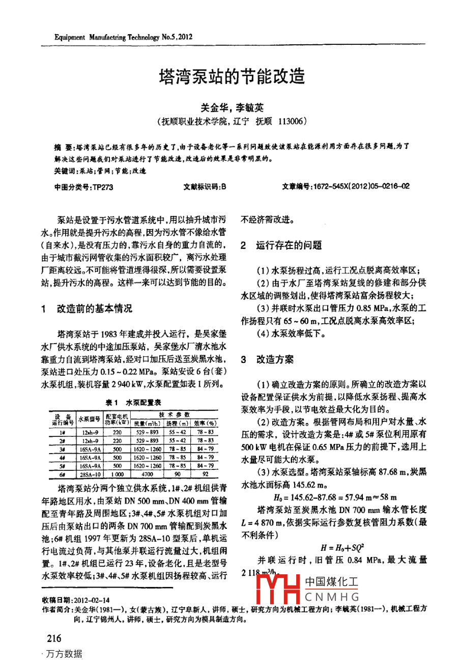 Equipment Manufactring Technology No 5, 2012塔灣泵站的節(jié)能改造關(guān)金華,李毓英(撫順職業(yè)技術(shù)學(xué)院,遼寧撫順113006)摘要:塔灣泵站已經(jīng)有很多年的歷史了,由于設(shè)備老化等一乘列問題致使讞泵站在能源利用方面存在很多問題為了解決這些問題我們對(duì)泵站進(jìn)行了節(jié)能改連,改造后的效果是非常明顯的。關(guān)鍵詞:泵站;管網(wǎng);節(jié)能;改中田分類號(hào):TP273文獻(xiàn)標(biāo)識(shí)碼:B文章編號(hào):1672-545X(2012)05021602泵站是設(shè)置于污水管道系統(tǒng)中,用以抽升城市污不經(jīng)濟(jì)需改進(jìn)。水。作用就是提升污水的高程因?yàn)槲鬯懿幌窠o水管自來水),是沒有壓力的靠污水自身的重力自流的,2運(yùn)行存在的問題由于城市截污網(wǎng)管收集的污水面積較廣,離污水處理廠距離較遠(yuǎn)。不可能將管道埋得很深所以需要設(shè)置泵(1)水泵揚(yáng)程過高運(yùn)行工況點(diǎn)脫離高效率區(qū);站提升污水的高程。這樣一來可以達(dá)到節(jié)能的目的。(2)由于水廠至塔灣泵站復(fù)線的修建和部分供水區(qū)域的調(diào)整劃出使得塔灣泵站富余揚(yáng)程較大;1改造前的基本情況(3)并聯(lián)時(shí)水泵出口管壓力085MPa,水泵的工作揚(yáng)程只有65~60m,工況點(diǎn)脫離水泵高效率區(qū)塔灣泵站于1983年建成并投入運(yùn)行,是吳家堡(4)水泵效率低下。水廠供水系統(tǒng)的中途加壓泵站,吳家堡水廠清水池水靠重力自流到塔灣泵站經(jīng)對(duì)口加壓后送至炭黑水池,3改造方案泵站進(jìn)口處壓力015~02MPa。泵站安設(shè)6臺(tái)(套)水泵機(jī)組裝機(jī)容量2940kW,水泵配置如表1所列。1)確立改造方案的原則。所確立的改造方案以衰1水泵配置表設(shè)備配置保證供水為前提,以降低水泵揚(yáng)程提高水泵效率為手段,以節(jié)電效益最大化為目的W)素(m)揚(yáng)()效水((2)改造方案。根據(jù)管網(wǎng)布局和用戶對(duì)水量、水3m3:是壓的需求,設(shè)計(jì)改造方案是輯或斗泵位利用原有500kW電機(jī)在保證065MPa壓力的前提下,選用上A-9A水量盡可能大的水泵。A-9A|501620126078~85(3)水泵選型。塔灣泵站泵軸標(biāo)高87.68m,炭黑塔灣泵站分兩個(gè)獨(dú)立供水系統(tǒng),1#,機(jī)組供青水池水面標(biāo)高14562m年路地區(qū)用水,由泵站DN500mm、DN400mm管輸H6=14562-87.68=5794m≈58m配至青年路及周圍地區(qū);3#、4#、5排水泵機(jī)組對(duì)口加塔灣泵站至炭黑水池DN700mm輸水管長度壓后由泵站出口的兩條DN700mm管輸配到炭黑水L=4870m,依據(jù)實(shí)際運(yùn)行參數(shù)復(fù)核管阻力系數(shù)最池:6#機(jī)組1997年更新為2854-10型泵后單機(jī)運(yùn)不利條件)行電流過負(fù)荷,與其他泵并聯(lián)運(yùn)行流量過大,機(jī)組閑H=Ho+sQ置。1#、2#機(jī)組已運(yùn)行23年,設(shè)備老化,且是老型號(hào)并聯(lián)運(yùn)行時(shí),舊管壓084MPa,最大流量水泵效率較低4#5排水泵機(jī)組因揚(yáng)程較高運(yùn)行211中國煤化工收稿日期:2012-02-14CNMHG作者簡介:關(guān)金華(1981一),女(蒙古族),遼寧阜新人,講師,碩士,研究方向?yàn)闄C(jī)械工程方向;李毓英(1981-),機(jī)械工程方向,遼寧錦州人,講師,碩士,研究方向?yàn)槟>咧圃旆较颉?16裝備制造技術(shù)》2012年第5期84=58+Sx21182H/3677帆=631(367×080×0.6)S1=5795×106=249kWh)/km)。并聯(lián)運(yùn)行時(shí),新管壓084MPa,最小流量供近778萬ml水量時(shí),日耗電量14756m3/h(232×526+249×252)=184778(kWb,84=58+Sx147562平均單耗S2=1194×10°184778/77.8=238(kWb)(km)取現(xiàn)泵站至炭黑水池輸水量7萬md時(shí),根據(jù)(2)更新前配水單耗。水量按流量計(jì)表指示數(shù),流量計(jì)顯示結(jié)果:新舊DN700m管輸水量不均衡,電量按電業(yè)局貿(mào)易結(jié)算表指示數(shù)如表2所列。舊線輸水量占58%,新線輸水量占42%;喪2更新前配水單耗表按實(shí)際管阻力系數(shù)復(fù)核揚(yáng)程九月合計(jì)舊線流量Qm=70000÷24×58%=161m/h;水(萬噸)241921944613需揚(yáng)程H=58+5795×106×16912=746m;電量(h)644361s6001201476考慮泵進(jìn)口壓力014MPa,選泵需要揚(yáng)程平均配水單耗H=746-14=6C電量/水量=1201476/4613新線流量=260.5kWh)/(kmQa=70000÷24x42%=1225mh,每日轉(zhuǎn)輸流量按778萬m3計(jì),每日節(jié)省電費(fèi)需揚(yáng)程(260.5-238)x7.8m)d×0.52元/(kW·hH=58+119x10-6×12252=75.9m910元考慮泵進(jìn)口壓力04MPa,選泵需要揚(yáng)程每年可節(jié)約運(yùn)行電費(fèi)H=75.9-14=619m。910×365=332萬元。因此,根據(jù)計(jì)算復(fù)核的結(jié)果,確定選泵揚(yáng)程中線為605投資回收期的預(yù)測根據(jù)所需流量、揚(yáng)程參數(shù)查水泵樣本曲線,選擇SLOW400-550型水泵。其改造投資費(fèi)概算如表3所列Q=1320~2190~2850m}h;表3改造投資費(fèi)概算表H=77~638~472m。型號(hào)單位數(shù)量「單價(jià)(萬元)總價(jià)萬元)〕N軸=500kW,n=1480rmin水泵30050B臺(tái)當(dāng)H=63m時(shí),件及安裝費(fèi)Q=2190m孫h=5.26萬m}d,電動(dòng)T=86%。選SIOW300-550B型水泵,其投資回收期約1年。Q=580-1360-1820mh,H=73-57~44m,6結(jié)束語N軸=280kW,經(jīng)過節(jié)能改造,節(jié)省了政府開支,投資的回收期當(dāng)H=63m時(shí),也是比較合理的,是一項(xiàng)非??尚械呐e措。Q=1050mh=252萬md,7=80%。參考文獻(xiàn):]湯躍尚亞波吳徐變頻調(diào)速的研究與分析門中國電機(jī)4節(jié)電效果預(yù)測工程學(xué)報(bào)200323(3):146-160凹2]鄭紅等變頻調(diào)