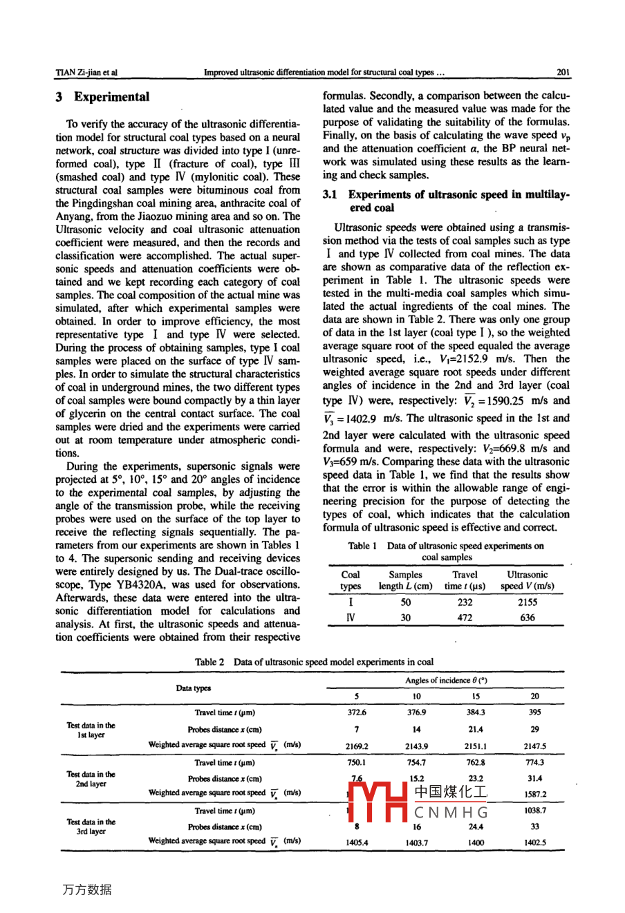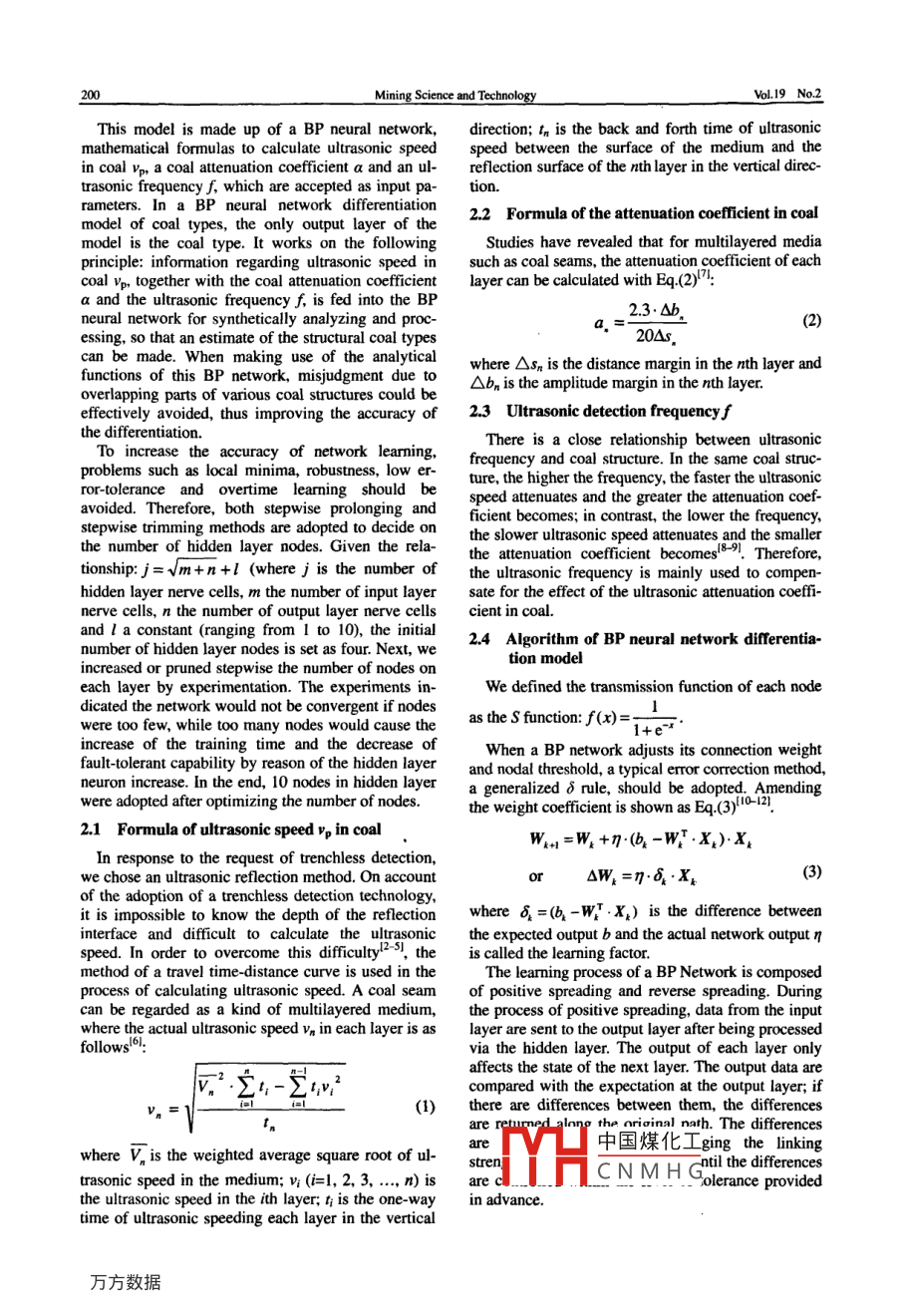Available online at w. sciencedirect coMININGScience DirectSCIENCE ANDTECHNOLOGYELSEVIERMining Science and Technology 19(2009)0199-0204www.elsevier.com/locateljcumtImproved ultrasonic differentiation model for structuralcoal types based on neural networkTIAN Zi-jian, WANG Fu-zhong2, LI Tao, BAI Shan-shanSchool of Electromechanica and information Engineering, China University of Mining Technology, Beijing 100083, ChinaSchool of Electrical Engineering Automation, Henan Polytechnic University, Jiaozuo, Henan 454000, ChinaAbstract: In order to solve the difficulty of detailed recognition of subdivisions of structural coal types, a differentiation model thatcombines BP neural network with an ultrasonic reflection method is proposed. Structural coal types are recognized based on a suible consideration of ultrasonic speed, an ultrasonic attenuation coefficient, characteristics of ultrasonic transmission and otherparameters relating to structural coal types. We have focused on a computational model of ultrasonic speed, attenuation coefficientin coal and differentiation algorithm of structural coal types based on a BP neural network Experiments demonstrate that the modelcan distinguish structural coal types effectively. It is important for the improved ultrasonic differentiation model to predict coal andgas outburstsKeywords: ultrasonic; structural coal types; BP neural network; coal ultrasonic attenuation coefficient; coal ultrasonic speed1 Introductionacteristics, rules of ultrasonic transmission, discrep-ancies of ultrasonic wave speeds and attenuation coStudies have shown that fault spots of coal and gas efficients of different coal structures, a detailed difoutbursts mostly exist in coal seams or coal beds, ferentiation model for structural coal types, based onmade up of a particular kind of deep tectonic coal. the combination of a neural network and an ultrasonicTherefore, effective recognition methods about method has been proposed by us in order to differen-structural coal types should be studied at length. Coal tiate exactly among structural coal typesand gas outburst disasters would be predicted effec-tively and in time by recognizing precisely the struc- 2 Differentiation model of structural coaltural coal types. Currently, there are many studies onlarge-scale detection of tectonic coal, but hardly any When ultrasonic waves are diffused in coal, theirresearch has been carried out in the field of the small speed and attenuation coefficient vary with coalefront areas of the working face. Accurate and detailed structures. Given the requirements of a differentiationmeans of detection are lacking in the small areas of model for structural coal types, a three-layered dif-he working face. What is more, conventional detec- ferentiation model, based on a BP neural network, hastion operations at the working place are too extensive been established by simulation with due considera-to be carried out in this confined space. So it is diffi-ion of the characteristics of ultrasonic transmissioncult to differentiate between the types of structural in coal. The model is shown in Fig.1coal at the refined level required. Up until now, thereare no reports about the recognition of subdivisionswithin structural coal types. Domestic and foreignscientists are largely engaged in the field of structuralcoal detection methods, such as geological radar, racoefficientCoal typesdio waves and Hertzian waves. Detailed recognitionof subdivisions within structural coal type is difficult,Ultrasonic frequencyespecially when differentiating overlapping parts indifferent types of structural coal, where wrong deter-minations can easily occur Given transmission char什H中國(guó)煤化工 n model of coal typesCNMHGReceived 12 August 2008: accepted 30 October 2008CorrespondingauthorTel:+86-13269565519;E-mailaddresstianzj0126@126.comVol 19 No. 2This model is made up of a BP neural network, direction; I, is the back and forth time of ultrasonicathematical formulas to calculate ultrasonic speed speed between the surface of the medium and thin coal vo, a coal attenuation coefficient a and an ul reflection surface of the nth layer in the vertical direc-trasonic frequency f, which are accepted as input parameters. In a bP neural network differentiationmodel of coal types, the only output layer of the2.2 Formula of the attenuation coefficient in coalmodel is the coal type. It works on the followingStudies have revealed that for multilayered mediaprinciple: information regarding ultrasonic speed in such as coal seams, the attenuation coefficient of eachcoal Vp, together with the coal attenuation coefficient layer can be calculated with Eq- (2).a and the ultrasonic frequency f, is fed into the BPneural network for synthetically analyzing and proc-2.3.bsing, so that an estimate of the structural coal type20△scan be made. When making use of the analyticalwhere Asn is the distance margin in the nth layer andfunctions of this BP network, misjudgment due to Ab, is the amplitude margin in the nth layer.overlapping parts of various coal structures could beeffectively avoided, thus improving the accuracy of 2.3 Ultrasonic detection frequency fthe differentiationTo increase the accuracy of network learming, frequency and coal structure. In the same coal strucproblems such as local minima, robustness, low er- ture, the higher the frequency, the faster the ultrasonicror-tolerance and overtime learning should bespeed attenuates and the greater the attenuation coef-avoided. Therefore, both stepwise prolonging and ficient becomes: in contrast, the lower the frequency,stepwise trimming methods are adopted to decidethe number of hidden layer nodes. Given the relathe slower ultrasonic speed attenuates and the smallerthe attenuation coefficient becomes[).Thereforetionship: j=vm+n+!(where j is the number of the ultrasonic frequency is mainly used to compen-hidden layer nerve cells, m the number of input layer sate for the effect of the ultrasonic att