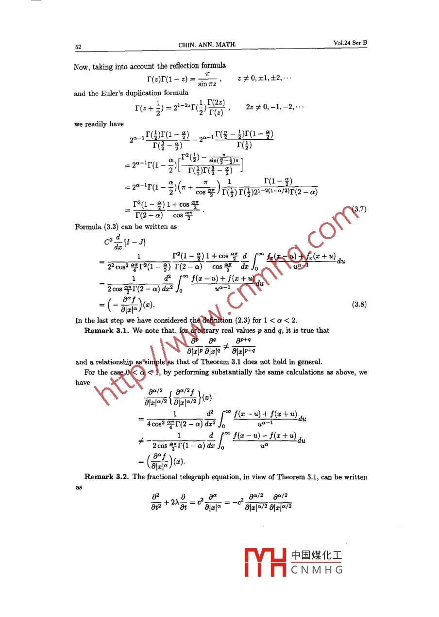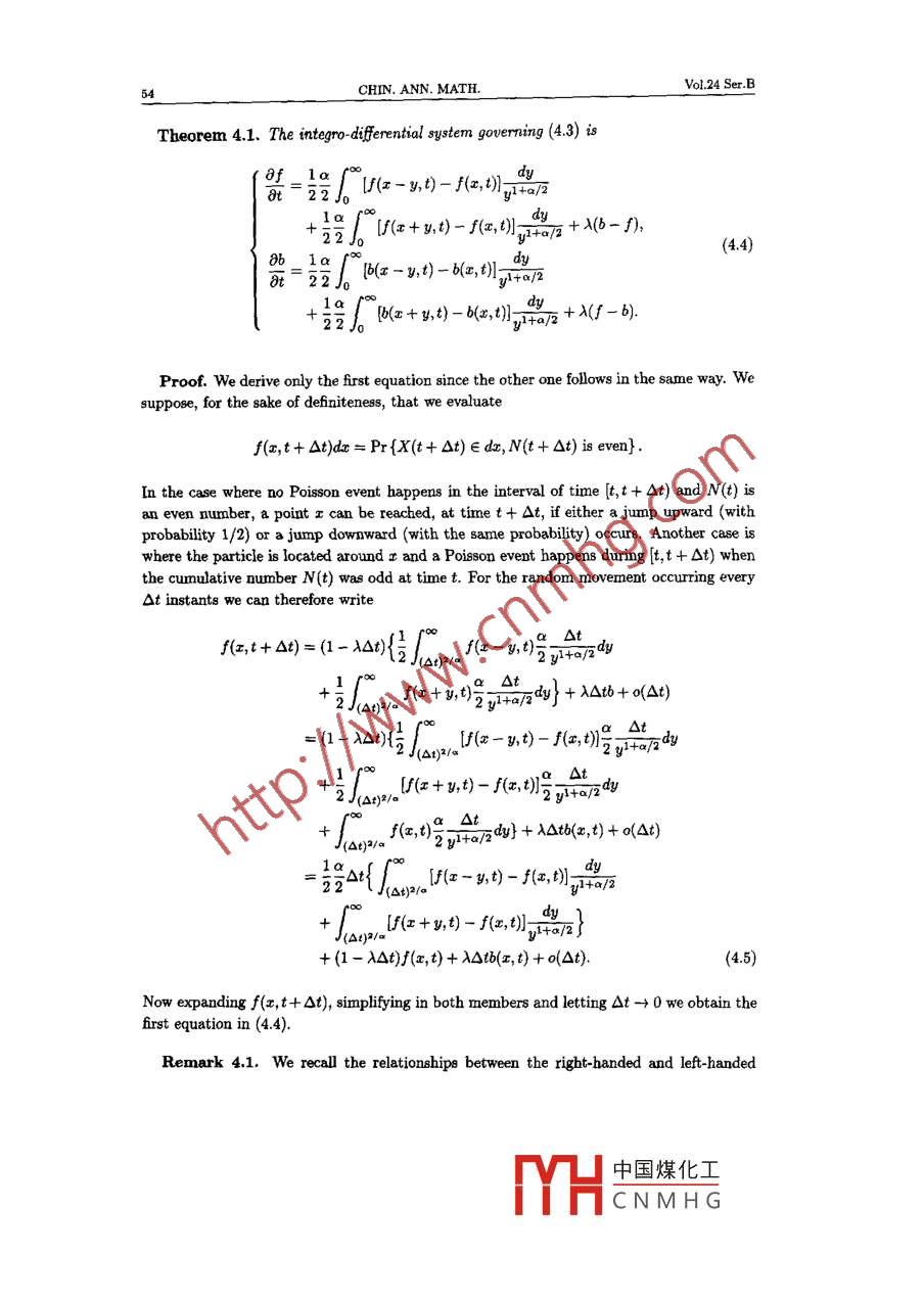 Chin. Ann. Math.24B:1(2003),45-56.THE SPACE-FRACTIONAL TELEGRAPHEQUATION AND THE RELATEDFRACTIONAL TELEGRAPH PROCESS***E. ORSINGHER*ZHAO XUELEI**AbstractThe apace fractional telegraph equation is analyzed and the Fourier transform of ite funda-mental solution is obtained and discussed.A symmetric process with discontinuous trajectories, whose transition function satisfies thespace fractional telegraph equation, is presented. Its limiting behaviour and the connectionwith Bymmetric stable processes is also examined.Keywords Fractional calculus, Marchaud's derivative, Weyl's derivative, Riesz potential,Telegraph equation, Stable processes2000 MR Subject Classfcation 60H30, 35G05Chinese Library Classifcation 0211.6, O175.2, 0211.9,Document Code AArticle ID 0252 -9599(2003)01-0045-12g1. IntroductionIt is well known that Brownian motion B is the limit, in some sense, of the telegrapher'sprocess T (see [3]).The transition function pB(x,t) = pB of B is the fundamental solution of{器=號x∈R, t>0,(1.1)\p(x,0)= 8(x),while the transition function pr(x,t) = Pr of T is the fundamental solution of(器+2λ器=c2品,o∈R t>0,pP(x,0) =(x),(1.2)( P+(x,0)=0,”δ being the Dirac's delta function.It was discovered by Riesz5l that the transition functions of symmetric stable processeswith characteristic functionsU(r,t) =e-hI*e/2(1.3)of degree0 0.中國煤化工MYHCNMHG辨嗓畢出9HWN)工北粼國中(9°8)"[(n+x)*s+(n-)°f]-o In oJ 6-D)I(-)()It-oZ=mpτ--rMτ- 8+$-(m-I) | rP1n+2)4+(n-myad t-oC=I-ont/o(zn- zn)apnp(n+)*f+(n-x)g] I 0=z/o(zB-z)np(n+2)1+(n-) aJP"(A-m+2)/+(n+m-x)可.J m.J=fARq毗eAoqe se uoequoysteId aures aq4 jo sueou ia('8)"[([+ x)f +(a-)4] I“J(語-)I(( - T)I()近'P:-{t-D)r-v*]1(a+)*+(a-x)°fI5zp I 1-oz=1o6吧" J(+)+(-x)"1ap g三npsuogn4gsqns aAssaoons ot$ ID2Je‘a(chǎn)ABq M aIoJaLn=h- m 'a =h+ m uoeuoustreoe otq 8upu1orod Aq pearenpea oq ue中m(")(h+m+2)4+(h-m-啊。) pj=Ito u1ure mo Mou的eTUeO aM(εε)of導(dǎo)nofop”"(n+m+2)*f+(h-m+)"f-(h+m-x)f-(h-m-x)Tpzo==rh+my-(t-可.J ]}號Jpc0=z/ol1ez/olme]Ppo=' z/01ple l z/olpleOJ!IM ues @M_ghi°f衛(wèi),(zz)(hi+1)6-(h-)) 0hp(h+1)f-(h-x)5 a五幾塑緩-)黃s0_。P[華/(結(jié)-I).物工)]告(二山]血80__PI(2)(10)z/oe:SMoIToJ se i @1!IM 04 Aue?UAUOD s! 4I "Joo1dI9 NOIIVNOH HDVHDETaL TVNOILOVHJ~EOVdS SHL“7 X‘OVHZ智HHDNISHO 9 T'ON5CHIN. ANN. MATH.Vol.24 Ser.BNow, taking into account the refection formular(z)F(1-z)= gsinπz,z≠0,土1,土2,..and the Euler's duplication formula[(z+ )=2)-2T()HE)2z≠0,-1,-2,-we readily have20-1()1(1一號) _ 2-1T(號- )5(1一號)(一號)r(I)r()-四空亞1=2-+T(- [ r()r一)_π\(zhòng)_1F(1-號)=2-T(1 -凱(++ 0)12-21-1(2-可2)r2(1-號)1+cos弩(3.7)T(2-a) cos譬Formula (3.3) can be written asc2dr2(1-號)1+Co8登d fo f1e(x-4)+ f,(+w)au22 cos32于T2(1一號) r(2-a)- COs號 dx Joua-1dp° f(x-y)+ f(x+四d2cos號T(2-a)dx2 ]=(- 0()x)(3.8)可x|a,In the last step we have considered the defnition (2.3) for 1 0.We frst assume that during every time interval [t,t + Ot) a particle can either make ajump in the positive direction (with probability 1/2) or a jump in the negative direction(with the same probability).We also assume that the distribution of Y is the following one:for (Ot)吞