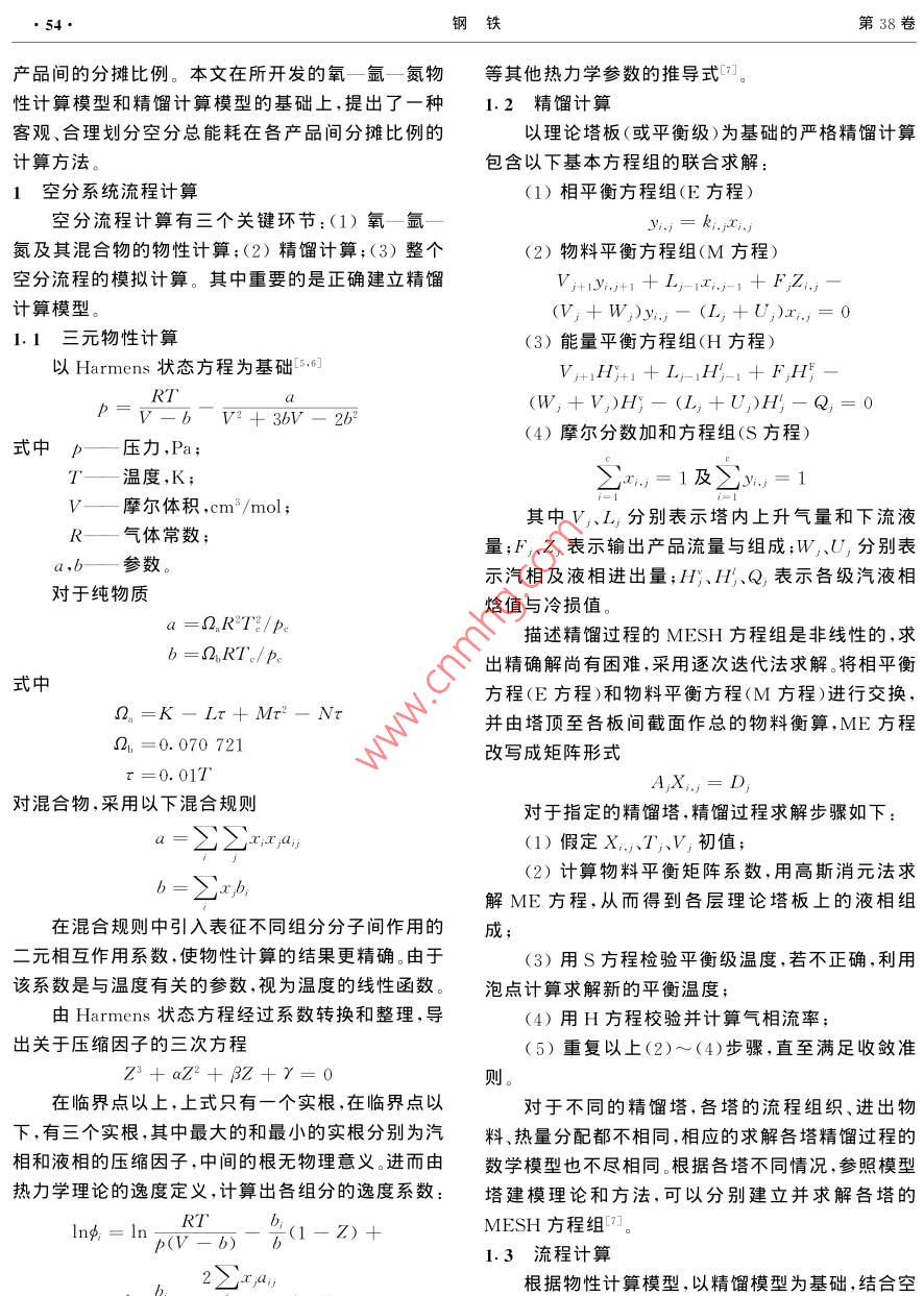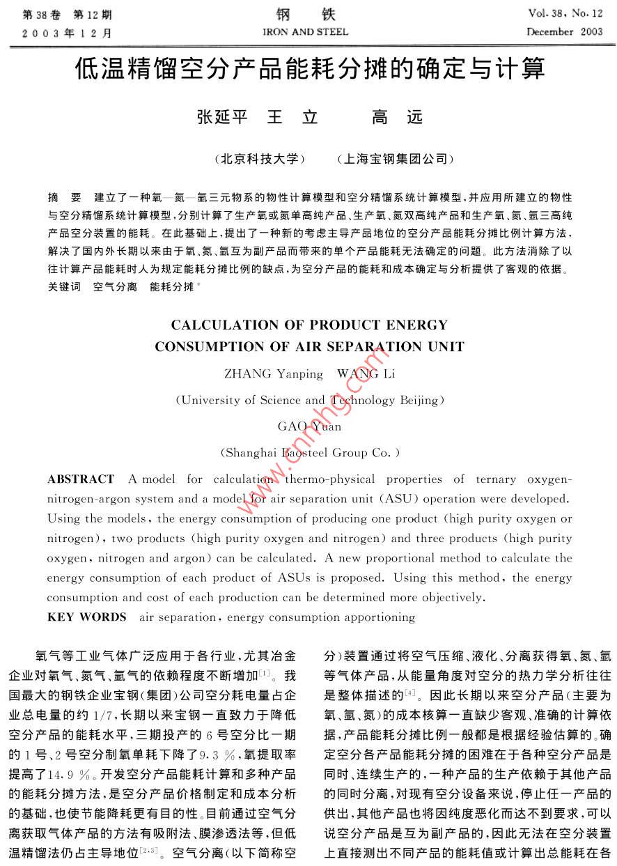 第38卷第12期鋼鐵Vol 38, No 122003年12月IRON AND STEELDecember 2003低溫精餾空分產(chǎn)品能耗分?jǐn)偟拇_定與計(jì)算張延平王立高遠(yuǎn)(北京科技大學(xué))(上海寶鋼集團(tuán)公司)要建立了一種氧—氮—?dú)迦锵档奈镄杂?jì)算模型和空分精餾系統(tǒng)計(jì)算模型.并應(yīng)用所建立的物與空分精餾系統(tǒng)計(jì)算模型,分別計(jì)算了生產(chǎn)氧或氮單高純產(chǎn)品、生產(chǎn)氧、氮雙高純產(chǎn)品和生產(chǎn)氧、氮、氬三高純產(chǎn)品空分裝置的能耗。在此基礎(chǔ)上,提出了一種新的考慮主導(dǎo)產(chǎn)品地位的空分產(chǎn)品能耗分?jǐn)偙壤?jì)算方法,解決了國(guó)內(nèi)外長(zhǎng)期以來(lái)由于氧、氮、氬互為副產(chǎn)品而帶來(lái)的單個(gè)產(chǎn)品能耗無(wú)法確定的問(wèn)題。此方法消除了以往計(jì)算產(chǎn)品能耗時(shí)人為規(guī)定能耗分?jǐn)偙壤娜秉c(diǎn),為空分產(chǎn)品的能耗和成本確定與分析提供了客觀旳依據(jù)關(guān)鍵詞空氣分離能耗分?jǐn)侰ALCULATION OF PRODUCT ENERGYCONSUMPTION OF AIR SEPARATION UNITZHANG Yanping WANG Li(University of Science and Technology BeijingGAO Yuan(Shanghai Baosteel Group Co.ABSTRACT A model for calculation thermo-physical properties of ternary oxygennitrogen-argon system and a model for air separation unit (AsU) operation wereUsing the models, the energy consumption of producing one product (high purity oxygen ornitrogen), two products(high purity oxygen and nitrogen) and three products(high purityoxygen, nitrogen and argon) can be calculated. A new proportional method to calculate theenergy consumption of each product of ASUs is proposed. Using this method, the energyconsumption and cost of each production can be determined more objectively.KEY WORDS air separation, energy consumption apportioning氧氣等工業(yè)氣體廣泛應(yīng)用于各行業(yè),尤其冶金分)裝置通過(guò)將空氣壓縮、液化、分離獲得氧、氮、氬企業(yè)對(duì)氧氣、氮?dú)?、氬氣的依賴程度不斷增加門。我等氣體產(chǎn)品,從能量角度對(duì)空分的熱力學(xué)分析往往國(guó)最大的鋼鐵企業(yè)寶鋼(集團(tuán))公司空分耗電量占企是整體描述的。因此長(zhǎng)期以來(lái)空分產(chǎn)品(主要為業(yè)總電量的約1/7,長(zhǎng)期以來(lái)寶鋼一直致力于降低氧、氬、氮)的成本核算一直缺少客觀、準(zhǔn)確的計(jì)算依空分產(chǎn)品的能耗水平,三期投產(chǎn)的6號(hào)空分比一期據(jù),產(chǎn)品能耗分?jǐn)偙壤话愣际歉鶕?jù)經(jīng)驗(yàn)估箅的。確的1號(hào)、2號(hào)空分制氧單耗下降了9.3%,氧提取率定空分各產(chǎn)品能耗分?jǐn)偟睦щy在于各種空分產(chǎn)品是提高了14.9%。開發(fā)空分產(chǎn)品能耗計(jì)算和多種產(chǎn)品同時(shí)、連續(xù)生產(chǎn)的,一種產(chǎn)品的生產(chǎn)依賴于其他產(chǎn)品的能耗分?jǐn)偡椒?是空分產(chǎn)品價(jià)格制定和成本分析的同時(shí)分離,對(duì)現(xiàn)有空分設(shè)備來(lái)說(shuō),停止任一產(chǎn)品的的基礎(chǔ),也使節(jié)能降耗更有目的性。目前通過(guò)空氣分供出,其他產(chǎn)品也將因純度惡化而達(dá)不到要求,可以離獲取氣體產(chǎn)品的方法有吸附法、膜滲透法等,但低說(shuō)空分產(chǎn)品是互為副產(chǎn)品的,因此無(wú)法在空分裝置溫精餾法仍占主導(dǎo)地位??諝夥蛛x(以下簡(jiǎn)稱空上直接測(cè)岀不同產(chǎn)品的能耗值或計(jì)算岀總能耗在各54鋼鐵第38卷產(chǎn)品間的分?jǐn)偙壤?。本文在所開發(fā)的氧一氬一氮物等其他熱力學(xué)參數(shù)的推導(dǎo)式。性計(jì)算模型和精餾計(jì)算模型的基礎(chǔ)上,提岀了一種1.2精餾計(jì)算客觀、合理劃分空分總能耗在各產(chǎn)品間分?jǐn)偙壤囊岳碚撍?或平衡級(jí))為基礎(chǔ)旳嚴(yán)格精餾計(jì)算計(jì)算方法包含以下基本方程組的聯(lián)合求解1空分系統(tǒng)流程計(jì)算(1)相平衡方程組(E方程)空分流程計(jì)算有三個(gè)關(guān)鍵環(huán)節(jié):(1)氧一氬氮及其混合物的物性計(jì)算;(2)精餾計(jì)算;(3)整個(gè)(2)物料平衡方程組(M方程)空分流程的模擬計(jì)算。其中重要的是正確建立精餾V+1y,+1+L-1x,-1+FZ,計(jì)算模型V;+W)(L,;+U,)1.I三元物性計(jì)算(3)能量平衡方程組(H方程)以 Harmens狀態(tài)方程為基礎(chǔ)-+L1-H-1+FRTp=v-b-V2+30V-2b2(W,+V)H-(L1+U)H1-Q,=0(4)摩爾分?jǐn)?shù)加和方程組(S方程)式中p——壓力,Pa;T溫度,K1及V—摩爾體積,cm3/mol;其中V、L分別表示塔內(nèi)上升氣量和下流液R—?dú)怏w常數(shù);量;F、Z,表示輸出產(chǎn)品流量與組成;W、U,分別表參數(shù)對(duì)于純物質(zhì)示汽相及液相進(jìn)出量;H、H、Q表示各級(jí)汽液相焓值與冷損值a=nRT2/p描述精餾過(guò)程的MESH方程組是非線性的,求b=n2,RT/p出精確解尚有困難,采用逐次迭代法求解。將相平衡式中方程(E方程)和物料平衡方程(M方程)進(jìn)行交換,3,=K-Lr+ Mr-Nr并由塔頂至各板間截面作總的物料衡算,ME方程21=0.070721改寫成矩陣形式A X =D對(duì)混合物,采用以下混合規(guī)則對(duì)于指定的精餾塔,精餾過(guò)程求解步驟如下(1)假定x、T、V,初值(2)計(jì)算物料平衡矩陣系數(shù),用高斯消元法求解ME方程,從而得到各層理論塔板上的液相組在混合規(guī)則中引入表征不同組分分子間作用的成;元相互作用系數(shù),使物性計(jì)算的結(jié)果更精確。由于(3)用S方程檢驗(yàn)平衡級(jí)