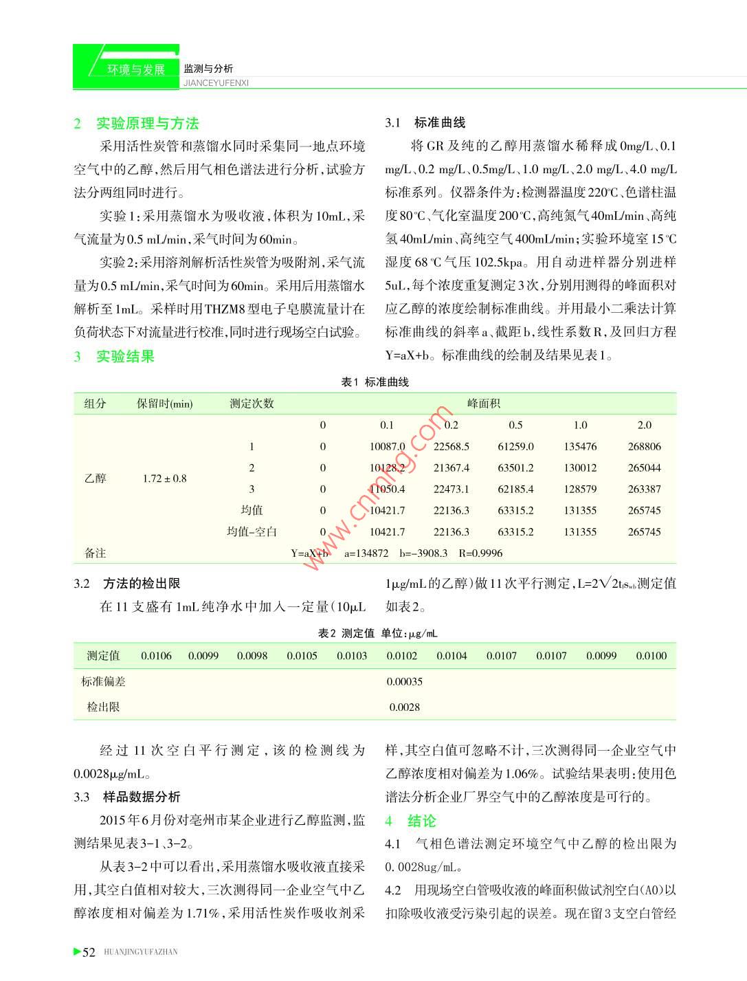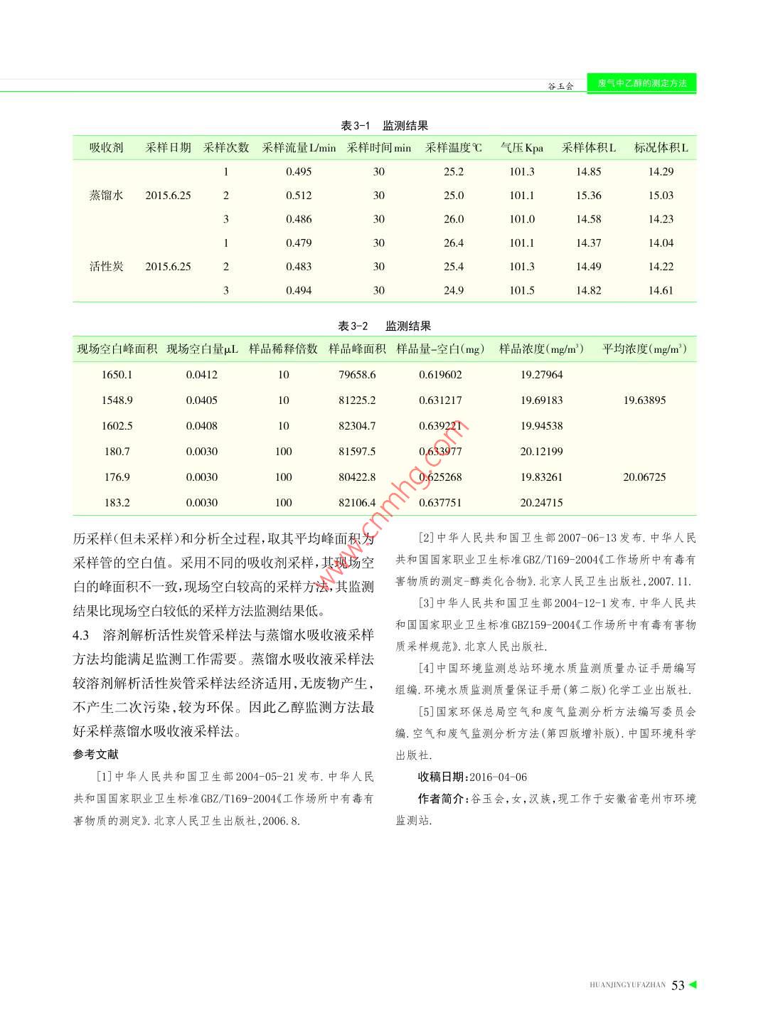 谷玉會(huì)廢氣中乙醇的測(cè)定方法廢氣中乙醇的測(cè)定方法谷玉會(huì)(安徽省亳州市環(huán)境監(jiān)測(cè)站,安徽236800)摘要:乙醇作為工作場(chǎng)所中常用的清洗劑,但《中華人民共和國(guó)國(guó)家職業(yè)衛(wèi)生標(biāo)準(zhǔn),工作場(chǎng)所中有毒有害物質(zhì)的測(cè)定》GBZ/T169-2004,無乙醇的監(jiān)測(cè)方法。參照工作場(chǎng)所醇類化合物濃度的測(cè)定方法,用不同的吸收劑采集工作場(chǎng)所空氣中的乙醇,采用氣相色譜法測(cè)定其濃度。關(guān)鍵詞:工作場(chǎng)所空氣;乙醇;氣相色譜法;現(xiàn)場(chǎng)空白管中圖分類號(hào):X830.2文獻(xiàn)標(biāo)識(shí)碼:A文章編號(hào):2095-672X(2016)-0051-03do:10.1647cki.cn15-1369/X.2016.02.014 On the determination of ethanol in waste gas Gu Yuhui (Environmental monitoring station of Bozhou City Anhui Province 236800) Abstract: Ethanol as a cleaning agent commonly used in the workplace, but "the people's Republic of China national occupational health standards, workplace toxic and harmful substances in the determination of"GBZ/T169-2004, no alcohol monitoring method. Ac- cording to the determination method of the concentration of alecohol in the workplace, the ethanol in the air of workplace was collected with different absorbent, and the concentration of ethanol in the air was determined by gas chromatography. Key wordst: Workplace air; Ethanol; Gas chromatography;Field blank tube乙醇作為一種無毒化學(xué)物質(zhì),國(guó)家未制定其檢測(cè)1主要儀器和實(shí)驗(yàn)方法方法《工作場(chǎng)所中有毒有害物質(zhì)的測(cè)定一醇類化合1.1儀器設(shè)備物》GBZ/T169.48-2004規(guī)定了監(jiān)測(cè)工作場(chǎng)所中醇類化電子天平、7890A氣相色譜儀、大氣采樣器、電子合物的濃度方法,但只適用于甲醇、丙醇、丁醇戊醇、皂膜流量計(jì)額、10mL大氣吸收管、10mL容量瓶、微量辛醇、丙烯醇、二丙酮醇、乙二醇、康醇、二氯丙醇、氯注射器、色譜柱FFAP、溶劑解析活性炭管。乙醇、1-甲氧基丙醇濃度的測(cè)定。當(dāng)企業(yè)要求進(jìn)行環(huán)1.2試劑與材料境空氣或有組織廢氣中乙醇監(jiān)測(cè)時(shí),為此對(duì)環(huán)境空氣乙醇GR、高純氮、高純氫、高純空氣、標(biāo)準(zhǔn)溶液自或有組織廢氣中乙醇的監(jiān)測(cè)方法進(jìn)行探討研究。配、質(zhì)控樣自配。 HAN 51環(huán)境與發(fā)展監(jiān)測(cè)與分析 JIANCEYUFENXI2實(shí)驗(yàn)原理與方法3.1標(biāo)準(zhǔn)曲線采用活性炭管和蒸餾水同時(shí)采集同一地點(diǎn)環(huán)境將GR及純的乙醇用蒸餾水稀釋成0mg/L、0.1空氣中的乙醇,然后用氣相色譜法進(jìn)行分析,試驗(yàn)方mg/L、0.2mg/L、0.5mg/L、1.0mg/、2.0mg/L、4.0mg/法分兩組同時(shí)進(jìn)行。標(biāo)準(zhǔn)系列。儀器條件為:檢測(cè)器溫度220℃、色譜柱溫實(shí)驗(yàn)1:采用蒸餾水為吸收液,體積為10mL,采度80℃、氣化室溫度200℃,高純氮?dú)?0mL/min、高純氣流量為0.5mL/min,采氣時(shí)間為60min。氫40mL/min、高純空氣400mL/min;實(shí)驗(yàn)環(huán)境室15℃實(shí)驗(yàn)2:采用溶劑解析活性炭管為吸附劑,采氣流濕度68氣壓102.5ka用自動(dòng)進(jìn)樣器分別進(jìn)樣量為0.5mL/min,采氣時(shí)間為60min采用后用蒸餾水5uL,每個(gè)濃度重復(fù)測(cè)定3次,分別用測(cè)得的峰面積對(duì)解析至1mL.采樣時(shí)用THZM8型電子皂膜流量計(jì)在應(yīng)乙醇的濃度繪制標(biāo)準(zhǔn)曲線。并用最小二乘法計(jì)算負(fù)荷狀態(tài)下對(duì)流量進(jìn)行校準(zhǔn),同時(shí)進(jìn)行現(xiàn)場(chǎng)空白試驗(yàn)。標(biāo)準(zhǔn)曲線的斜率a、截距b,線性系數(shù)R,及回歸方程3實(shí)驗(yàn)結(jié)果Y=ax+b。標(biāo)準(zhǔn)曲線的繪制及結(jié)果見表1。表1標(biāo)準(zhǔn)曲線組分保留時(shí)(min)測(cè)定次數(shù)峰面積00.10.20.51.02.01010087022568.561259.01354762688062010128.221367.463501.2130012265044乙醇1.72±0.83011050.422473.1621854128579263387均值010421.722136.363315.2131355265745均值-空白010421.722136.63315.2131355265745備注y=ax+ba=134872b3908.30.9993.2方法的檢出限ug/mL的乙醇)做11次平行測(cè)定,L=2V2ts測(cè)定值在11支盛有1mL純凈水中加入一定量(10μL如表2表2測(cè)定值單位:μg/mL測(cè)定值0.01060.00990.00980.0100.01030.01020.01040.01070.01070.00990.0100標(biāo)準(zhǔn)偏差0.00035檢出限0.0028經(jīng)過11次空白平行測(cè)定,該的檢測(cè)線為樣,其空白值可忽略不計(jì),三次測(cè)得同一企業(yè)空氣中0.0028g/mL乙醇濃度相對(duì)偏差為1.06%。試驗(yàn)結(jié)果表明:使用色3.3樣品數(shù)據(jù)分析譜法分析企業(yè)廠界空氣中的乙醇濃度是可行的。2015年6月份對(duì)亳州市某企業(yè)進(jìn)行乙醇監(jiān)測(cè),監(jiān)4結(jié)論測(cè)結(jié)果見表3-1、3-2。4.1氣相色譜法測(cè)定環(huán)境空氣中乙醇的檢出限為從表3-2中可以看出,采用蒸餾水吸收液直接采0.0028ug/mL用,其空白值相對(duì)較大,三次測(cè)得同一企業(yè)空氣中乙4.2用現(xiàn)場(chǎng)空白管吸收液的峰面積做試劑空白(A0)以醇濃度相對(duì)偏差為1.71%,采用活性炭作吸收劑采扣除吸收液受污染引起的誤差?,F(xiàn)在留3支空白管經(jīng) 52 HUANJINGYUFAZHAN谷玉會(huì)廢氣中乙醇的測(cè)定方法表3-1監(jiān)測(cè)結(jié)果吸收劑采樣日期采樣次數(shù)采樣流量Lmin采樣時(shí)間min采樣溫度℃氣壓Kpa采樣體積L標(biāo)況體積L10.4953025.2101.314.8514.29蒸餾水2015.6.