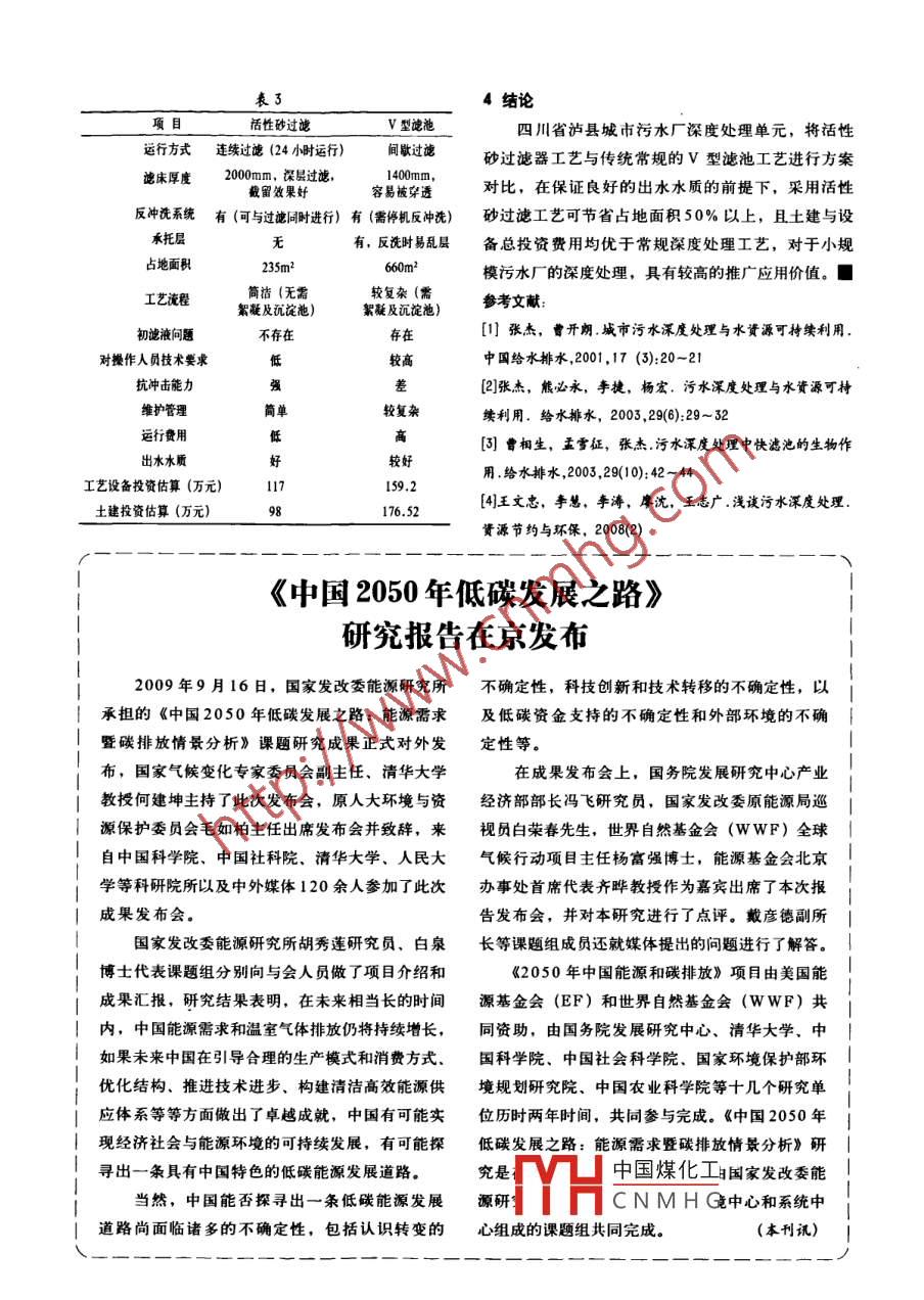 李媛(北京市市政工程設(shè)計(jì)研究總院,北京100082)摘要:針對(duì)四川省瀘縣城市污水廠深度處理工藝單元的選擇,通過(guò)對(duì)話性砂過(guò)濾器和傳統(tǒng)常規(guī)的v型濾池工藝進(jìn)行對(duì)比,在保證良好的出水水質(zhì)的前提下,采用活性砂過(guò)德器工藝具有運(yùn)行方式連續(xù)、工藝流程簡(jiǎn)單、占地面積少,工程投資省等優(yōu)點(diǎn)。關(guān)鍵詞:污水深度處理、活性砂過(guò)濾器、V型濾池城市污水廠深度處理方案比選1污水深度處理內(nèi)涵濾池是污水深度處理中最普遍應(yīng)用的--種傳統(tǒng)污水深度處理在經(jīng)濟(jì)發(fā)達(dá)的國(guó)家已在推廣,甚技術(shù)。而近幾年來(lái),活性砂過(guò)謔器工藝以其結(jié)構(gòu)形至普及。在我國(guó),污水深度處理與有效利用事業(yè)自式簡(jiǎn)單、運(yùn)行效率高、占地面積少等優(yōu)勢(shì)愈來(lái)愈受20世紀(jì)90年代以來(lái)也已經(jīng)具備了相當(dāng)?shù)囊?guī)模。城市到大家的認(rèn)可和青睞。本文對(duì)用于污水深度處理的污水深度處理普及率現(xiàn)已逐漸成為城市用水健康循濾池和活性砂過(guò)濾器工藝進(jìn)行方案比選。環(huán)的重要標(biāo)志。2.1設(shè)計(jì)規(guī)模所謂污水深度處理有別于污水三級(jí)處理。三級(jí)瀘縣污水處理廠近期設(shè)計(jì)規(guī)模為5000m3/d,處理是在二級(jí)處理流程之后再增加處理設(shè)施來(lái)取得遠(yuǎn)期設(shè)計(jì)規(guī)模為 7000m)/d,一、二期總規(guī)模為良好的水質(zhì),而深度處理則不限于此,采用二級(jí)處12000m3/d. 其深度處理單元土建按遠(yuǎn)期規(guī)模-次理新工藝(厭氧一好氧活性污泥法) 取得更好的水建成,設(shè)備采用近、遠(yuǎn)期分期安裝。質(zhì)也是深度處理。當(dāng)然污水深度處理也不排除三級(jí)2.2 設(shè)計(jì)進(jìn)、出水水質(zhì)處理,當(dāng)再生水用戶對(duì)SS. COD.色度、嗅味有該污水處理廠原水經(jīng)二級(jí)生物處理一CAST 生特殊要求時(shí),應(yīng)在二級(jí)處理之后增加混凝過(guò)濾、生物反應(yīng)池后,出水水質(zhì)可達(dá)到《城鎮(zhèn)污水處理廠污物膜過(guò)謔、臭氧氧化、活性炭吸附以至膜分離凈化染物排放標(biāo)準(zhǔn)》 (GB18918-2002) 規(guī)定的一級(jí)B標(biāo)單元。排放標(biāo)準(zhǔn),其水質(zhì)指標(biāo)詳見(jiàn)表1.表1深度處理單元設(shè)計(jì)進(jìn) 水水質(zhì)2設(shè)計(jì)規(guī)模及進(jìn)、出水水質(zhì)指標(biāo)BOD,CODcrSsTP由于本項(xiàng)目所處瀘縣,位于長(zhǎng)江上游的重要支設(shè)計(jì)值(mg/L)<20≤60<20 < I.0流- -沱江流域,其生態(tài)環(huán)境的質(zhì)量直接影響到長(zhǎng)江流域的生態(tài)環(huán)境,其出水水質(zhì)要求穩(wěn)定的達(dá)到經(jīng)深度處理后,其出水水質(zhì)應(yīng)達(dá)到GB18918-《城鎮(zhèn)污水處理廠污染排放標(biāo)準(zhǔn)》(GB18918- - 2002) 2002 中規(guī)定的一級(jí)A標(biāo)排放標(biāo)準(zhǔn),其水質(zhì)指標(biāo)詳見(jiàn)一級(jí)A標(biāo)準(zhǔn),由于出水Ss. TP的指標(biāo)要求嚴(yán)格,表 2中國(guó)煤化工而本工程所采用的CAST生物反應(yīng)池出水的BOD、出水水質(zhì)ss等指標(biāo)無(wú)法穩(wěn)定的達(dá)到一級(jí)A的排放標(biāo)準(zhǔn),故MHCNMH G必須設(shè)置后續(xù)的深度處理工藝單元。設(shè)計(jì)值 (mg/L)< 10< 50≤10 <0.5423深度處理工藝方案比選(6)進(jìn)水水質(zhì)要求寬松,可長(zhǎng)期承受150mg/3.1活性砂過(guò)濾器L藝L濃度ss進(jìn)水水質(zhì),短時(shí)承受250mg/L濃度ss沖3.1.1 工作原理?yè)舳鏊|(zhì)不變;活性砂過(guò)謔器是一種集混凝、澄清.過(guò)濾為一(7)過(guò)濾效果好,無(wú)初濾液,出水水質(zhì)穩(wěn)定。濾體的高效過(guò)濾器,其構(gòu)造詳見(jiàn)圖1.待處理的原水經(jīng)料清潔及時(shí),可保證高質(zhì)、穩(wěn)定的出水效果,無(wú)周進(jìn)水管,通過(guò)位于過(guò)濾器底部的布水器進(jìn)入過(guò)濾期性水質(zhì)波動(dòng)現(xiàn)象;器。水流由下向上逆流通過(guò)濾床,經(jīng)過(guò)濾后的過(guò)濾(8) 易于改擴(kuò)建,活性砂過(guò)濾器所采用的單元液在過(guò)濾器頂部聚集后經(jīng)溢流口流出。過(guò)濾器底部操作方式可根據(jù)水量變化靈活增加或刪減過(guò)濾器數(shù)被污染的濾料通過(guò)空氣提升泵被提升到過(guò)濾器頂部量:的洗砂器,通過(guò)紊流作用使污染物從活性砂中分離(9)與常規(guī)砂過(guò)速工藝相比,可節(jié)省30% ~40出來(lái),雜質(zhì)通過(guò)沖洗水出口排出,凈矽利用自重返%的化學(xué)藥劑;回砂床從而實(shí)現(xiàn)連續(xù)過(guò)濾。由于石英砂濾料在過(guò)濾(10)采用單- -均質(zhì)濾料,無(wú)須級(jí)配,器中呈自上而下的運(yùn)動(dòng)狀態(tài),對(duì)原水起到攪拌作.(11)能夠用作生物過(guò)濾設(shè)備,對(duì)原水中的總氮用,因此攪拌絮凝作用可在過(guò)濾器內(nèi)完成。過(guò)濾器及磷具有較高的去除率。內(nèi)濾料清潔及時(shí),可承受較高的進(jìn)水污染物濃度。3.2活性矽過(guò)濾器與濾池工藝方案比選3.2.1活性砂過(guò)濾器方崇設(shè)計(jì)原水進(jìn)口的濾出液活性砂過(guò)濾系統(tǒng)土建按遠(yuǎn)期規(guī)模12000m3/d設(shè)沖洗水出口計(jì),設(shè)備按近期規(guī)模5000m3/d安裝,預(yù)留遠(yuǎn)