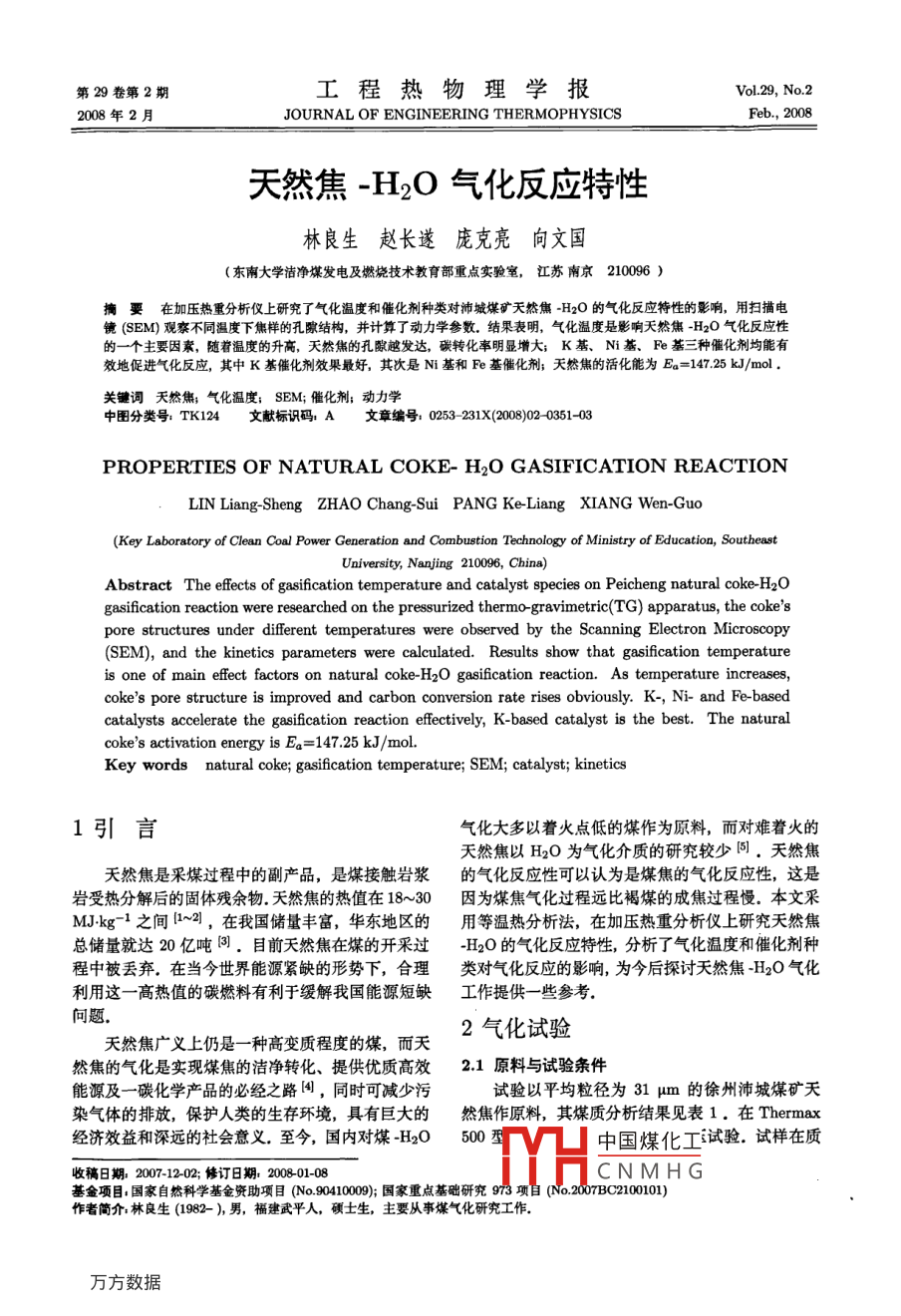 第29卷第2期工程熱物理學(xué)報Vol 29, No.22008年2月JOURNAL OF ENGINEERING THERMOPHYSICSFeb,2008天然焦-H2O氣化反應(yīng)特性林良生趙長遂龐克亮向文國(東南大學(xué)潔凈煤發(fā)電及燃燒技術(shù)教育部重點實驗室,江蘇南京210096)摘要在加壓熱重分析儀上研究了氣化溫度和催化劑種類對沛城煤礦天然焦-H2O的氣化反應(yīng)特性的影響,用掃描電鏡(SEM)觀察不同溫度下焦樣的孔隙結(jié)構(gòu),并計算了動力學(xué)參數(shù),結(jié)果表明,氣化溫度是影響天然焦H2O氣化反應(yīng)性的一個主要因素,隨著溫度的升高,天然焦的孔隙越發(fā)達(dá),碳轉(zhuǎn)化率明顯增大;K基、Ni基、Fe基三種催化劑均能有效地促進氣化反應(yīng),其中K基催化劑效果最好,其次是N基和Fe基催化劑;天然焦的活化能為Ea=14725kJ/mol關(guān)鍵詞天然焦;氣化溫度;SEM;催化劑;動力學(xué)中圖分類號:TK124文獻標(biāo)識碼,A文章編號:0253-231X(2008)020351-03PROPERTIES OF NATURAL COKE- H,O GASIFICATION REACTIONLIN Liang-Sheng ZHAO Chang-Sui PANG Ke-Liang XIANG Wen-Guo(Key Laboratory of Clean Coal Power Generation and Combustion Technology of Ministry of Education, SoutheastAbstract The effects of gasification temperature and catalyst species on Peicheng natural coke-H2Ogasification reaction were researched on the pressurized thermo-gravimetric(TG) apparatus, the coke'spore structures under different temperatures were observed by the Scanning Electron Microscopy(SEM), and the kinetics parameters were calculated. Results show that gasification temperatureis one of main effect factors on natural coke-H2O gasification reaction. As temperature increasescoke's pore structure is improved and carbon conversion rate rises obviously. K-, Ni- and Fe-basedcatalysts accelerate the gasification reaction effectively, K-based catalyst is the best. The naturalcoke's activation energy is Ea=147. 25 kJ/mol.Key words natural coke; gasification temperature; SEM; catalyst; kinetic1引言氣化大多以著火點低的煤作為原料,而對難著火的天然焦以H2O為氣化介質(zhì)的研究較少同.天然焦天然焦是采煤過程中的副產(chǎn)品,是煤接觸巖漿的氣化反應(yīng)性可以認(rèn)為是煤焦的氣化反應(yīng)性,這是巖受熱分解后的固體殘余物天然焦的熱值在18~30因為煤焦氣化過程遠(yuǎn)比褐煤的成焦過程慢.本文采MJkg-1之間~2,在我國儲量豐富,華東地區(qū)的用等溫?zé)岱治龇?在加壓熱重分析儀上研究天然焦總儲量就達(dá)20億噸.目前天然焦在煤的開采過H2O的氣化反應(yīng)特性,分析了氣化溫度和催化劑種程中被丟棄.在當(dāng)今世界能源緊缺的形勢下,合理類對氣化反應(yīng)的影響,為今后探討天然焦H2O氣化利用這一高熱值的碳燃料有利于緩解我國能源短缺工作提供一些參考問題天然焦廣義上仍是一種高變質(zhì)程度的煤,而2氣化試驗然焦的氣化是實現(xiàn)煤焦的潔凈轉(zhuǎn)化、提供優(yōu)質(zhì)高效21原料與試驗條件能源及一碳化學(xué)產(chǎn)品的必經(jīng)之路,同時可減少污試驗以平均粒徑為31μm的徐州沛城煤礦天染氣體的排放,保護人類的生存環(huán)境,具有巨大的然焦作原料,其煤質(zhì)分析結(jié)果見表1.在 Thermax經(jīng)濟效益和深遠(yuǎn)的社會意義至今,國內(nèi)對煤H20500型中國煤化工試驗.試樣在質(zhì)收稿日期:2007-1202;修訂日期:200801-08CNMHG基金項目國家自然科學(xué)基金資助項41000;國家重點基礎(chǔ)研究973項自(No.27BC210001)作者簡介林良生(1982-),男,福建武平人,碩士生,主要從事煤氣化研究工作352工程熱物理學(xué)報」29卷量分?jǐn)?shù)為9%、流率為200m/minN2氛圍下以20C/min的升溫速率加熱到相應(yīng)反應(yīng)溫度后,將氮1000℃氣流切換成0.04ml/min的H2O(按常溫常壓算,進950℃入反應(yīng)爐之前呈氣態(tài)),恒溫氣化80min焦樣的孔隙結(jié)構(gòu)采用 FEI SIRION200型掃描電子顯微鏡檢測22試驗數(shù)據(jù)處理天然焦-H2O氣化反應(yīng)的碳轉(zhuǎn)化率X定義為反應(yīng)時間/min其中,Wo氣化反應(yīng)開始時樣品質(zhì)量,表達(dá)圖1不同溫度下天然焦H2O的碳轉(zhuǎn)化率變化曲線式為W=W-Mad-Vad,mg;W一未加熱時Fig 1 Carbon conversion rate curves of natural熱天平中樣品初始質(zhì)量,mg;Ma初始樣品含coke-H2O under different temperat水量(分析基),mg;Vad-初始樣品含揮發(fā)分量(分析基),mg;W-反應(yīng)中任意時刻樣品質(zhì)量,溫度是影響天然焦氣化反應(yīng)活性的重要因素之mg;Wamh一樣品中灰分質(zhì)量,mg;Wat-樣品一天然焦本身是由數(shù)量不等且不均的芳香環(huán)組成中催化劑質(zhì)量,mg在焦預(yù)處理過程中,原焦經(jīng)低溫?zé)峤?脫除了大部氣化反應(yīng)的動力學(xué)方程為分揮發(fā)份物質(zhì).升高溫度,芳香環(huán)中的碳鍵受熱后斷裂和氣化劑結(jié)合生成CO和H2等產(chǎn)物.碳鍵得d=(x)(2)到的能量越多就越容易斷裂,煤焦H2O氣化反應(yīng)過程是典型的非均相吸熱反應(yīng),升高溫度反應(yīng)速度對上式變換后積分,選用指數(shù)n=2的隨機核化模型常數(shù)增大,進而反應(yīng)速度增加.所以煤焦在較高的溫可以求得氣化反應(yīng)速率常數(shù)k,再由 Arrhenius方度下有較高的轉(zhuǎn)化率,即有較高的反應(yīng)活性.同時程得到天然焦的活化能E和指前因子A隨著溫度的增加,氣化劑與煤焦的碰撞、接觸機會3試驗結(jié)果與討論增大也使煤焦反應(yīng)性增強圖2、圖3分別為天然焦在程序升溫下剛達(dá)到31氣化溫度對氣化反應(yīng)的影響指定溫度,放大倍率X=10000時的