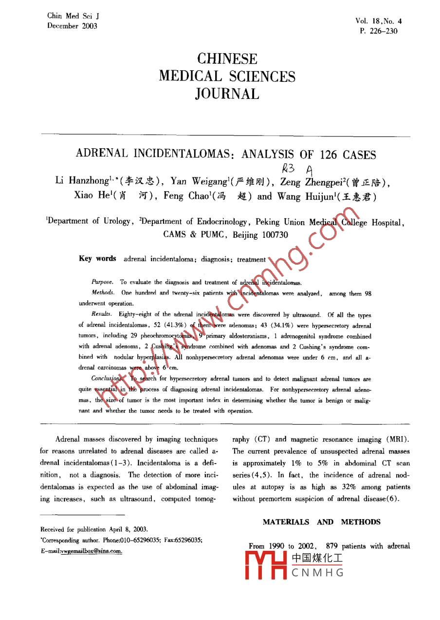 Chin Med Sci JVol.18,No. 4December 2003P. 226 -230CHINESEMEDICAL SCIENCESJOURNALADRENAL INCIDENTALOMAS: ANALYSIS OF 126 CASES .R3Li Hanzhong'*(李漢忠),Yan Weigang'(嚴(yán) 維剛), Zeng Zhengpei?( 曾正陪),Xiao He'(肖河), Feng Chao'(馮 超) and Wang Huijun'(王 惠君)'Department of Urology ,'Department of Endocrinology, Peking Union Medical College Hospital,CAMS & PUMC, Beijing 100730Key words adrenal incidentaloma; diagnosis; treatmentPurpose. To evaluate the diagnosis and treatment of adrenal incidentalomas.Methods. One hundred and twenty -six patients with incidentalomas were analyzed, among them 98underwent operation.Resuls. Eighty eight of the adrenal incidentalomas were discovered by ultrasound. Of all the typesof adrenal incidentalomas. 52 (41.3%) of them were adenomas; 43 (34.1%) were hypersecretory adrenaltumors, including 29 pheochromoeytomas, 9 primary aldosteronisms, 1 adrenogenitol syndrome combinedwith adrenal adenoma, 2 Cushing's ayndrome combined with adenomas and 2 Cushing's syndrome com-bined with nodular bhyperplasias. All nonhypersecretory adrenal adenomas were under 6 cm, and all adrenal carcinomas were above 6 cm.Conclusions. To search forquite essential in the proccess o[ diagnosing adrenal incidentalomas. For nonhypersecretory adrenal adeno-nas, the size of tumor is the most important index in determining whether the tunor is benign or malig-nant and whether the tumor needs to be treated with operation.Adrenal masses discovered by imaging techniquesraphy (CT) and magnetic resonance imaging (MRI).for reasons unrelated to adrenal diseases are called aThe current prevalence of unsuspected adrenal massesdrenal incidentalomas(1-3). Incidentaloma is a defi-is approximately 1% to 5% in abdominal CT scannition,not a diagnosis. The detection of more inci-series(4,5). In fact, the incidence of adrenal nod-dentalomas is expected as the use of abdominal imag-les at autopsy is as high as 32% among patientsing increases, such as ultrasound, computed tomog- without premortem suspicion of adrenal disease(6).MATERIALS AND METHODSReceived for publication April 8, 2003.Corresponding author. Phone:010- 65296035; Fax:65296035;From 1990 to 2002,879 patients with adrenalE-milvwgemailbox@sina.com中國煤化工HCNMHGVol. 18, No, 4CHINESE MEDICAL SCIENCES JOURNAL227tumors were admited to our hospital, among them .were bilaleral pheochromocytomas; 1 was combined126 were adrenal ineidentalomas. The case historieswith adenomas; 2 were malignant pheochromocytomas.of the 126 patients were reviewed. Of them, 64 wereSeven had no histories of hypertension. Measurementmales and 62 were females.Their age were 9 ~74of 24 -hour urinary catecholamine was performedned inyears old (median age 53). Adrenal masses wereall patients and 26 of them were high and othersbilateral in 8 and unilateral in 118,of which 4were normal. Ffeen of the 29 patients were per-were on the left side and 71 were on the right side.forned with 川-MIBG scintigraphy, except 2 malig-Ninety-eight (77.8%) of the 126 patients were per-nant pheochromocytomas, all the others were positive.formed operations.Hormonal study was performed in all patients andTable 1. Detailed cases, percenages of rvurious adrenalincidentalomas and percentages appeared inincluded 24- -hour urinary free cortisol, serum free cor-literaturetisol, supine and upright position of plasma aldos-terone and plasma renin activity ,serum testosterone ,CategoriesCases % % in literature(3)17-hydroxyprogesterone (17-0HP), 24-hour urinaryPheochromocytoma223.015-23cathecolamines and plasma cathecolamines. Ultrasound,malignantCT,MRI and 3I -metaiodobenzylquanidine (" -benign .22MIBC) scintigraphy were performed.Ganglioneuromas.60~-6Medullary neurofibroma0.8RESULTSAdrenocortical rarrinoma2.1.2-11Adenoma2 41.336-94Eighty(63.5%) of the 126 adrenal ineidentalomasCushing's syndromewere discovered by routine physical examination, a-Primary aldosteronismsmong which 67 by ulrasound and 13 by CT. TheAdrenogenitol syndromether 46 (36.5%) were discovered during the imag-Nonhypersecretory40ing performed for extra- -adrenal complaints, of whichNolular hyperplasia3.27~1721 were discovered by ultrasound, 24 by CT and 1Adrenal metastases7.0-21by abdomen plain film. Fifty -seven (45.2%) of thelyst4-22126 had hypertension histories and 15 (11.9%) withEpidermoid eystxhistories of extra -adrenal malignancy. Table 1 listsMyelolipoma5.67~15he numbers and percentages of various diagnoses ofLipoma0.0-11the histopathologic features. Except for 14 nonhyper-Hemangiomasecretory adenomas ,7 adrenal metastases, 4 pheochro-Fibroxanthomemocytomas,2 nodular hyperplasias and 1 myelolipo-Total126ma that were not performed operations, the others alla: No report in the literalurehad histopathologic diagnoses.Of the 43 (34.1%) hyperseeretory adrenal inci-AIl of the 9 primary aldosteronisms patients haddenlalomas, 29 were pheochromocytomas, 12 werehypertension histories before operation and 6 of themadenomas (including 9 primary aldosteronisms, 2had hypokalemia histories. Suppressed plasma reninCushing's syndrome and 1 adrenogenitol syndrome),activity and elevated plasma aldosterone were foundand the other 2 were nodular bhypeplasias (both ofin all cases.Subtle hypercortisolism were found in 2 Cush-them had Cushing's syndromes). .Of the 29 pheochromocytomas, 2 were associateding's syndrome patients with incidental adrenal ade-with medullary thyroid carcinoma and were. diagnosednomas. Though they had no typical manifestation ofas Muliple Endocrine Neoplasia type II (MENI); 2Cushielevated 24- -hour中國煤化工"THCNMHG228CHINESE MEDICAL SCIENCES JOURNALDecember 2003urinary free cortisol and serum free cortisol levels,Twenty -8ix nonhypersecretory tumor patients were fol-and unsuppressbility of cortisol in overnight dexam-lowed and 4 of them died for reasons unrelated toethasone suppression tests was found in the 2 cases.he primary tumor.A female adrenogenitol syndrome patient had themanifestation of sub