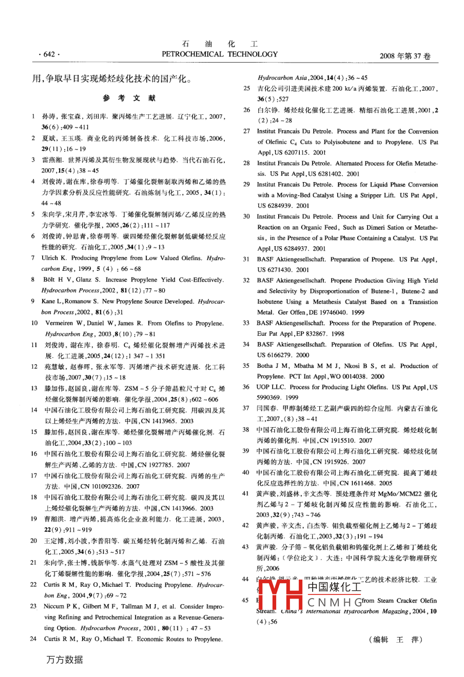 石油化工2008年第37卷第6期PETROCHEMICAL TECHNOLOGY637進展與述評C4烯烴催化轉(zhuǎn)化增產(chǎn)丙烯技術(shù)進展張惠明(中國石油化工股份有限公司上海石油化工研究院,上海201208)摘要〕從反應(yīng)熱力學(xué)規(guī)律及工藝技術(shù)方面,介紹了C4烯烴催化轉(zhuǎn)化增產(chǎn)丙烯技術(shù)的特點,重點評述了催化裂解和烯烴歧化技術(shù)的最新進展。指出C4烯烴催化轉(zhuǎn)化生產(chǎn)丙烯是高效利用烯烴資源的重要途徑,提出了應(yīng)加快開發(fā)具有我國自主知識產(chǎn)權(quán)的高效烯烴催化轉(zhuǎn)化增產(chǎn)丙烯技術(shù)。關(guān)鍵詞]碳四烯烴;丙烯;催化轉(zhuǎn)化;烯烴歧化;熱力學(xué)[文章編號]1000-8144(2008)06-0637-06[中圖分類號]TQ221.21[文獻標(biāo)識碼]AAdvances in Catalytic Conversion of Ca Olefin to PropyleneShanghai Research Institute of Petrochemical Technology, SINOPEC, Shanghai 201208, China)Abstract The thermodynamic law and the process for catalytic conversion of Ca olefinspropylene were analyzed. Recent advances of both catalytic cracking and metathesis of Ca olefins topropylene were reviewed. It is an effective measure to increase C4 olefins value by catalytic cracking ormetathesis of C4 olefins to propylene. It is important to develop effective catalysts and technologicalprocess for catalytic conversion of C4 olefins to propylene in ChinaKeywords C, olefins; propylene catalytic conversion; olefin metathesis; thermodynamics丙烯是重要的石油化工基礎(chǔ)原料之一,主要用本文介紹了近年來C4烯烴催化裂解及C4烯于生產(chǎn)聚丙烯、丙烯腈、環(huán)氧丙烷等化工產(chǎn)品2。烴歧化增產(chǎn)丙烯技術(shù)的研究進展,重點從反應(yīng)熱力近年來,世界范圍內(nèi)對丙烯的需求逐年遞增。據(jù)預(yù)學(xué)規(guī)律及工藝技術(shù)方面進行評述。測,2007-2010年,全球丙烯衍生物需求的年均增1C4烯烴催化裂解生產(chǎn)丙烯及其工藝長率為5%,高于乙烯衍生物3。其中,對占丙烯總消耗量62%的聚內(nèi)烯的需求將以年均5.5%的高速1.1C4烯烴催化裂解的熱力學(xué)因素率增長,對苯酚-聚碳酸酯產(chǎn)品鏈需求的增長也十烯烴催化裂解的熱力學(xué)具有以下主要特分迅猛,異丙苯、環(huán)氧丙烷和丙烯酸等對丙烯消耗征3:(1)低碳烯烴在熱力學(xué)上有很強的通過聚量的增長也將達到5%。我國丙烯供需矛盾更為突合一脫氫環(huán)化一芳構(gòu)化生成芳烴的傾向。C2-5烯烴出。預(yù)計到2010年,我國對丙烯的當(dāng)量需求量約為與芳烴(苯、二甲苯及三甲苯)構(gòu)成的熱力學(xué)系統(tǒng)的19.05Mt,缺口將達8.25Mt。另一方面隨著我國計算結(jié)果表明,在200~620℃,芳烴的質(zhì)量分數(shù)保乙烯生產(chǎn)能力的不斷擴大、原油加工能力的不斷提持在90%以上,乙烯及丙烯的質(zhì)量分數(shù)均小于1%。高及新型能源化工的快速發(fā)展,急需為副產(chǎn)的大量(2中國煤化是,包括同碳數(shù)烯烴C4烯烴尋找有效且附加值高的利用途徑。而將大間的CNMHG間的裂解或聚合量過剩、廉價的C4烯烴催化轉(zhuǎn)化生產(chǎn)丙烯,既能緩[收稿日期]2008-01-03;[修改稿日期]2008-02-15。解丙烯供需矛盾,又能增加石化企業(yè)的經(jīng)濟效益,作者簡介]張惠明(95-),男,江蘇省蘇州市人,大學(xué),高級工程具有極為重要的意義。師,電話021-68467426,電郵zhm@snpt.com.cns化工3PETROCHEMICAL TECHNOLOGY2008年第37卷過程。對于低碳烯烴構(gòu)成的熱力學(xué)系統(tǒng)而言,丙烯工業(yè)化示范裝置,已成功投入運轉(zhuǎn)收率在一定溫度范圍內(nèi)出現(xiàn)最大值。如C24烯烴Raw propylene(均考慮各碳數(shù)單烯烴同分異構(gòu)體)構(gòu)成的熱力學(xué)系統(tǒng),在常壓下,丙烯收率在610℃左右達到最大值Gasoline/olefin L=- Cold water(4.8%),乙烯收率為26.7%。顯然,為克服熱力學(xué)因素對C4烯烴裂解過程的制約,需開發(fā)高選擇性的催化劑,從動力學(xué)角度抑制芳烴和低碳烷烴等副產(chǎn)物的生成,使反應(yīng)向有Saturator利于提高丙烯選擇性及丙烯收率的方向進行6。c,ye1-丁烯及混合C4在ZSM-5分子篩催化劑上的裂解規(guī)律顯示,盡管原料中丁烯的含量有差異,但裂解產(chǎn)物中C2s烯烴的質(zhì)量分數(shù)與熱力學(xué)規(guī)律的變化趨勢一致。圖1 Propylur工藝流程Fig 1 Flow diagram of Propylur process1.2C4烯烴催化裂解生產(chǎn)丙烯工藝依據(jù)反應(yīng)器的結(jié)構(gòu),可將C4烯烴裂解制丙烯將 Propylur工藝用于蒸汽裂解裝置時,通常采技術(shù)分為兩類:一類是固定床工藝,主要有Lurg公用僅有反應(yīng)段的聯(lián)合流程。采用該流程后,一套司的 Propylur工藝、 Atofina和UOP公司的OCP工1MUa乙烯裝置的丙烯與乙烯產(chǎn)量比可由0.542提藝、日本旭化成公司的 Omega工藝及中國石油化工高到0.642。也可將蒸汽裂解裝置與帶有反應(yīng)段和股份有限公司上海石油化工研究院(簡稱上海石油分離段的 Propylur工藝聯(lián)合,將丙烯與乙烯產(chǎn)量比化工研究院)開發(fā)的OCC工藝;另一類是流化床工進一步提高到0.688,但投資費用相對較高。藝,主要有Arco化學(xué)公司的 Superflex工藝、 Mobil1.2.2OCP工藝公司的MOI工藝。Atofina公司和UOP公司聯(lián)合開發(fā)了OCP工1.2.1 Propylur工藝藝0。該工藝的特點是原料中不加稀釋氣、空速Lurgi公司的 Propylur工藝是一種以不含雙烯高,因而反應(yīng)器的體積小,設(shè)備投資少。該工藝采的烯烴(丁烯、戊烯、已烯)為原料最大量生產(