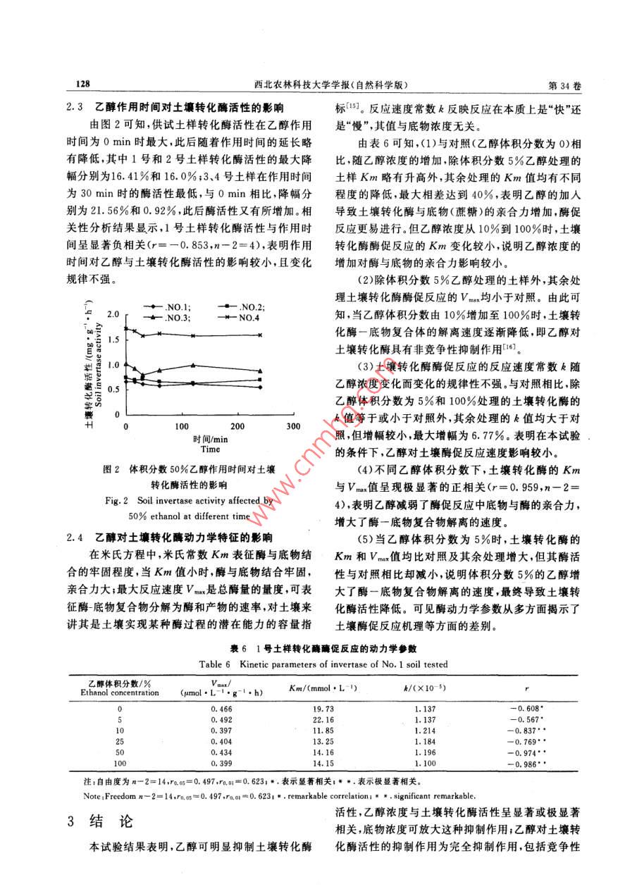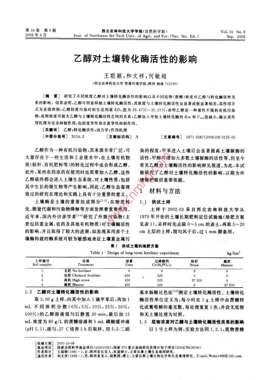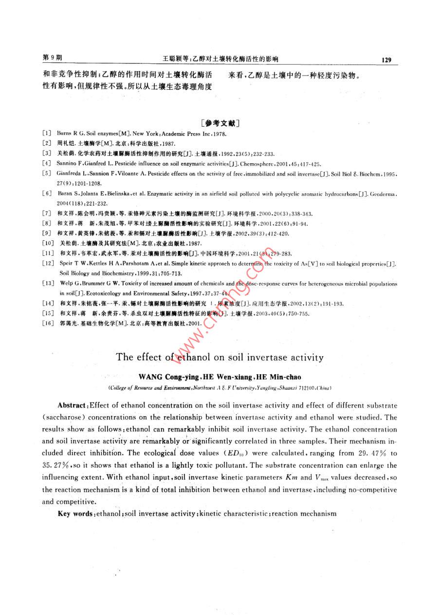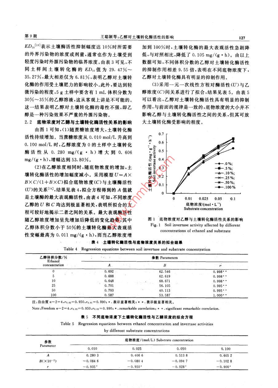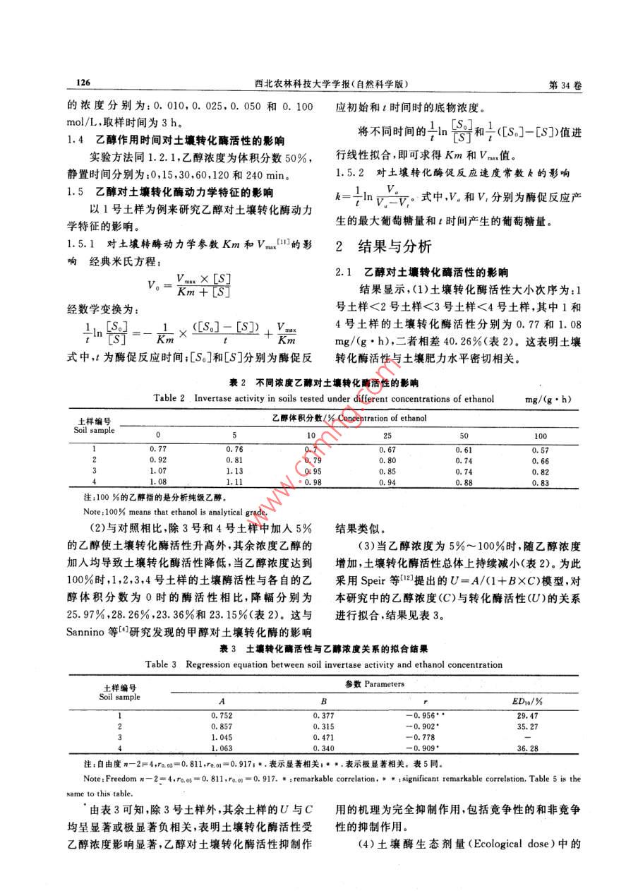 第34卷第9期西北農(nóng)林科技大學(xué)學(xué)報(bào)(自然科學(xué)版)2006年9月 Vol. 34 No. 9 Jour. of Northwest Sci-Tech Univ. of Agri. and For. (Nat. Sci. Ed.)Sep.2006乙醇對(duì)土壤轉(zhuǎn)化酶活性的影響王聰穎,和文祥,何敏超(西北農(nóng)林科技大學(xué)資源環(huán)境學(xué)院,陜西楊凌712100[摘要]研究了不同濃度乙醇對(duì)土壤轉(zhuǎn)化酶活性的影響以及不同底物(蔗糖)濃度對(duì)乙醇與轉(zhuǎn)化酶活性關(guān)系的影響。結(jié)果表明,乙醇可明顯抑制土壤轉(zhuǎn)化酶活性,其濃度與土壤轉(zhuǎn)化酶活性呈顯著或極顯著相關(guān),其作用方式為直接抑制乙醇輕度污染時(shí)的生態(tài)劑量ED1值為29.47%~35.27%,表明乙醇是一種毒性不強(qiáng)的有機(jī)污染物;底物濃度可放大乙醇與土壤轉(zhuǎn)化酶活性之間的關(guān)系;乙醇加導(dǎo)致土壤轉(zhuǎn)化酶的Km和vm值小,揭示其作用機(jī)理為完全抑制作用,包括競(jìng)爭(zhēng)性和非競(jìng)爭(zhēng)性抑制作用。[關(guān)鍵詞]乙醇;轉(zhuǎn)化酶活性;動(dòng)力學(xué);作用機(jī)理[中圖分類號(hào)]S154.2[文獻(xiàn)標(biāo)識(shí)碼]A[文章編號(hào)]1671-93872006)09-0125-05乙醇作為一種有機(jī)污染物,其來源非常廣泛,可染的程度;甲苯進(jìn)入土壤后會(huì)顯著提高土壤脲酶的大量存在于一些生活和工業(yè)廢水中在土壤有機(jī)物活性,甲醇可增加大多數(shù)土壤脲酶的活性等但至今質(zhì)(秸稈、有機(jī)肥料等)的轉(zhuǎn)化過程中也會(huì)形成乙醇。有關(guān)乙醇對(duì)土壤酶活性的影響鮮見報(bào)道為此本試此外,某些農(nóng)藥原藥在使用時(shí)也需要加人乙醇。這些驗(yàn)研究了乙醇對(duì)土壤轉(zhuǎn)化酶活性的影響,以期為環(huán)乙醇最終都會(huì)進(jìn)入土壤生態(tài)系統(tǒng),對(duì)土壤性質(zhì)包括境保護(hù)提供重要依據(jù)。其中生長(zhǎng)的微生物等產(chǎn)生影響因此,乙醇生態(tài)毒理效應(yīng)的研究在理論和實(shí)踐上具有十分重要的意義。1材料與方法土壤酶是土壤的重要組成部分,在物質(zhì)轉(zhuǎn)1.1供試土樣化能量代謝和污染物降解等方面發(fā)揮著重要作用。土樣于2002-03采自西北農(nóng)林科技大學(xué)從近年來,國(guó)內(nèi)外許多學(xué)者3研究了外源污染物(主1979年開始的土壤長(zhǎng)期肥料定位試驗(yàn)地(培肥方案要包括重金屬、農(nóng)藥及其他有機(jī)物質(zhì))對(duì)土壤酶活性見表1)。采樣時(shí)先去除0~5cm的表土,再取5~20的影響,并且取得了較大的進(jìn)展,如發(fā)現(xiàn)采用多個(gè)土cm土層的土樣,混勻風(fēng)干后,過1mm篩備用。壤酶構(gòu)建的酶系統(tǒng)可較為敏感地表征土壤重金屬污表1供試土壤的培肥方案 Table, 1 Design of long-term fertilizer experiment kg/hm2'土樣編號(hào) Soil samples處理尿素過磷酸鈣秸稈 Treatment Urea Ca(H2PO)2肥 Straw Manure無肥o- o-fertilizer0000化肥 Chemical fertilizer52500高 High straw4505375000450525375001.2乙醇對(duì)土壤轉(zhuǎn)化酶活性的影響基水楊酸比色法0測(cè)定土壤轉(zhuǎn)化酶活性。土壤轉(zhuǎn)化取5.00g土樣,向其中加入5滴甲苯后,再加1酶活性單位定義為每小時(shí)在1g土樣中由蔗糖轉(zhuǎn)mL不同體積分?jǐn)?shù)(0%,5%,10%,25%,50%,化成葡萄糖的毫克數(shù)。每處理重復(fù)3次,并設(shè)無底物100%)的乙醇溶液混勻后靜置30min,最后加15和無土壤處理為對(duì)照。mL濃度為80g/L的蔗糖溶液和5mL磷酸緩沖液1.3底物濃度對(duì)乙醇與土壤轉(zhuǎn)化酶活性關(guān)系的影響(pH5.5),搖勻,37C培養(yǎng)5h后取樣。用3,5-二硝以1號(hào)土樣為例,實(shí)驗(yàn)方法同1.2.1,底物蔗糖[收稿日期]2005-10-08[基金項(xiàng)目國(guó)家自然科學(xué)基金項(xiàng)目(4030102)國(guó)家973重點(diǎn)基礎(chǔ)研究發(fā)展計(jì)劃子項(xiàng)目(2004CB418506)[作者簡(jiǎn)介]王聰穎(1981),女[通訊】王聰(1=:,西長(zhǎng)人,在讀硬士,主要從事土壤生物化學(xué)和生態(tài)毒理研究e-malwxh968163.co要從事土壤生態(tài)毒理研究者]和文(19男陜西黃龍126西北農(nóng)林科技大學(xué)學(xué)報(bào)(自然科學(xué)版)第34卷的濃度分別為:0.010,0.025,0.050和0.100應(yīng)初始和t時(shí)間時(shí)的底物濃度。mol/L,取樣時(shí)間為3hS1.4乙醇作用時(shí)間對(duì)土壤轉(zhuǎn)化酶活性的影響將不同時(shí)間的n和(S-[S])值進(jìn)實(shí)驗(yàn)方法同1.2.1,乙醇濃度為體積分?jǐn)?shù)50%,行線性擬合,即可求得Km和Vm值靜置時(shí)間分別為:0,15,30,60,120和240min。1.5.2對(duì)土壤轉(zhuǎn)化酶促反應(yīng)速度常數(shù)k的影響1.5乙醇對(duì)土壤轉(zhuǎn)化酶動(dòng)力學(xué)特征的影響以1號(hào)土樣為例來研究乙醇對(duì)土壤轉(zhuǎn)化酶動(dòng)力k=nvv,式中,V和V分別為酶促反應(yīng)產(chǎn)學(xué)特征的影響。生的最大葡萄糖量和t時(shí)間產(chǎn)生的葡萄糖量。1.5.1對(duì)土壤轉(zhuǎn)酶動(dòng)力學(xué)參數(shù)Km和的影2結(jié)果與分析響經(jīng)典米氏方程: V.= X [S]2.1乙醇對(duì)土壤轉(zhuǎn)化酶活性的影響 Km+[]結(jié)果顯示,(1)土壤轉(zhuǎn)化酶活性大小次序?yàn)?1經(jīng)數(shù)學(xué)變換為:號(hào)土樣<2號(hào)土樣<3號(hào)土樣<4號(hào)土樣,其中1和 In S-Kx ([S.]-[S])+4號(hào)土樣的土壤轉(zhuǎn)化酶活性分別為0.77和1.08mg/(g·h),二者相差40.26%(表2)。這表明土壤式中,t為酶促反應(yīng)時(shí)間;[S]和[S]分別為酶促反轉(zh